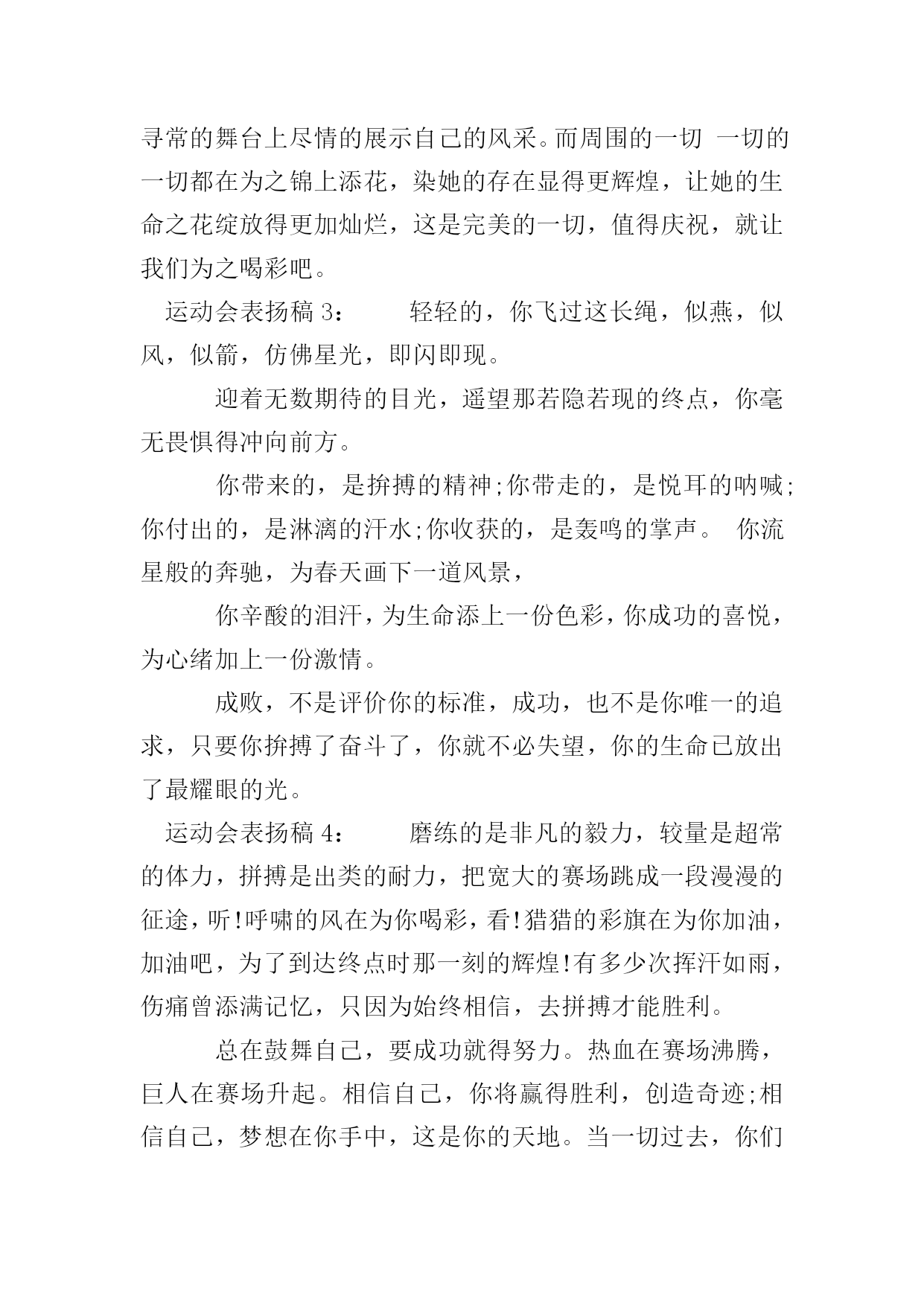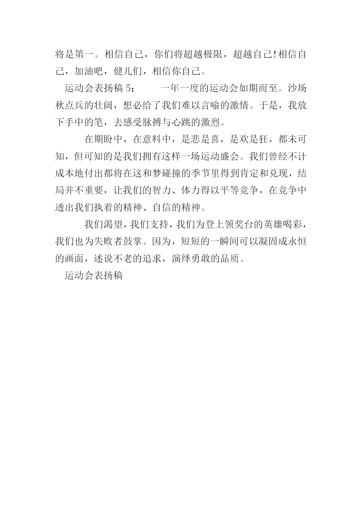 运动会表扬稿运动会表扬稿1:校运会的召开,牵动着全校师生的心。校运会是展现文理风采的舞台。是检验文理素质的天平。校运会使大家汇聚一堂,谱写着文理人的拼搏进取之歌,团结协作之歌和奉献扶持之歌。无疑,运动场上运动员成了宠儿,成为我们关注的焦点。当然,运动员们也不负众望:重在参与展现着他们的积极状态,为系争光则蕴含着他们的集体主义情怀,虽败犹荣更是深含着他们乐观向上的情操。运动员展现在我们面前的永远是朝气蓬勃、永不言败的战斗豪情,因为他们坚信:运动着是美丽的。红花艳,有了绿叶的扶持,将是相得益彰。我们也不要忘记在运动员身后的后勤服务者。他们表达自己的心愿:赛场上展现你的英姿,赛场外编织我的梦想,愿你的英姿能圆我的梦想。任劳任怨是他们的工作态度,勤勤恳恳是他们的工作作风,他们乐为他人作嫁衣。因为他们深信:服务着是美丽的。运动会表扬稿2:热情地释放光芒的红日,被阵阵此起彼伏的加油声震撼,慌张地投入到乌云的怀抱。那群北飞的候鸟却因为热火朝天的场面而盘旋在运动场上,留恋着这里与寂静的天空截然不同的热闹。围绕在运动场边的树木,在秋风的频繁光顾下奏鸣出悦耳的树叶的交响曲,仿佛是为了配合场上的拉拉队,为奋斗的运动员们加油鼓劲。这是个非同寻常的日子。场上的学子们正在这个不同寻常的舞台上尽情的展示自己的风采。而周围的一切一切的一切都在为之锦上添花,染她的存在显得更辉煌,让她的生命之花绽放得更加灿烂,这是完美的一切,值得庆祝,就让我们为之喝彩吧。运动会表扬稿3:轻轻的,你飞过这长绳,似燕,似风,似箭,仿佛星光,即闪即现。迎着无数期待的目光,遥望那若隐若现的终点,你毫无畏惧得冲向前方。你带来的,是拚搏的精神;你带走的,是悦耳的呐喊;你付出的,是淋漓的汗水;你收获的,是轰鸣的掌声。你流星般的奔驰,为春天画下一道风景,你辛酸的泪汗,为生命添上一份色彩,你成功的喜悦,为心绪加上一份激情。成败,不是评价你的标准,成功,也不是你唯一的追求,只要你拚搏了奋斗了,你就不必失望,你的生命已放出了最耀眼的光。运动会表扬稿4:磨练的是非凡的毅力,较量是超常的体力,拼搏是出类的耐力,把宽大的赛场跳成一段漫漫的征途,听!呼啸的风在为你喝彩,看!猎猎的彩旗在为你加油,加油吧,为了到达终点时那一刻的辉煌!有多少次挥汗如雨,伤痛曾添满记忆,只因为始终相信,去拼搏才能胜利。总在鼓舞自己,要成功就得努力。热血在赛场沸腾,巨人在赛场升起。相信自己,你将赢得胜利,创造奇迹;相信自己,梦想在你手中,这是你的天地。当一切过去,你们将是第一。相信自己,你们将超越极限,超越自己!相信自己,加油吧,健儿们,相信你自己。运动会表扬稿5:一年一度的运动会如期而至。沙场秋点兵的壮阔,想必给了我们难以言喻的激情。于是,我放下手中的笔,去感受脉搏与心跳的激烈。在期盼中,在意料中,是悲是喜,是欢是狂,都未可知,但可知的是我们拥有这样一场运动盛会。我们曾经不计成本地付出都将在这和梦碰撞的季节里得到肯定和兑现,结局并不重要,让我们的智力、体力得以平等竞争,在竞争中透出我们执着的精神、自信的精神。我们渴望,我们支持,我们为登上领奖台的英雄喝彩,我们也为失败者鼓掌。因为,短短的一瞬间可以凝固成永恒的画面,述说不老的追求,演绎勇敢的品质。运动会表扬稿