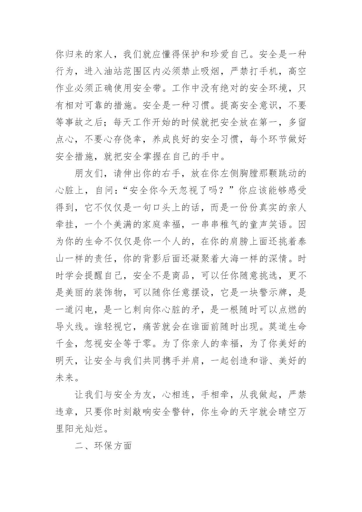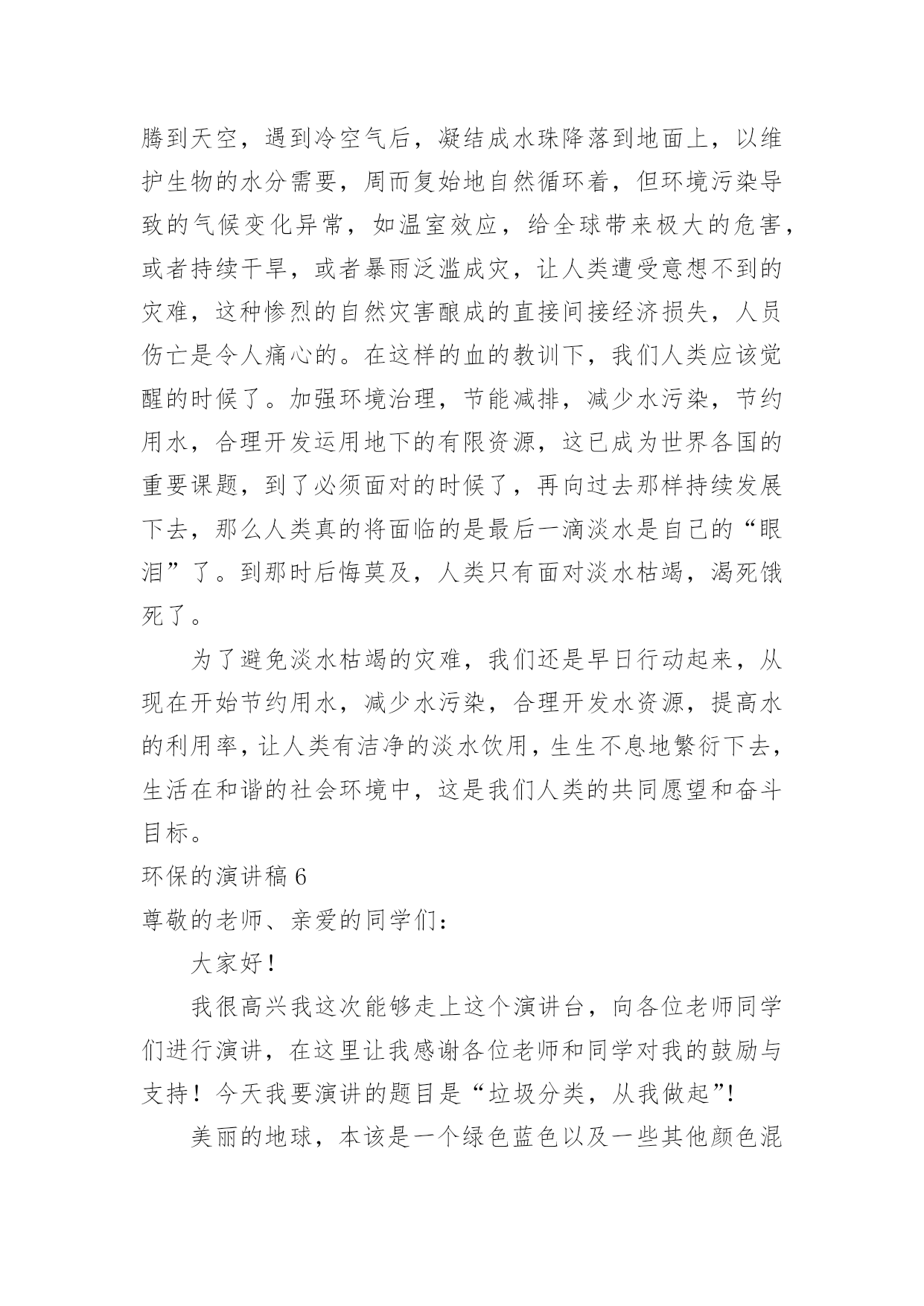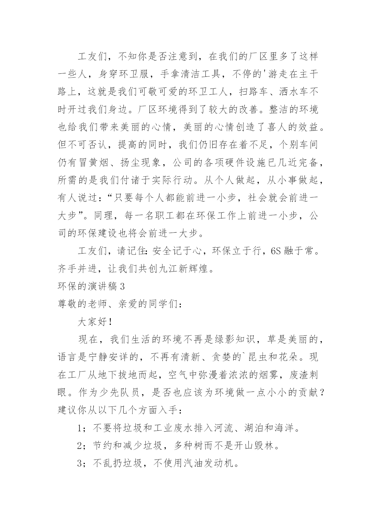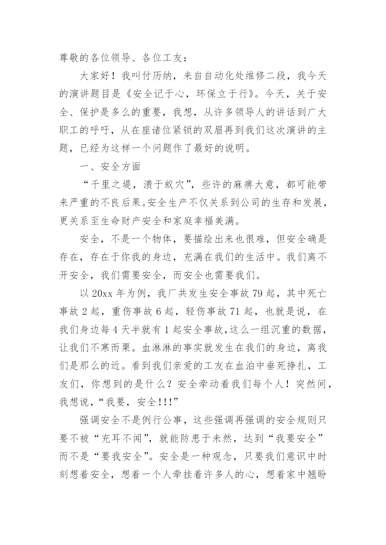环保的演讲稿环保的演讲稿【精选】演讲稿是为了在会议或重要活动上表达自己意见、看法或汇报思想工作情况而事先准备好的文稿。在学习、工作生活中,用到演讲稿的地方越来越多,你知道演讲稿怎样才能写的好吗?下面是小编帮大家整理的环保的演讲稿,仅供参考,希望能够帮助到大家。环保的演讲稿1尊敬的老师们,亲爱的学生们:大家好!今天我在国旗下说的主题是《保护环境》。每天早上,当我们走进校园时,每个人都能感受到她的美丽和整洁。看:学校门口有两棵粗壮挺拔的榕树,像两个忠于职守的守护者一样日夜守护着校园。操场东西两侧高大结实的凤凰树,像生气勃勃的孩子一样贪婪地吮吸着春天的露水。学校雕刻了一棵脆弱的.草,在微风中轻轻摇晃,愉快地向我们挥手。平坦舒适的塑料跑道是校园亮丽的风景线。在这样整洁优雅的校园环境中,我们沐浴着阳光,摄取着营养。我们满怀热情地想象未来。同学们,学校为我们创造了这么好的学习和生活环境,你想过要珍惜这一切困难吗?不妨回想一下平时的一举一动。你有没有随便踏过草地?你有没有随便打扫过教室、环境区的卫生?你不认为这是错误的情况吗?你有没有随便掉一张纸巾和零食袋?你打开过学校的自来水,没及时关上吗?你在白色的墙上留下过你的脏脚印和手印吗?你有没有把痰吐在打扫干净的地板上,而不是吐在纸上扔在垃圾桶里?学校是我们的家,我们是学校的主人,学校环境的美化取决于大家的共同努力。保护我们校园从我开始,从周围的小事开始,从力所能及开始事情做起。参与环保活动,培养环保素养,人人争做环保小卫士。不要把它想象成很难的事情,其实环保就在我们身边。当你捡起别人掉下的一张纸时;当你记得及时关灯,不浪费用电时;当你用好水龙头能及时关掉,而不是让水白白流掉;当你下课、集会时能做到有秩序、有礼貌,而不是高声喧哗、嬉闹;当你不乱涂乱画,不践踏草坪,不攀折树枝;你就已经在做着环保卫士应该做的事情了。诸如此类的太多太多小事,我们其实都能做到。我相信,只要我们人人洁身自爱,个个遵守公德,我们的校园一定会更加干净、整洁、美丽!同学们,校园是我家,环保靠大家!为了大家能有一个更优美、更舒适的学习环境,为了我们能更加健康茁壮地成长,让我们携起手来,为保护环境贡献自己的力量吧!谢谢大家!环保的演讲稿2尊敬的各位领导、各位工友:大家好!我叫付历纳,来自自动化处维修二段,我今天的演讲题目是《安全记于心,环保立于行》。今天,关于安全、保护是多么的重要,我想,从许多领导人的讲话到广大职工的呼吁,从在座诸位紧锁的双眉再到我们这次演讲的主题,已经为这样一个问题作了最好的说明。一、安全方面“千里之堤,溃于蚁穴”,些许的麻痹大意,都可能带来严重的不良后果。安全生产不仅关系到公司的生存和发展,更关系至生命财产安全和家庭幸福美满。安全,不是一个物体,要描绘出来也很难,但安全确是存在,存在于你我的身边,充满在我们的生活中。我们离不开安全,我们需要安全,而安全也需要我们。以20xx年为例,我厂共发生安全事故79起,其中死亡事故2起,重伤事故6起,轻伤事故71起,也就是说,在我们身边每4天半就有1起安全事故,这么一组沉重的数据,让我们不寒而栗。血淋淋的事实就发生在我们的身边,离我们是那么的近。看到我们亲爱的工友在血泊中垂死挣扎,工友们,你想到的是什么?安全牵动着我们每个人!突然间,我想说,“我要,安全!!!”强调安全不是例行公事,这些强调再强调的安全规则只要不被“充耳不闻”,就能防患于未然,达到“我要安全”而不是“要我安全”。安全是一种观念,只要我们意识中时刻想着安全,想着一个人牵挂着许多人的心,想着家中翘盼你归来的家人,我们就应懂得保护和珍爱自己。安全是一种行为,进入油站范围区内必须禁止吸烟,严禁打手机,高空作业必须正确使用安全带。工作中没有绝对的安全环境,只有相对可靠的措施。安全是一种习惯。提高安全意识,不要等事故之后;每天工作开始的时候就把安全放在第一,多留点心,不要心存侥幸,养成良好的安全习惯,每个环节做好安全措施,就把安全掌握在自己的手中。朋友们,请伸出你的右手,放在你左侧胸膛那颗跳动的心脏上,自问:“安全你今天忽视了吗?”你应该能够感受得到,它不仅仅是一句口头上的话,而是一份份真实的亲人牵挂,一个个美满的家庭幸福,一串串稚气的童声笑语。因为你的生命不仅仅是你一个人的,在你的肩膀上面还挑着泰山一样的责任,你的背影后面还凝聚着大海一样的深情。时时学会提醒自己,安全不是商品,可以任你随意挑选,更不是美丽的装饰物,可以随你任意摆设,它是一块警示牌,是一道闪电,是一匕刺向你心脏的矛,是一根随时可以点燃的导火线。谁轻视它,痛苦就会在谁面前随时出现。莫道生命千金,忽视安全等于零。为了你亲人的幸福,为了你美好的明天,让安全与我们共同携手并肩,一起创造和谐、美好的未来。让我们与安全为友,心相连,手相牵,从我做起,严禁违章