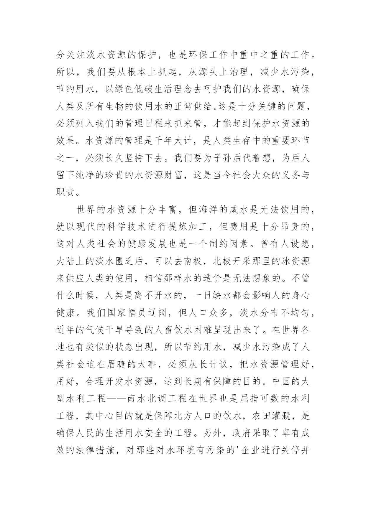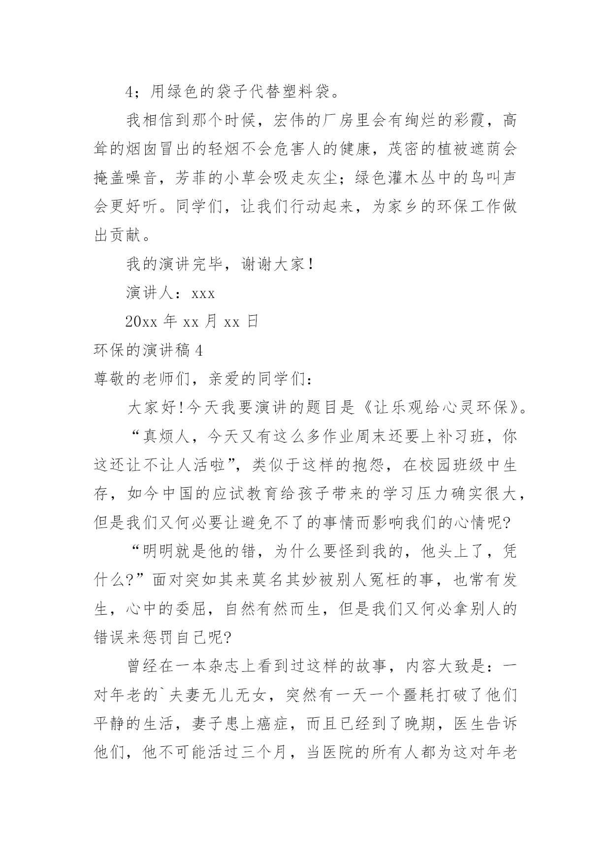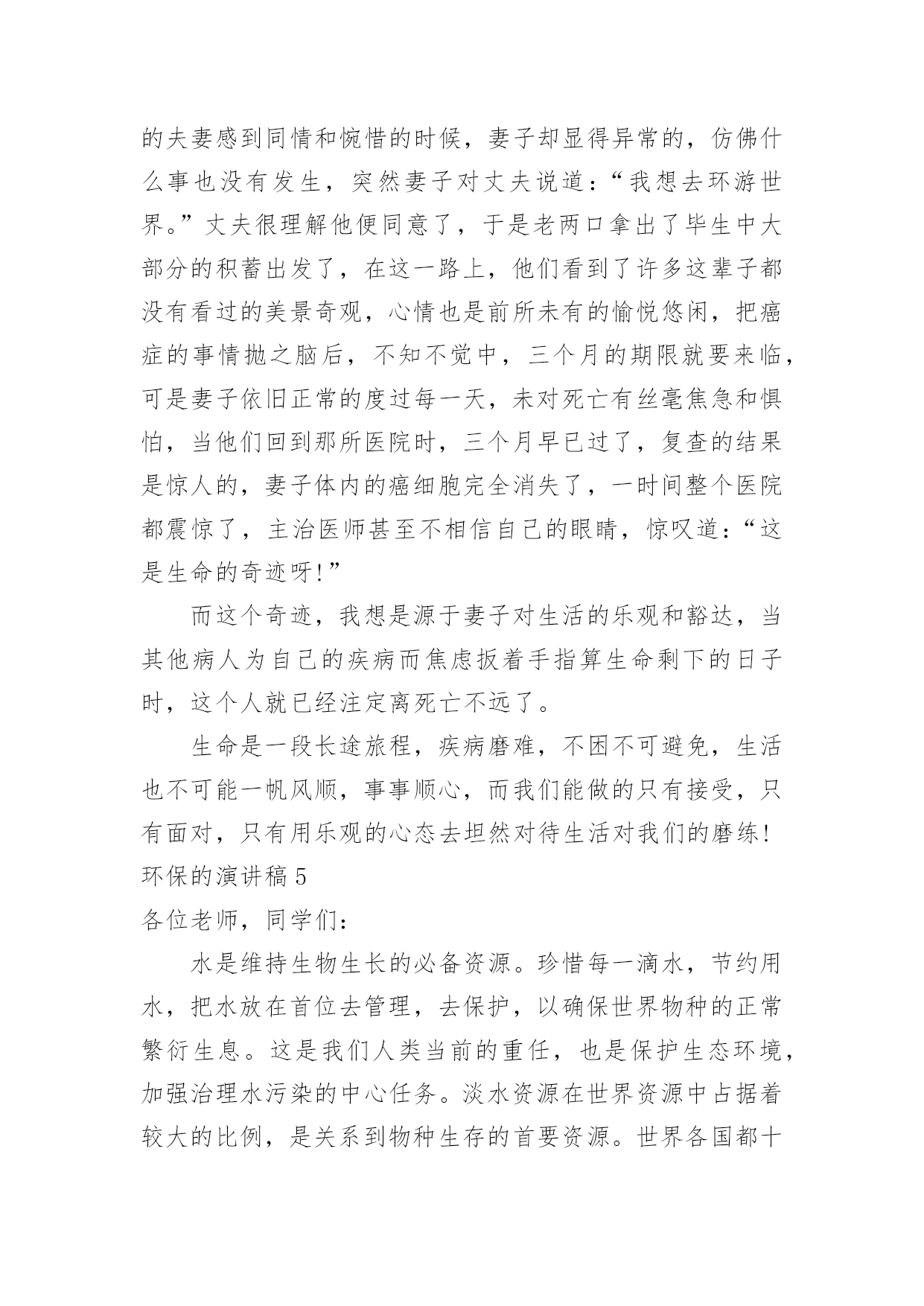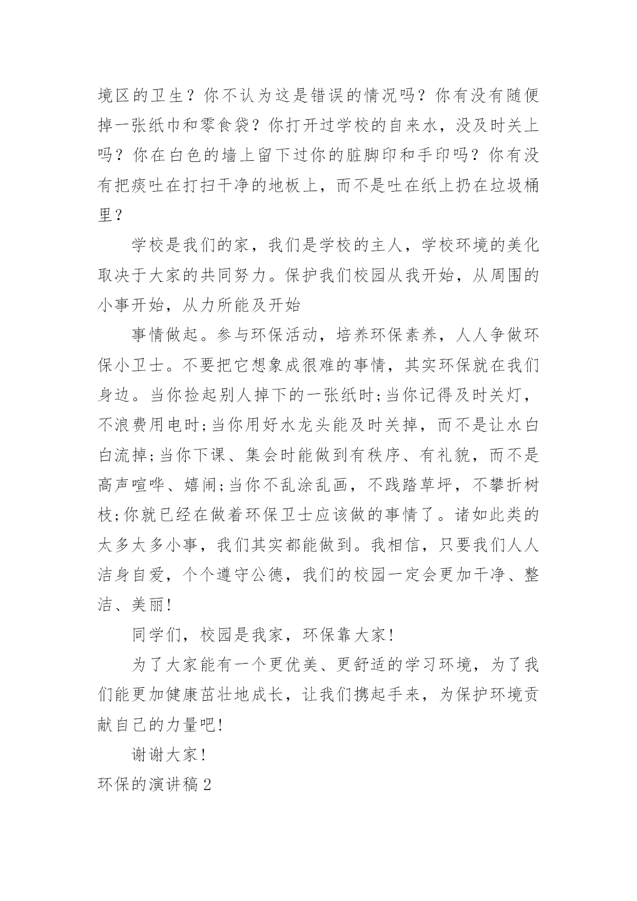 环保的演讲稿环保的演讲稿【精选】演讲稿是为了在会议或重要活动上表达自己意见、看法或汇报思想工作情况而事先准备好的文稿。在学习、工作生活中,用到演讲稿的地方越来越多,你知道演讲稿怎样才能写的好吗?下面是小编帮大家整理的环保的演讲稿,仅供参考,希望能够帮助到大家。环保的演讲稿1尊敬的老师们,亲爱的学生们:大家好!今天我在国旗下说的主题是《保护环境》。每天早上,当我们走进校园时,每个人都能感受到她的美丽和整洁。看:学校门口有两棵粗壮挺拔的榕树,像两个忠于职守的守护者一样日夜守护着校园。操场东西两侧高大结实的凤凰树,像生气勃勃的孩子一样贪婪地吮吸着春天的露水。学校雕刻了一棵脆弱的.草,在微风中轻轻摇晃,愉快地向我们挥手。平坦舒适的塑料跑道是校园亮丽的风景线。在这样整洁优雅的校园环境中,我们沐浴着阳光,摄取着营养。我们满怀热情地想象未来。同学们,学校为我们创造了这么好的学习和生活环境,你想过要珍惜这一切困难吗?不妨回想一下平时的一举一动。你有没有随便踏过草地?你有没有随便打扫过教室、环境区的卫生?你不认为这是错误的情况吗?你有没有随便掉一张纸巾和零食袋?你打开过学校的自来水,没及时关上吗?你在白色的墙上留下过你的脏脚印和手印吗?你有没有把痰吐在打扫干净的地板上,而不是吐在纸上扔在垃圾桶里?学校是我们的家,我们是学校的主人,学校环境的美化取决于大家的共同努力。保护我们校园从我开始,从周围的小事开始,从力所能及开始事情做起。参与环保活动,培养环保素养,人人争做环保小卫士。不要把它想象成很难的事情,其实环保就在我们身边。当你捡起别人掉下的一张纸时;当你记得及时关灯,不浪费用电时;当你用好水龙头能及时关掉,而不是让水白白流掉;当你下课、集会时能做到有秩序、有礼貌,而不是高声喧哗、嬉闹;当你不乱涂乱画,不践踏草坪,不攀折树枝;你就已经在做着环保卫士应该做的事情了。诸如此类的太多太多小事,我们其实都能做到。我相信,只要我们人人洁身自爱,个个遵守公德,我们的校园一定会更加干净、整洁、美丽!同学们,校园是我家,环保靠大家!为了大家能有一个更优美、更舒适的学习环境,为了我们能更加健康茁壮地成长,让我们携起手来,为保护环境贡献自己的力量吧!谢谢大家!环保的演讲稿2尊敬的各位领导、各位工友:大家好!我叫付历纳,来自自动化处维修二段,我今天的演讲题目是《安全记于心,环保立于行》。今天,关于安全、保护是多么的重要,我想,从许多领导人的讲话到广大职工的呼吁,从在座诸位紧锁的双眉再到我们这次演讲的主题,已经为这样一个问题作了最好的说明。一、安全方面“千里之堤,溃于蚁穴”,些许的麻痹大意,都可能带来严重的不良后果。安全生产不仅关系到公司的生存和发展,更关系至生命财产安全和家庭幸福美满。安全,不是一个物体,要描绘出来也很难,但安全确是存在,存在于你我的身边,充满在我们的生活中。我们离不开安全,我们需要安全,而安全也需要我们。以20xx年为例,我厂共发生安全事故79起,其中死亡事故2起,重伤事故6起,轻伤事故71起,也就是说,在我们身边每4天半就有1起安全事故,这么一组沉重的数据,让我们不寒而栗。血淋淋的事实就发生在我们的身边,离我们是那么的近。看到我们亲爱的工友在血泊中垂死挣扎,工友们,你想到的是什么?安全牵动着我们每个人!突然间,我想说,“我要,安全!!!”强调安全不是例行公事,这些强调再强调的安全规则只要不被“充耳不闻”,就能防患于未然,达到“我要安全”而不是“要我安全”。安全是一种观念,只要我们意识中时刻想着安全,想着一个人牵挂着许多人的心,想着家中翘盼你归来的家人,我们就应懂得保护和珍爱自己。安全是一种行为,进入油站范围区内必须禁止吸烟,严禁打手机,高空作业必须正确使用安全带。工作中没有绝对的安全环境,只有相对可靠的措施。安全是一种习惯。提高安全意识,不要等事故之后;每天工作开始的时候就把安全放在第一,多留点心,不要心存侥幸,养成良好的安全习惯,每个环节做好安全措施,就把安全掌握在自己的手中。朋友们,请伸出你的右手,放在你左侧胸膛那颗跳动的心脏上,自问:“安全你今天忽视了吗?”你应该能够感受得到,它不仅仅是一句口头上的话,而是一份份真实的亲人牵挂,一个个美满的家庭幸福,一串串稚气的童声笑语。因为你的生命不仅仅是你一个人的,在你的肩膀上面还挑着泰山一样的责任,你的背影后面还凝聚着大海一样的深情。时时学会提醒自己,安全不是商品,可以任你随意挑选,更不是美丽的装饰物,可以随你任意摆设,它是一块警示牌,是一道闪电,是一匕刺向你心脏的矛,是一根随时可以点燃的导火线。谁轻视它,痛苦就会在谁面前随时出现。莫道生命千金,忽视安全等于零。为了你亲人的幸福,为了你美好的明天,让安全与我们共同携手并肩,一起创造和谐、美好的未来。让我们与安全为友,心相连,手相牵,从我做起,严禁违章