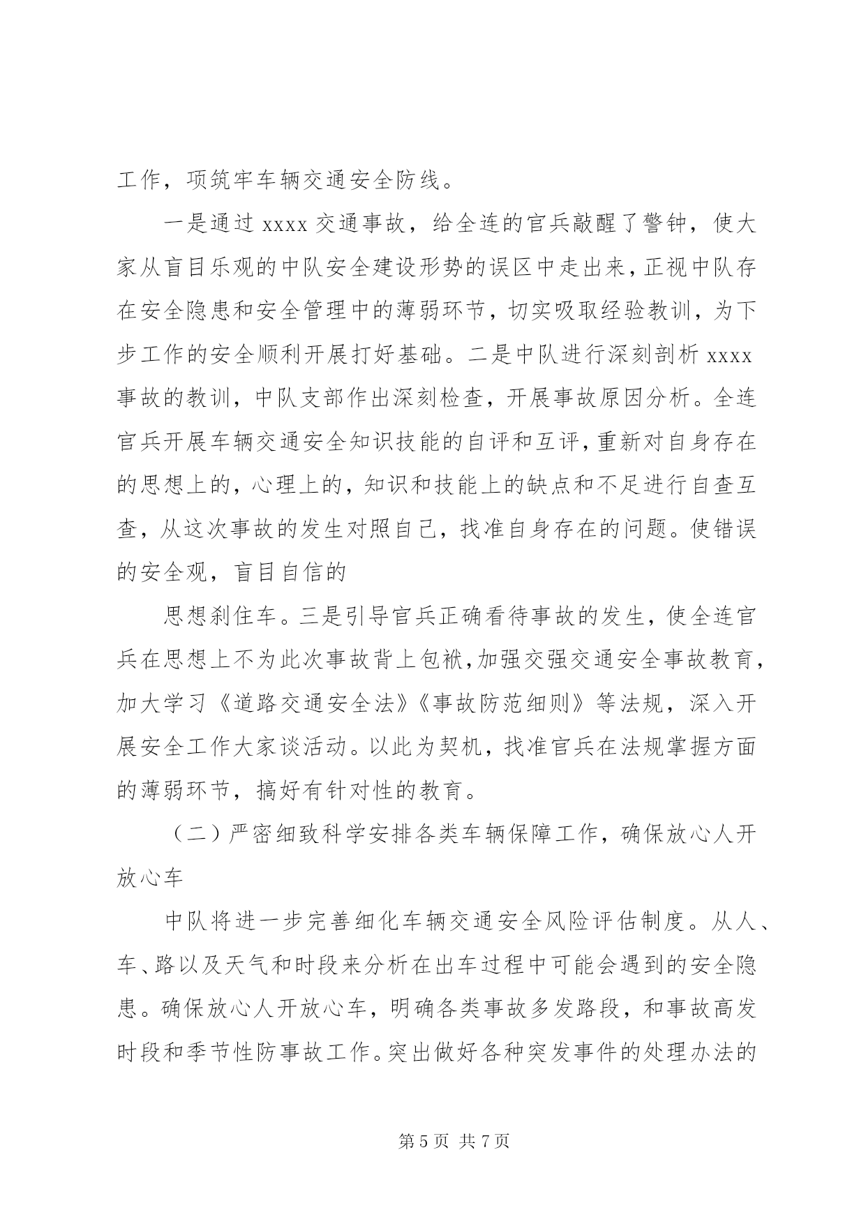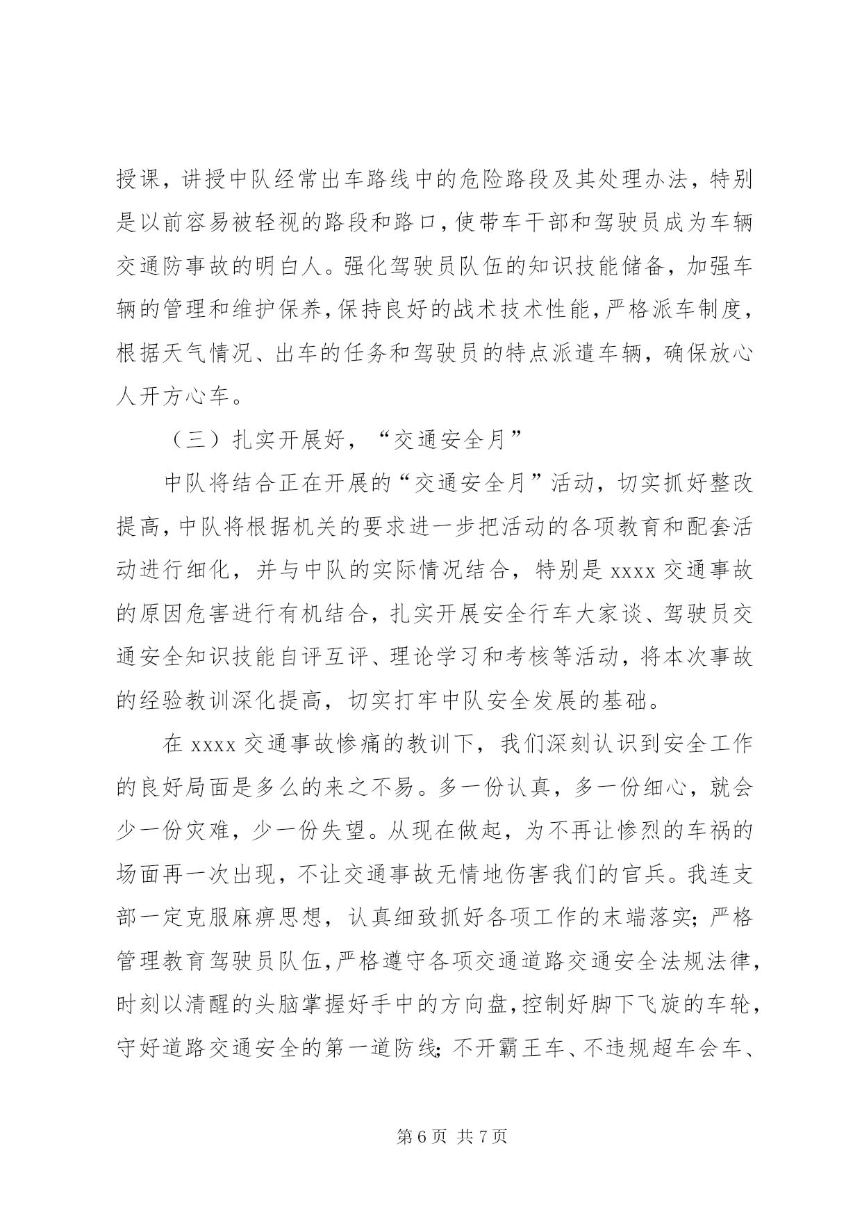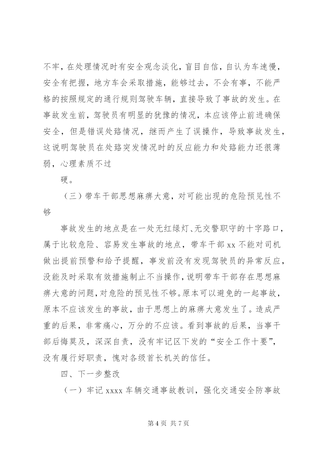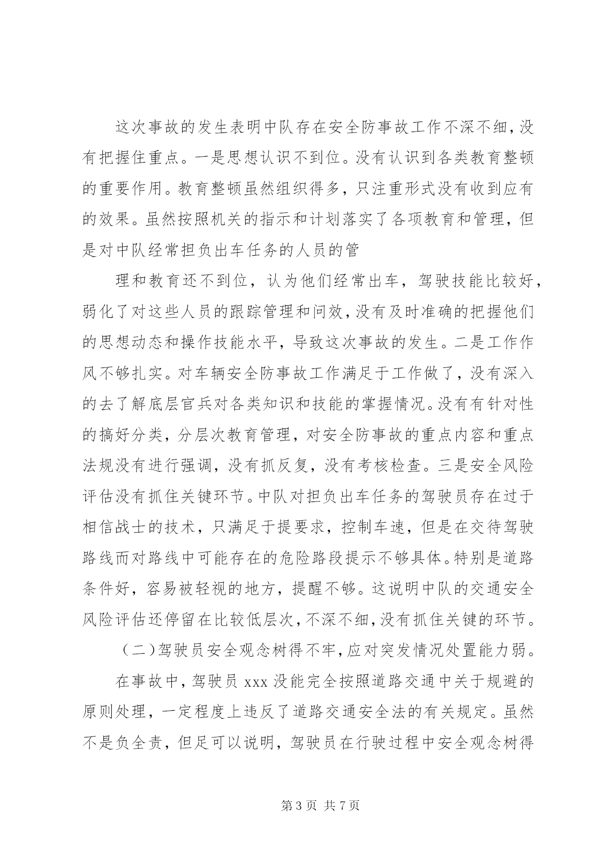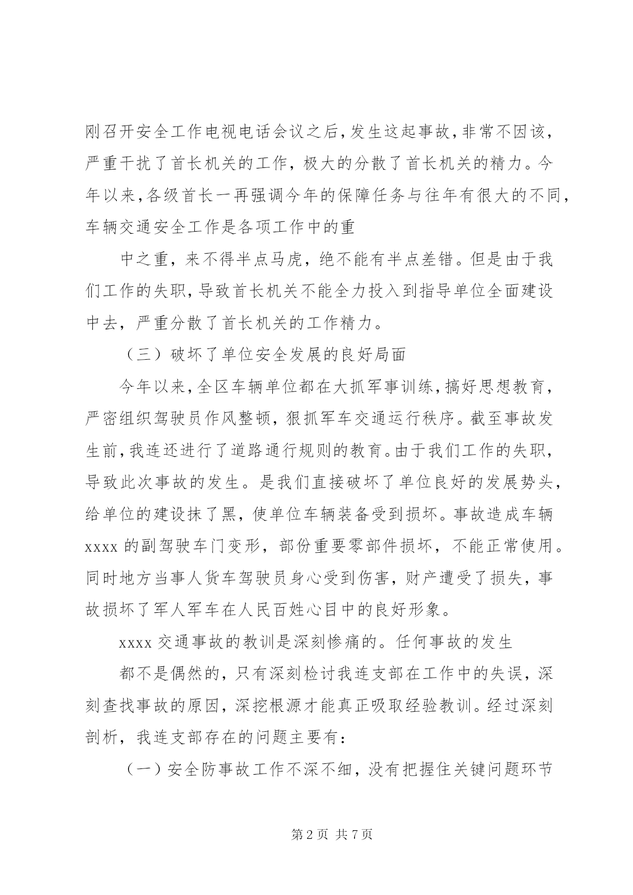 第PAGE\*Arabic\*MERGEFORMAT7页共NUMPAGES\*MERGEFORMAT7页交通安全检讨书xxxxx交通事故检查尊敬的xxx:我怀着无比愧疚的心情,为xxx车辆交通事故做深刻剖析和检查。2011年x月x日星期五我x从………………(事情经过),造成单位安全安全发展形势受到严重损坏,危害极其严重:(一)辜负了各级首长对中队的信任一直以来,我中队的全面建设都得到了各级首长的关心和帮助,中队在良好的环境中各项工作取得了明显的进步。特别是最近两年来,各级首长对我连在车辆保障方面的工作给予了高度的肯定,一些急难险重的任务都交给我连执行。这次事故的发生让我们愧疚万分。由于我们工作的失职,辜负了首长的信任,也破坏单位安全发展的大好形势。扪心自问,确实是由于我们工作的失职,深知车辆交通安全的重要,也看到了其他单位出事的危害,轮到我连怎么就对车辆交通安全没引起充分的重视呢。深刻反思我连工作的失误,我连官兵定会以认真而严肃、虔诚而紧张的态度看待车辆交通安全工作。(二)分散了首长机关的工作精力在单位大项任务多,抗洪抢险任务重的情况下,在省军区刚刚召开安全工作电视电话会议之后,发生这起事故,非常不因该,严重干扰了首长机关的工作,极大的分散了首长机关的精力。今年以来,各级首长一再强调今年的保障任务与往年有很大的不同,车辆交通安全工作是各项工作中的重中之重,来不得半点马虎,绝不能有半点差错。但是由于我们工作的失职,导致首长机关不能全力投入到指导单位全面建设中去,严重分散了首长机关的工作精力。(三)破坏了单位安全发展的良好局面今年以来,全区车辆单位都在大抓军事训练,搞好思想教育,严密组织驾驶员作风整顿,狠抓军车交通运行秩序。截至事故发生前,我连还进行了道路通行规则的教育。由于我们工作的失职,导致此次事故的发生。是我们直接破坏了单位良好的发展势头,给单位的建设抹了黑,使单位车辆装备受到损坏。事故造成车辆xxxx的副驾驶车门变形,部份重要零部件损坏,不能正常使用。同时地方当事人货车驾驶员身心受到伤害,财产遭受了损失,事故损坏了军人军车在人民百姓心目中的良好形象。xxxx交通事故的教训是深刻惨痛的。任何事故的发生都不是偶然的,只有深刻检讨我连支部在工作中的失误,深刻查找事故的原因,深挖根源才能真正吸取经验教训。经过深刻剖析,我连支部存在的问题主要有:(一)安全防事故工作不深不细,没有把握住关键问题环节这次事故的发生表明中队存在安全防事故工作不深不细,没有把握住重点。一是思想认识不到位。没有认识到各类教育整顿的重要作用。教育整顿虽然组织得多,只注重形式没有收到应有的效果。虽然按照机关的指示和计划落实了各项教育和管理,但是对中队经常担负出车任务的人员的管理和教育还不到位,认为他们经常出车,驾驶技能比较好,弱化了对这些人员的跟踪管理和问效,没有及时准确的把握他们的思想动态和操作技能水平,导致这次事故的发生。二是工作作风不够扎实。对车辆安全防事故工作满足于工作做了,没有深入的去了解底层官兵对各类知识和技能的掌握情况。没有有针对性的搞好分类,分层次教育管理,对安全防事故的重点内容和重点法规没有进行强调,没有抓反复,没有考核检查。三是安全风险评估没有抓住关键环节。中队对担负出车任务的驾驶员存在过于相信战士的技术,只满足于提要求,控制车速,但是在交待驾驶路线而对路线中可能存在的危险路段提示不够具体。特别是道路条件好,容易被轻视的地方,提醒不够。这说明中队的交通安全风险评估还停留在比较低层次,不深不细,没有抓住关键的环节。(二)驾驶员安全观念树得不牢,应对突发情况处置能力弱。在事故中,驾驶员xxx没能完全按照道路交通中关于规避的原则处理,一定程度上违反了道路交通安全法的有关规定。虽然不是负全责,但足可以说明,驾驶员在行驶过程中安全观念树得不牢,在处理情况时有安全观念淡化,盲目自信,自认为车速慢,安全有把握,地方车会采取措施,能够过去,不会有事,不能严格的按照规定的通行规则驾驶车辆,直接导致了事故的发生。在事故发生前,驾驶员有明显的犹豫的情况,本应该停止前进确保安全,但是错误处臵情况,继而产生了误操作,导致事故发生,这说明驾驶员在处臵突发情况时的反应能力和处臵能力还很薄弱,心理素质不过硬。(三)带车干部思想麻痹大意,对可能出现的危险预见性不够事故发生的地点是在一处无红绿灯、无交警职守的十字路口,属于比较危险、容易发生事故的地点,带车干部xx不能对司机做出提前预警和给予提醒,事发前没有发现驾驶员的异常反应,没能及时采取有效措施制止不当操作,说明带车干部存在思想麻痹大意的问题,对危险的预见性不够。原本可以避免的一起事故,原本不应该发生的事故,由于思想上的麻痹大意发生了。造成严重的后果,非常痛心,万分的不应该。看到事故的后果,当事干部