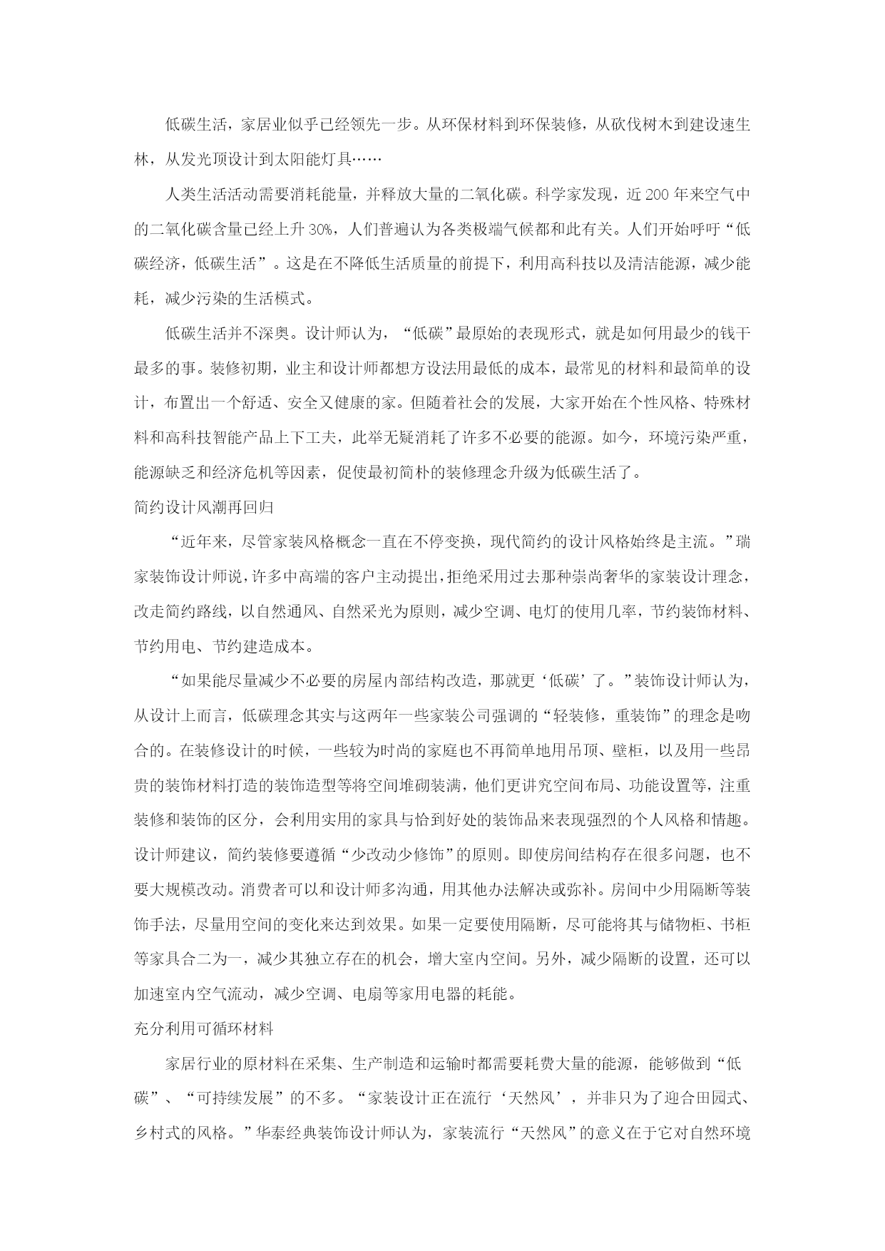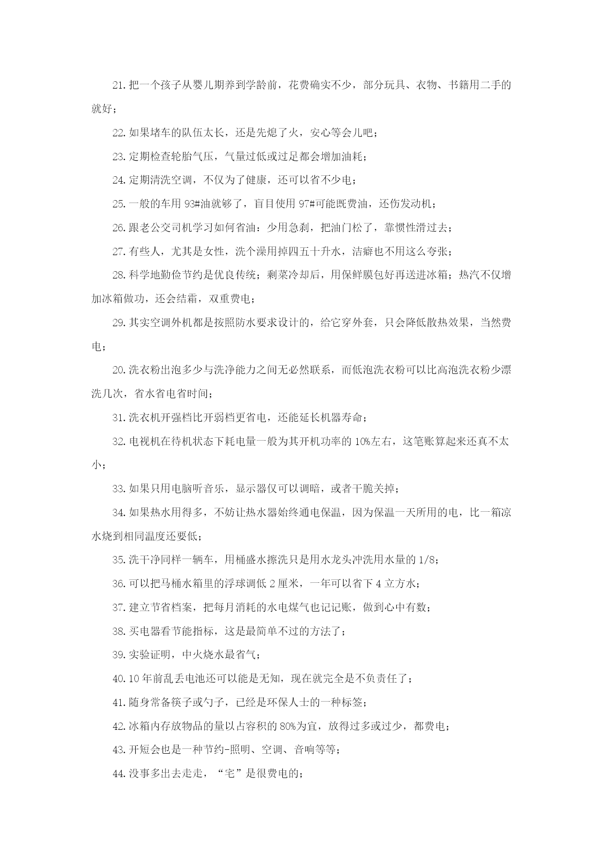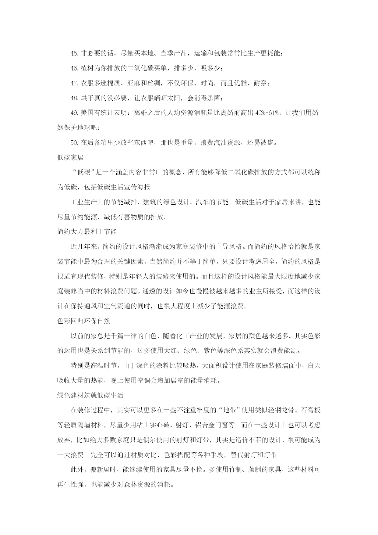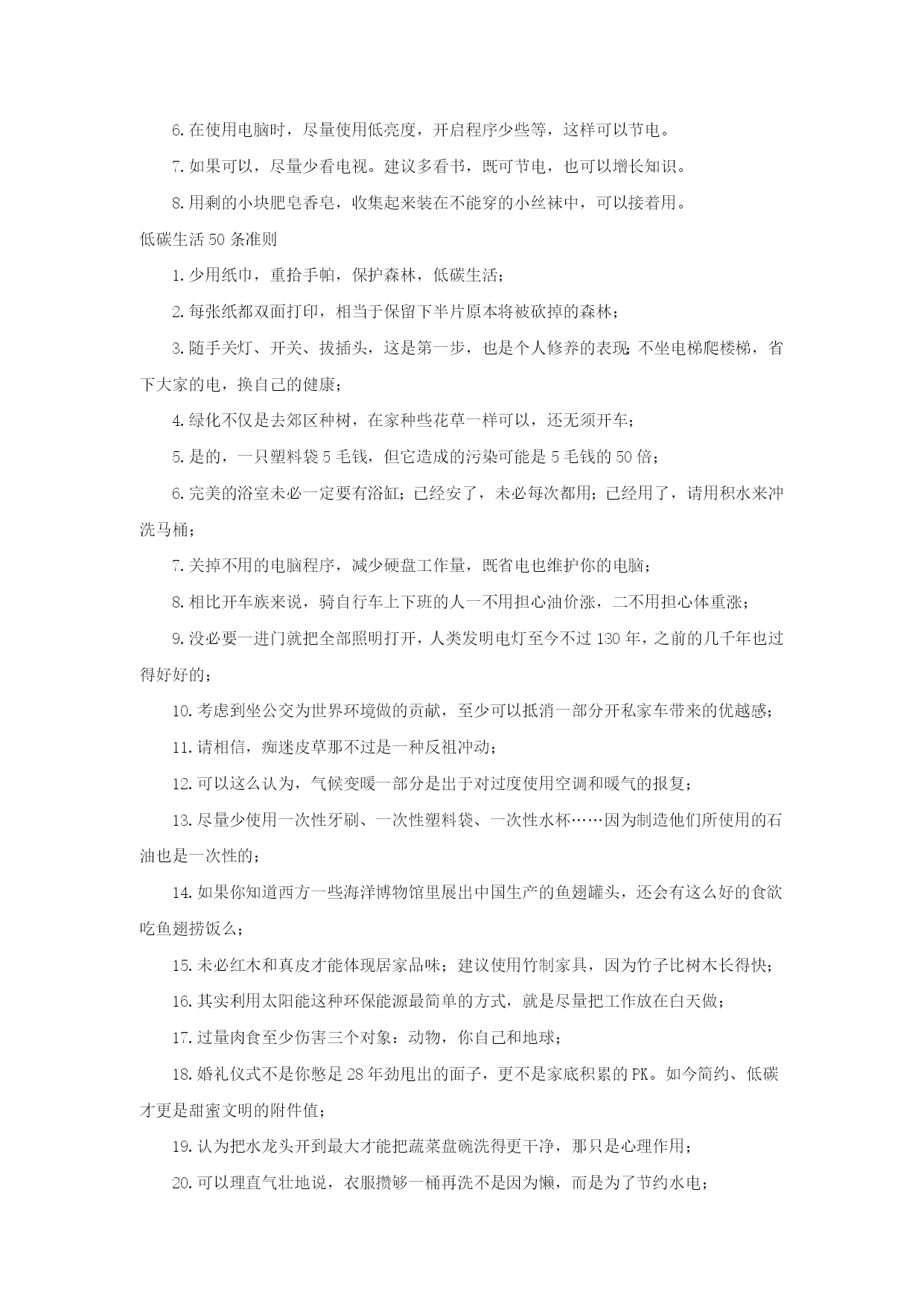 养成低碳生活习惯1.每天的淘米水可以用来洗手、擦家具、浇花等。干净卫生,自然滋润;2.将废旧报纸铺垫在衣橱的最底层,不仅可以吸潮,还能吸收衣柜中的异味;3.用过的面膜纸也不要扔掉,用它来擦首饰、擦家具的表面或者擦皮带,不仅擦得亮还能留下面膜纸的香气;4.喝过的茶叶渣,把它晒干,做一个茶叶枕头,既舒适,又能帮助改善睡眠;5.出门购物,尽量自己带环保袋,无论是免费或者收费的塑料袋,都减少使用;6.出门自带喝水杯,减少使用一次性杯子;7.多用永久性的筷子、饭盒,尽量避免使用一次性的餐具;8.养成随手关闭电器电源的习惯,避免浪费用电;9.尽量不使用冰箱、空调、电风扇,热时可用蒲扇或其他材质的扇子。经过手工DIY的再创造,你会发现原来废物也是宝,这样的家居环境健康且充满了创意的小欢乐。“低碳一族”正以自己生活细节的改变证明:气候变化已经不再只是环保主义者、政府官员和专家学者关心的问题,而是与我们每个人息息相关。在提倡健康生活已成潮流的今天,“低碳生活”不再只是一种理想,更是一种值得期待的新的生活方式。还有一些不容易注意的几点:1.每天使用传统的发条闹钟,取代电子闹钟;2.在午休和下班后关掉电脑电源;3.一旦不用电灯、空调,随手关掉;手机一旦充电完成,立即拔掉充电插头;4.选择晾晒衣物,避免使用滚筒式干衣机;用在附近公园等适合跑步的空气清新的地方中的慢跑取代在跑步机上的45分钟锻炼;5.用节能灯替换60瓦的灯泡;不开汽车改骑自行车,或步行;6.在使用电脑时,尽量使用低亮度,开启程序少些等,这样可以节电。7.如果可以,尽量少看电视。建议多看书,既可节电,也可以增长知识。8.用剩的小块肥皂香皂,收集起来装在不能穿的小丝袜中,可以接着用。低碳生活50条准则1.少用纸巾,重拾手帕,保护森林,低碳生活;2.每张纸都双面打印,相当于保留下半片原本将被砍掉的森林;3.随手关灯、开关、拔插头,这是第一步,也是个人修养的表现;不坐电梯爬楼梯,省下大家的电,换自己的健康;4.绿化不仅是去郊区种树,在家种些花草一样可以,还无须开车;5.是的,一只塑料袋5毛钱,但它造成的污染可能是5毛钱的50倍;6.完美的浴室未必一定要有浴缸;已经安了,未必每次都用;已经用了,请用积水来冲洗马桶;7.关掉不用的电脑程序,减少硬盘工作量,既省电也维护你的电脑;8.相比开车族来说,骑自行车上下班的人一不用担心油价涨,二不用担心体重涨;9.没必要一进门就把全部照明打开,人类发明电灯至今不过130年,之前的几千年也过得好好的;10.考虑到坐公交为世界环境做的贡献,至少可以抵消一部分开私家车带来的优越感;11.请相信,痴迷皮草那不过是一种反祖冲动;12.可以这么认为,气候变暖一部分是出于对过度使用空调和暖气的报复;13.尽量少使用一次性牙刷、一次性塑料袋、一次性水杯……因为制造他们所使用的石油也是一次性的;14.如果你知道西方一些海洋博物馆里展出中国生产的鱼翅罐头,还会有这么好的食欲吃鱼翅捞饭么;15.未必红木和真皮才能体现居家品味;建议使用竹制家具,因为竹子比树木长得快;16.其实利用太阳能这种环保能源最简单的方式,就是尽量把工作放在白天做;17.过量肉食至少伤害三个对象:动物,你自己和地球;18.婚礼仪式不是你憋足28年劲甩出的面子,更不是家底积累的PK。如今简约、低碳才更是甜蜜文明的附件值;19.认为把水龙头开到最大才能把蔬菜盘碗洗得更干净,那只是心理作用;20.可以理直气壮地说,衣服攒够一桶再洗不是因为懒,而是为了节约水电;21.把一个孩子从婴儿期养到学龄前,花费确实不少,部分玩具、衣物、书籍用二手的就好;22.如果堵车的队伍太长,还是先熄了火,安心等会儿吧;23.定期检查轮胎气压,气量过低或过足都会增加油耗;24.定期清洗空调,不仅为了健康,还可以省不少电;25.一般的车用93#油就够了,盲目使用97#可能既费油,还伤发动机;26.跟老公交司机学习如何省油:少用急刹,把油门松了,靠惯性滑过去;27.有些人,尤其是女性,洗个澡用掉四五十升水,洁癖也不用这么夸张;28.科学地勤俭节约是优良传统;剩菜冷却后,用保鲜膜包好再送进冰箱;热汽不仅增加冰箱做功,还会结霜,双重费电;29.其实空调外机都是按照防水要求设计的,给它穿外套,只会降低散热效果,当然费电;20.洗衣粉出泡多少与洗净能力之间无必然联系,而低泡洗衣粉可以比高泡洗衣粉少漂洗几次,省水省电省时间;31.洗衣机开强档比开弱档更省电,还能延长机器寿命;32.电视机在待机状态下耗电量一般为其开机功率的10%左右,这笔账算起来还真不太小;33.如果只用电脑听音乐,显示器仅可以调暗,或者干脆关掉;34.如果热水用得多,不妨让热