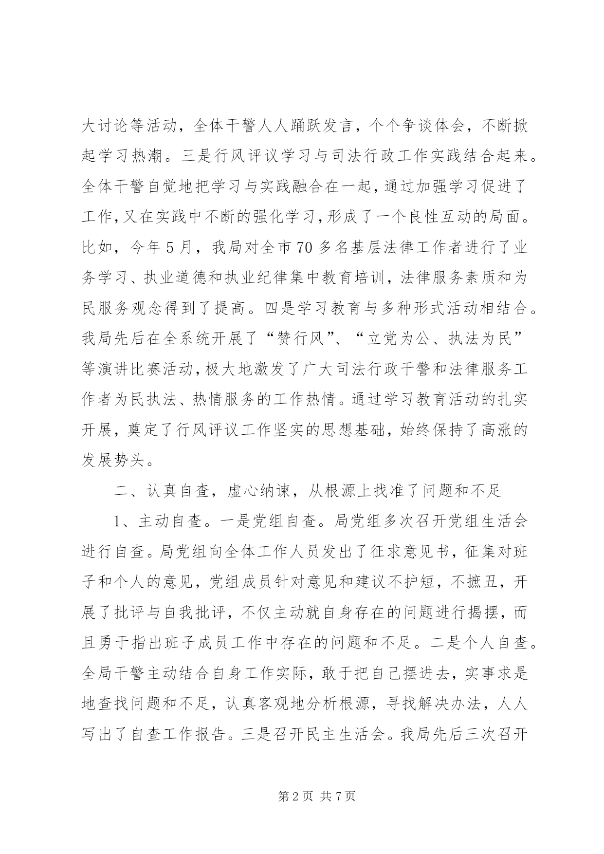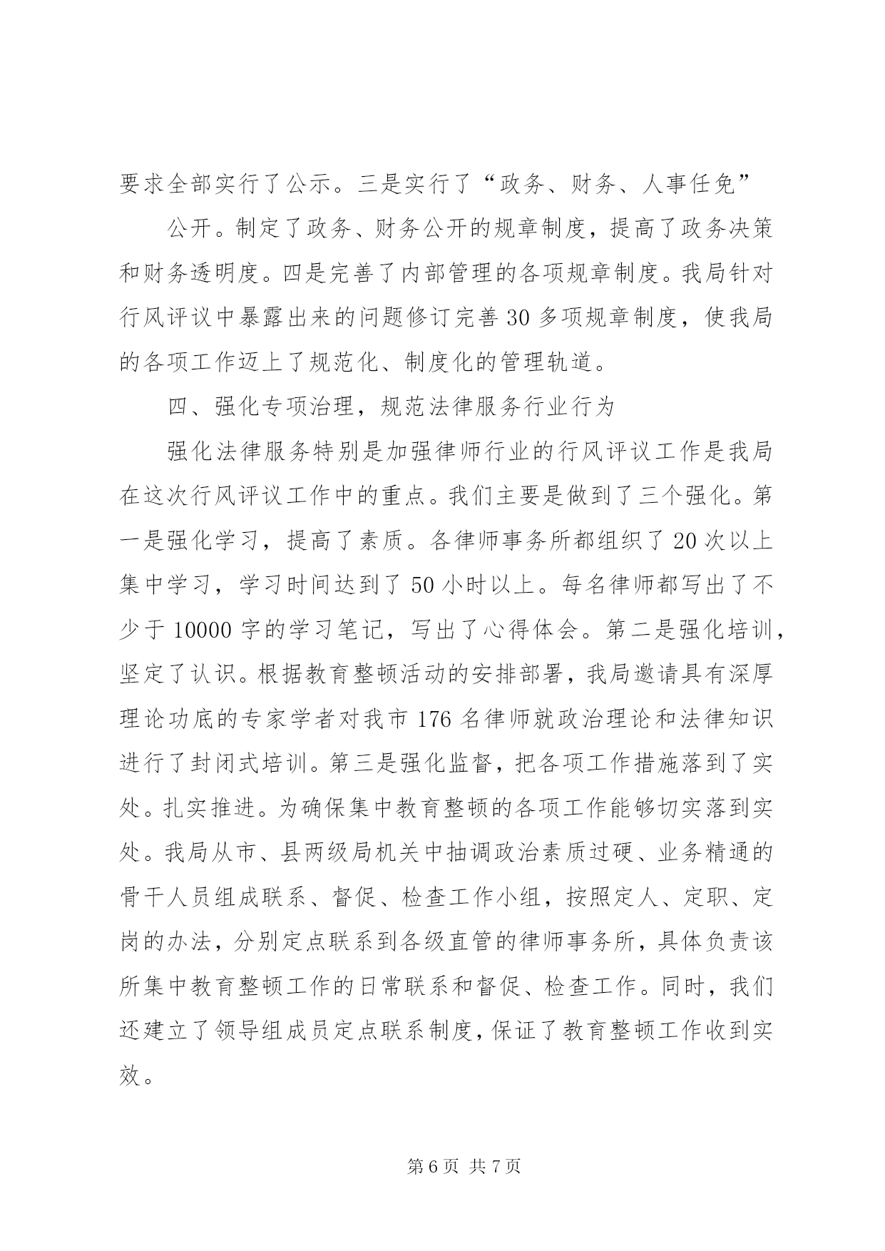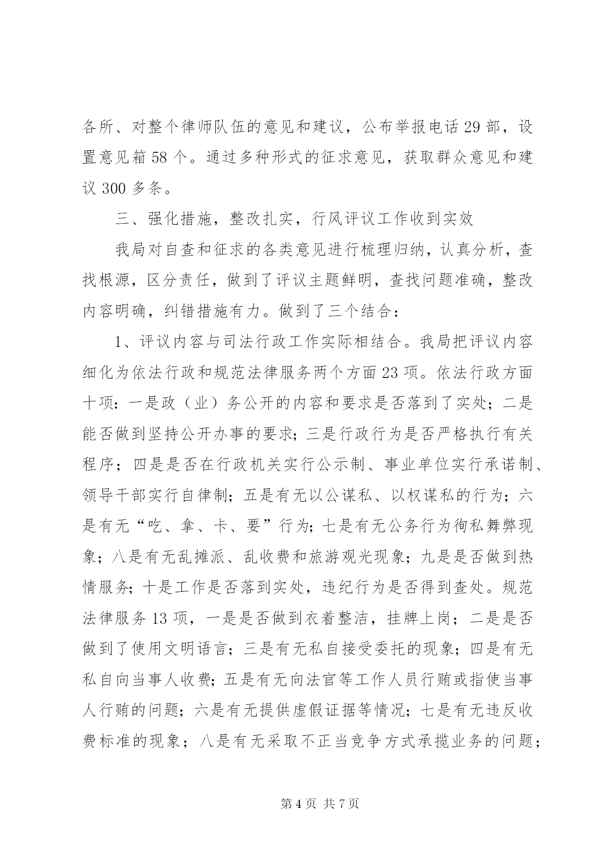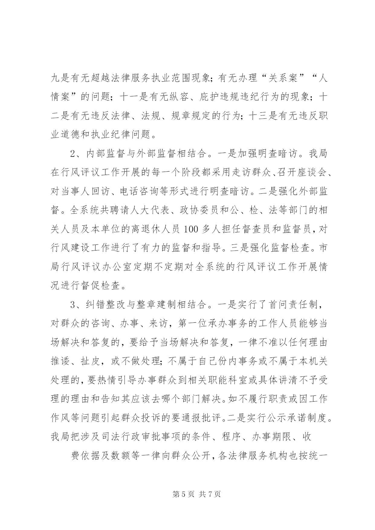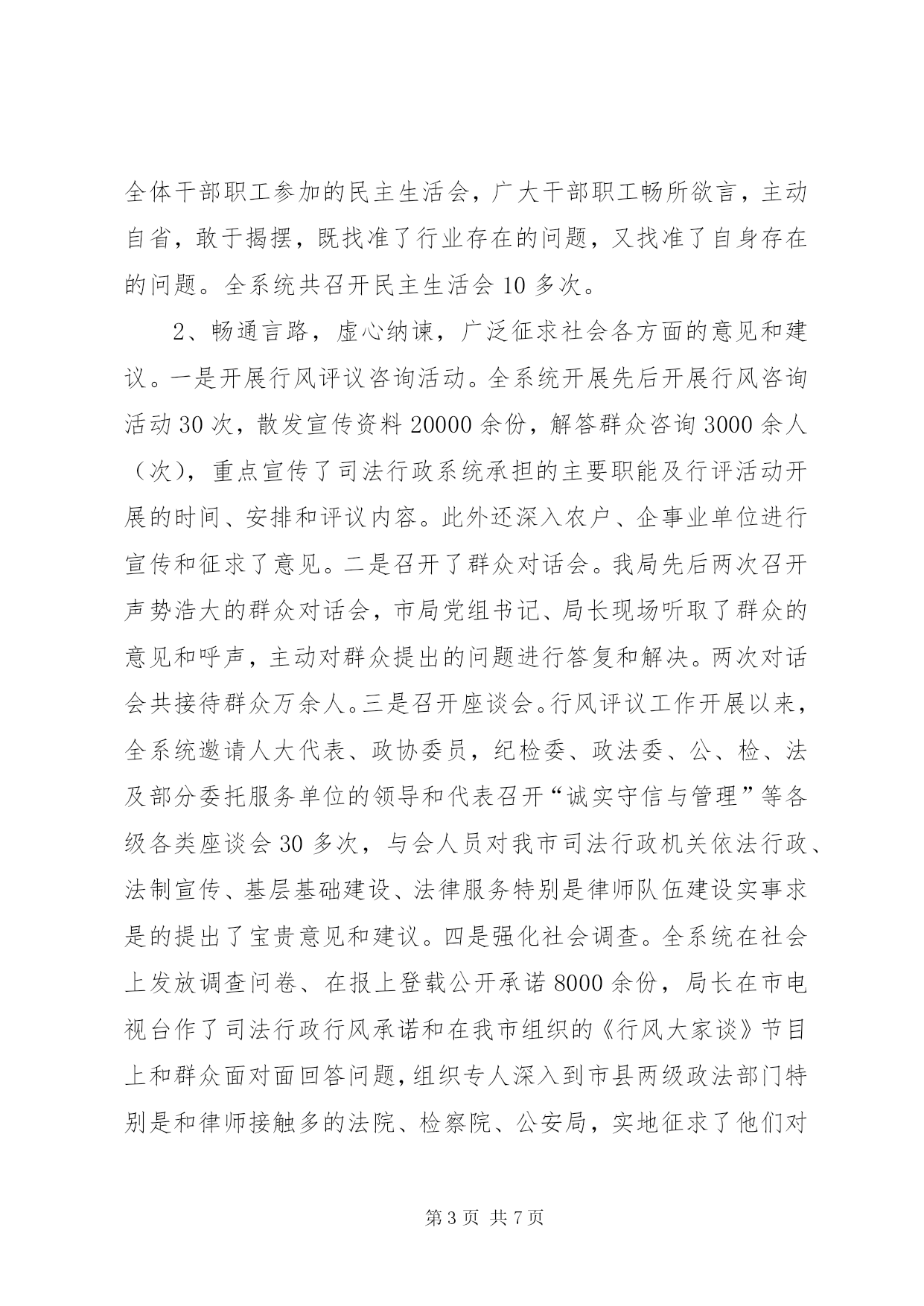 第PAGE\*Arabic\*MERGEFORMAT7页共NUMPAGES\*MERGEFORMAT7页司法行政系统行风评议工作汇报司法行政系统行风评议工作汇报自行风评议工作开展以来,我市司法行政系统坚持以党的十六大精神和“三个代表”重要思想为指导,认真按照省、市关于行风评议工作的安排部署,结合我市司法行政系统的工作实际,紧紧抓住转变作风和依法行政这一主线,通过强化教育,严格自查自纠,狠抓法律服务行业治理整顿,加强制度建设,有力地促进了司法行政各项工作的不断发展。一、强化教育,提高认识,营造行风评议工作的良好氛围从行风评议工作一开始,我局党组就把做好行风评议工作作为落实“三个代表”重要思想,坚持立党为公、执法为民,进一步转变行业作风的重要举措紧紧抓在手上,摆上了重要的工作日程。针对极少同志思想上存在的不重视、消极情绪,首先从提高强化教育入手,提高对此项工作的认识。坚持把学习教育活动贯穿于行风评议工作的始终,制定了详细的学习计划,采取了“一加强,四结合”的做法,一是加强班子的学习。局党组把行风评议规定的学习内容作为党组的必学课目,全体班子成员挤时间学,主动学,对照检查学,起到了表率作用。二是集体学习与个人自学相结合。我们充分利用雷打不动的周一下午的集体学习时间,组织全体干警开展行风评议学习活动,每人都写出了近万字的学习笔记和心得体会,并开展了“做好行风评议,争创十佳干警”大讨论等活动,全体干警人人踊跃发言,个个争谈体会,不断掀起学习热潮。三是行风评议学习与司法行政工作实践结合起来。全体干警自觉地把学习与实践融合在一起,通过加强学习促进了工作,又在实践中不断的强化学习,形成了一个良性互动的局面。比如,今年5月,我局对全市70多名基层法律工作者进行了业务学习、执业道德和执业纪律集中教育培训,法律服务素质和为民服务观念得到了提高。四是学习教育与多种形式活动相结合。我局先后在全系统开展了“赞行风”、“立党为公、执法为民”等演讲比赛活动,极大地激发了广大司法行政干警和法律服务工作者为民执法、热情服务的工作热情。通过学习教育活动的扎实开展,奠定了行风评议工作坚实的思想基础,始终保持了高涨的发展势头。二、认真自查,虚心纳谏,从根源上找准了问题和不足1、主动自查。一是党组自查。局党组多次召开党组生活会进行自查。局党组向全体工作人员发出了征求意见书,征集对班子和个人的意见,党组成员针对意见和建议不护短,不摭丑,开展了批评与自我批评,不仅主动就自身存在的问题进行揭摆,而且勇于指出班子成员工作中存在的问题和不足。二是个人自查。全局干警主动结合自身工作实际,敢于把自己摆进去,实事求是地查找问题和不足,认真客观地分析根源,寻找解决办法,人人写出了自查工作报告。三是召开民主生活会。我局先后三次召开全体干部职工参加的民主生活会,广大干部职工畅所欲言,主动自省,敢于揭摆,既找准了行业存在的问题,又找准了自身存在的问题。全系统共召开民主生活会10多次。2、畅通言路,虚心纳谏,广泛征求社会各方面的意见和建议。一是开展行风评议咨询活动。全系统开展先后开展行风咨询活动30次,散发宣传资料20000余份,解答群众咨询3000余人(次),重点宣传了司法行政系统承担的主要职能及行评活动开展的时间、安排和评议内容。此外还深入农户、企事业单位进行宣传和征求了意见。二是召开了群众对话会。我局先后两次召开声势浩大的群众对话会,市局党组书记、局长现场听取了群众的意见和呼声,主动对群众提出的问题进行答复和解决。两次对话会共接待群众万余人。三是召开座谈会。行风评议工作开展以来,全系统邀请人大代表、政协委员,纪检委、政法委、公、检、法及部分委托服务单位的领导和代表召开“诚实守信与管理”等各级各类座谈会30多次,与会人员对我市司法行政机关依法行政、法制宣传、基层基础建设、法律服务特别是律师队伍建设实事求是的提出了宝贵意见和建议。四是强化社会调查。全系统在社会上发放调查问卷、在报上登载公开承诺8000余份,局长在市电视台作了司法行政行风承诺和在我市组织的《行风大家谈》节目上和群众面对面回答问题,组织专人深入到市县两级政法部门特别是和律师接触多的法院、检察院、公安局,实地征求了他们对各所、对整个律师队伍的意见和建议,公布举报电话29部,设置意见箱58个。通过多种形式的征求意见,获取群众意见和建议300多条。三、强化措施,整改扎实,行风评议工作收到实效我局对自查和征求的各类意见进行梳理归纳,认真分析,查找根源,区分责任,做到了评议主题鲜明,查找问题准确,整改内容明确,纠错措施有力。做到了三个结合:1、评议内容与司法行政工作实际相结合。我局把评议内容细化为依法行政和规范法律服务两个方面23项。依法行政方面十项:一是政(业)务公开的内容和要求是否落到了实处;二是能否做到坚持公