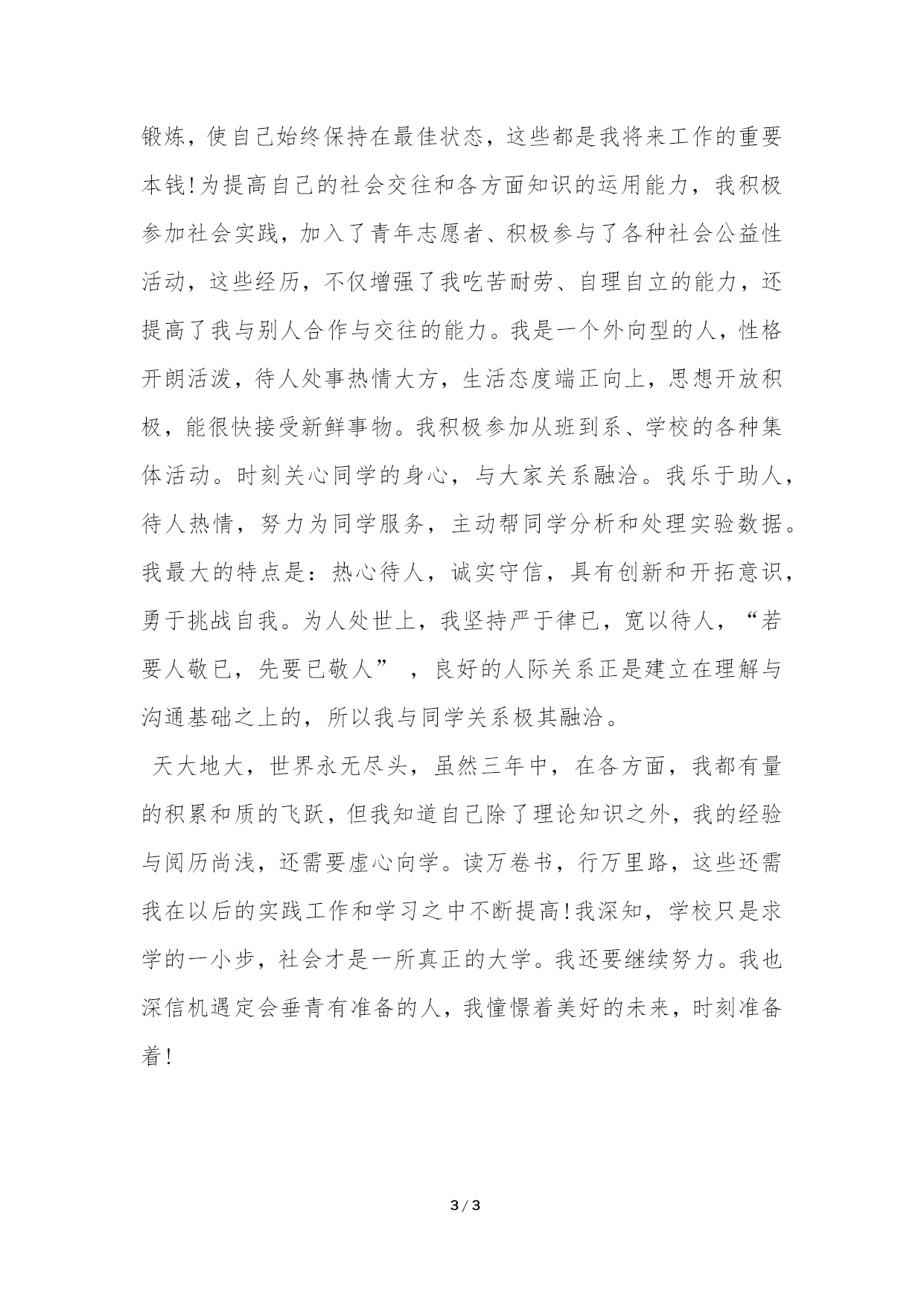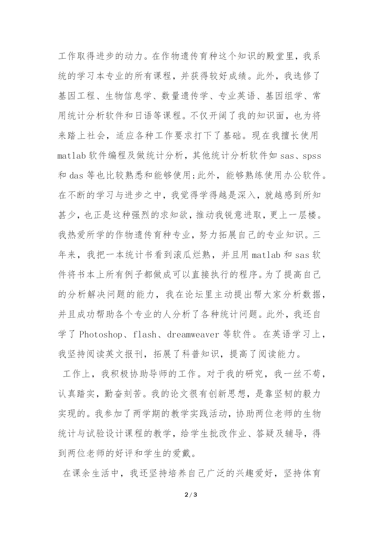 PAGE3/NUMPAGES3党校研究生毕业自我鉴定党校研究生毕业自我鉴定岁月匆匆,珍贵的研究生三年的美丽时光就快结束了。经过良师的精心指导以及自己的奋力拚搏、自强不息,我逐渐成为了一个能适应社会要求的硕士毕业生,并为做一个知识型的社会主义建设者打下坚实的基础。回想三年走过的路,有得也有失,有必要总结一下这三年的得失,从中继承做得好的方面改进不足的地方,使自己回顾走过的路,也更是为了看清将来要走的路。“求是、求实、求新、求精”,这是扬州大学的学校精神,也是我个人的奋斗目标。本人热爱社会主义祖国,坚决拥护中国共产党的领导,努力学习马克思列宁主义毛泽东思想和邓小平理论,不断提高自己的政治觉悟和道德修养,严格遵守国家的法律和学校的纪律。尊重社会公德,笃守诚、信、礼、智的做人原则。积极参加各种校内党校活动,积极向党组织靠拢,已成为一名预备党员。在三年研究生生涯中,无论在学习、工作还是生活上我都坚决贯彻踏实勤奋,诚实向上的人生信条,努力不懈的加强自己的综合素质,使自己全面发展。工欲善其事,必先利其器。在求学期间,学而知不足是我学习、工作取得进步的动力。在作物遗传育种这个知识的殿堂里,我系统的学习本专业的所有课程,并获得较好成绩。此外,我选修了基因工程、生物信息学、数量遗传学、专业英语、基因组学、常用统计分析软件和日语等课程。不仅开阔了我的知识面,也为将来踏上社会,适应各种工作要求打下了基础。现在我擅长使用matlab软件编程及做统计分析,其他统计分析软件如sas、spss和das等也比较熟悉和能够使用;此外,能够熟练使用办公软件。在不断的学习与进步之中,我觉得学得越是深入,就越感到所知甚少,也正是这种强烈的求知欲,推动我锐意进取,更上一层楼。我热爱所学的作物遗传育种专业,努力拓展自己的专业知识。三年来,我把一本统计书看到滚瓜烂熟,并且用matlab和sas软件将书本上所有例子都做成可以直接执行的程序。为了提高自己的分析解决问题的能力,我在论坛里主动提出帮大家分析数据,并且成功帮助各个专业的人分析了各种统计问题。此外,我还自学了Photoshop、flash、dreamweaver等软件。在英语学习上,我坚持阅读英文报刊,拓展了科普知识,提高了阅读能力。工作上,我积极协助导师的工作。对于我的研究,我一丝不苟,认真踏实,勤奋刻苦。我的论文很有创新思想,是靠坚韧的毅力实现的。我参加了两学期的教学实践活动,协助两位老师的生物统计与试验设计课程的教学,给学生批改作业、答疑及辅导,得到两位老师的好评和学生的爱戴。在课余生活中,我还坚持培养自己广泛的兴趣爱好,坚持体育锻炼,使自己始终保持在最佳状态,这些都是我将来工作的重要本钱!为提高自己的社会交往和各方面知识的运用能力,我积极参加社会实践,加入了青年志愿者、积极参与了各种社会公益性活动,这些经历,不仅增强了我吃苦耐劳、自理自立的能力,还提高了我与别人合作与交往的能力。我是一个外向型的人,性格开朗活泼,待人处事热情大方,生活态度端正向上,思想开放积极,能很快接受新鲜事物。我积极参加从班到系、学校的各种集体活动。时刻关心同学的身心,与大家关系融洽。我乐于助人,待人热情,努力为同学服务,主动帮同学分析和处理实验数据。我最大的特点是:热心待人,诚实守信,具有创新和开拓意识,勇于挑战自我。为人处世上,我坚持严于律已,宽以待人,“若要人敬已,先要已敬人”,良好的人际关系正是建立在理解与沟通基础之上的,所以我与同学关系极其融洽。天大地大,世界永无尽头,虽然三年中,在各方面,我都有量的积累和质的飞跃,但我知道自己除了理论知识之外,我的经验与阅历尚浅,还需要虚心向学。读万卷书,行万里路,这些还需我在以后的实践工作和学习之中不断提高!我深知,学校只是求学的一小步,社会才是一所真正的大学。我还要继续努力。我也深信机遇定会垂青有准备的人,我憧憬着美好的未来,时刻准备着!