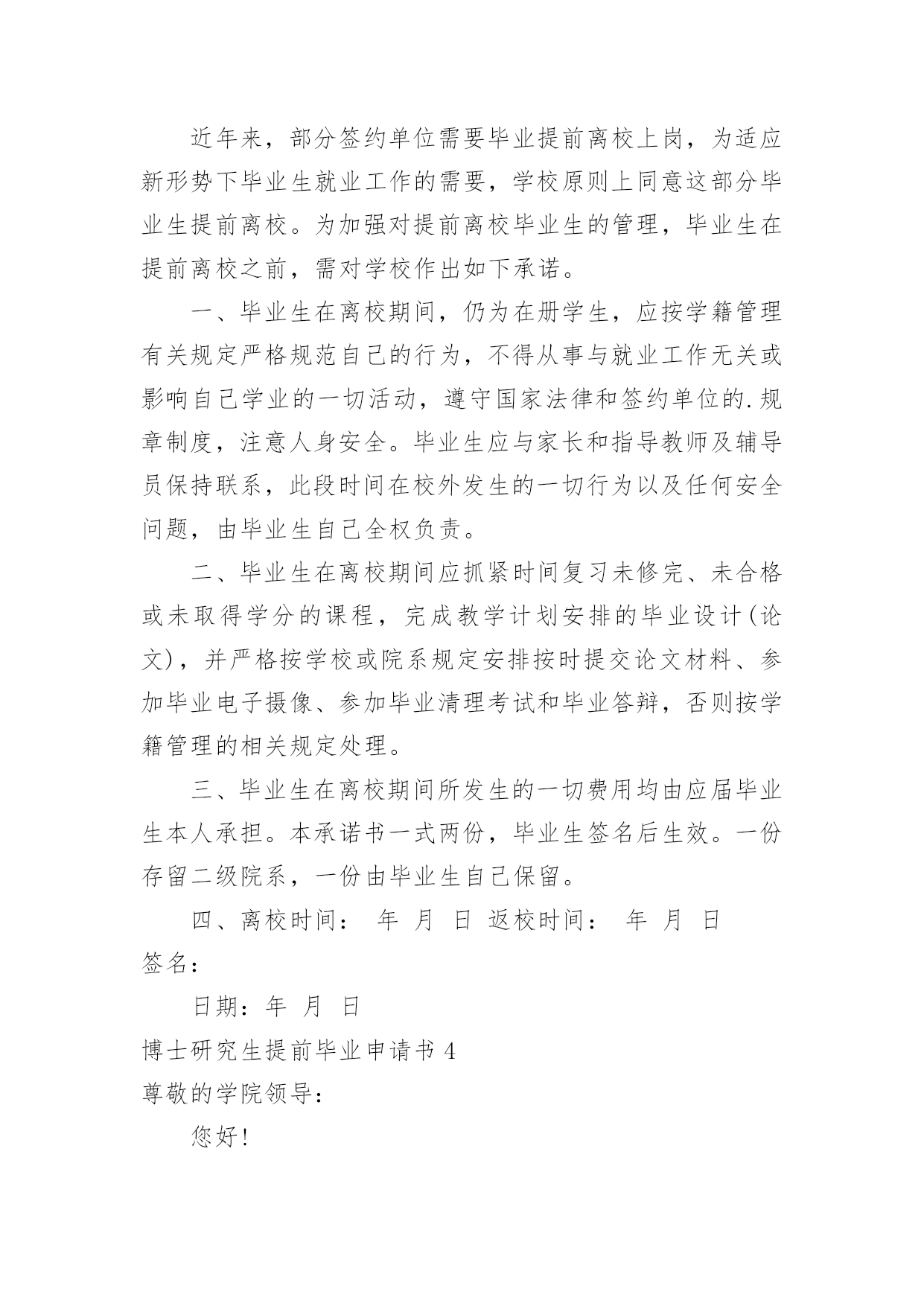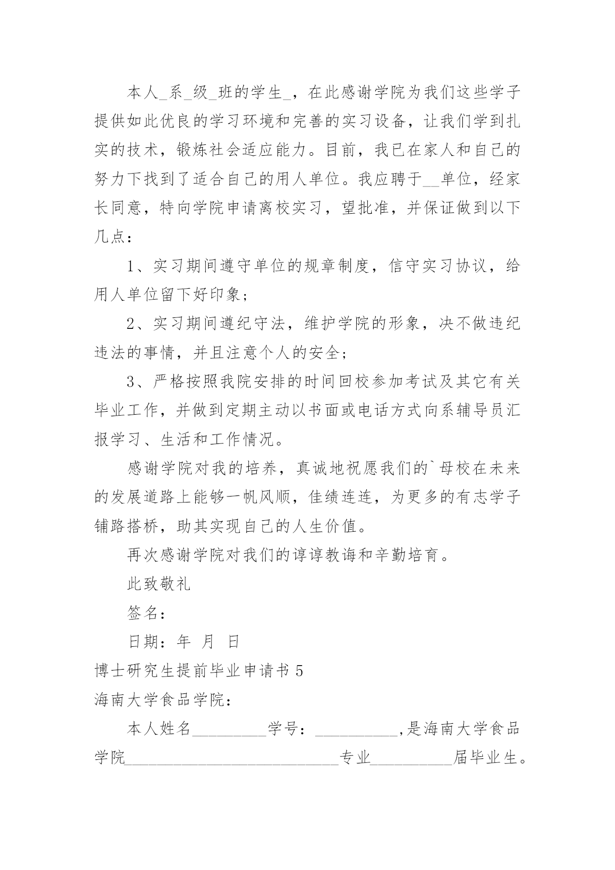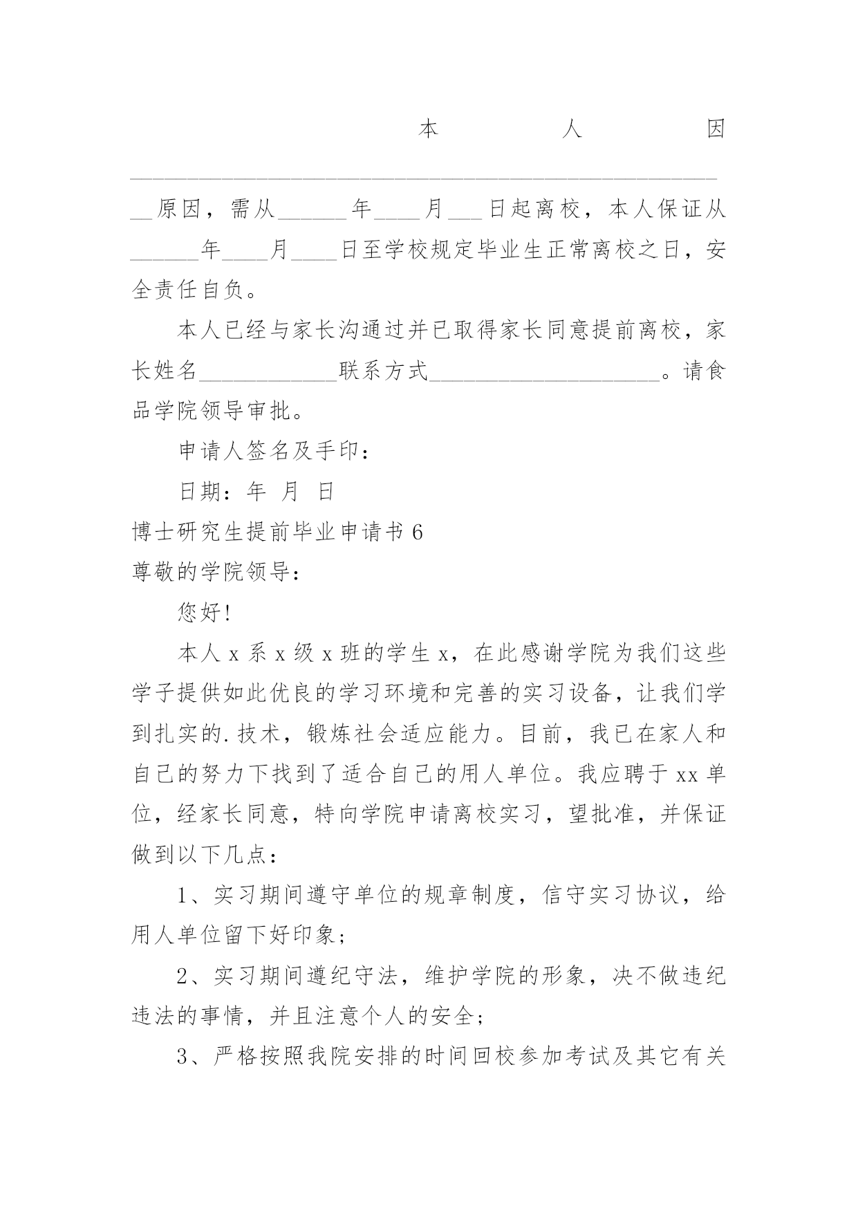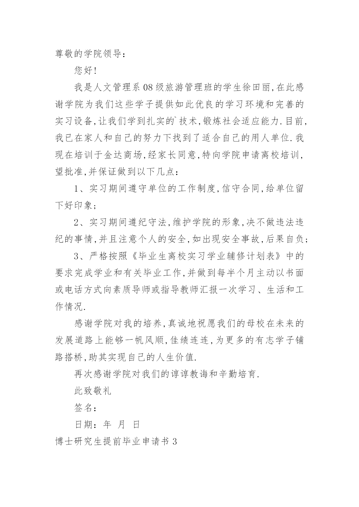 博士研究生提前毕业申请书博士研究生提前毕业申请书在社会不断进步的今天,申请书应用范围广泛,申请书可以使我们的愿望和请求得到合理表达。大家知道申请书的格式吗?以下是小编帮大家整理的博士研究生提前毕业申请书,欢迎大家借鉴与参考,希望对大家有所帮助。博士研究生提前毕业申请书1尊敬的学院领导:我是__级_____专业___届毕业生__。根据本人已经在校学习两年的实际情况,本人自愿申请并经家长同意离校前往__有限公司参加就业工作。在离校就业期间,我保证按时参加所修各种课程的考试和完成毕业设计及答辩,并经常与学校保持联系,在学校需要学生返校时,及时返校。在此期间耽误的学习和发生的'安全事故,由我本人及家长负责,与学校无关。离校的日期从_年_月_日起。特此申请,请予批准!申请人签名:_年_月_日博士研究生提前毕业申请书2尊敬的学院领导:您好!我是人文管理系08级旅游管理班的学生徐田丽,在此感谢学院为我们这些学子提供如此优良的学习环境和完善的实习设备,让我们学到扎实的`技术,锻炼社会适应能力.目前,我已在家人和自己的努力下找到了适合自己的用人单位.我现在培训于金达商场,经家长同意,特向学院申请离校培训,望批准,并保证做到以下几点:1、实习期间遵守单位的工作制度,信守合同,给单位留下好印象;2、实习期间遵纪守法,维护学院的形象,决不做违法违纪的事情,并且注意个人的安全,如出现安全事故,后果自负;3、严格按照《毕业生离校实习学业辅修计划表》中的要求完成学业和有关毕业工作,并做到每半个月主动以书面或电话方式向素质导师或指导教师汇报一次学习、生活和工作情况.感谢学院对我的培养,真诚地祝愿我们的母校在未来的发展道路上能够一帆风顺,佳绩连连,为更多的有志学子铺路搭桥,助其实现自己的人生价值.再次感谢学院对我们的谆谆教诲和辛勤培育.此致敬礼签名:日期:年月日博士研究生提前毕业申请书3近年来,部分签约单位需要毕业提前离校上岗,为适应新形势下毕业生就业工作的需要,学校原则上同意这部分毕业生提前离校。为加强对提前离校毕业生的管理,毕业生在提前离校之前,需对学校作出如下承诺。一、毕业生在离校期间,仍为在册学生,应按学籍管理有关规定严格规范自己的行为,不得从事与就业工作无关或影响自己学业的一切活动,遵守国家法律和签约单位的.规章制度,注意人身安全。毕业生应与家长和指导教师及辅导员保持联系,此段时间在校外发生的一切行为以及任何安全问题,由毕业生自己全权负责。二、毕业生在离校期间应抓紧时间复习未修完、未合格或未取得学分的课程,完成教学计划安排的毕业设计(论文),并严格按学校或院系规定安排按时提交论文材料、参加毕业电子摄像、参加毕业清理考试和毕业答辩,否则按学籍管理的相关规定处理。三、毕业生在离校期间所发生的一切费用均由应届毕业生本人承担。本承诺书一式两份,毕业生签名后生效。一份存留二级院系,一份由毕业生自己保留。四、离校时间:年月日返校时间:年月日签名:日期:年月日博士研究生提前毕业申请书4尊敬的学院领导:您好!本人_系_级_班的学生_,在此感谢学院为我们这些学子提供如此优良的学习环境和完善的实习设备,让我们学到扎实的技术,锻炼社会适应能力。目前,我已在家人和自己的努力下找到了适合自己的用人单位。我应聘于__单位,经家长同意,特向学院申请离校实习,望批准,并保证做到以下几点:1、实习期间遵守单位的规章制度,信守实习协议,给用人单位留下好印象;2、实习期间遵纪守法,维护学院的形象,决不做违纪违法的事情,并且注意个人的安全;3、严格按照我院安排的时间回校参加考试及其它有关毕业工作,并做到定期主动以书面或电话方式向系辅导员汇报学习、生活和工作情况。感谢学院对我的培养,真诚地祝愿我们的`母校在未来的发展道路上能够一帆风顺,佳绩连连,为更多的有志学子铺路搭桥,助其实现自己的人生价值。再次感谢学院对我们的谆谆教诲和辛勤培育。此致敬礼签名:日期:年月日博士研究生提前毕业申请书5海南大学食品学院:本人姓名_________学号:__________,是海南大学食品学院__________________________专业__________届毕业生。本人因_____________________________________________________原因,需从______年____月___日起离校,本人保证从______年____月____日至学校规定毕业生正常离校之日,安全责任自负。本人已经与家长沟通过并已取得家长同意提前离校,家长姓名____________联系方式____________________。请食品学院领导审批。申请人签名及手印:日期:年月日博士研究生提前毕业申请书6尊敬的学院领导:您好!本人x系x级x班的学生x,在此感谢学院为我们这些学子提供如此优良