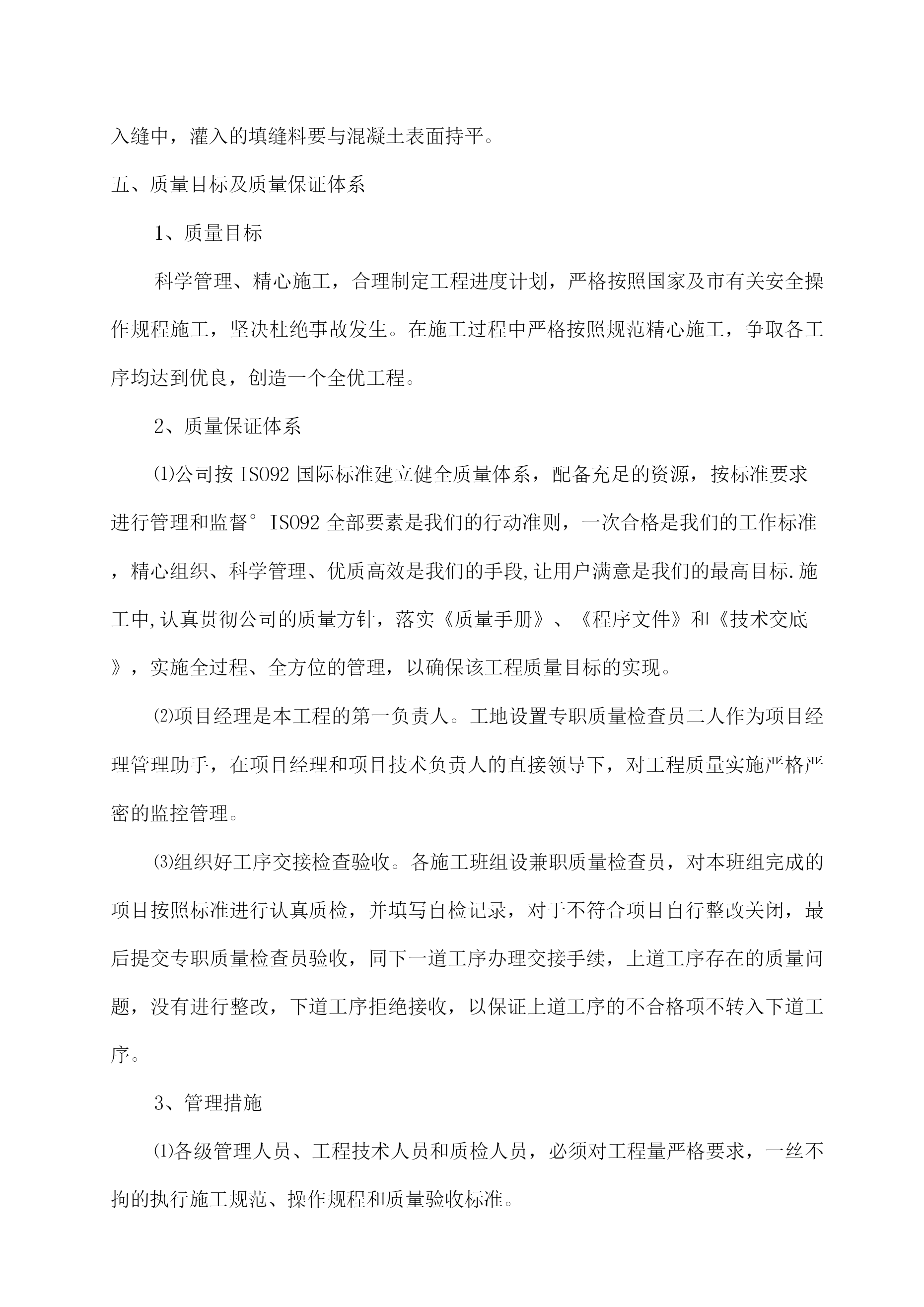 武汉市轨道交通三号线土建工程第二标段(体育中心、南站)交通疏解道路施工方案编制:审核:O中铁十七局集团中国铁建CHINARAIUWAY17BUREAUGROUP武汉中机道父通二亏线土建二替坝日徐埋部二。一二年七月TOC\o"1-5"\h\z一、编制说明1二、工程概况1三、施工方案21、路面结构型式2.2、施工缝设置2,3、面层配筋设计错误!未定义书.签4、路面坡度及排水设置3.四、施工工艺31、施工准备及筹划3.2、路基施工33、素混凝土垫层及钢筋混凝土面层施工4五、质量目标及质量保证体系71、质量目标72、质量保证体系.73、管理措施84、工程质量的具体要求95、质量管理领导小组10六、安全生产保证措施101、安全目标102、安全技术措施制度103、安全管理领导小组1.1一、编制说明1、编制依据1。1《公路水泥混凝土路面设计规范》JTGD40-20111。2《公路水泥混凝土路面施工技术规范》JTGF30-231.3《公路路基设计规范》JTGD30-241。4武汉市轨道交通三号线土建工程第二标段施工承包合同1、5交管审批通过的交通疏解方案2、因管线迁改而破坏的现有路面,土路床由管线迁改单位负责压实。3、目前无设计图纸,方案请审定是否合理。4、本方案为高架桥下范围以外的交通疏解道路,高架桥下路面施工详见《高架桥下交通疏解道路施工方案》.二、工程概况武汉轨道交通三号线二标体育中心南站沿318国道纵向敷设,车站横跨车城北路,为地下三层双柱三跨明挖岛式站台换乘站,有效站台宽度为13m,与6号线体育中心南站呈L形换乘。围护结构采用钻孔灌注桩形式,支撑采用混凝土支撑+钢支撑组合,共布设4道撑.本站共设4个出入、2组风亭。车站外包总长185.2m,标准段总宽21.9m,站台宽度为13m,车站埋深约23.37m。因车站周边环境较为复杂,基坑施工打围需占据318国道进城向机动车道大幅路面,且车站紧临沌阳高架桥,横跨车城北路,根据施工总体筹划及结合现场实际,我部将整个施工期间交通组织分六期实施,即:附图1:第一期交通疏解方案附图2:第二期交通疏解方案附图3:第三期交通疏解方案附图4:第四期交通疏解方案附图5:第五期交通疏解方案附图6:第六期交通疏解方案三、施工方案1、路面结构型式根据合同清单及结合以往市政道路施工经验,我部决定采用双层混凝土路面结构型式,面层为18cm厚C30混凝土,垫层为25cm厚C20混凝土,垫层下土路床作压实处理。路面结构型式如下:路面结构型式2、施工缝设置纵向接缝的间距取标准路面宽度3.5m,横向接缝间距按16m分段设置。3、特殊部位处理混凝土面层下有管线等构造物,其顶面至面层底面的距离如小于8mm时,则在构造物顶宽及两侧各1。5(H+1)且不小于4m的范围内,混凝土面层内应布设双层钢筋网,上下层钢筋网各距面层顶面和底面1/4~1/3厚度处.具体详见附图7:特殊部位配筋图。位于路面上方的电缆沟,详见《体育中心南站电缆沟保护方案》.4、路面坡度及排水设置新筑路面与东风大道及车城北路顺接,横向坡度为10%。,纵向坡度详见附图。道路边缘每隔20m布置一收水井,使雨水往市政排水管网汇集。四、施工工艺1、施工准备及筹划技术质量部组织人员进行详细的技术交底,明确人员分工,对现场路面标高、地质情况、面积等项目进行仔细调查核对,施作路面范围沿施工平面图围挡线路实施打围,先将草坪进行移除处理,并预先埋设好临时施工供水、供电钢套管,以方便后续管线穿路。2、路基施工当市政管网铺设完毕,路基应分层铺筑,均匀压实,压实度应符合表1规定:表1路基压实度标准填挖类型路面底面以下深度(m)压实度(%)高级公路、一级公路二级公路三、四级公路上路堤0.8〜1。5>94>94>93下路堤1.5以下>93>92>90对于处于原绿化带内的交通疏解路面,采用石硝填筑压实,厚度2mm。压实应先轻后重、先慢后快、均匀一致。压路机最大速度不宜超过4km/h。填土的压实遍数,应按压实度要求,经现场试验确定。压实过程中应采取措施保护地下管线、构筑物安全。碾压应自路基边缘向中央进行,压路机轮外缘距路基边应保持安全距离,压实度应达到要求,直至表面应无显著轮迹、翻浆、起皮、波浪等现象。3、混凝土垫层及面层施工先施工混凝土垫层,待其达到设计强度75%后再行施工混凝土面层.⑴施工准备工作首先对基础进行质量检查:基础的几何尺寸、路拱、平整度和压实度,测量放出路面中线、边线及伸缩缝纵向每4米设置一道缩缝,每30米设一道伸缝),并在路旁设置临时水准点,以便在施工过程中复核路面标高.⑵安装模板混凝土板以一个车道宽度为一块路面板宽度来铺筑,路