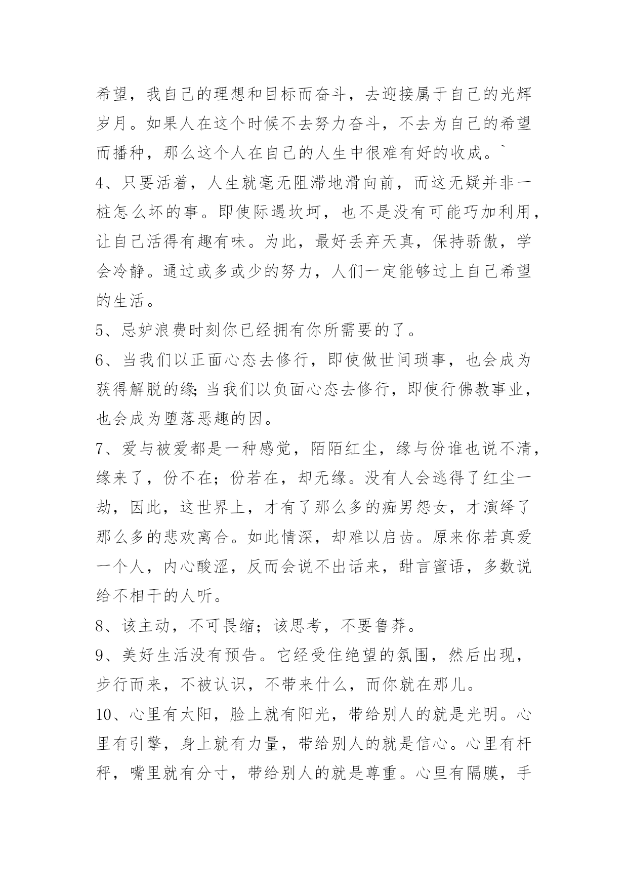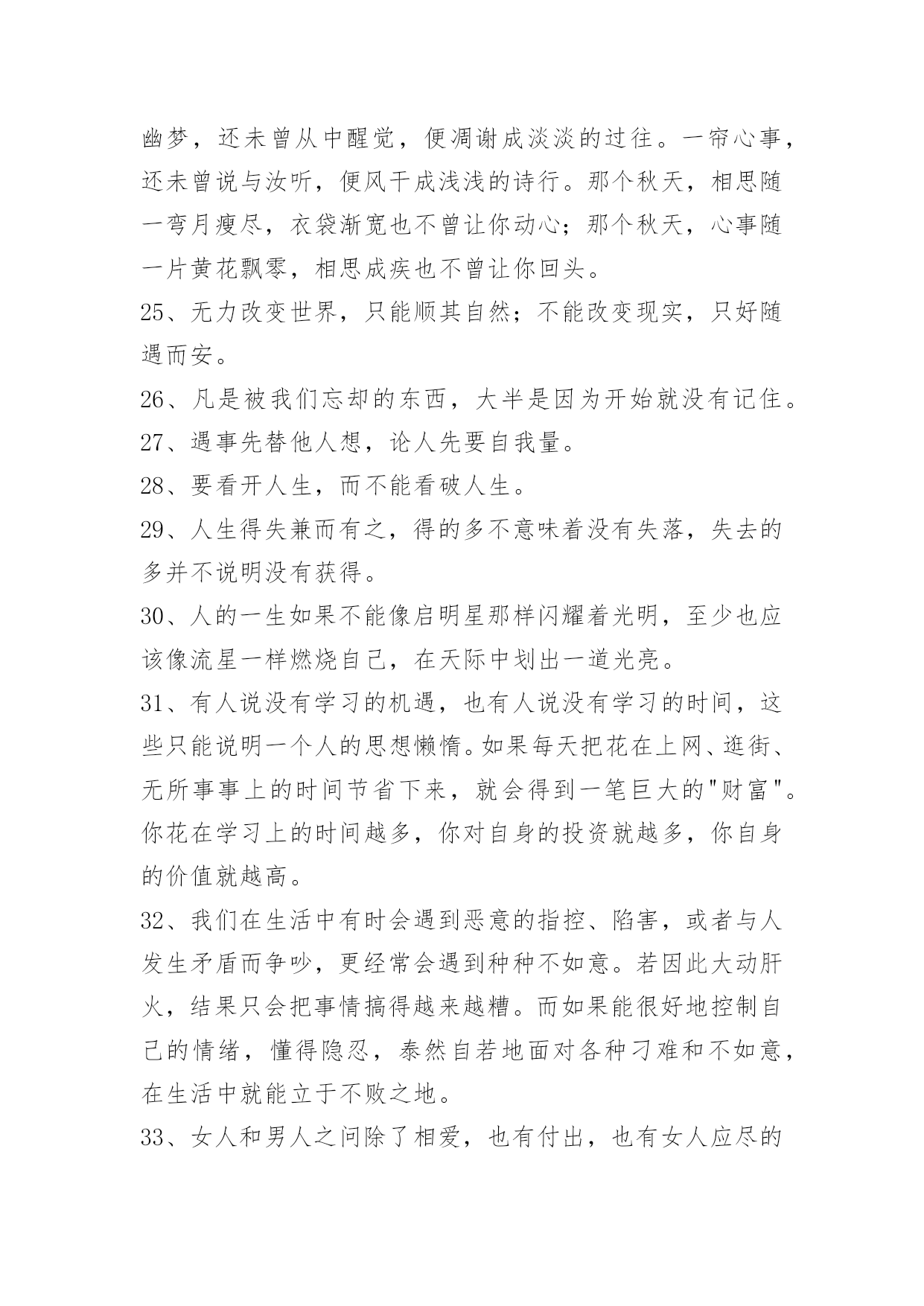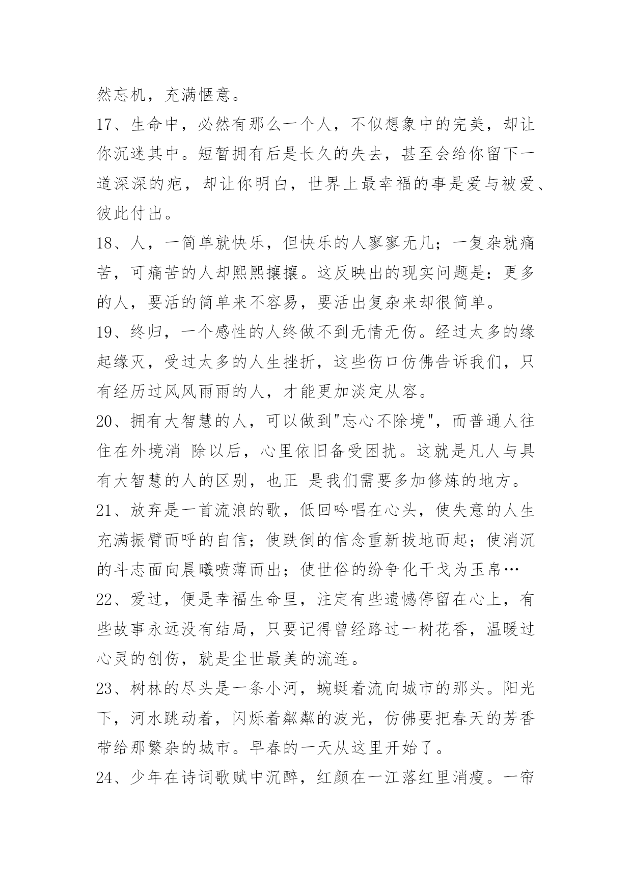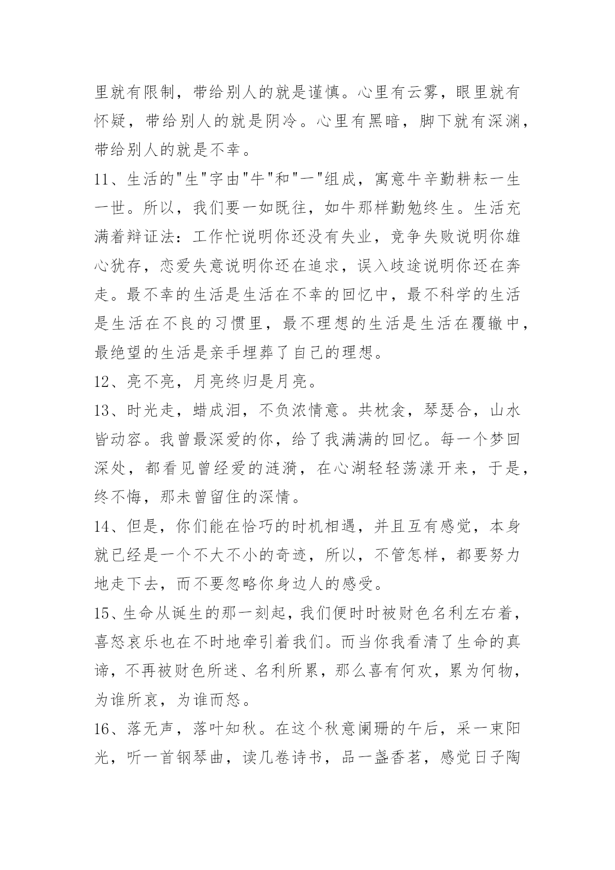 生活说说留言生活说说留言大全(精选180句)看看李后主,即使江山换了主人,满怀着浩荡悲伤的他还能吟唱"问君能有几多愁,恰似一江春水向东流",失意的生活里不是一样有诗意吗?"流光容易把人抛,红了樱桃,绿了芭蕉",古人竟然能够如此轻描淡写满腔的惆怅。原来诗意的生活里一样有喜怒哀乐悲欢离愁,但不是悲啼,不是埋怨,只是一种淡然地面对。本篇文章是小编整理的一些生活说说留言,欢迎阅读。1、信任就是一把刀,你给了别人,他就有两个选择,捅你或者保护你。看清一个人何必去揭穿;讨厌一个人又何必去翻脸。活着,总有看不惯的人,就如别人看不惯我们,太看重感情的人就是这样,容易满足,更容易受伤。若无其事,原来是最好的报复。2、人的一生,很多人以为有些事是不可放手的。许多人都希望自己的人生每天可以过得快乐、开心一点,也希望天天都可以进步一点点。生存其实很简单,拒绝堕落就行了;生存其实很简单,有勇气后退就行了;生存其实很简单,不要被成功模式束缚就行了;生存其实很简单,胜利时保持安静就行了。3、秋天不仅景色美,它还蕴藏着丰富的哲理。中年正是人生的黄金时期,在这一段时间,人们可以尽情地放飞梦想和希望,我自己的理想和目标而奋斗,去迎接属于自己的光辉岁月。如果人在这个时候不去努力奋斗,不去为自己的希望而播种,那么这个人在自己的人生中很难有好的收成。`4、只要活着,人生就毫无阻滞地滑向前,而这无疑并非一桩怎么坏的事。即使际遇坎坷,也不是没有可能巧加利用,让自己活得有趣有味。为此,最好丢弃天真,保持骄傲,学会冷静。通过或多或少的努力,人们一定能够过上自己希望的生活。5、忌妒浪费时刻你已经拥有你所需要的了。6、当我们以正面心态去修行,即使做世间琐事,也会成为获得解脱的缘;当我们以负面心态去修行,即使行佛教事业,也会成为堕落恶趣的因。7、爱与被爱都是一种感觉,陌陌红尘,缘与份谁也说不清,缘来了,份不在;份若在,却无缘。没有人会逃得了红尘一劫,因此,这世界上,才有了那么多的痴男怨女,才演绎了那么多的悲欢离合。如此情深,却难以启齿。原来你若真爱一个人,内心酸涩,反而会说不出话来,甜言蜜语,多数说给不相干的人听。8、该主动,不可畏缩;该思考,不要鲁莽。9、美好生活没有预告。它经受住绝望的氛围,然后出现,步行而来,不被认识,不带来什么,而你就在那儿。10、心里有太阳,脸上就有阳光,带给别人的就是光明。心里有引擎,身上就有力量,带给别人的就是信心。心里有杆秤,嘴里就有分寸,带给别人的就是尊重。心里有隔膜,手里就有限制,带给别人的就是谨慎。心里有云雾,眼里就有怀疑,带给别人的就是阴冷。心里有黑暗,脚下就有深渊,带给别人的就是不幸。11、生活的"生"字由"牛"和"一"组成,寓意牛辛勤耕耘一生一世。所以,我们要一如既往,如牛那样勤勉终生。生活充满着辩证法:工作忙说明你还没有失业,竞争失败说明你雄心犹存,恋爱失意说明你还在追求,误入歧途说明你还在奔走。最不幸的生活是生活在不幸的回忆中,最不科学的生活是生活在不良的习惯里,最不理想的生活是生活在覆辙中,最绝望的生活是亲手埋葬了自己的理想。12、亮不亮,月亮终归是月亮。13、时光走,蜡成泪,不负浓情意。共枕衾,琴瑟合,山水皆动容。我曾最深爱的你,给了我满满的回忆。每一个梦回深处,都看见曾经爱的涟漪,在心湖轻轻荡漾开来,于是,终不悔,那未曾留住的深情。14、但是,你们能在恰巧的时机相遇,并且互有感觉,本身就已经是一个不大不小的奇迹,所以,不管怎样,都要努力地走下去,而不要忽略你身边人的感受。15、生命从诞生的那一刻起,我们便时时被财色名利左右着,喜怒哀乐也在不时地牵引着我们。而当你我看清了生命的真谛,不再被财色所迷、名利所累,那么喜有何欢,累为何物,为谁所哀,为谁而怒。16、落无声,落叶知秋。在这个秋意阑珊的午后,采一束阳光,听一首钢琴曲,读几卷诗书,品一盏香茗,感觉日子陶然忘机,充满惬意。17、生命中,必然有那么一个人,不似想象中的完美,却让你沉迷其中。短暂拥有后是长久的失去,甚至会给你留下一道深深的疤,却让你明白,世界上最幸福的事是爱与被爱、彼此付出。18、人,一简单就快乐,但快乐的人寥寥无几;一复杂就痛苦,可痛苦的人却熙熙攘攘。这反映出的现实问题是:更多的人,要活的简单来不容易,要活出复杂来却很简单。19、终归,一个感性的人终做不到无情无伤。经过太多的缘起缘灭,受过太多的人生挫折,这些伤口仿佛告诉我们,只有经历过风风雨雨的人,才能更加淡定从容。20、拥有大智慧的人,可以做到"忘心不除境",而普通人往住在外境消除以后,心里依旧备受困扰。这就是凡人与具有大智慧的人的区别,也正是我们需要多加修炼的地方。21、放弃是一首流浪的歌,低回吟唱在心头,使失意的人生充满振臂而呼的自信;使跌倒的信念重新拔地而起;使消沉的斗志面向晨曦喷薄而出;使世俗的纷争化