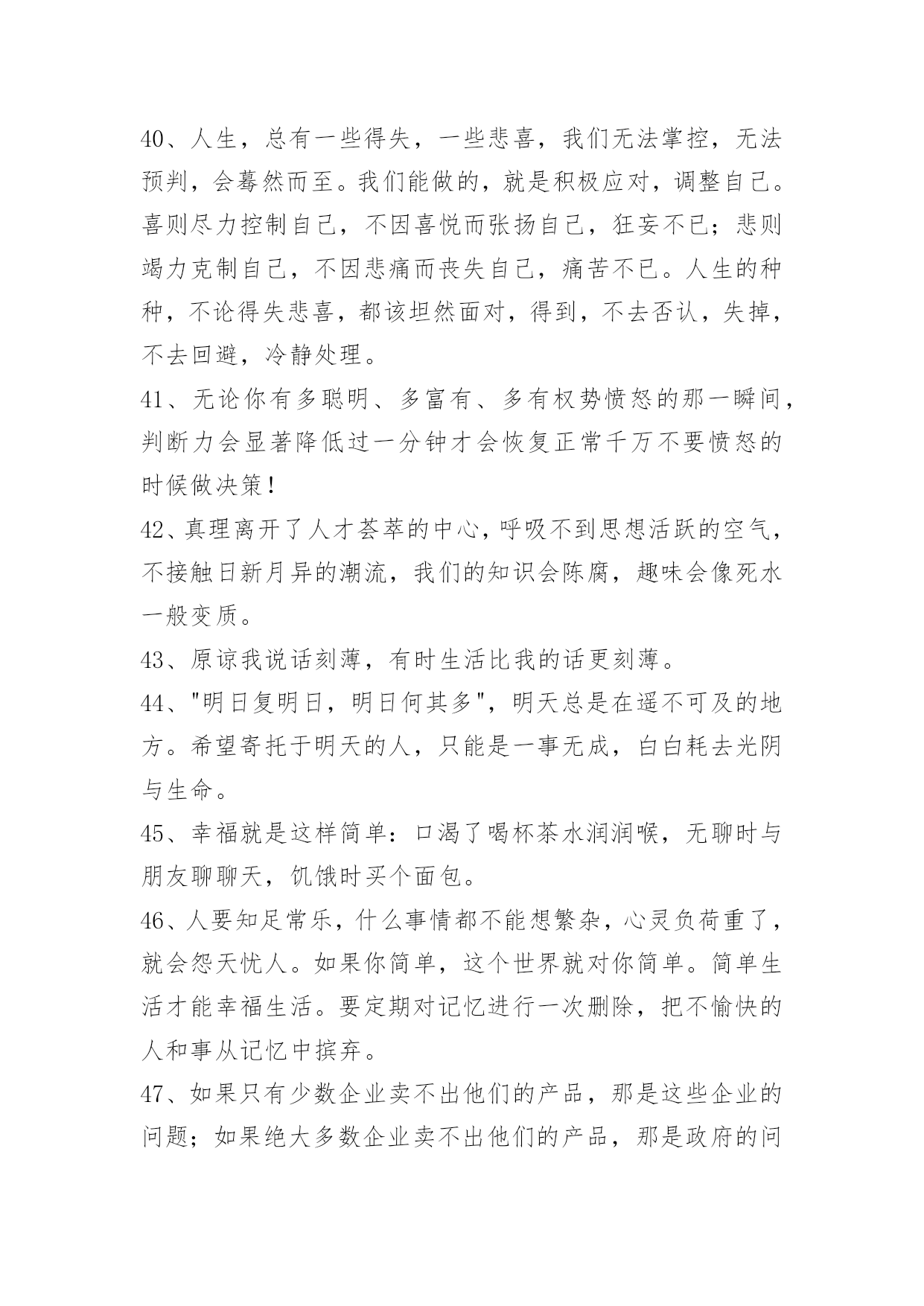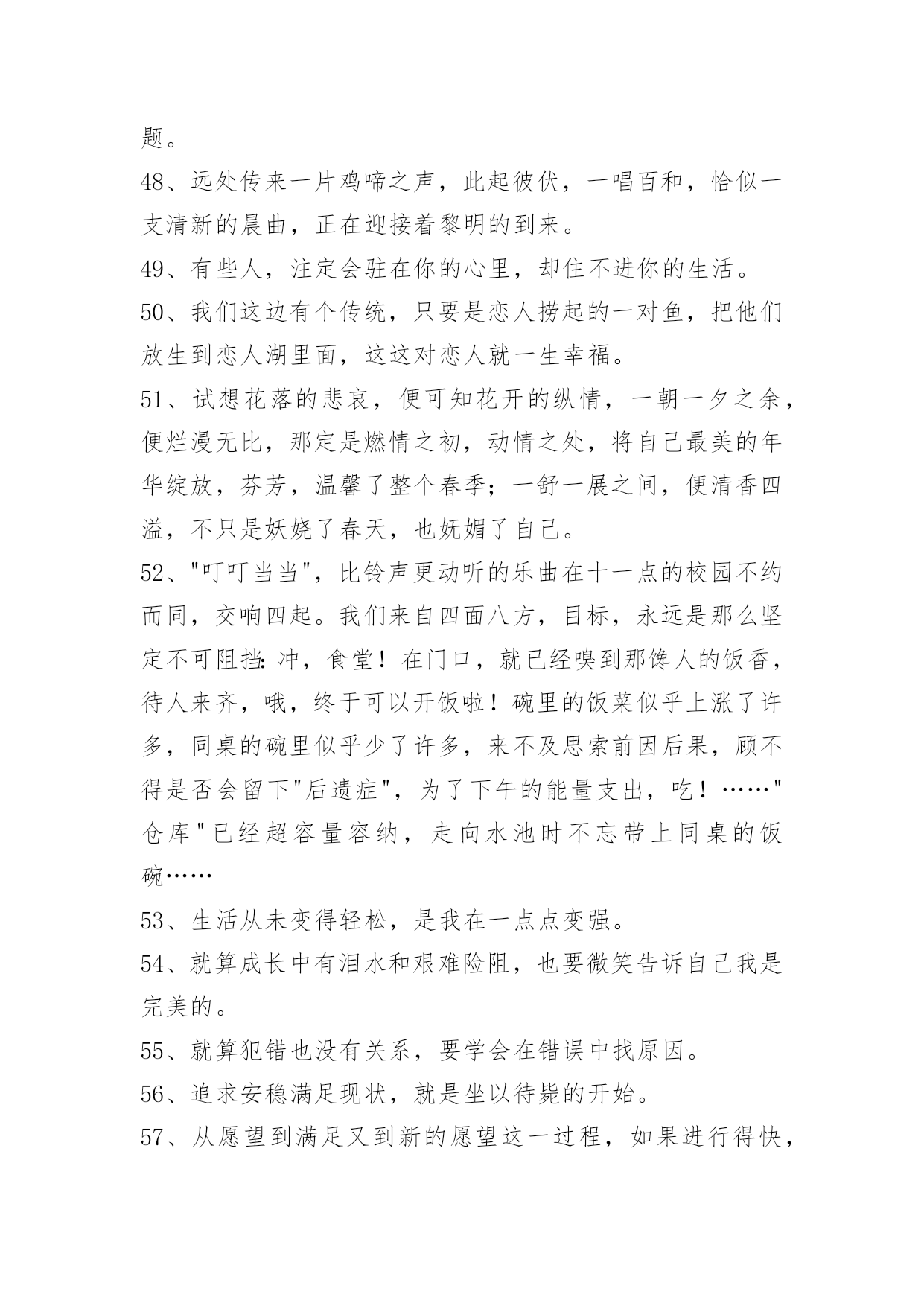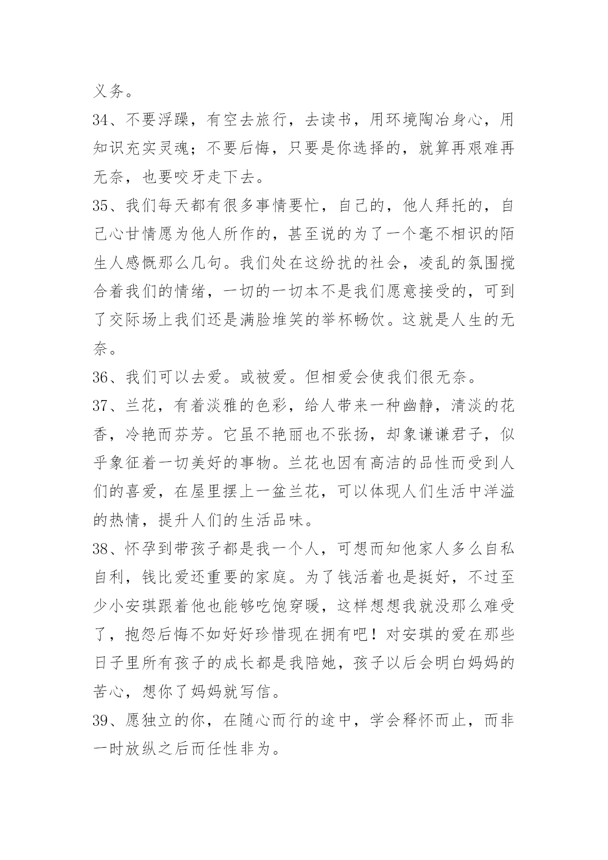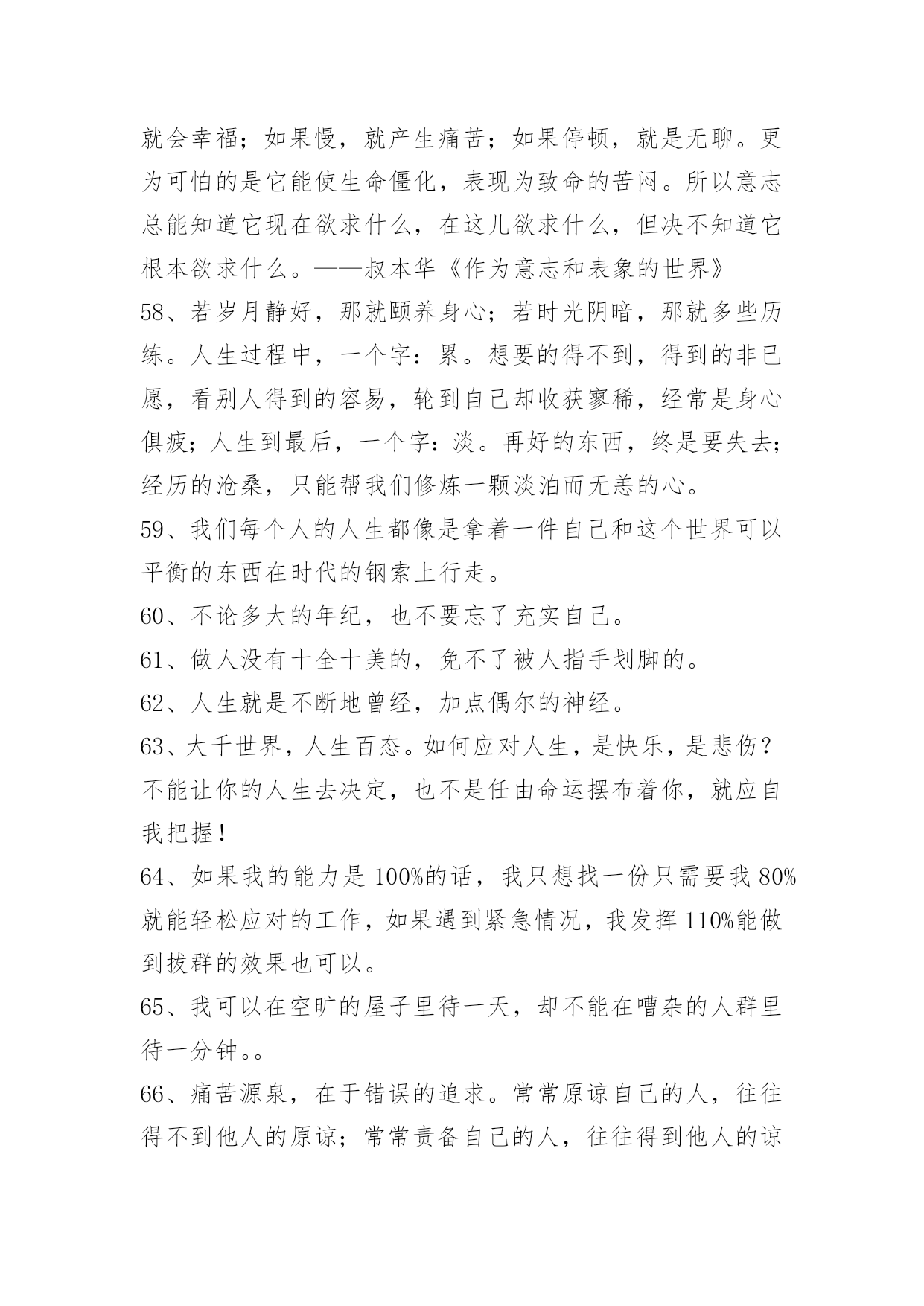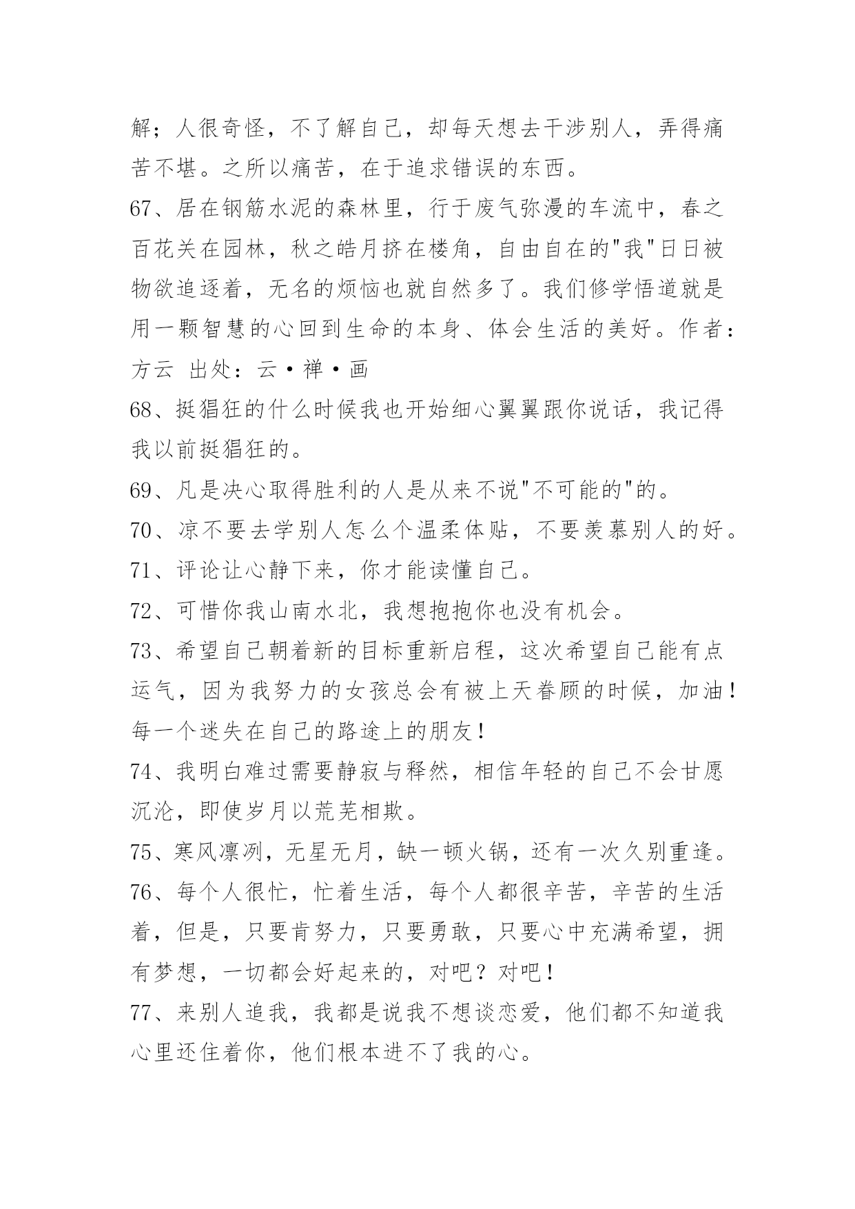 生活说说留言生活说说留言大全(精选180句)看看李后主,即使江山换了主人,满怀着浩荡悲伤的他还能吟唱"问君能有几多愁,恰似一江春水向东流",失意的生活里不是一样有诗意吗?"流光容易把人抛,红了樱桃,绿了芭蕉",古人竟然能够如此轻描淡写满腔的惆怅。原来诗意的生活里一样有喜怒哀乐悲欢离愁,但不是悲啼,不是埋怨,只是一种淡然地面对。本篇文章是小编整理的一些生活说说留言,欢迎阅读。1、信任就是一把刀,你给了别人,他就有两个选择,捅你或者保护你。看清一个人何必去揭穿;讨厌一个人又何必去翻脸。活着,总有看不惯的人,就如别人看不惯我们,太看重感情的人就是这样,容易满足,更容易受伤。若无其事,原来是最好的报复。2、人的一生,很多人以为有些事是不可放手的。许多人都希望自己的人生每天可以过得快乐、开心一点,也希望天天都可以进步一点点。生存其实很简单,拒绝堕落就行了;生存其实很简单,有勇气后退就行了;生存其实很简单,不要被成功模式束缚就行了;生存其实很简单,胜利时保持安静就行了。3、秋天不仅景色美,它还蕴藏着丰富的哲理。中年正是人生的黄金时期,在这一段时间,人们可以尽情地放飞梦想和希望,我自己的理想和目标而奋斗,去迎接属于自己的光辉岁月。如果人在这个时候不去努力奋斗,不去为自己的希望而播种,那么这个人在自己的人生中很难有好的收成。`4、只要活着,人生就毫无阻滞地滑向前,而这无疑并非一桩怎么坏的事。即使际遇坎坷,也不是没有可能巧加利用,让自己活得有趣有味。为此,最好丢弃天真,保持骄傲,学会冷静。通过或多或少的努力,人们一定能够过上自己希望的生活。5、忌妒浪费时刻你已经拥有你所需要的了。6、当我们以正面心态去修行,即使做世间琐事,也会成为获得解脱的缘;当我们以负面心态去修行,即使行佛教事业,也会成为堕落恶趣的因。7、爱与被爱都是一种感觉,陌陌红尘,缘与份谁也说不清,缘来了,份不在;份若在,却无缘。没有人会逃得了红尘一劫,因此,这世界上,才有了那么多的痴男怨女,才演绎了那么多的悲欢离合。如此情深,却难以启齿。原来你若真爱一个人,内心酸涩,反而会说不出话来,甜言蜜语,多数说给不相干的人听。8、该主动,不可畏缩;该思考,不要鲁莽。9、美好生活没有预告。它经受住绝望的氛围,然后出现,步行而来,不被认识,不带来什么,而你就在那儿。10、心里有太阳,脸上就有阳光,带给别人的就是光明。心里有引擎,身上就有力量,带给别人的就是信心。心里有杆秤,嘴里就有分寸,带给别人的就是尊重。心里有隔膜,手里就有限制,带给别人的就是谨慎。心里有云雾,眼里就有怀疑,带给别人的就是阴冷。心里有黑暗,脚下就有深渊,带给别人的就是不幸。11、生活的"生"字由"牛"和"一"组成,寓意牛辛勤耕耘一生一世。所以,我们要一如既往,如牛那样勤勉终生。生活充满着辩证法:工作忙说明你还没有失业,竞争失败说明你雄心犹存,恋爱失意说明你还在追求,误入歧途说明你还在奔走。最不幸的生活是生活在不幸的回忆中,最不科学的生活是生活在不良的习惯里,最不理想的生活是生活在覆辙中,最绝望的生活是亲手埋葬了自己的理想。12、亮不亮,月亮终归是月亮。13、时光走,蜡成泪,不负浓情意。共枕衾,琴瑟合,山水皆动容。我曾最深爱的你,给了我满满的回忆。每一个梦回深处,都看见曾经爱的涟漪,在心湖轻轻荡漾开来,于是,终不悔,那未曾留住的深情。14、但是,你们能在恰巧的时机相遇,并且互有感觉,本身就已经是一个不大不小的奇迹,所以,不管怎样,都要努力地走下去,而不要忽略你身边人的感受。15、生命从诞生的那一刻起,我们便时时被财色名利左右着,喜怒哀乐也在不时地牵引着我们。而当你我看清了生命的真谛,不再被财色所迷、名利所累,那么喜有何欢,累为何物,为谁所哀,为谁而怒。16、落无声,落叶知秋。在这个秋意阑珊的午后,采一束阳光,听一首钢琴曲,读几卷诗书,品一盏香茗,感觉日子陶然忘机,充满惬意。17、生命中,必然有那么一个人,不似想象中的完美,却让你沉迷其中。短暂拥有后是长久的失去,甚至会给你留下一道深深的疤,却让你明白,世界上最幸福的事是爱与被爱、彼此付出。18、人,一简单就快乐,但快乐的人寥寥无几;一复杂就痛苦,可痛苦的人却熙熙攘攘。这反映出的现实问题是:更多的人,要活的简单来不容易,要活出复杂来却很简单。19、终归,一个感性的人终做不到无情无伤。经过太多的缘起缘灭,受过太多的人生挫折,这些伤口仿佛告诉我们,只有经历过风风雨雨的人,才能更加淡定从容。20、拥有大智慧的人,可以做到"忘心不除境",而普通人往住在外境消除以后,心里依旧备受困扰。这就是凡人与具有大智慧的人的区别,也正是我们需要多加修炼的地方。21、放弃是一首流浪的歌,低回吟唱在心头,使失意的人生充满振臂而呼的自信;使跌倒的信念重新拔地而起;使消沉的斗志面向晨曦喷薄而出;使世俗的纷争化