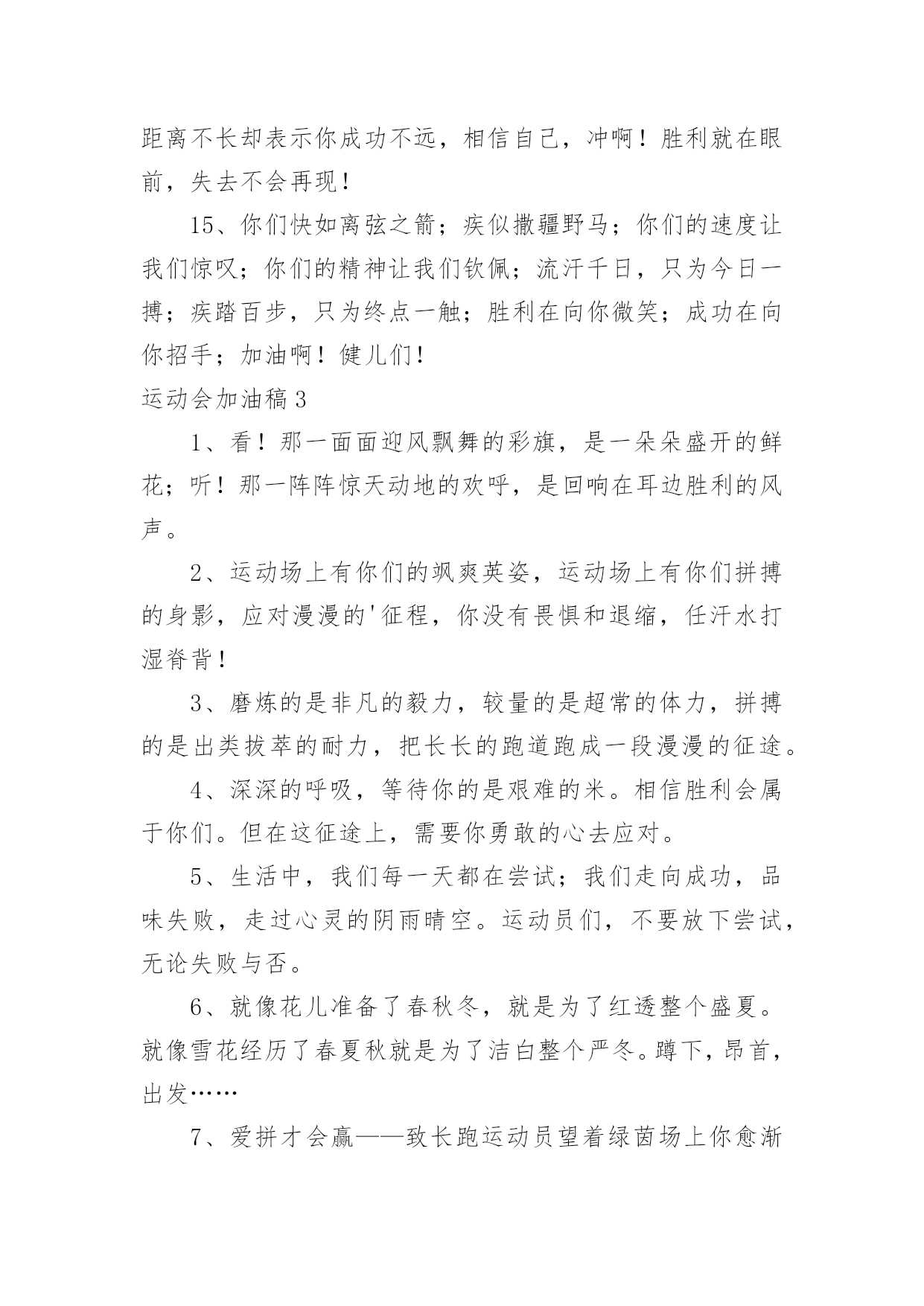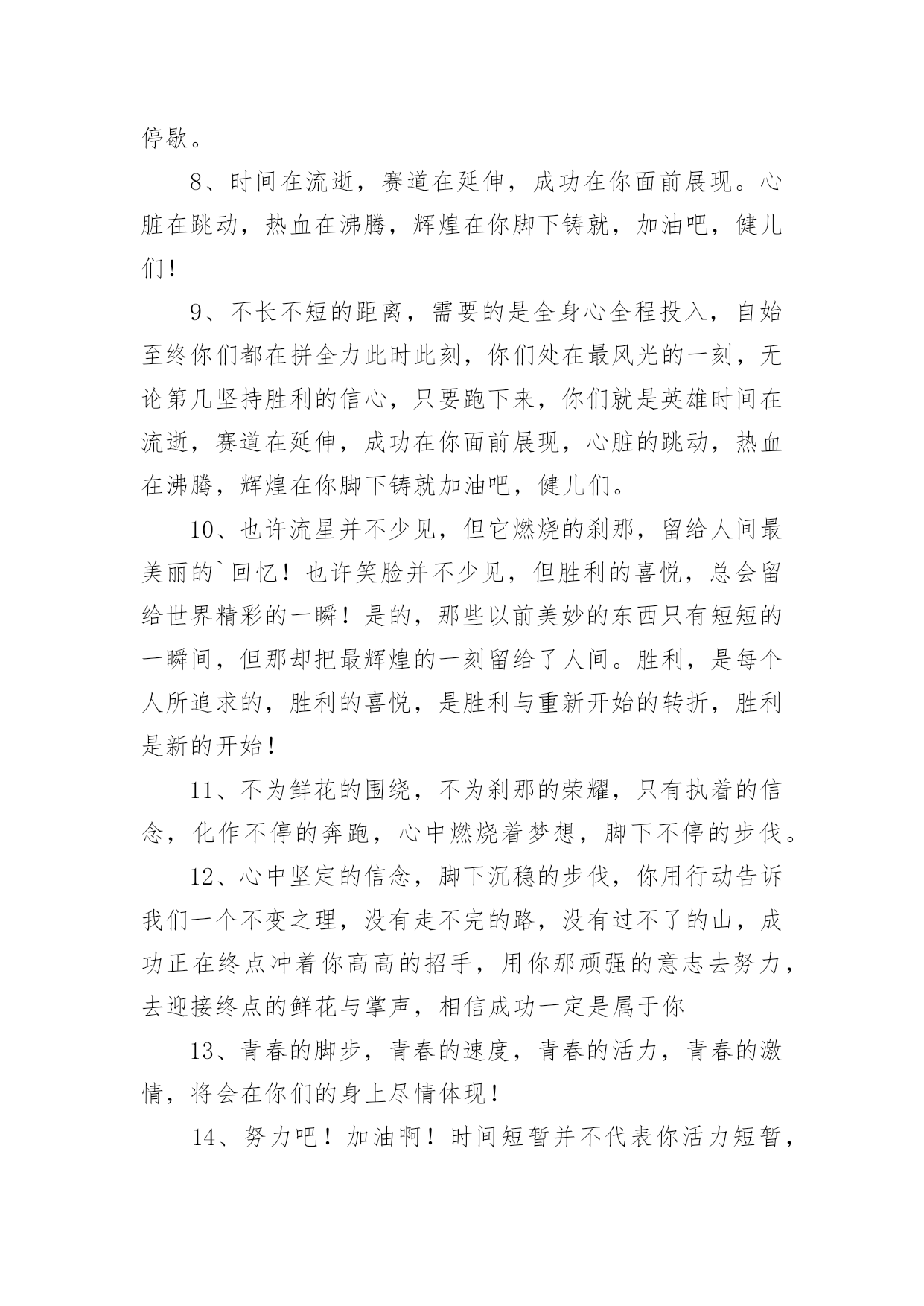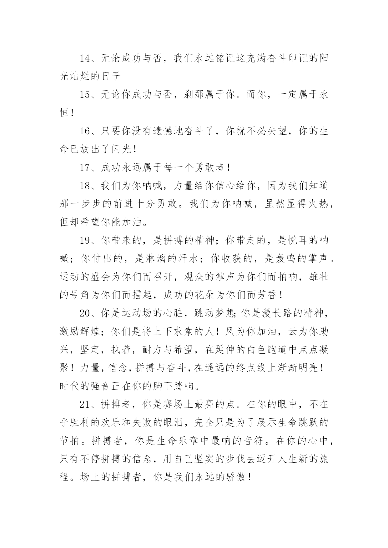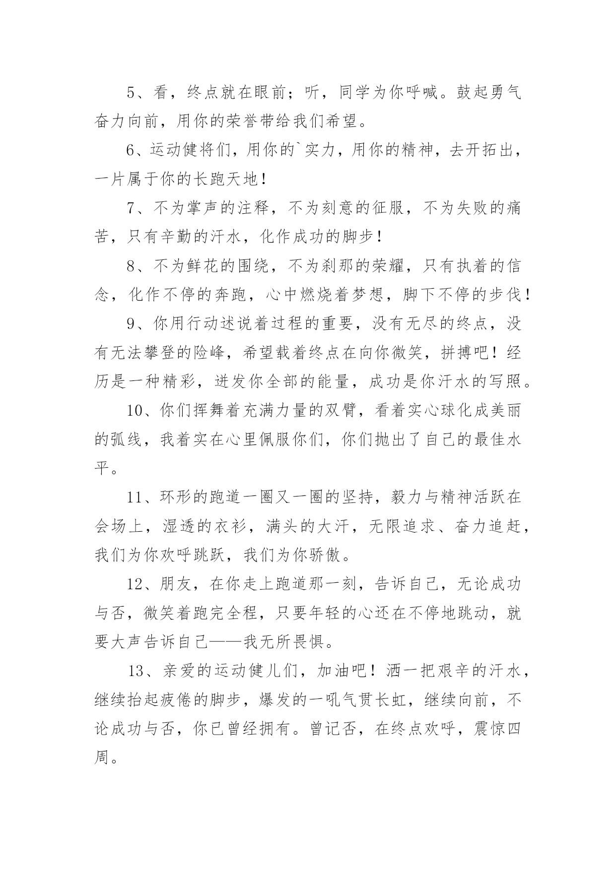 运动会加油稿运动会加油稿在生活中,用到加油稿的地方越来越多,借助加油稿可以点燃对方的激情,激发对方的斗志。你知道加油稿怎样才能写的好吗?以下是小编帮大家整理的运动会加油稿,仅供参考,大家一起来看看吧。运动会加油稿11、不为掌声的诠释、不为刻意的征服、只有辛勤的汗水化作追求的脚步、心中坚定的信念、脚下沉稳的步伐、你用行动诉说着一个不变的真理、没有比脚更长的路、没有比人更高的山、希望在终点向你招手、努力吧用你坚韧不拔的毅志、去迎接终点的鲜花与掌声、相信成功属于你们。2、深深的呼吸,等待你的是艰难的米。相信胜利会属于你们。但在这征途上,需要你勇敢的心去面对。我们在为你加油,你是否听到了我们发自心中的呐喊?困难和胜利都在向你招手,去呀,快去呀,不要犹豫。快去击败困难、快去夺取胜利!相信你会送给我们一个汗水浸湿的微笑!3、这是意志的拼搏,这是速度的挑战,胜利在向你们招手,胜利在向你们呼唤!4、踏上跑道,是一种选择。离开起点,是一种勇气。驰骋赛场,是一种胜利。5、看,终点就在眼前;听,同学为你呼喊。鼓起勇气奋力向前,用你的荣誉带给我们希望。6、运动健将们,用你的`实力,用你的精神,去开拓出,一片属于你的长跑天地!7、不为掌声的注释,不为刻意的征服,不为失败的痛苦,只有辛勤的汗水,化作成功的脚步!8、不为鲜花的围绕,不为刹那的荣耀,只有执着的信念,化作不停的奔跑,心中燃烧着梦想,脚下不停的步伐!9、你用行动述说着过程的重要,没有无尽的终点,没有无法攀登的险峰,希望载着终点在向你微笑,拼搏吧!经历是一种精彩,迸发你全部的能量,成功是你汗水的写照。10、你们挥舞着充满力量的双臂,看着实心球化成美丽的弧线,我着实在心里佩服你们,你们抛出了自己的最佳水平。11、环形的跑道一圈又一圈的坚持,毅力与精神活跃在会场上,湿透的衣衫,满头的大汗,无限追求、奋力追赶,我们为你欢呼跳跃,我们为你骄傲。12、朋友,在你走上跑道那一刻,告诉自己,无论成功与否,微笑着跑完全程,只要年轻的心还在不停地跳动,就要大声告诉自己——我无所畏惧。13、亲爱的运动健儿们,加油吧!洒一把艰辛的汗水,继续抬起疲倦的脚步,爆发的一吼气贯长虹,继续向前,不论成功与否,你已曾经拥有。曾记否,在终点欢呼,震惊四周。14、无论成功与否,我们永远铭记这充满奋斗印记的阳光灿烂的日子15、无论你成功与否,刹那属于你。而你,一定属于永恒!16、只要你没有遗憾地奋斗了,你就不必失望,你的生命已放出了闪光!17、成功永远属于每一个勇敢者!18、我们为你呐喊,力量给你信心给你,因为我们知道那一步步的前进十分勇敢。我们为你呐喊,虽然显得火热,但却希望你能加油。19、你带来的,是拼搏的精神;你带走的,是悦耳的呐喊;你付出的,是淋漓的汗水;你收获的,是轰鸣的掌声。运动的盛会为你们而召开,观众的掌声为你们而拍响,雄壮的号角为你们而擂起,成功的花朵为你们而芳香!20、你是运动场的心脏,跳动梦想;你是漫长路的精神,激励辉煌;你们是将上下求索的人!风为你加油,云为你助兴,坚定,执着,耐力与希望,在延伸的白色跑道中点点凝聚!力量,信念,拼搏与奋斗,在遥远的终点线上渐渐明亮!时代的强音正在你的脚下踏响。21、拼搏者,你是赛场上最亮的点。在你的眼中,不在乎胜利的欢乐和失败的眼泪,完全只是为了展示生命跳跃的节拍。拼搏者,你是生命乐章中最响的音符。在你的心中,只有不停拼搏的信念,用自己坚实的步伐去迈开人生新的旅程。场上的拼搏者,你是我们永远的骄傲!运动会加油稿21、年轻的我们自信飞扬,青春的气息如同初升的朝阳,蓬勃的力量如同阳光的挥洒。此时此刻,跑道便是我们精彩的舞台,声声加油便是我们的奖项!2、此时此刻,虽然脑海里浮想联翩,但我仍然安静地坐在大本营,写着通讯稿,仍然站在场边扯破嗓子地喊"加油"。3、观众席上掌声雷动,热热烈烈划破长空,他们的灵魂在叫,血在烧,都是渴望,有无限的期望,掌声响起来为新的力量喝彩,掌声响起来,每一刻都精彩。4、我只愿做一片落叶,去点缀金黄的秋天,我只愿做一颗恒星,去装饰耀眼的星河,我只愿做一棵小树,去充实五彩的世界,我只愿坐在场边,同你们分享喜悦,努力吧,拼搏吧,无论何时何地,都会有我在你的身边。5、你站在草坪上,挥舞着双臂,所有的力量刹那间都凝聚在了手上。你那有力的手上,抓着一个沉甸甸的实心球,你尽自己的力气投了出去。投近投远,都没关系,只要你努力就行!重在参与,输了明年再来比!加油。6、超越对手,更要超越自我,追求卓越是我们的目标,是我们的信念,在清爽的秋季,在喧嚣的赛场,你们点燃了似火的热情,无论成败,你们永远是我们的骄傲,我们都为你们感到自豪!7、漫漫长路,你愿一人独撑,忍受着孤独与寂寞,承受着体力与精神的压迫,只任汗水溶于泪水,可脚步却从不停歇。8、时间在流逝,赛道在延伸,成功在你面前展现