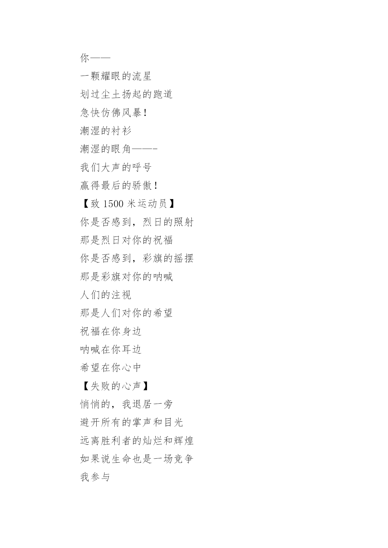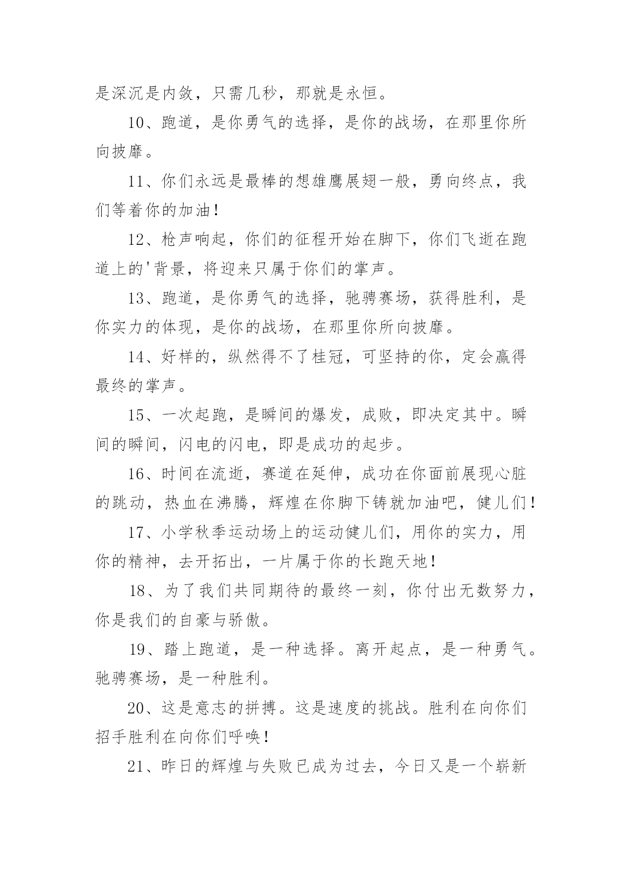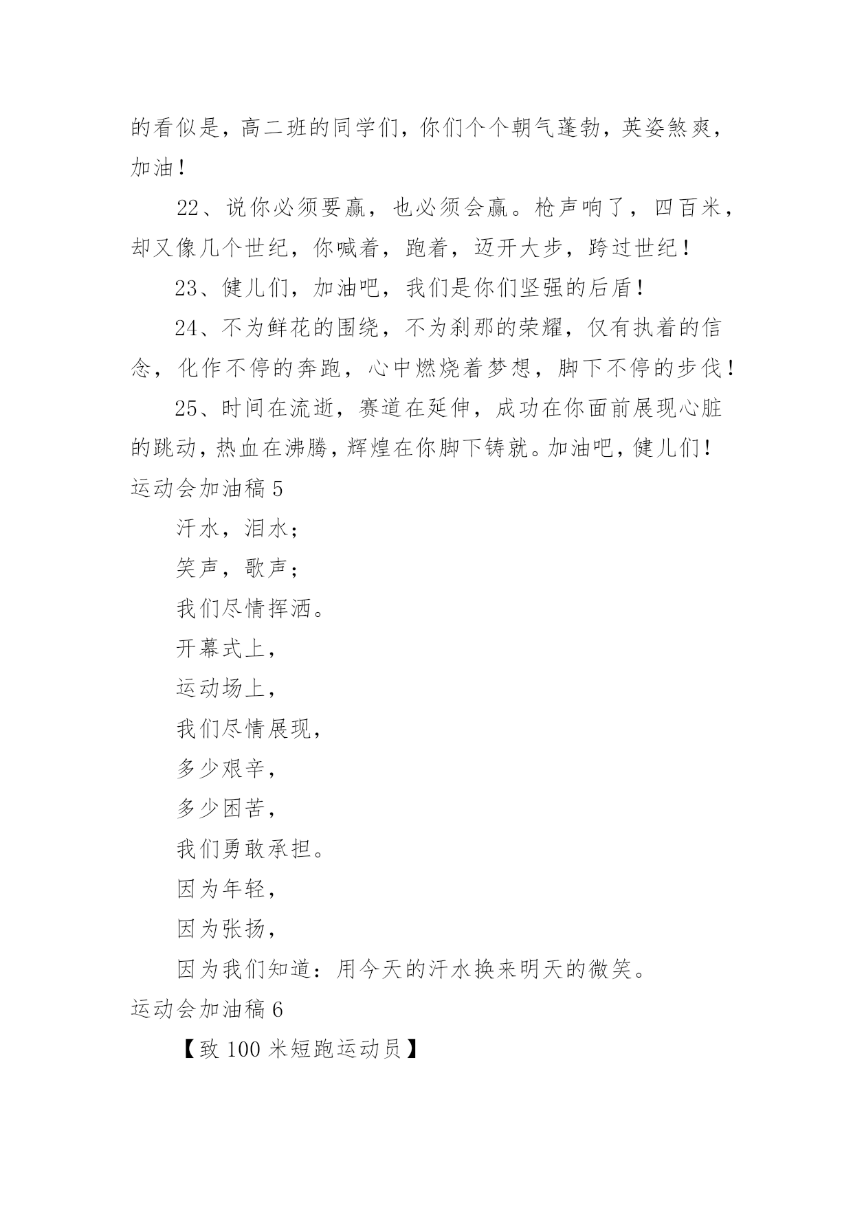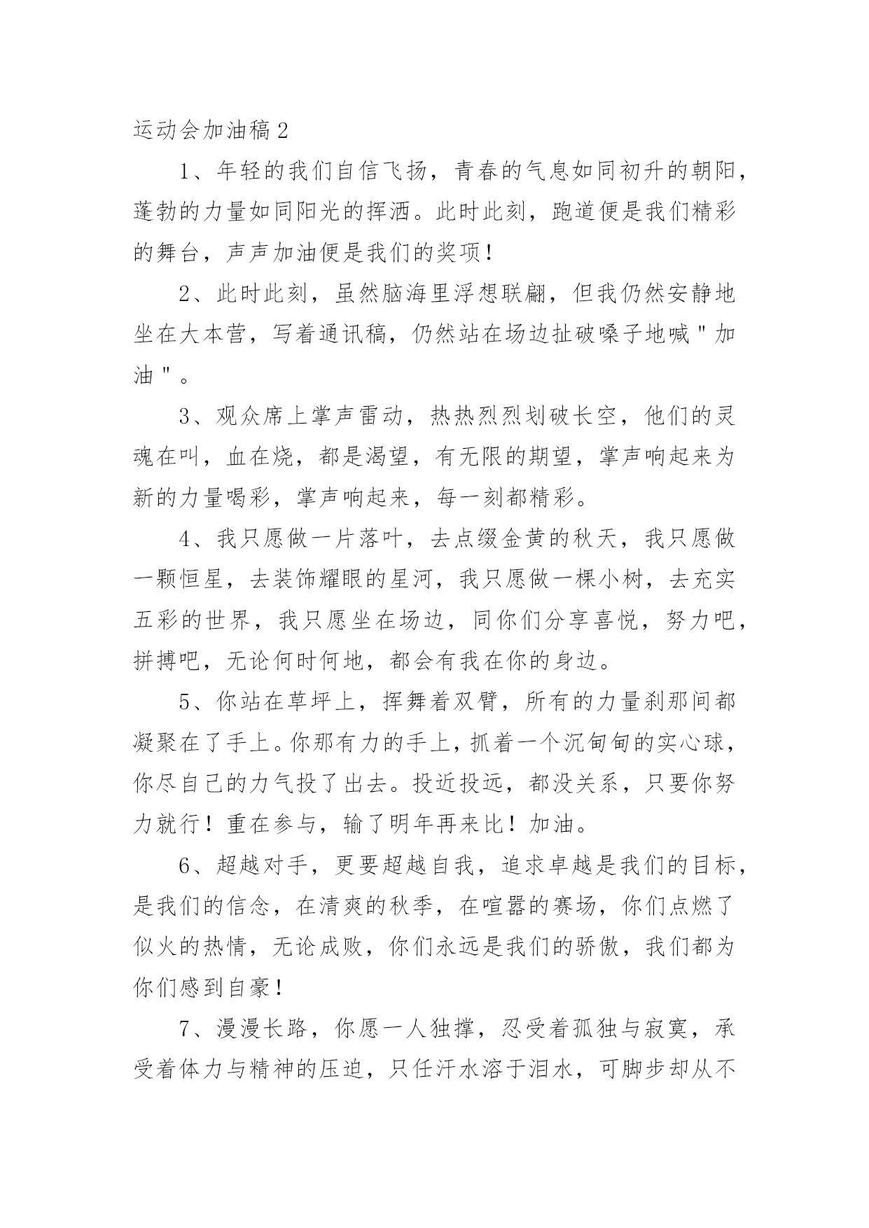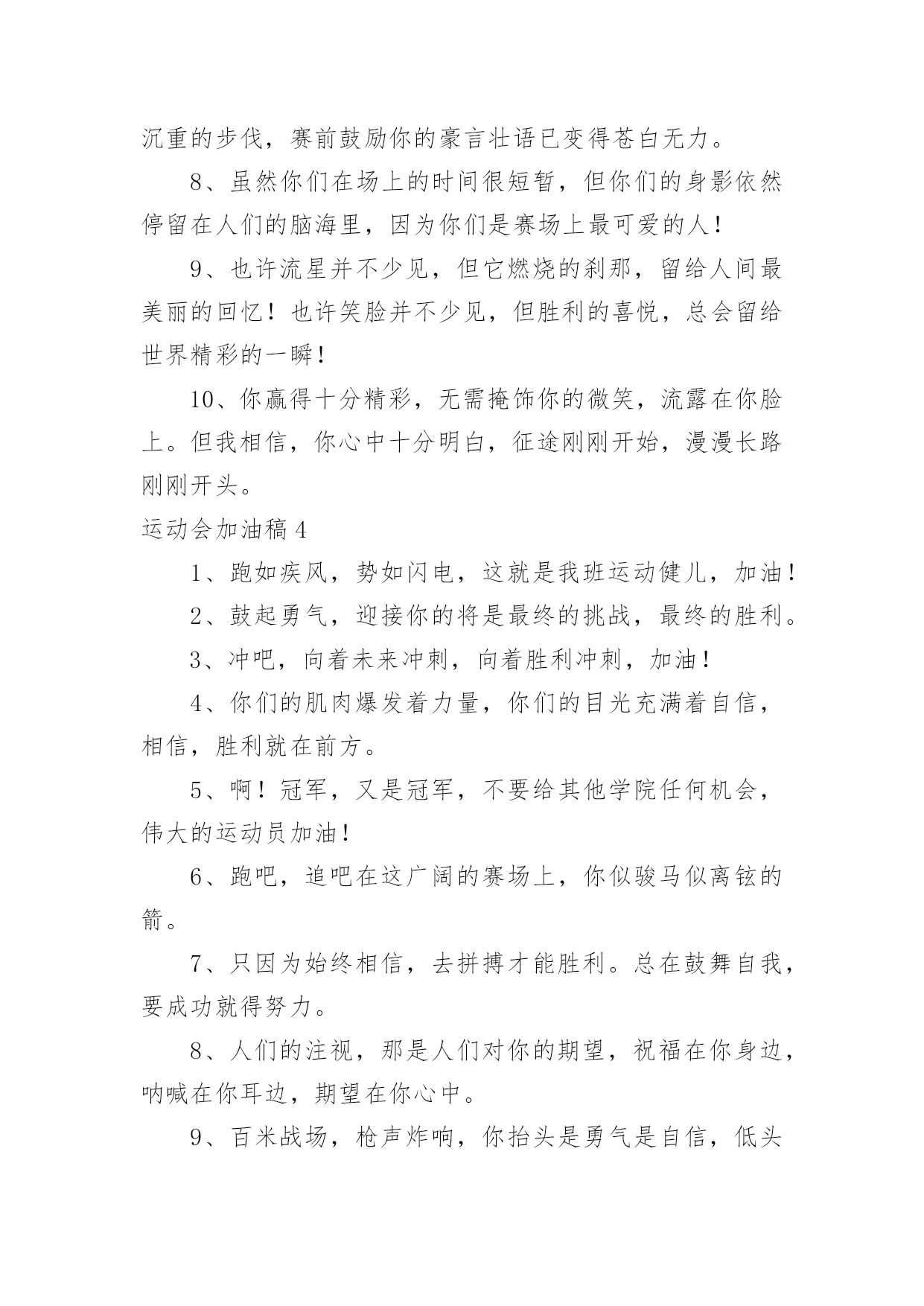 运动会加油稿运动会加油稿在生活中,用到加油稿的地方越来越多,借助加油稿可以点燃对方的激情,激发对方的斗志。你知道加油稿怎样才能写的好吗?以下是小编帮大家整理的运动会加油稿,仅供参考,大家一起来看看吧。运动会加油稿11、不为掌声的诠释、不为刻意的征服、只有辛勤的汗水化作追求的脚步、心中坚定的信念、脚下沉稳的步伐、你用行动诉说着一个不变的真理、没有比脚更长的路、没有比人更高的山、希望在终点向你招手、努力吧用你坚韧不拔的毅志、去迎接终点的鲜花与掌声、相信成功属于你们。2、深深的呼吸,等待你的是艰难的米。相信胜利会属于你们。但在这征途上,需要你勇敢的心去面对。我们在为你加油,你是否听到了我们发自心中的呐喊?困难和胜利都在向你招手,去呀,快去呀,不要犹豫。快去击败困难、快去夺取胜利!相信你会送给我们一个汗水浸湿的微笑!3、这是意志的拼搏,这是速度的挑战,胜利在向你们招手,胜利在向你们呼唤!4、踏上跑道,是一种选择。离开起点,是一种勇气。驰骋赛场,是一种胜利。5、看,终点就在眼前;听,同学为你呼喊。鼓起勇气奋力向前,用你的荣誉带给我们希望。6、运动健将们,用你的`实力,用你的精神,去开拓出,一片属于你的长跑天地!7、不为掌声的注释,不为刻意的征服,不为失败的痛苦,只有辛勤的汗水,化作成功的脚步!8、不为鲜花的围绕,不为刹那的荣耀,只有执着的信念,化作不停的奔跑,心中燃烧着梦想,脚下不停的步伐!9、你用行动述说着过程的重要,没有无尽的终点,没有无法攀登的险峰,希望载着终点在向你微笑,拼搏吧!经历是一种精彩,迸发你全部的能量,成功是你汗水的写照。10、你们挥舞着充满力量的双臂,看着实心球化成美丽的弧线,我着实在心里佩服你们,你们抛出了自己的最佳水平。11、环形的跑道一圈又一圈的坚持,毅力与精神活跃在会场上,湿透的衣衫,满头的大汗,无限追求、奋力追赶,我们为你欢呼跳跃,我们为你骄傲。12、朋友,在你走上跑道那一刻,告诉自己,无论成功与否,微笑着跑完全程,只要年轻的心还在不停地跳动,就要大声告诉自己——我无所畏惧。13、亲爱的运动健儿们,加油吧!洒一把艰辛的汗水,继续抬起疲倦的脚步,爆发的一吼气贯长虹,继续向前,不论成功与否,你已曾经拥有。曾记否,在终点欢呼,震惊四周。14、无论成功与否,我们永远铭记这充满奋斗印记的阳光灿烂的日子15、无论你成功与否,刹那属于你。而你,一定属于永恒!16、只要你没有遗憾地奋斗了,你就不必失望,你的生命已放出了闪光!17、成功永远属于每一个勇敢者!18、我们为你呐喊,力量给你信心给你,因为我们知道那一步步的前进十分勇敢。我们为你呐喊,虽然显得火热,但却希望你能加油。19、你带来的,是拼搏的精神;你带走的,是悦耳的呐喊;你付出的,是淋漓的汗水;你收获的,是轰鸣的掌声。运动的盛会为你们而召开,观众的掌声为你们而拍响,雄壮的号角为你们而擂起,成功的花朵为你们而芳香!20、你是运动场的心脏,跳动梦想;你是漫长路的精神,激励辉煌;你们是将上下求索的人!风为你加油,云为你助兴,坚定,执着,耐力与希望,在延伸的白色跑道中点点凝聚!力量,信念,拼搏与奋斗,在遥远的终点线上渐渐明亮!时代的强音正在你的脚下踏响。21、拼搏者,你是赛场上最亮的点。在你的眼中,不在乎胜利的欢乐和失败的眼泪,完全只是为了展示生命跳跃的节拍。拼搏者,你是生命乐章中最响的音符。在你的心中,只有不停拼搏的信念,用自己坚实的步伐去迈开人生新的旅程。场上的拼搏者,你是我们永远的骄傲!运动会加油稿21、年轻的我们自信飞扬,青春的气息如同初升的朝阳,蓬勃的力量如同阳光的挥洒。此时此刻,跑道便是我们精彩的舞台,声声加油便是我们的奖项!2、此时此刻,虽然脑海里浮想联翩,但我仍然安静地坐在大本营,写着通讯稿,仍然站在场边扯破嗓子地喊"加油"。3、观众席上掌声雷动,热热烈烈划破长空,他们的灵魂在叫,血在烧,都是渴望,有无限的期望,掌声响起来为新的力量喝彩,掌声响起来,每一刻都精彩。4、我只愿做一片落叶,去点缀金黄的秋天,我只愿做一颗恒星,去装饰耀眼的星河,我只愿做一棵小树,去充实五彩的世界,我只愿坐在场边,同你们分享喜悦,努力吧,拼搏吧,无论何时何地,都会有我在你的身边。5、你站在草坪上,挥舞着双臂,所有的力量刹那间都凝聚在了手上。你那有力的手上,抓着一个沉甸甸的实心球,你尽自己的力气投了出去。投近投远,都没关系,只要你努力就行!重在参与,输了明年再来比!加油。6、超越对手,更要超越自我,追求卓越是我们的目标,是我们的信念,在清爽的秋季,在喧嚣的赛场,你们点燃了似火的热情,无论成败,你们永远是我们的骄傲,我们都为你们感到自豪!7、漫漫长路,你愿一人独撑,忍受着孤独与寂寞,承受着体力与精神的压迫,只任汗水溶于泪水,可脚步却从不停歇。8、时间在流逝,赛道在延伸,成功在你面前展现