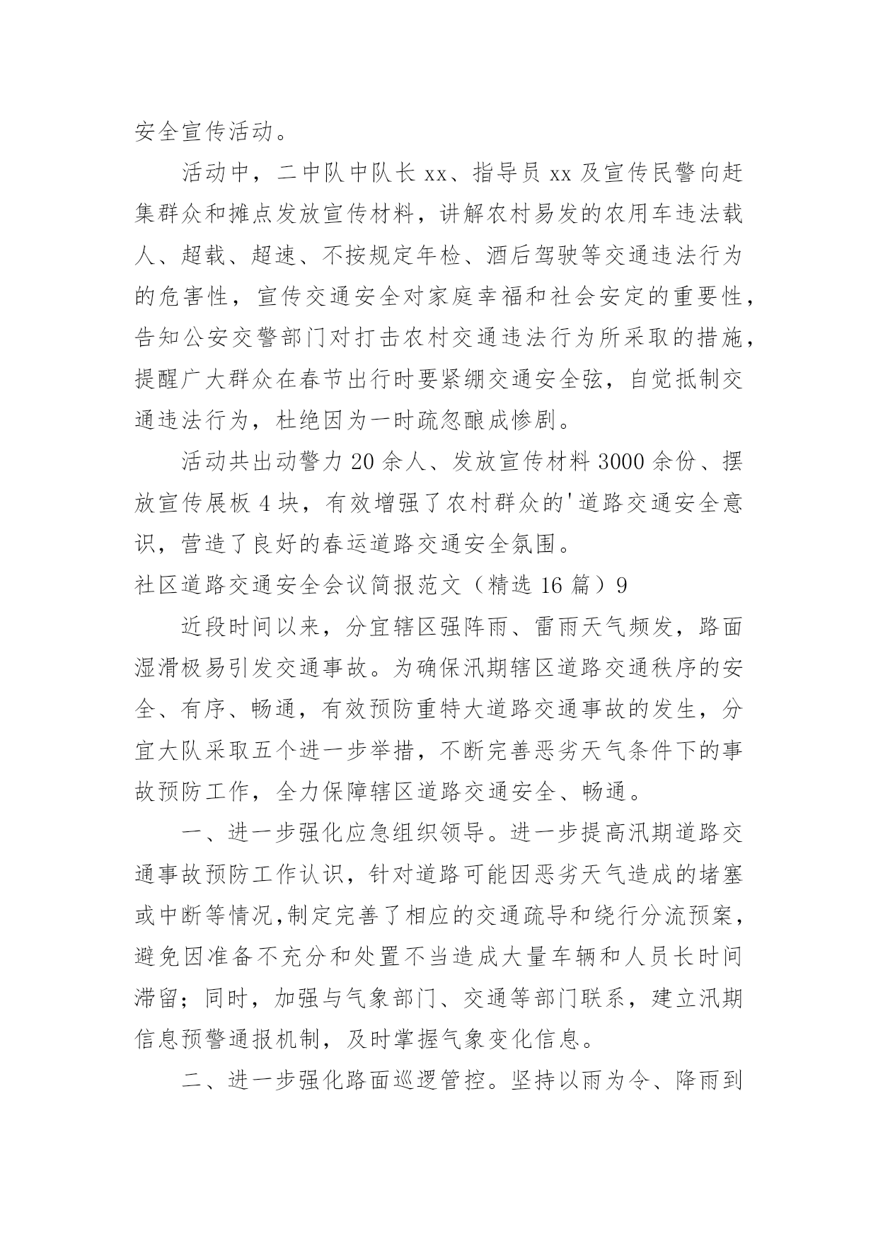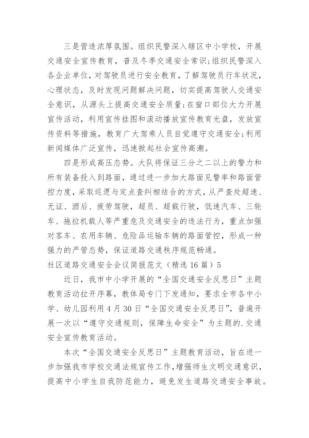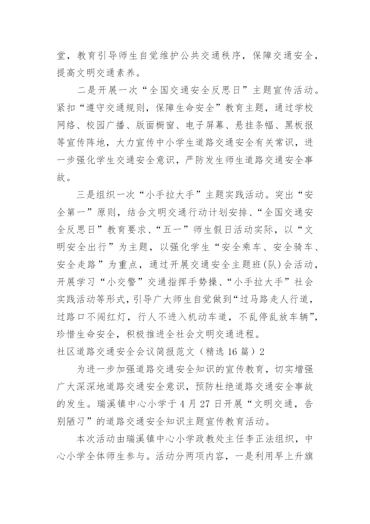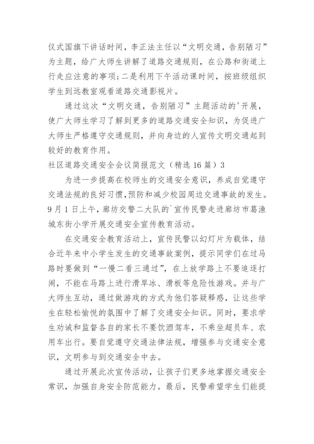 社区道路交通安全会议简报社区道路交通安全会议简报范文(精选16篇)在日常学习、工作抑或是生活中,人们运用到简报的场合不断增多,简报是传递某方面信息的简短的内部小报。我们该怎么拟定简报呢?下面是小编收集整理的社区道路交通安全会议简报范文(精选16篇),欢迎大家借鉴与参考,希望对大家有所帮助。社区道路交通安全会议简报范文(精选16篇)14月30日是“全国交通安全反思日”。为进一步加强我县学校交通法规宣传工作,提高广大师生交通安全法规意识和文明交通意识,增强中小学生自觉遵守交通法规,维护交通秩序,自我防范与保护能力,避免发生道路交通安全事故,在第九个全国交通安全反思日来临之际,青龙县教育局利用开展以“遵守交通规则,保障生命安全”为主题的交通安全宣传教育活动。本次“全国交通安全反思日”主题教育活动主要有三种形式:一是开展一次道路交通安全专题教育活动。积极主动邀请公安交警、法制副校长、法制辅导员等人员,以“文明交通,告别陋习”为主题,通过学习交通法规,普及安全知识,观看交通事故典型案例等形式方法,大力推动交通安全进课堂,教育引导师生自觉维护公共交通秩序,保障交通安全,提高文明交通素养。二是开展一次“全国交通安全反思日”主题宣传活动。紧扣“遵守交通规则,保障生命安全”教育主题,通过学校网络、校园广播、版面橱窗、电子屏幕、悬挂条幅、黑板报等宣传阵地,大力宣传中小学生道路交通安全有关常识,进一步强化学生交通安全意识,严防发生师生道路交通安全事故。三是组织一次“小手拉大手”主题实践活动。突出“安全第一”原则,结合文明交通行动计划安排、“全国交通安全反思日”教育要求、“五一”师生假日活动实际,以“文明安全出行”为主题,以强化学生“安全乘车、安全骑车、安全走路”为重点,通过开展交通安全主题班(队)会活动,开展学习“小交警”交通指挥手势操、“小手拉大手”社会实践活动等形式,引导广大师生自觉做到“过马路走人行道,过路口不闯红灯,行人不进入机动车道,不乱停乱放车辆”,珍惜生命安全,积极推进全社会文明交通进程。社区道路交通安全会议简报范文(精选16篇)2为进一步加强道路交通安全知识的宣传教育,切实增强广大深深地道路交通安全意识,预防杜绝道路交通安全事故的发生。瑞溪镇中心小学于4月27日开展“文明交通,告别陋习”的道路交通安全知识主题宣传教育活动。本次活动由瑞溪镇中心小学政教处主任李正法组织,中心小学全体师生参与。活动分两项内容,一是利用早上升旗仪式国旗下讲话时间,李正法主任以“文明交通,告别陋习”为主题,给广大师生讲解了道路交通规则,在公路和街道上行走应注意的事项;二是利用下午活动课时间,按班级组织学生到远教室观看道路交通影视片。通过这次“文明交通,告别陋习”主题活动的'开展,使广大师生学习了解到更多的道路交通安全知识,为促进广大师生严格遵守交通规则,并向身边的人宣传文明交通起到较好的教育作用。社区道路交通安全会议简报范文(精选16篇)3为进一步提高在校师生的交通安全意识,养成自觉遵守交通法规的良好习惯,预防和减少校园周边交通事故的发生。9月1日上午,廊坊交警二大队的`宣传民警走进廊坊市葛渔城东街小学开展交通安全宣传教育活动。在交通安全教育活动上,宣传民警以幻灯片为载体,结合近年来中小学生发生的交通事故案例,提示同学们在过马路时要做到“一慢二看三通过”,在上放学路上不要追逐打闹,不能在马路上进行滑旱冰、滑板等危险性游戏。并与广大师生互动,通过做游戏的方式为他们答疑释惑,让这些学生在轻松愉悦的氛围中了解了交通安全知识。同时,要求学生劝诫和监督各自的家长不要饮酒驾车,不乘坐超员车、农用车出行。要自觉遵守交通法律法规,增强参与交通安全意识,文明参与到交通安全中去。通过开展此次宣传活动,让孩子们更多地掌握交通安全常识,加强自身安全防范能力。最后,民警希望学生们能提高自我保护意识,从小做起,从走路做起,做到文明走路、文明骑车、安全乘车,要做一名文明的交通参与者,更要做一名交通法律法规的宣传者和监督者。社区道路交通安全会议简报范文(精选16篇)420xx年“元旦”即将来临,为切实保障辖区道路交通畅通有序,三山交警大队以预防重特大道路交通事故为重点,结合辖区实际,提前行动,周密部署,狠抓秩序整顿、加强源头管理,扎实做好“元旦”前夕道路交通安全工作,为广大群众创造一个良好的道路交通环境。一是抓好统筹管理。“元旦”即将来临,交通管理任务十分繁重,同时春运工作也即将开始,形势非常紧迫。大队要求全体民警要认清形势,统一思想,结合即将开展的春运工作,把握进度,统筹安排,鼓足工作干劲,履行工作职责,把精力和工作重心放在“元旦”期间交通安全上来,坚决克服麻痹思想,确保各项工作措施落到实处。二是警力撒向路面。随着“元旦”的`临近,路面交通流量急剧增多,路面管理工作压力加大,加之鲁港