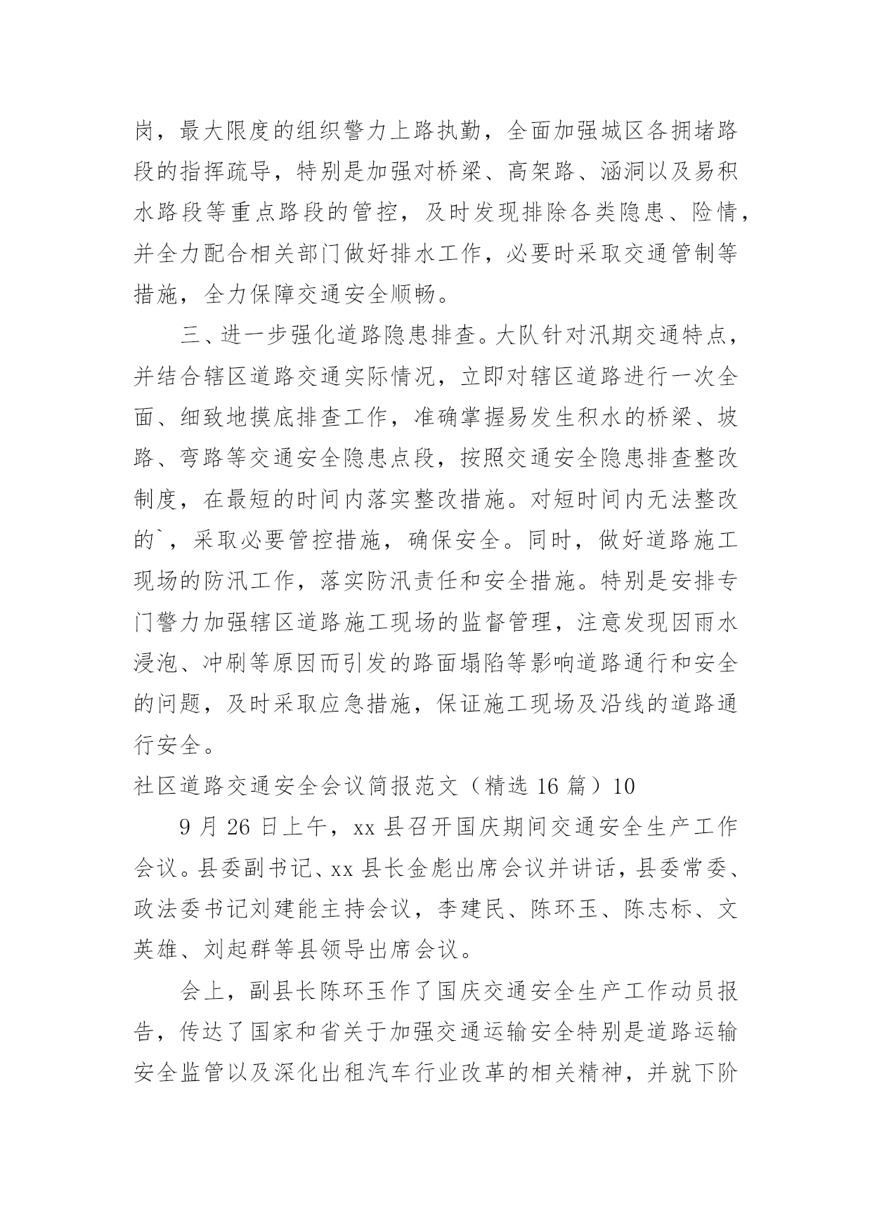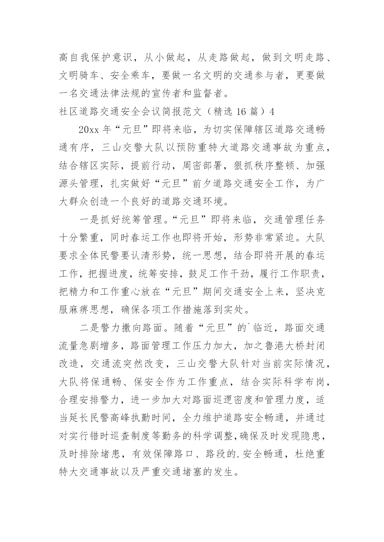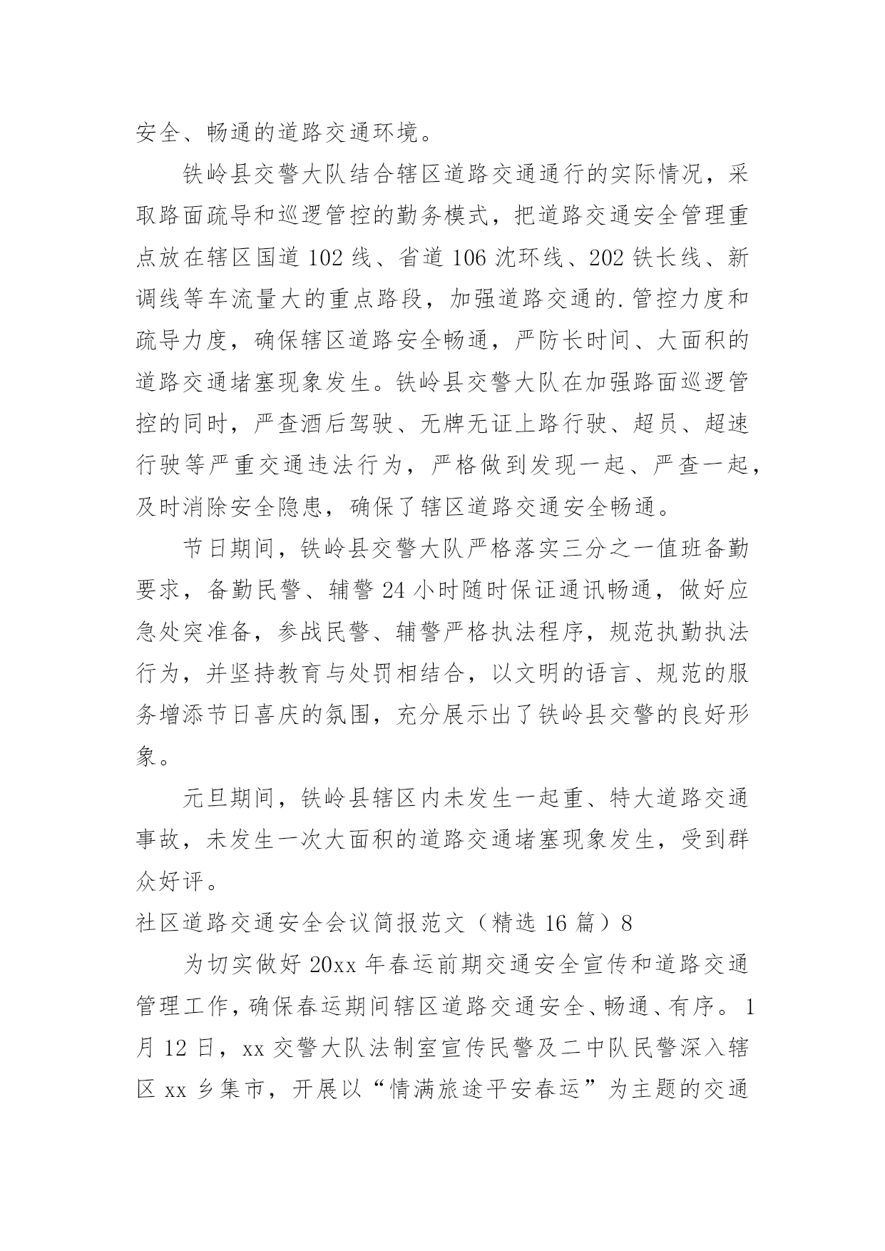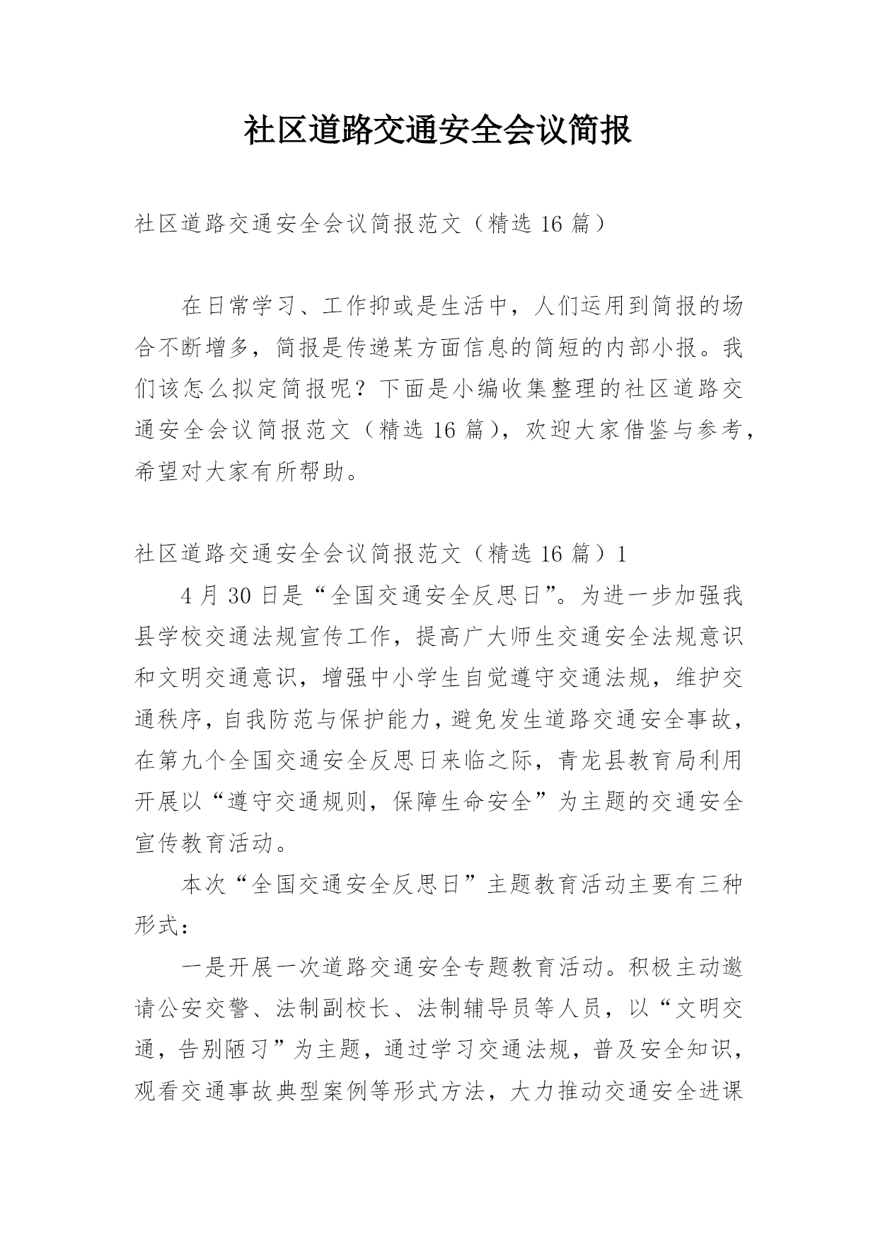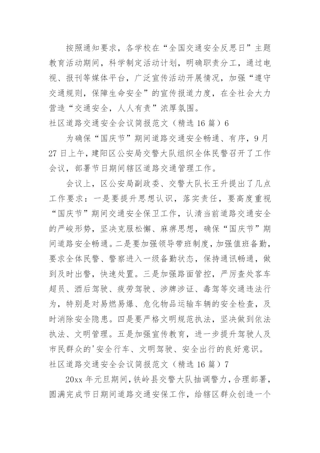 社区道路交通安全会议简报社区道路交通安全会议简报范文(精选16篇)在日常学习、工作抑或是生活中,人们运用到简报的场合不断增多,简报是传递某方面信息的简短的内部小报。我们该怎么拟定简报呢?下面是小编收集整理的社区道路交通安全会议简报范文(精选16篇),欢迎大家借鉴与参考,希望对大家有所帮助。社区道路交通安全会议简报范文(精选16篇)14月30日是“全国交通安全反思日”。为进一步加强我县学校交通法规宣传工作,提高广大师生交通安全法规意识和文明交通意识,增强中小学生自觉遵守交通法规,维护交通秩序,自我防范与保护能力,避免发生道路交通安全事故,在第九个全国交通安全反思日来临之际,青龙县教育局利用开展以“遵守交通规则,保障生命安全”为主题的交通安全宣传教育活动。本次“全国交通安全反思日”主题教育活动主要有三种形式:一是开展一次道路交通安全专题教育活动。积极主动邀请公安交警、法制副校长、法制辅导员等人员,以“文明交通,告别陋习”为主题,通过学习交通法规,普及安全知识,观看交通事故典型案例等形式方法,大力推动交通安全进课堂,教育引导师生自觉维护公共交通秩序,保障交通安全,提高文明交通素养。二是开展一次“全国交通安全反思日”主题宣传活动。紧扣“遵守交通规则,保障生命安全”教育主题,通过学校网络、校园广播、版面橱窗、电子屏幕、悬挂条幅、黑板报等宣传阵地,大力宣传中小学生道路交通安全有关常识,进一步强化学生交通安全意识,严防发生师生道路交通安全事故。三是组织一次“小手拉大手”主题实践活动。突出“安全第一”原则,结合文明交通行动计划安排、“全国交通安全反思日”教育要求、“五一”师生假日活动实际,以“文明安全出行”为主题,以强化学生“安全乘车、安全骑车、安全走路”为重点,通过开展交通安全主题班(队)会活动,开展学习“小交警”交通指挥手势操、“小手拉大手”社会实践活动等形式,引导广大师生自觉做到“过马路走人行道,过路口不闯红灯,行人不进入机动车道,不乱停乱放车辆”,珍惜生命安全,积极推进全社会文明交通进程。社区道路交通安全会议简报范文(精选16篇)2为进一步加强道路交通安全知识的宣传教育,切实增强广大深深地道路交通安全意识,预防杜绝道路交通安全事故的发生。瑞溪镇中心小学于4月27日开展“文明交通,告别陋习”的道路交通安全知识主题宣传教育活动。本次活动由瑞溪镇中心小学政教处主任李正法组织,中心小学全体师生参与。活动分两项内容,一是利用早上升旗仪式国旗下讲话时间,李正法主任以“文明交通,告别陋习”为主题,给广大师生讲解了道路交通规则,在公路和街道上行走应注意的事项;二是利用下午活动课时间,按班级组织学生到远教室观看道路交通影视片。通过这次“文明交通,告别陋习”主题活动的'开展,使广大师生学习了解到更多的道路交通安全知识,为促进广大师生严格遵守交通规则,并向身边的人宣传文明交通起到较好的教育作用。社区道路交通安全会议简报范文(精选16篇)3为进一步提高在校师生的交通安全意识,养成自觉遵守交通法规的良好习惯,预防和减少校园周边交通事故的发生。9月1日上午,廊坊交警二大队的`宣传民警走进廊坊市葛渔城东街小学开展交通安全宣传教育活动。在交通安全教育活动上,宣传民警以幻灯片为载体,结合近年来中小学生发生的交通事故案例,提示同学们在过马路时要做到“一慢二看三通过”,在上放学路上不要追逐打闹,不能在马路上进行滑旱冰、滑板等危险性游戏。并与广大师生互动,通过做游戏的方式为他们答疑释惑,让这些学生在轻松愉悦的氛围中了解了交通安全知识。同时,要求学生劝诫和监督各自的家长不要饮酒驾车,不乘坐超员车、农用车出行。要自觉遵守交通法律法规,增强参与交通安全意识,文明参与到交通安全中去。通过开展此次宣传活动,让孩子们更多地掌握交通安全常识,加强自身安全防范能力。最后,民警希望学生们能提高自我保护意识,从小做起,从走路做起,做到文明走路、文明骑车、安全乘车,要做一名文明的交通参与者,更要做一名交通法律法规的宣传者和监督者。社区道路交通安全会议简报范文(精选16篇)420xx年“元旦”即将来临,为切实保障辖区道路交通畅通有序,三山交警大队以预防重特大道路交通事故为重点,结合辖区实际,提前行动,周密部署,狠抓秩序整顿、加强源头管理,扎实做好“元旦”前夕道路交通安全工作,为广大群众创造一个良好的道路交通环境。一是抓好统筹管理。“元旦”即将来临,交通管理任务十分繁重,同时春运工作也即将开始,形势非常紧迫。大队要求全体民警要认清形势,统一思想,结合即将开展的春运工作,把握进度,统筹安排,鼓足工作干劲,履行工作职责,把精力和工作重心放在“元旦”期间交通安全上来,坚决克服麻痹思想,确保各项工作措施落到实处。二是警力撒向路面。随着“元旦”的`临近,路面交通流量急剧增多,路面管理工作压力加大,加之鲁港