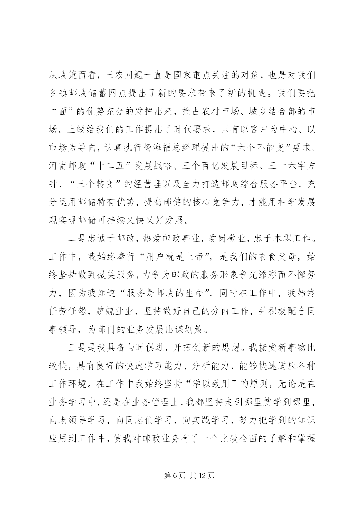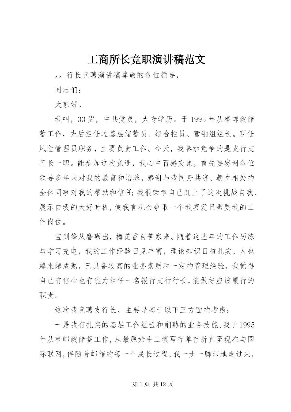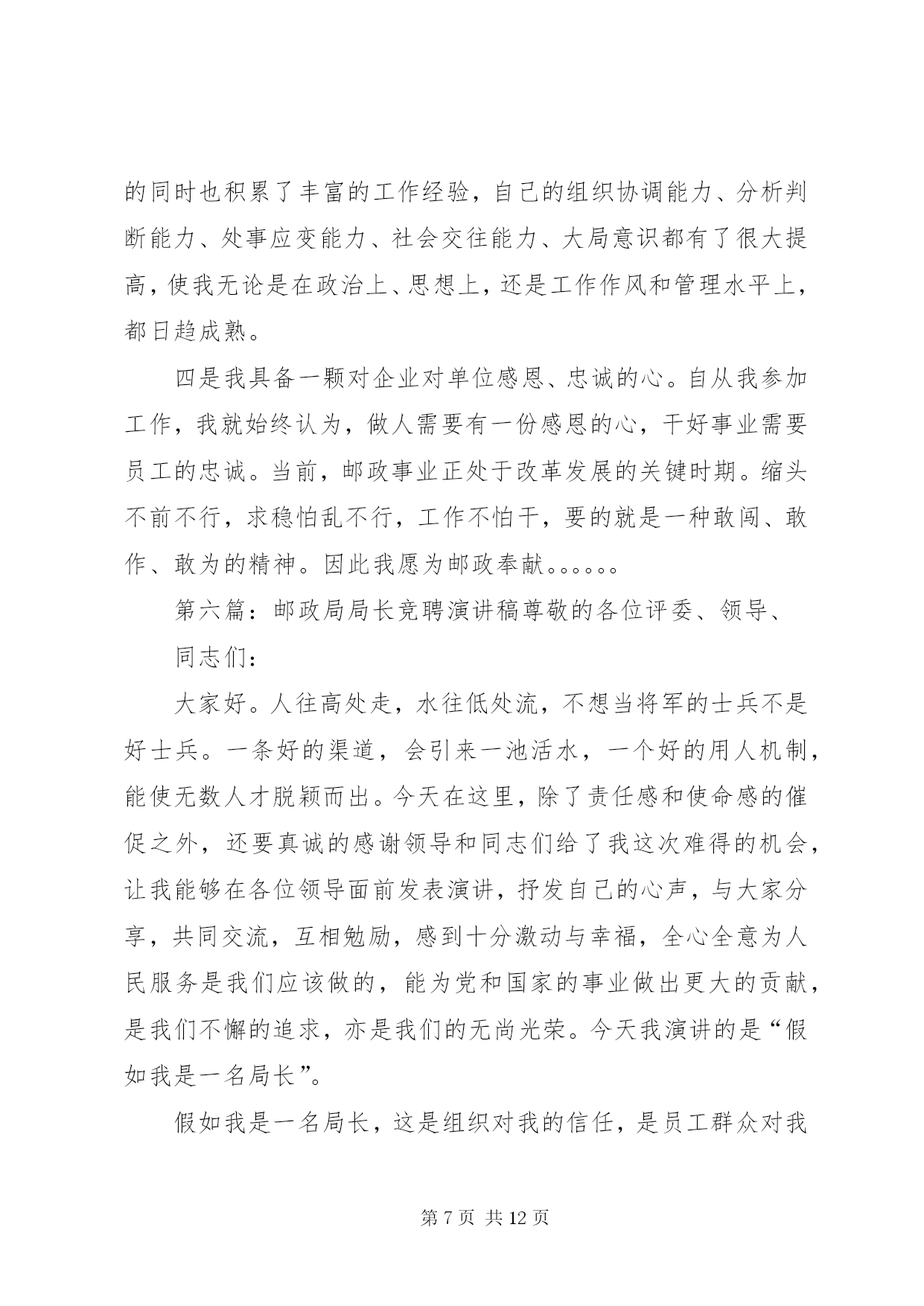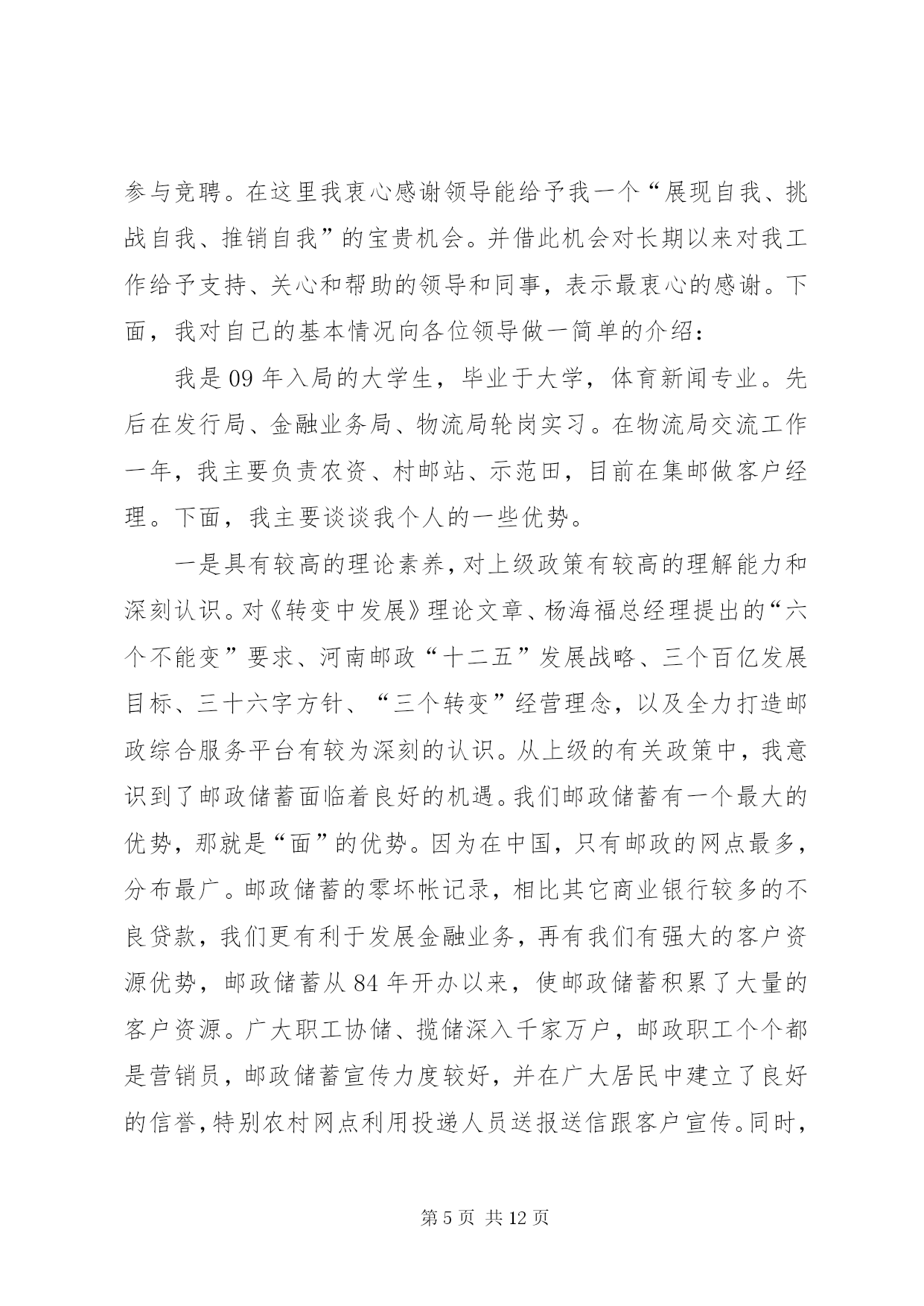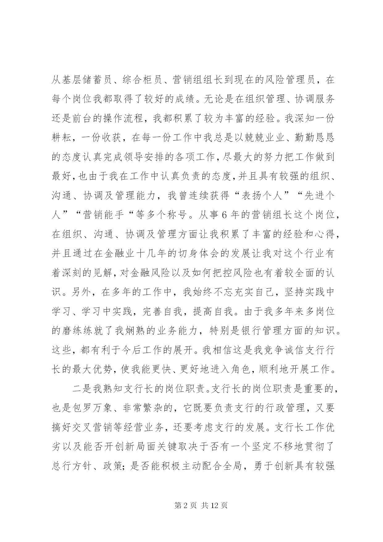 第PAGE\*Arabic\*MERGEFORMAT12页共NUMPAGES\*MERGEFORMAT12页工商所长竞职演讲稿范文。。行长竞聘演讲稿尊敬的各位领导,同志们:大家好。我叫,33岁,中共党员,大专学历。于1995年从事邮政储蓄工作,先后担任过基层储蓄员、综合柜员、营销组组长。现任风险管理员职务,主要负责工作。今天,我参加竞争的是支行支行长一职。能参加这次竞选,我心中百感交集,首先要感谢各位领导多年来对我的教育和培养,感谢与我同舟共济、朝夕相处的全体同事对我的帮助和信任;我很荣幸自己赶上了这次挑战自我、展示自我的大好时机,使我有机会争取一个我喜爱且需要我的工作岗位。宝剑锋从磨砺出,梅花香自苦寒来。随着这些年的工作历练与学习充电,我的工作经验日见丰富,理论知识日益扎实,人也越来越成熟,已具备较高的业务素质和一定的管理经验,我觉得自己有信心也有能力担任一名银行支行行长,能做好应该履行的职责。这次我竞聘支行长,主要是基于以下三方面的考虑:一是我有扎实的基层工作经验和娴熟的业务技能。我于1995年从事邮政储蓄工作,从最原始手工填写存单存折直至现在与国际联网,伴随着邮储的每一个成长过程,我一步一脚印地走过来,从基层储蓄员、综合柜员、营销组组长到现在的风险管理员,在每个岗位我都取得了较好的成绩。无论是在组织管理、协调服务还是前台的操作流程,我都积累了较为丰富的经验。我深知一份耕耘,一份收获,在每一份工作中我总是以兢兢业业、勤勤恳恳的态度认真完成领导安排的各项工作,尽最大的努力把工作做到最好,也由于我在工作中认真负责的态度,并且具有较强的组织、沟通、协调及管理能力,我曾连续获得“表扬个人”“先进个人”“营销能手“等多个称号。从事6年的营销组长这个岗位,在组织、沟通、协调及管理方面让我积累了丰富的经验和心得,并且通过在金融业十几年的切身体会的发展让我对这个行业有着深刻的见解,对金融风险以及如何把控风险也有着较全面的认识。另外,在多年的工作中,我始终不忘充实自己,坚持实践中学习、学习中实践,完善自我,提高自我。由于我多年来多岗位的磨练练就了我娴熟的业务能力,特别是银行管理方面的知识。这些,都有利于今后工作的展开。我相信这是我竞争诚信支行行长的最大优势,使我能更快、更好地进入角色,顺利地开展工作。二是我熟知支行长的岗位职责。支行长的岗位职责是重要的,也是包罗万象、非常繁杂的,它既要负责支行的行政管理,又要搞好交叉营销等经营业务,还要考虑支行的发展。支行长工作优劣以及能否开创新局面关键取决于否有一个坚定不移地贯彻了总行方针、政策;是否能积极主动配合全局,勇于创新具有较强组织能力和良好素质修养;是否善于博采众长带领大家团结一致、万众一心、协调工作领导集体。对工作职责的清醒认识和明确定位使我在思想上做好了迎接挑战的准备。重要的是我能够站在全局的角度,全方位地思考问题,并说出自己的想法,也许有利于推进支行的工作发展。三是热情与冷静并存。工作中我总能清醒的意识到肩负的责任,在职业生涯中未曾在原则。。。。。。第四篇:邮政局副局长个人竞聘演讲稿尊敬的各位领导,同事们:大家好。今天,我站在这里,心情非常激动。我本着进一步锻炼自己,为单位多做贡献的宗旨,参加本次邮局副局长竞聘。首先非常感谢单位,为我们提供了一个这么好的竞争平台,让我们可以在这里展现风采,同时,更要感谢多年来一直关心、帮助我的领导和同事们。我叫,今年岁,年进入邮局工作,先后从事过等工作。回首过去年的工作,在单位领导和同仁们的支持和帮助下,我从一个新兵逐渐成长为一个有担当、业务熟练的工作人员。我认为,对于今天的竞聘,我有以下几方面的优势:一是具有勇挑重担的信心。面对瞬息万变的国际国内形势,服务行业竞争日趋激烈。我们邮局认清形势,并抓住我国经济发展和国家出台的一系列优惠政策,搞好我们邮政的改革和发展。提出了在转变中发展,在发展中转变的口号。企业要发展,就必须有专业的团队来服好务。建设一支专业素质高的人才和领导队伍才是根本之道。我坚信,自己能够胜任这项光荣而艰巨的任务。二是具有丰富的工作经验经过多年的基层锻炼,我对邮局相关的业务非常熟悉。并且工作中,我始终不忘充实自己,坚持干中学、学中干,完善自我,提高自我。在我们邮局改革发展的新征途中,需要我们转变思想,强化创新意识,强化为民服务的意识,大力推进“三个转变”的实施,并结合咱们河南悠久而丰富的历史文化,成为大力宣传我们中原文化的主要载体之一。三是具备良好的人际沟通能力和组织协调能力。在工作中尊重领导,团结同事,坚持做到识大体顾大局,能够坚持原则而又不失灵活,处理问题思路清晰,头绪分明。特别是经过年来岗位上的学习和锻炼,使自己的业务能力、组织协调能力、分析判断能力、领导掌控能力都有了较大的提高,使自己一步一步走向成熟。。。