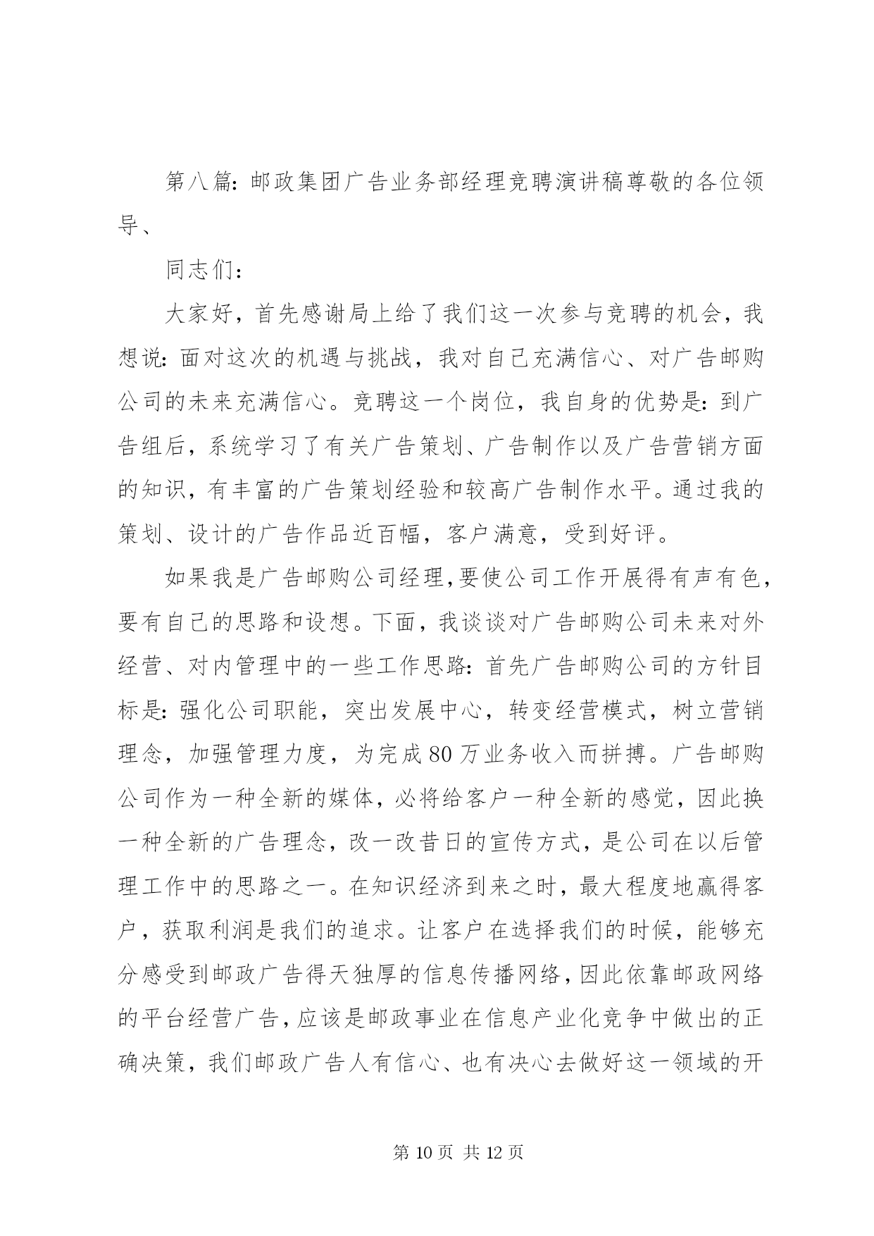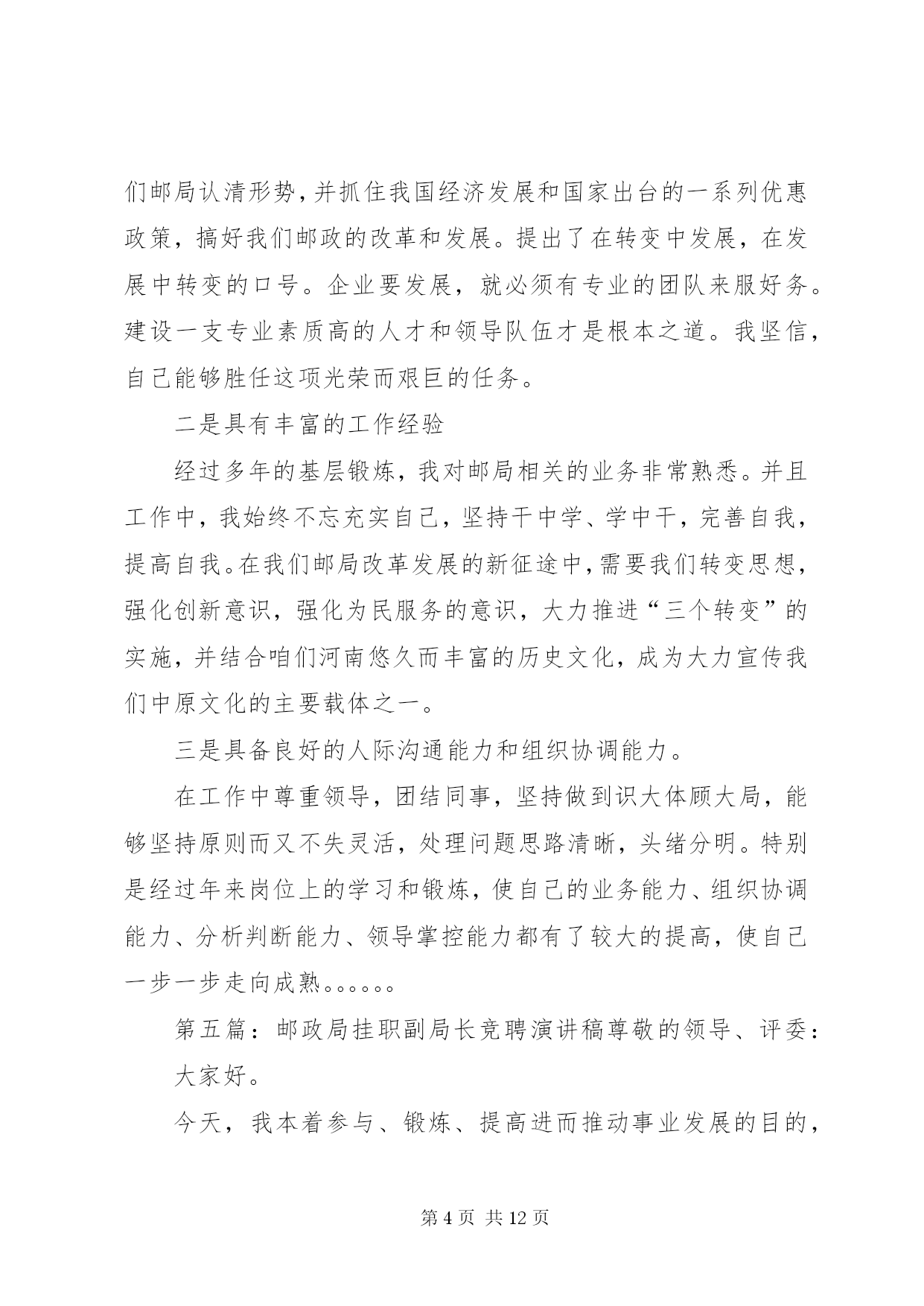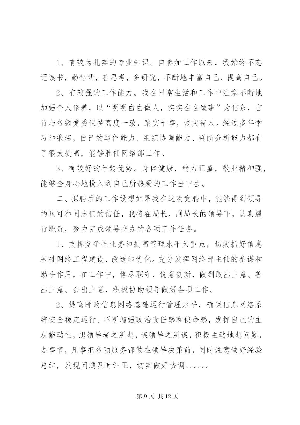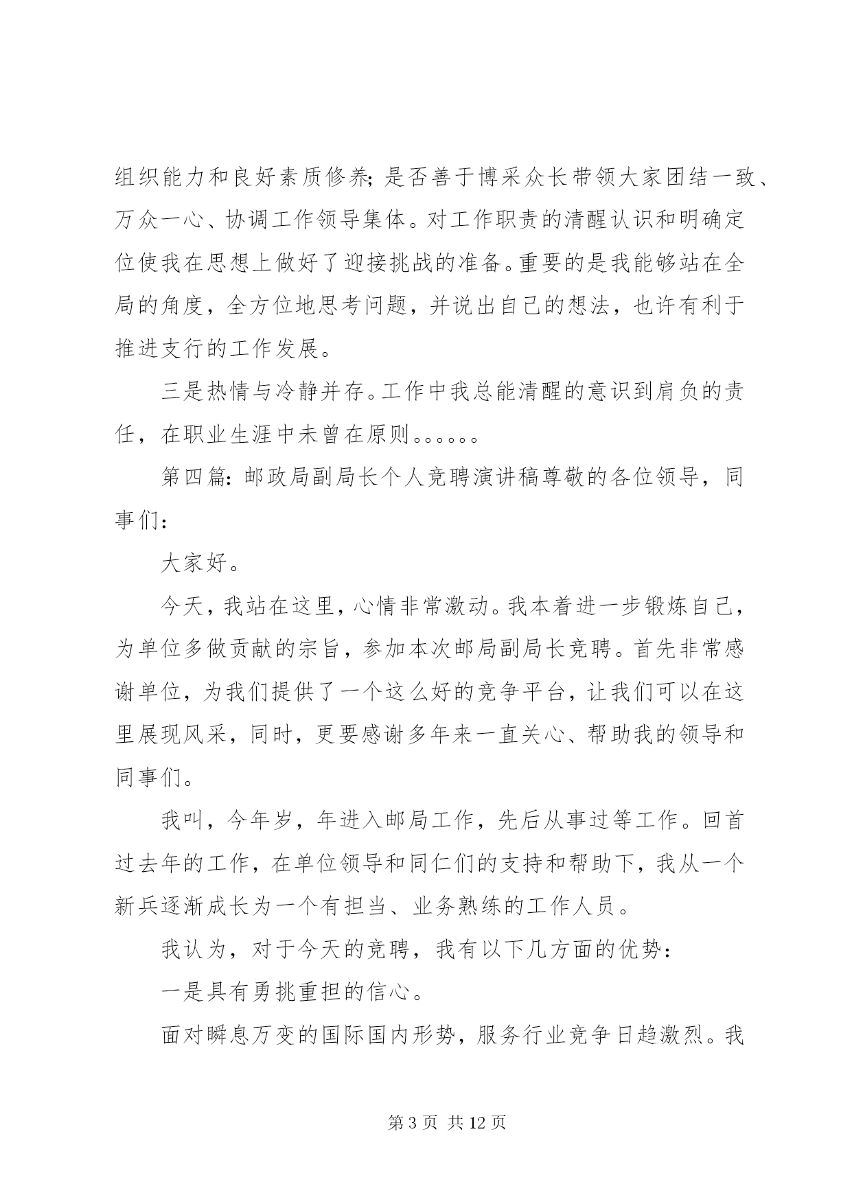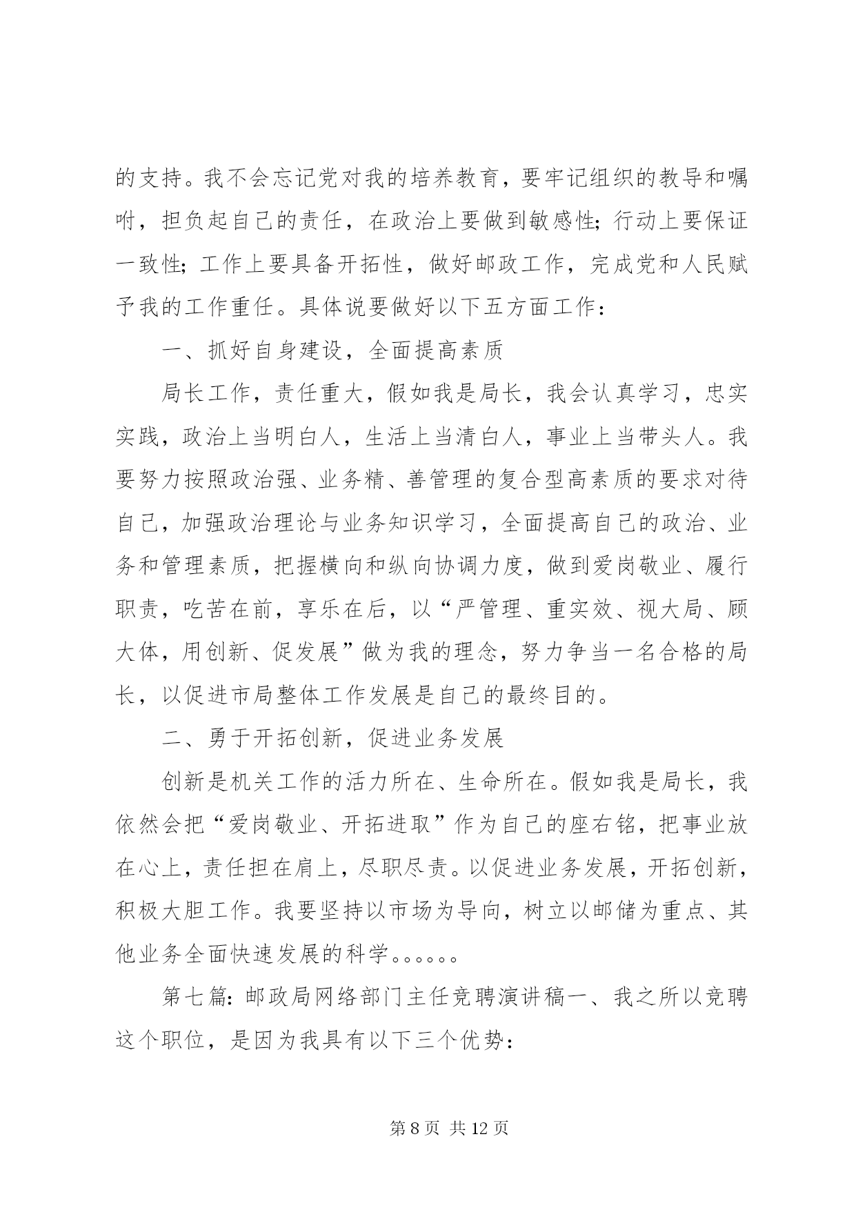 第PAGE\*Arabic\*MERGEFORMAT12页共NUMPAGES\*MERGEFORMAT12页工商所长竞职演讲稿范文。。行长竞聘演讲稿尊敬的各位领导,同志们:大家好。我叫,33岁,中共党员,大专学历。于1995年从事邮政储蓄工作,先后担任过基层储蓄员、综合柜员、营销组组长。现任风险管理员职务,主要负责工作。今天,我参加竞争的是支行支行长一职。能参加这次竞选,我心中百感交集,首先要感谢各位领导多年来对我的教育和培养,感谢与我同舟共济、朝夕相处的全体同事对我的帮助和信任;我很荣幸自己赶上了这次挑战自我、展示自我的大好时机,使我有机会争取一个我喜爱且需要我的工作岗位。宝剑锋从磨砺出,梅花香自苦寒来。随着这些年的工作历练与学习充电,我的工作经验日见丰富,理论知识日益扎实,人也越来越成熟,已具备较高的业务素质和一定的管理经验,我觉得自己有信心也有能力担任一名银行支行行长,能做好应该履行的职责。这次我竞聘支行长,主要是基于以下三方面的考虑:一是我有扎实的基层工作经验和娴熟的业务技能。我于1995年从事邮政储蓄工作,从最原始手工填写存单存折直至现在与国际联网,伴随着邮储的每一个成长过程,我一步一脚印地走过来,从基层储蓄员、综合柜员、营销组组长到现在的风险管理员,在每个岗位我都取得了较好的成绩。无论是在组织管理、协调服务还是前台的操作流程,我都积累了较为丰富的经验。我深知一份耕耘,一份收获,在每一份工作中我总是以兢兢业业、勤勤恳恳的态度认真完成领导安排的各项工作,尽最大的努力把工作做到最好,也由于我在工作中认真负责的态度,并且具有较强的组织、沟通、协调及管理能力,我曾连续获得“表扬个人”“先进个人”“营销能手“等多个称号。从事6年的营销组长这个岗位,在组织、沟通、协调及管理方面让我积累了丰富的经验和心得,并且通过在金融业十几年的切身体会的发展让我对这个行业有着深刻的见解,对金融风险以及如何把控风险也有着较全面的认识。另外,在多年的工作中,我始终不忘充实自己,坚持实践中学习、学习中实践,完善自我,提高自我。由于我多年来多岗位的磨练练就了我娴熟的业务能力,特别是银行管理方面的知识。这些,都有利于今后工作的展开。我相信这是我竞争诚信支行行长的最大优势,使我能更快、更好地进入角色,顺利地开展工作。二是我熟知支行长的岗位职责。支行长的岗位职责是重要的,也是包罗万象、非常繁杂的,它既要负责支行的行政管理,又要搞好交叉营销等经营业务,还要考虑支行的发展。支行长工作优劣以及能否开创新局面关键取决于否有一个坚定不移地贯彻了总行方针、政策;是否能积极主动配合全局,勇于创新具有较强组织能力和良好素质修养;是否善于博采众长带领大家团结一致、万众一心、协调工作领导集体。对工作职责的清醒认识和明确定位使我在思想上做好了迎接挑战的准备。重要的是我能够站在全局的角度,全方位地思考问题,并说出自己的想法,也许有利于推进支行的工作发展。三是热情与冷静并存。工作中我总能清醒的意识到肩负的责任,在职业生涯中未曾在原则。。。。。。第四篇:邮政局副局长个人竞聘演讲稿尊敬的各位领导,同事们:大家好。今天,我站在这里,心情非常激动。我本着进一步锻炼自己,为单位多做贡献的宗旨,参加本次邮局副局长竞聘。首先非常感谢单位,为我们提供了一个这么好的竞争平台,让我们可以在这里展现风采,同时,更要感谢多年来一直关心、帮助我的领导和同事们。我叫,今年岁,年进入邮局工作,先后从事过等工作。回首过去年的工作,在单位领导和同仁们的支持和帮助下,我从一个新兵逐渐成长为一个有担当、业务熟练的工作人员。我认为,对于今天的竞聘,我有以下几方面的优势:一是具有勇挑重担的信心。面对瞬息万变的国际国内形势,服务行业竞争日趋激烈。我们邮局认清形势,并抓住我国经济发展和国家出台的一系列优惠政策,搞好我们邮政的改革和发展。提出了在转变中发展,在发展中转变的口号。企业要发展,就必须有专业的团队来服好务。建设一支专业素质高的人才和领导队伍才是根本之道。我坚信,自己能够胜任这项光荣而艰巨的任务。二是具有丰富的工作经验经过多年的基层锻炼,我对邮局相关的业务非常熟悉。并且工作中,我始终不忘充实自己,坚持干中学、学中干,完善自我,提高自我。在我们邮局改革发展的新征途中,需要我们转变思想,强化创新意识,强化为民服务的意识,大力推进“三个转变”的实施,并结合咱们河南悠久而丰富的历史文化,成为大力宣传我们中原文化的主要载体之一。三是具备良好的人际沟通能力和组织协调能力。在工作中尊重领导,团结同事,坚持做到识大体顾大局,能够坚持原则而又不失灵活,处理问题思路清晰,头绪分明。特别是经过年来岗位上的学习和锻炼,使自己的业务能力、组织协调能力、分析判断能力、领导掌控能力都有了较大的提高,使自己一步一步走向成熟。。。