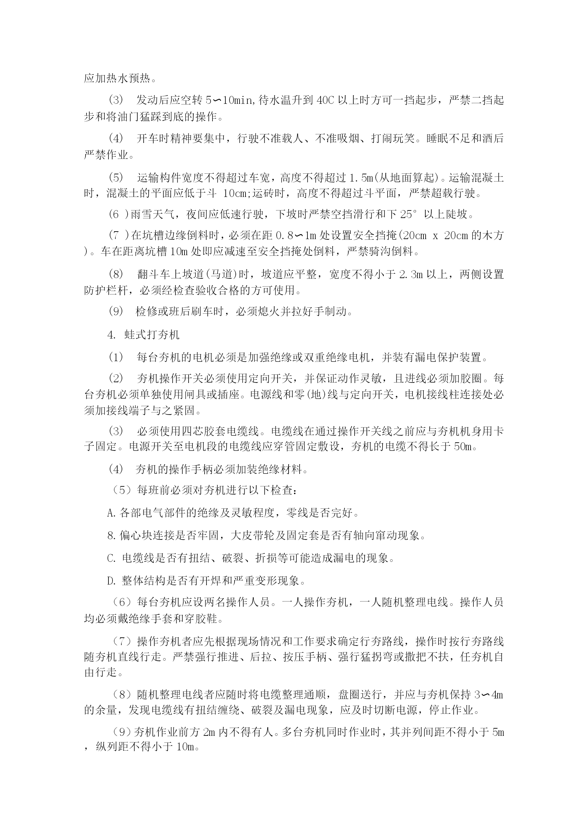 特种机械安全措施一、起重工(起重机司机、指挥信号、挂钩工)一般规定1)起重工必须经专门安全技术培训,考试合格持证上岗。严禁酒后作业。2)起重工应健康,两眼视力均不得低于1.0,无色盲、听力障碍、高血压、心脏病、癫痫病、眩晕、突发性昏厥及其他影响起重吊装作业的疾病与生理缺陷。3)作业前必须检查作业环境、吊索具、防护用品。吊装区域无闲散人员,障碍已排除。吊索具无缺陷,捆绑正确牢固,被吊物与其他物件无连接。确认安全后方可作业。4)轮式或履带式起重机作业时必须确定吊装区域,并设警戒标志,必要时派入监护。5)大雨、大雪、大雾及风力六级以上(含六级)等恶劣天气,必须停止露天起重吊装作业。严禁在带电的高压线下或一侧作业。6)在高压线垂直或水平方向作业时,必须保持下表所列的最小安全距离。起重机与架空输电导线的最小安全距离输电导线电压(KV)1以下1〜1520〜4060〜110220允许沿输电导线垂直方向最近距离(m)1.53456允许沿输电导线水平方向最近距离(m)11.52467)起重机司机、指挥信号、挂钩工必须具备下列操作能力:(1)起重机司机必须熟知下列知识和操作能力:所操纵的起重机的构造和技术性能。起重机安全技术规程、制度。起重量、变幅、起升速度与机械稳定性的关系。钢丝绳的类型、鉴别、保养与安全系数的选择。一般仪表的使用及电气设备常见故障的排除。钢丝绳接头的穿结(卡接、插接)。吊装构件重量计算。操作中能及时发现或判断各机构故障,并能采取有效措施。制动器突然失效能作紧急处理。(2)指挥信号工必须熟知下列知识和操作能力:应掌握所指挥的起重机的技术性能和起重工作性能,能定期配合司机进行检查。能熟练地运用手势、旗语、哨声和通讯设备。能看懂一般的建筑结构施工图,能按现场平面布置图和工艺要求指挥起吊、就位构件、材料和设备等。掌握常用材料的重要和吊运就位方法及构件重心位置,并能计算非标准构件和材料的重量。正确地使用吊具、索具,编插各种规格的钢丝绳。有防止构件装卸、运输、堆放过程中变形的知识。掌握起重机最大起重量和各种高度、幅度时的起重量,熟知吊装、起重有关知识。具备指挥单机、双机或多机作业的指挥能力。严格执行“十不吊”的原则。即:被吊物重量超过机械性能允许范围:信号不清;吊物下方有人;吊物上站人;埋在地下物;斜拉斜牵物;散物捆绑不牢;立式构件、大模板等不用卡环;零碎物无容器;吊装物重量不明等。8)挂钩工必须相对固定并熟知下列知识和操作能力:(1)必须服从指挥信号的指挥。(2)熟练运用手势、旗语、哨声的使用。(3)熟悉起重机的技术性能和工作性能。(4)熟悉常用材料重量,构件的重心位置及就位方法。(5)熟悉构件的装卸、运输、堆放的有关知识。(6)能正确使用吊、索具和各种构件的拴挂方法。9)作业时必须执行安全技术交底,听从统一指挥。10)使用起重机作业时,必须正确选择吊点的位置,合理穿挂索具,试吊。除指挥及挂钩人员外,严禁其他人员进入吊装作业区。11)使用两台吊车抬吊大型构件时,吊车性能应一致,单机荷载应合理分配,且不得超过额定荷载的80%。作业时必须统一指挥,动作一致。基本操作1)穿绳:确定吊物重心,选好挂绳位置。穿绳应用铁钩,不得将手臂伸到吊物下面。吊运棱角坚硬或易滑的吊物,必须加衬垫,用套索。2)挂绳:应按顺序挂绳,吊绳不得相互挤压、交叉、扭压、绞拧。一般吊物可用兜挂法,必须保护吊物平衡,对于易滚、易滑或超长货物,宜采用绳索方法,使用卡环锁紧吊绳。3)试吊:吊绳套挂牢固,起重机缓慢起升,将吊绳绷紧稍停,起升不得过高。试吊中,指挥信号工、挂钩工、司机必须协调配合。如发现吊物重心偏移或其他物件粘连等情况时,必须立即停止起吊,采取措施并确认安全后方可起吊。4)摘绳:落绳、停稳、支稳后方可放松吊绳。对易滚、易滑、易散的吊物,摘绳要用安全钩。挂钩工不得站在吊物上面。如遇不易人工摘绳时,应选用其他机具辅助,严禁攀登吊物及绳索。5)抽绳:吊钩应与吊物重心保持垂直,缓慢起绳,不得斜拉、强拉、不得旋转吊臂抽绳。如遇吊绳被压,应立即停止抽绳,可采取提头试吊方法抽绳。吊运易损、易滚、易倒的吊物不得使用起重机抽绳。6)吊挂作业应遵守以下规定:(1)兜绳吊挂应保持吊点位置准确、兜绳不偏移、吊物平衡。(2)锁绳吊挂应便于摘绳操作。(3)卡具吊挂时应避免卡具在吊装中被碰撞。(4)扁担吊挂时,吊点应对称于吊物中心。7)捆绑作业应遵守以下规定:(1)捆绑必须牢固。(2)吊运集装箱等箱式吊物装车时,应使用捆绑工具将箱体与车连接牢固,并加垫防滑。(3)管材、构件等必须用紧线器紧固。8)新起重工具、吊具应按说明书检验,试吊后方可正式使用。9)长期不用的超重、吊挂机具,必