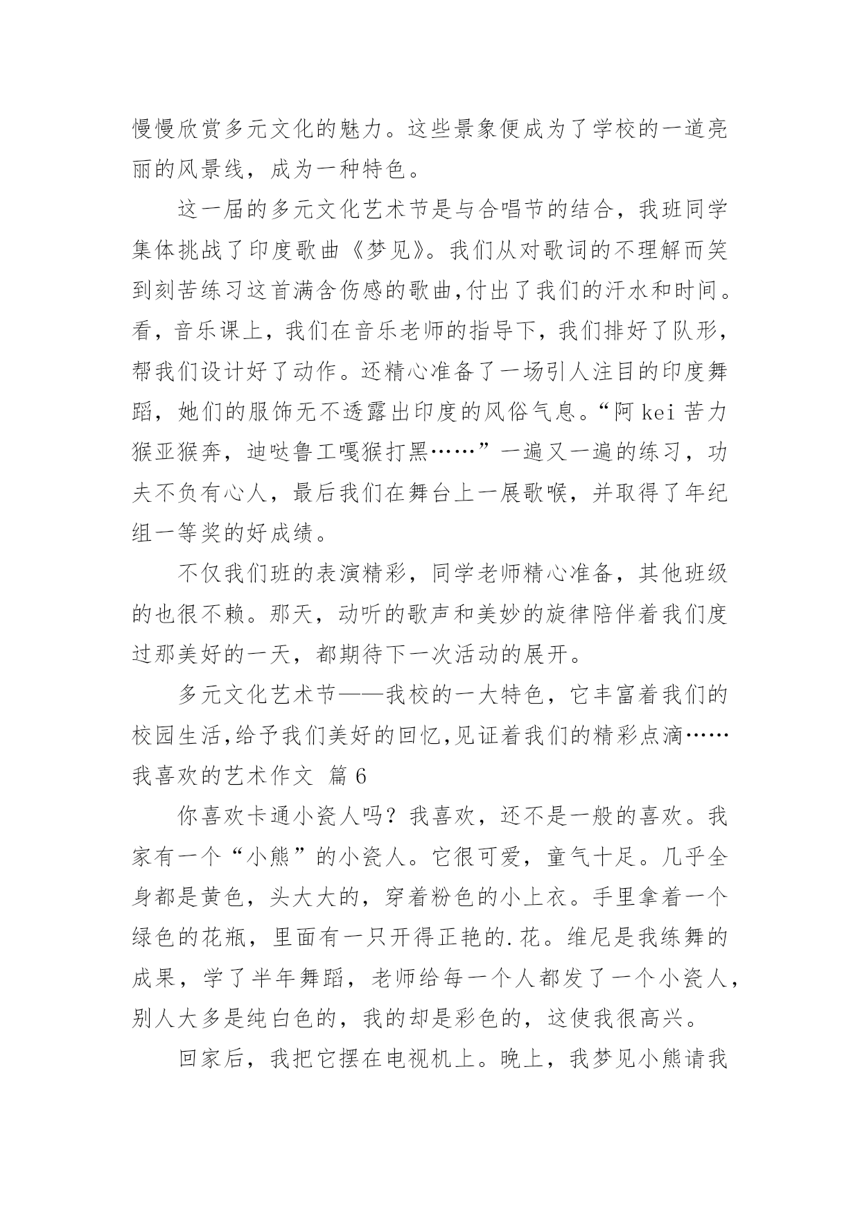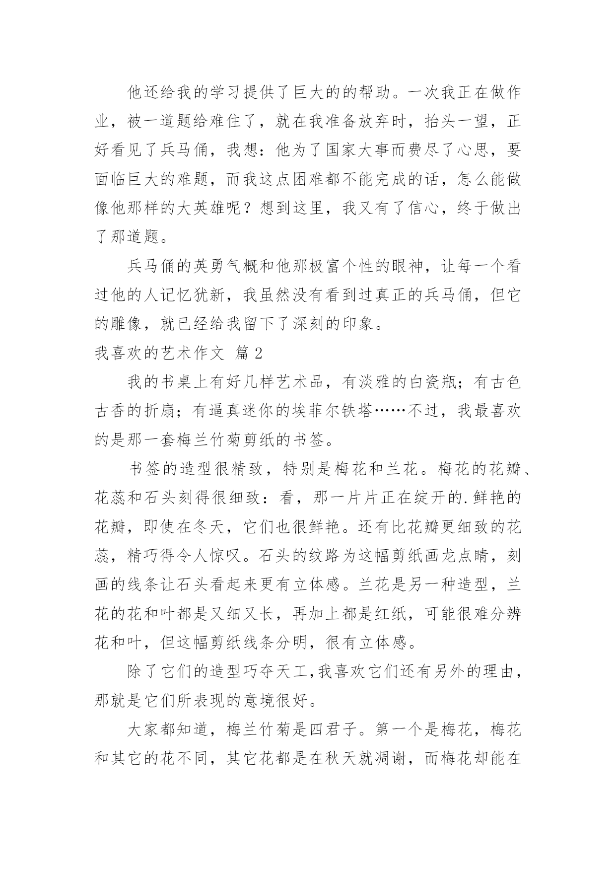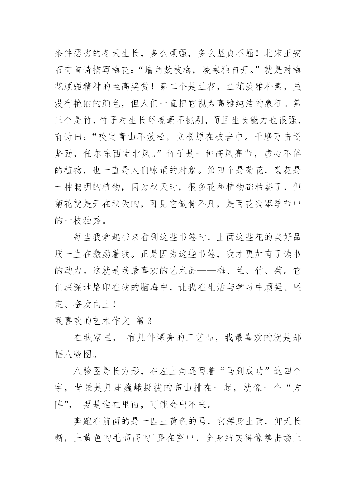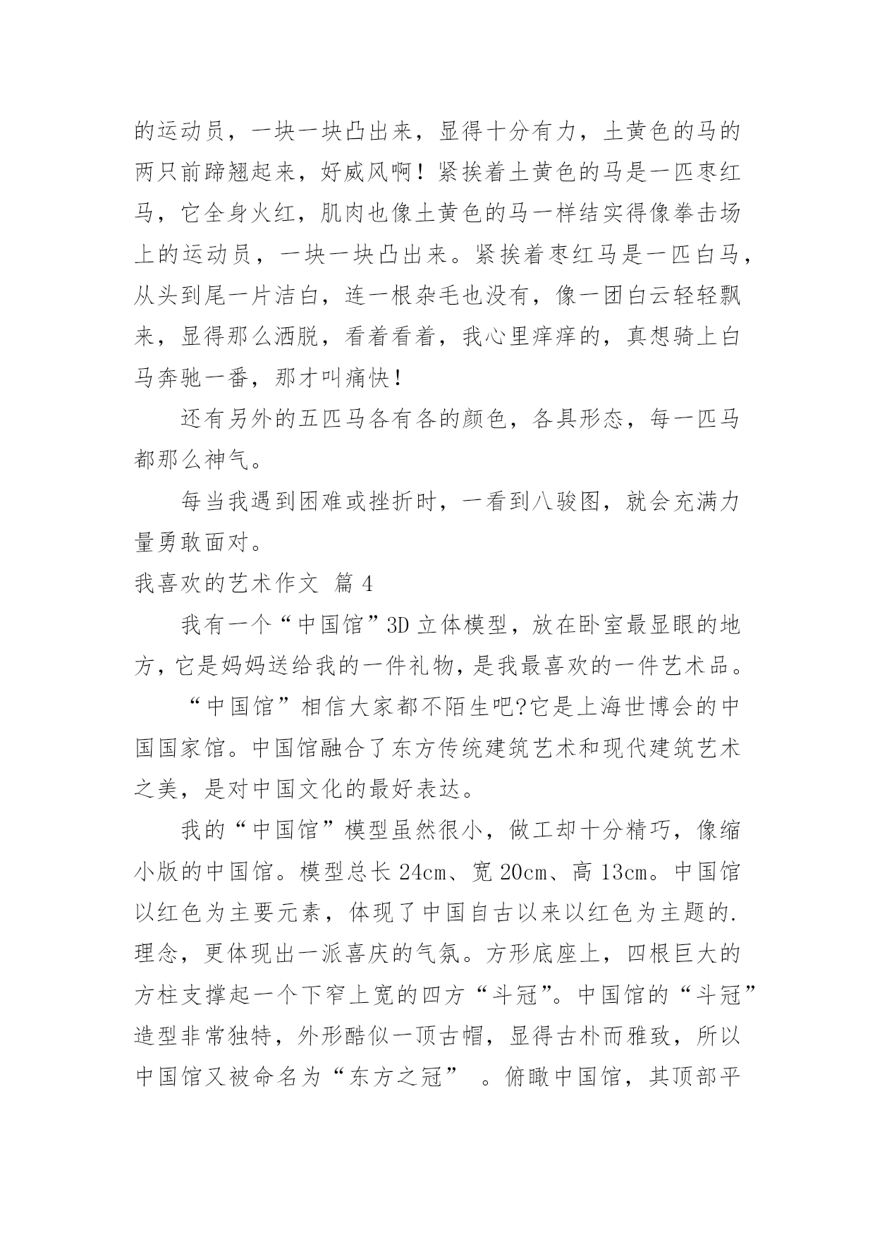 我喜欢的艺术作文[精选]我喜欢的艺术作文9篇在平平淡淡的学习、工作、生活中,大家都尝试过写作文吧,通过作文可以把我们那些零零散散的思想,聚集在一块。一篇什么样的作文才能称之为优秀作文呢?下面是小编为大家整理的我喜欢的艺术作文10篇,仅供参考,希望能够帮助到大家。我喜欢的艺术作文篇1我最喜欢的艺术品是家里的兵马俑。兵马俑从整体上看几乎都是淡黑色,它的体积很小,是呈站立的姿势。头上扎得是盘头,脖子下边有一个简陋的围巾,他的衣着是由一片片铁片组成的战袍,看上去英武非凡,这不禁让我联想到了战士们在沙场上浴血博杀的场景。他的手自然地垂放在身体两侧,像是一个整装待发的士兵。当我看见兵马俑的面部表情时,我就认为他一定是一个出色的的士兵,因为他的.眼神是充满杀气和忧愁,让人难以捉摸。有时他的眼神让人觉得他好像对敌人有着很深的仇恨,有时让人觉得他好像为国家大事而感到劳累;有时让人觉得他好像是在为打了胜仗而高兴。从这点就可以看出工匠的技艺之高超。他的眉毛和皱纹更衬托出他的潇洒,在他那高挺的鼻子下,还有着一撮八字胡,可见他为国家大事而费尽了心思。他的嘴角微微向上翘起,可以看出他正为打了胜仗而高兴。他还给我的学习提供了巨大的的帮助。一次我正在做作业,被一道题给难住了,就在我准备放弃时,抬头一望,正好看见了兵马俑,我想:他为了国家大事而费尽了心思,要面临巨大的难题,而我这点困难都不能完成的话,怎么能做像他那样的大英雄呢?想到这里,我又有了信心,终于做出了那道题。兵马俑的英勇气概和他那极富个性的眼神,让每一个看过他的人记忆犹新,我虽然没有看到过真正的兵马俑,但它的雕像,就已经给我留下了深刻的印象。我喜欢的艺术作文篇2我的书桌上有好几样艺术品,有淡雅的白瓷瓶;有古色古香的折扇;有逼真迷你的埃菲尔铁塔……不过,我最喜欢的是那一套梅兰竹菊剪纸的书签。书签的造型很精致,特别是梅花和兰花。梅花的花瓣、花蕊和石头刻得很细致:看,那一片片正在绽开的.鲜艳的花瓣,即使在冬天,它们也很鲜艳。还有比花瓣更细致的花蕊,精巧得令人惊叹。石头的纹路为这幅剪纸画龙点睛,刻画的线条让石头看起来更有立体感。兰花是另一种造型,兰花的花和叶都是又细又长,再加上都是红纸,可能很难分辨花和叶,但这幅剪纸线条分明,很有立体感。除了它们的造型巧夺天工,我喜欢它们还有另外的理由,那就是它们所表现的意境很好。大家都知道,梅兰竹菊是四君子。第一个是梅花,梅花和其它的花不同,其它花都是在秋天就凋谢,而梅花却能在条件恶劣的冬天生长,多么顽强,多么坚贞不屈!北宋王安石有首诗描写梅花:“墙角数枝梅,凌寒独自开。”就是对梅花顽强精神的至高奖赏!第二个是兰花,兰花淡雅朴素,虽没有艳丽的颜色,但人们一直把它视为高雅纯洁的象征。第三个是竹,竹子对生长环境毫不挑剔,而且生长能力也很强,有诗曰:“咬定青山不放松,立根原在破岩中。千磨万击还坚劲,任尔东西南北风。”竹子是一种高风亮节,虚心不俗的植物,也一直是人们咏诵的对象。第四个是菊花,菊花是一种聪明的植物,因为秋天时,很多花和植物都枯萎了,但菊花就是开在秋天的,可见它傲骨不凡,是百花凋零季节中的一枝独秀。每当我拿起书来看到这些书签时,上面这些花的美好品质一直在激励着我。正是因为这些书签,我才更加有了读书的动力。这就是我最喜欢的艺术品——梅、兰、竹、菊。它们深深地烙印在我的脑海中,让我在生活与学习中顽强、坚定、奋发向上!我喜欢的艺术作文篇3在我家里,有几件漂亮的工艺品,我最喜欢的就是那幅八骏图。八骏图是长方形,在左上角还写着“马到成功”这四个字,背景是几座巍峨挺拔的高山排在一起,就像一个“方阵”,要是谁在里面,可能会出不来。奔跑在前面的是一匹土黄色的马,它浑身土黄,仰天长嘶,土黄色的毛高高的'竖在空中,全身结实得像拳击场上的运动员,一块一块凸出来,显得十分有力,土黄色的马的两只前蹄翘起来,好威风啊!紧挨着土黄色的马是一匹枣红马,它全身火红,肌肉也像土黄色的马一样结实得像拳击场上的运动员,一块一块凸出来。紧挨着枣红马是一匹白马,从头到尾一片洁白,连一根杂毛也没有,像一团白云轻轻飘来,显得那么洒脱,看着看着,我心里痒痒的,真想骑上白马奔驰一番,那才叫痛快!还有另外的五匹马各有各的颜色,各具形态,每一匹马都那么神气。每当我遇到困难或挫折时,一看到八骏图,就会充满力量勇敢面对。我喜欢的艺术作文篇4我有一个“中国馆”3D立体模型,放在卧室最显眼的地方,它是妈妈送给我的一件礼物,是我最喜欢的一件艺术品。“中国馆”相信大家都不陌生吧?它是上海世博会的中国国家馆。中国馆融合了东方传统建筑艺术和现代建筑艺术之美,是对中国文化的最好表达。我的“中国馆”模型虽然很小,做工却十分精巧,像缩小版的中国馆。模型总长24cm、宽20cm、高13cm。中国馆以红色为主要元素,体现了中国自古以来以红色为主