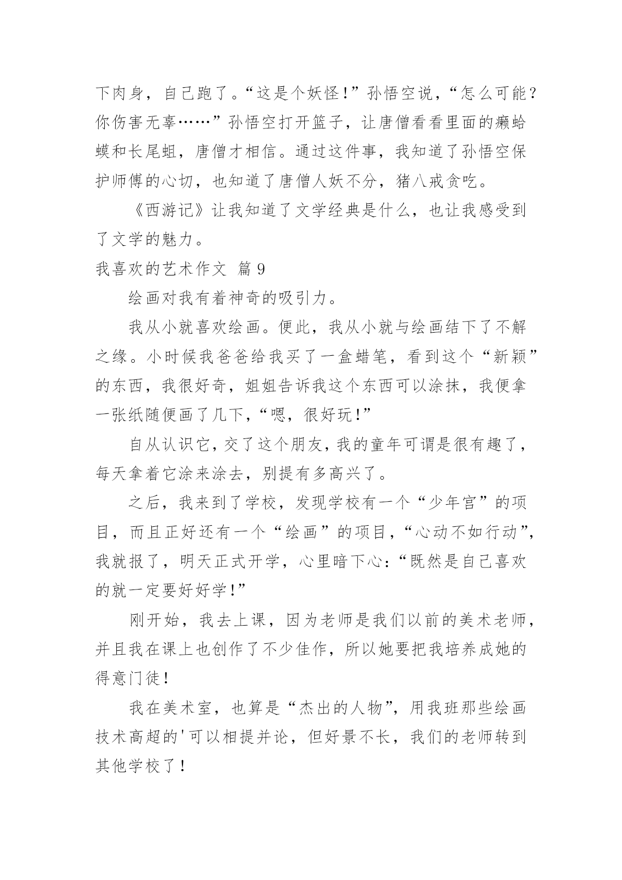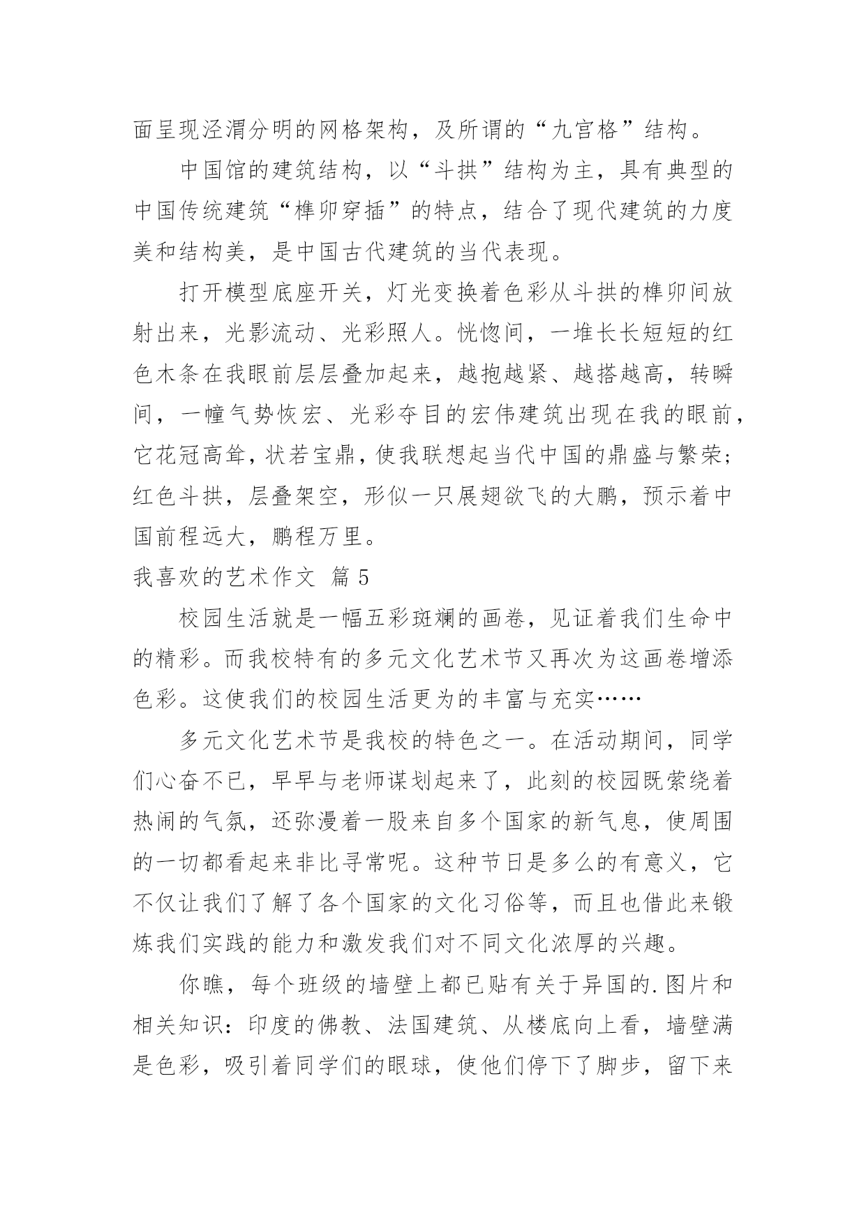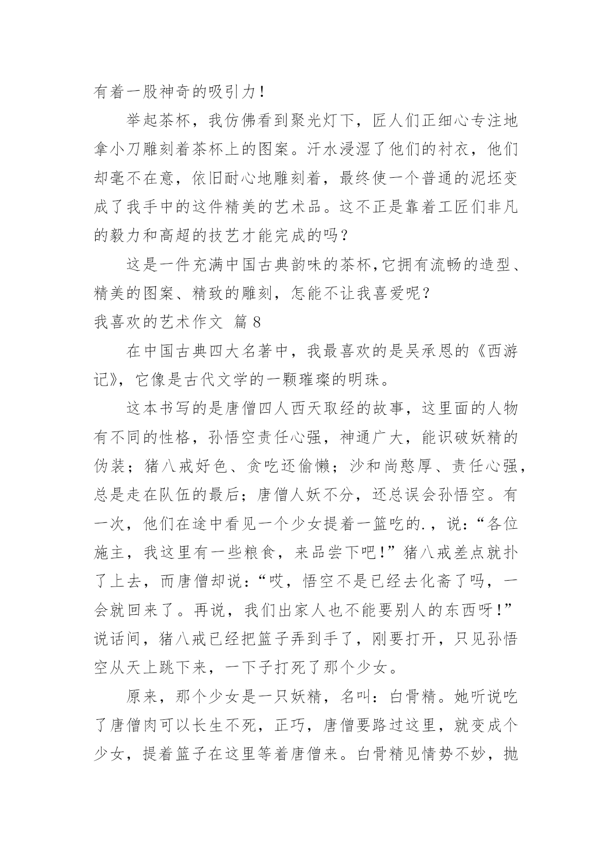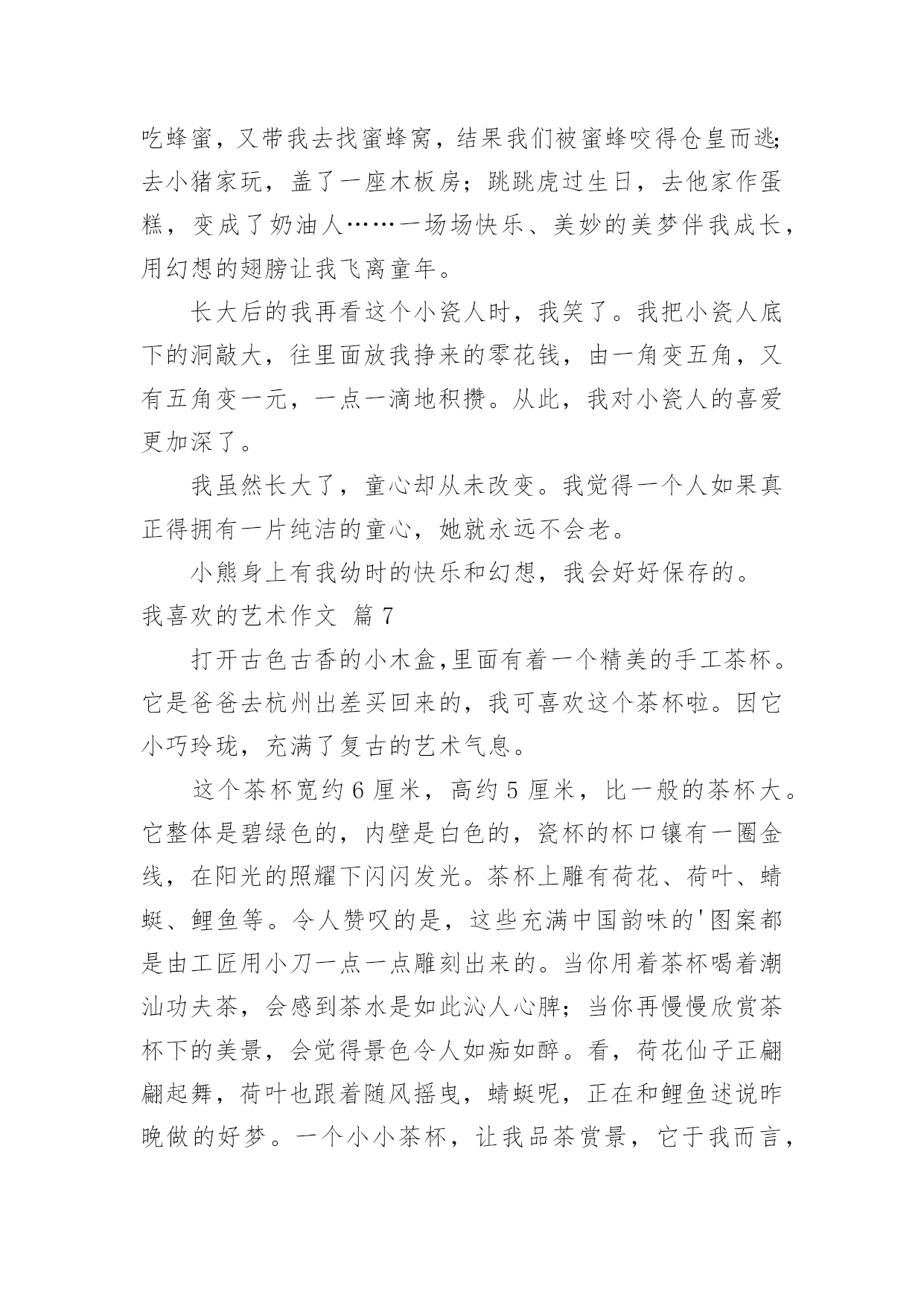 我喜欢的艺术作文[精选]我喜欢的艺术作文9篇在平平淡淡的学习、工作、生活中,大家都尝试过写作文吧,通过作文可以把我们那些零零散散的思想,聚集在一块。一篇什么样的作文才能称之为优秀作文呢?下面是小编为大家整理的我喜欢的艺术作文10篇,仅供参考,希望能够帮助到大家。我喜欢的艺术作文篇1我最喜欢的艺术品是家里的兵马俑。兵马俑从整体上看几乎都是淡黑色,它的体积很小,是呈站立的姿势。头上扎得是盘头,脖子下边有一个简陋的围巾,他的衣着是由一片片铁片组成的战袍,看上去英武非凡,这不禁让我联想到了战士们在沙场上浴血博杀的场景。他的手自然地垂放在身体两侧,像是一个整装待发的士兵。当我看见兵马俑的面部表情时,我就认为他一定是一个出色的的士兵,因为他的.眼神是充满杀气和忧愁,让人难以捉摸。有时他的眼神让人觉得他好像对敌人有着很深的仇恨,有时让人觉得他好像为国家大事而感到劳累;有时让人觉得他好像是在为打了胜仗而高兴。从这点就可以看出工匠的技艺之高超。他的眉毛和皱纹更衬托出他的潇洒,在他那高挺的鼻子下,还有着一撮八字胡,可见他为国家大事而费尽了心思。他的嘴角微微向上翘起,可以看出他正为打了胜仗而高兴。他还给我的学习提供了巨大的的帮助。一次我正在做作业,被一道题给难住了,就在我准备放弃时,抬头一望,正好看见了兵马俑,我想:他为了国家大事而费尽了心思,要面临巨大的难题,而我这点困难都不能完成的话,怎么能做像他那样的大英雄呢?想到这里,我又有了信心,终于做出了那道题。兵马俑的英勇气概和他那极富个性的眼神,让每一个看过他的人记忆犹新,我虽然没有看到过真正的兵马俑,但它的雕像,就已经给我留下了深刻的印象。我喜欢的艺术作文篇2我的书桌上有好几样艺术品,有淡雅的白瓷瓶;有古色古香的折扇;有逼真迷你的埃菲尔铁塔……不过,我最喜欢的是那一套梅兰竹菊剪纸的书签。书签的造型很精致,特别是梅花和兰花。梅花的花瓣、花蕊和石头刻得很细致:看,那一片片正在绽开的.鲜艳的花瓣,即使在冬天,它们也很鲜艳。还有比花瓣更细致的花蕊,精巧得令人惊叹。石头的纹路为这幅剪纸画龙点睛,刻画的线条让石头看起来更有立体感。兰花是另一种造型,兰花的花和叶都是又细又长,再加上都是红纸,可能很难分辨花和叶,但这幅剪纸线条分明,很有立体感。除了它们的造型巧夺天工,我喜欢它们还有另外的理由,那就是它们所表现的意境很好。大家都知道,梅兰竹菊是四君子。第一个是梅花,梅花和其它的花不同,其它花都是在秋天就凋谢,而梅花却能在条件恶劣的冬天生长,多么顽强,多么坚贞不屈!北宋王安石有首诗描写梅花:“墙角数枝梅,凌寒独自开。”就是对梅花顽强精神的至高奖赏!第二个是兰花,兰花淡雅朴素,虽没有艳丽的颜色,但人们一直把它视为高雅纯洁的象征。第三个是竹,竹子对生长环境毫不挑剔,而且生长能力也很强,有诗曰:“咬定青山不放松,立根原在破岩中。千磨万击还坚劲,任尔东西南北风。”竹子是一种高风亮节,虚心不俗的植物,也一直是人们咏诵的对象。第四个是菊花,菊花是一种聪明的植物,因为秋天时,很多花和植物都枯萎了,但菊花就是开在秋天的,可见它傲骨不凡,是百花凋零季节中的一枝独秀。每当我拿起书来看到这些书签时,上面这些花的美好品质一直在激励着我。正是因为这些书签,我才更加有了读书的动力。这就是我最喜欢的艺术品——梅、兰、竹、菊。它们深深地烙印在我的脑海中,让我在生活与学习中顽强、坚定、奋发向上!我喜欢的艺术作文篇3在我家里,有几件漂亮的工艺品,我最喜欢的就是那幅八骏图。八骏图是长方形,在左上角还写着“马到成功”这四个字,背景是几座巍峨挺拔的高山排在一起,就像一个“方阵”,要是谁在里面,可能会出不来。奔跑在前面的是一匹土黄色的马,它浑身土黄,仰天长嘶,土黄色的毛高高的'竖在空中,全身结实得像拳击场上的运动员,一块一块凸出来,显得十分有力,土黄色的马的两只前蹄翘起来,好威风啊!紧挨着土黄色的马是一匹枣红马,它全身火红,肌肉也像土黄色的马一样结实得像拳击场上的运动员,一块一块凸出来。紧挨着枣红马是一匹白马,从头到尾一片洁白,连一根杂毛也没有,像一团白云轻轻飘来,显得那么洒脱,看着看着,我心里痒痒的,真想骑上白马奔驰一番,那才叫痛快!还有另外的五匹马各有各的颜色,各具形态,每一匹马都那么神气。每当我遇到困难或挫折时,一看到八骏图,就会充满力量勇敢面对。我喜欢的艺术作文篇4我有一个“中国馆”3D立体模型,放在卧室最显眼的地方,它是妈妈送给我的一件礼物,是我最喜欢的一件艺术品。“中国馆”相信大家都不陌生吧?它是上海世博会的中国国家馆。中国馆融合了东方传统建筑艺术和现代建筑艺术之美,是对中国文化的最好表达。我的“中国馆”模型虽然很小,做工却十分精巧,像缩小版的中国馆。模型总长24cm、宽20cm、高13cm。中国馆以红色为主要元素,体现了中国自古以来以红色为主