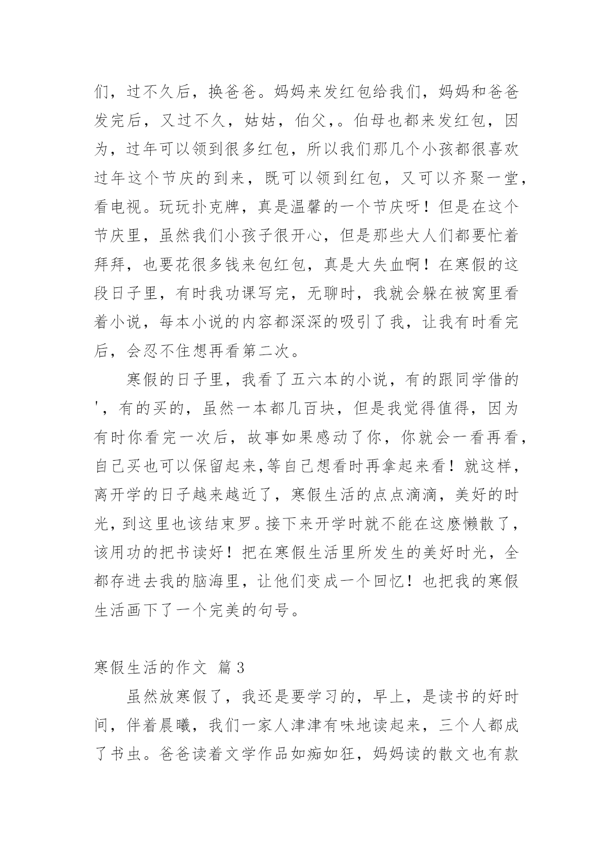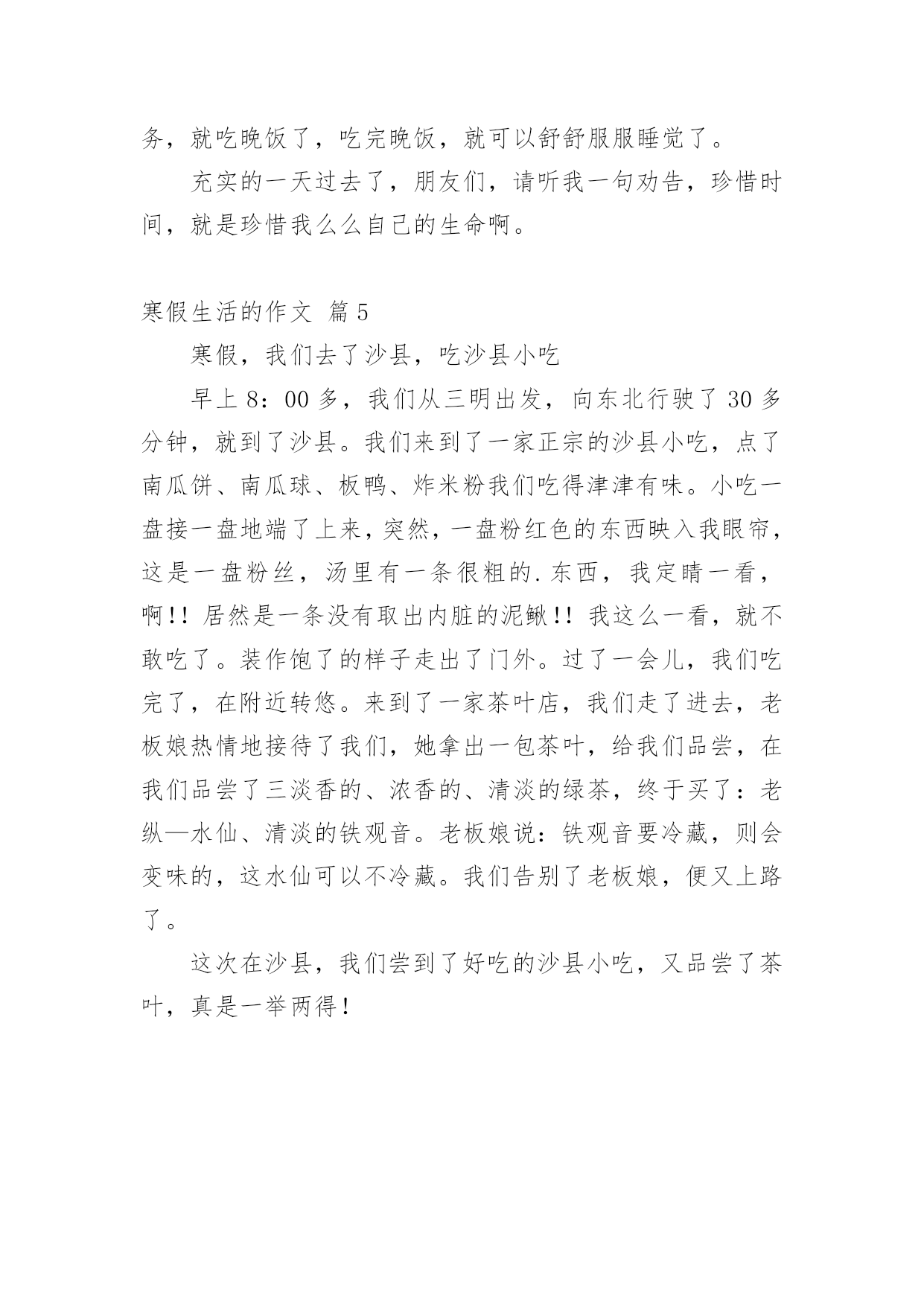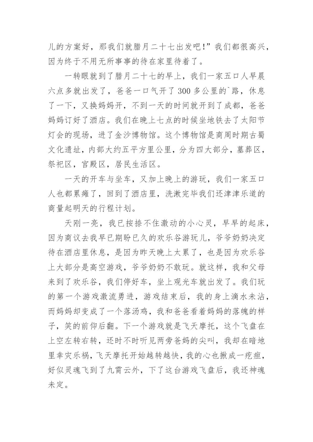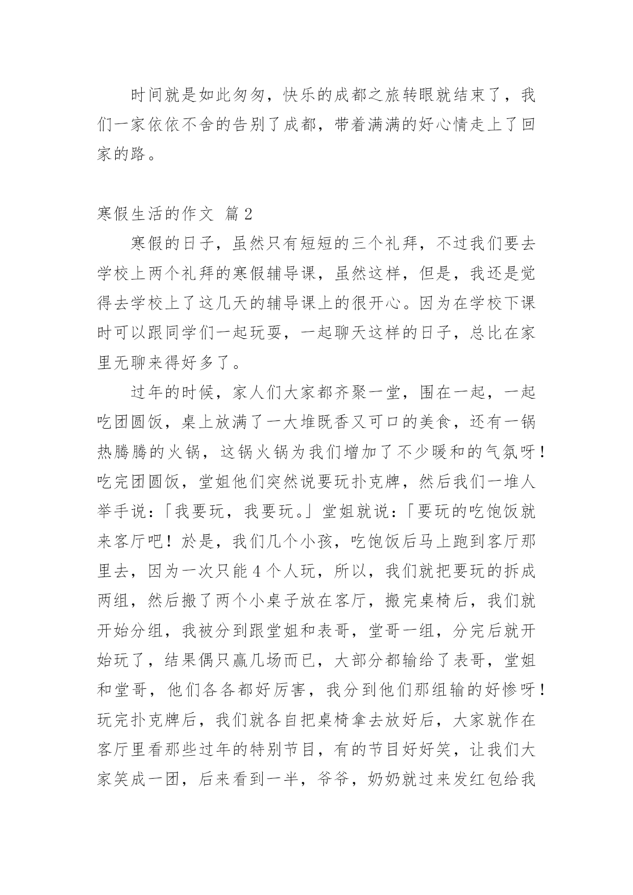 寒假生活的作文关于寒假生活的作文汇总5篇在日常学习、工作和生活中,大家都写过作文吧,借助作文可以宣泄心中的情感,调节自己的心情。那么一般作文是怎么写的呢?以下是小编帮大家整理的寒假生活的作文5篇,欢迎阅读与收藏。寒假生活的作文篇1每个人的寒假都是多姿多彩的,例如:出去走亲访友,去室外滑雪,堆雪人,打雪仗,而我不一样,我要去成都旅游啦!腊月二十五,我已写好寒假作业,爸爸妈妈也放假在家中无所事事,我望着你,你望着我,都显得很无聊,此时大家异口同声的说:“今年我们去外地游玩过新年吧?”这样的决定爽快的定了下来。我接着又问:“那我们应该去哪里呢?”“我们去哈尔滨吧!”爸爸说。“不行不行。”我和妈妈连忙摇着头说。爸爸又问:“为什么呀?你们母女不是很想去吗?”我就说:“那里太冷了,一出门就把人冻成冰棍了。”妈妈又说:“要不然去北京吧,可以去天安门游玩。”我和爸爸又急忙摇头否定了妈妈的决定,我怕妈妈问为什么就急忙道:“因为北京雾霾太大,空气不新鲜。不然我们去成都吧,那里的阳光明媚,还是个著名的旅游胜地,去那里一定最佳。”话语声刚落,爸爸妈妈就连连拍手说:“还是女儿的方案好,那我们就腊月二十七出发吧!”我们都很高兴,因为终于不用无所事事的待在家里待着了。一转眼就到了腊月二十七的早上,我们一家五口人早晨六点多就出发了,爸爸一口气开了300多公里的`路,休息了一下,又换妈妈开,不到一天的时间就开到了成都,爸爸妈妈订好了酒店。我们在晚上七点的时候坐地铁去了太阳节灯会的现场,进了金沙博物馆。这个博物馆是商周时期古蜀文化遗址,内部大约五平方里公里,分为四大部分,墓葬区,祭祀区,宫殿区,居民生活区。一天的开车与坐车,又加上晚上的游玩,我们一家五口人也都累瘫了,回到了酒店里,洗漱完毕我们还津津乐道的商量起明天的行程计划。天刚一亮,我已按捺不住激动的小心灵,早早的起床,因为商议去我早已期盼已久的欢乐谷游玩儿,爷爷奶奶决定待在酒店里休息,是因为昨天晚上太累了,也是因为欢乐谷上大部分是高空游戏,爷爷奶奶不敢玩。就这样,我和父母来到了欢乐谷,我们停好车,坐上观光车就出发了。我们玩的第一个游戏激流勇进,游戏结束后,我的身上滴水未沾,而妈妈却变成了一个落汤鸡,我和爸爸看着妈妈的落魄的样子,笑的前仰后翻。下一个游戏就是飞天摩托,这个飞盘在上空左转右转,还时不时听见两旁爸妈的尖叫,我却在暗地里幸灾乐祸,飞天摩托开始越转越快,我的心也揪成一疙疸,好似灵魂飞到了九霄云外,下了这台游戏飞盘后,我还神魂未定。时间就是如此匆匆,快乐的成都之旅转眼就结束了,我们一家依依不舍的告别了成都,带着满满的好心情走上了回家的路。寒假生活的作文篇2寒假的日子,虽然只有短短的三个礼拜,不过我们要去学校上两个礼拜的寒假辅导课,虽然这样,但是,我还是觉得去学校上了这几天的辅导课上的很开心。因为在学校下课时可以跟同学们一起玩耍,一起聊天这样的日子,总比在家里无聊来得好多了。过年的时候,家人们大家都齐聚一堂,围在一起,一起吃团圆饭,桌上放满了一大堆既香又可口的美食,还有一锅热腾腾的火锅,这锅火锅为我们增加了不少暖和的气氛呀!吃完团圆饭,堂姐他们突然说要玩扑克牌,然后我们一堆人举手说:「我要玩,我要玩。」堂姐就说:「要玩的吃饱饭就来客厅吧!於是,我们几个小孩,吃饱饭后马上跑到客厅那里去,因为一次只能4个人玩,所以,我们就把要玩的拆成两组,然后搬了两个小桌子放在客厅,搬完桌椅后,我们就开始分组,我被分到跟堂姐和表哥,堂哥一组,分完后就开始玩了,结果偶只赢几场而已,大部分都输给了表哥,堂姐和堂哥,他们各各都好厉害,我分到他们那组输的好惨呀!玩完扑克牌后,我们就各自把桌椅拿去放好后,大家就作在客厅里看那些过年的特别节目,有的节目好好笑,让我们大家笑成一团,后来看到一半,爷爷,奶奶就过来发红包给我们,过不久后,换爸爸。妈妈来发红包给我们,妈妈和爸爸发完后,又过不久,姑姑,伯父,。伯母也都来发红包,因为,过年可以领到很多红包,所以我们那几个小孩都很喜欢过年这个节庆的到来,既可以领到红包,又可以齐聚一堂,看电视。玩玩扑克牌,真是温馨的一个节庆呀!但是在这个节庆里,虽然我们小孩子很开心,但是那些大人们都要忙着拜拜,也要花很多钱来包红包,真是大失血啊!在寒假的这段日子里,有时我功课写完,无聊时,我就会躲在被窝里看着小说,每本小说的内容都深深的吸引了我,让我有时看完后,会忍不住想再看第二次。寒假的日子里,我看了五六本的小说,有的跟同学借的',有的买的,虽然一本都几百块,但是我觉得值得,因为有时你看完一次后,故事如果感动了你,你就会一看再看,自己买也可以保留起来,等自己想看时再拿起来看!就这样,离开学的日子越来越近了,寒假生活的点点滴滴,美好的时光,到这里也该结束罗。接下来开学时就不能在这麽懒散了,该用功的把书读好!把在寒