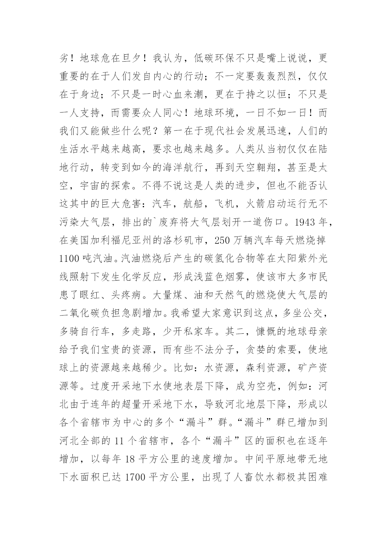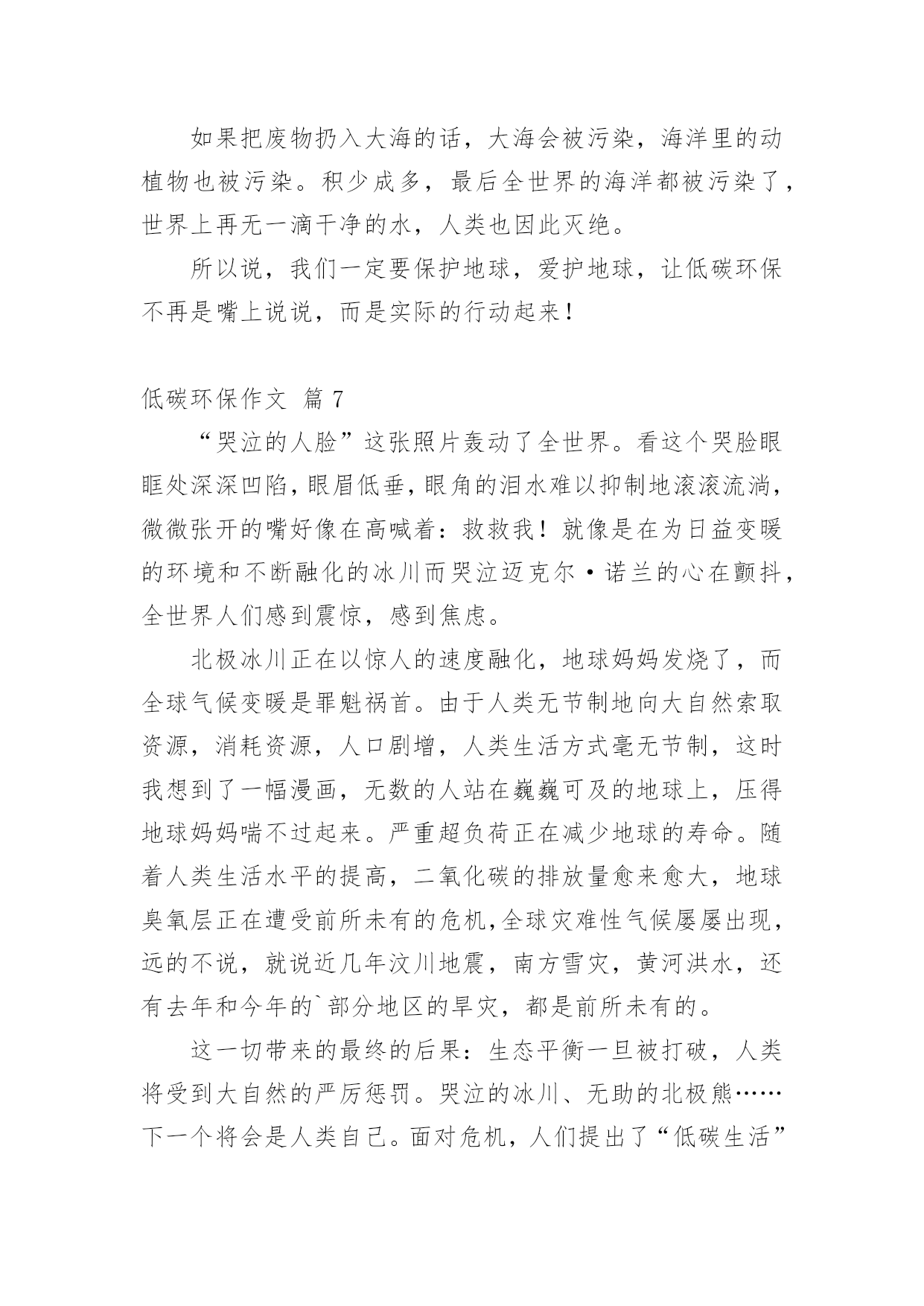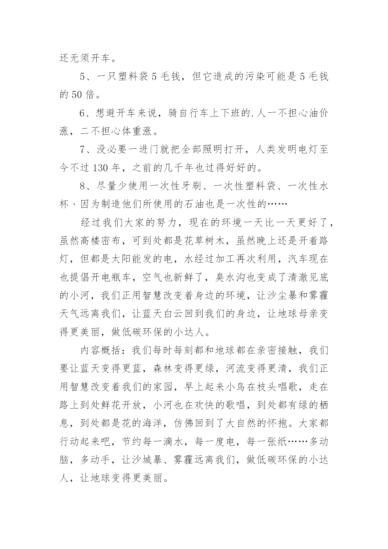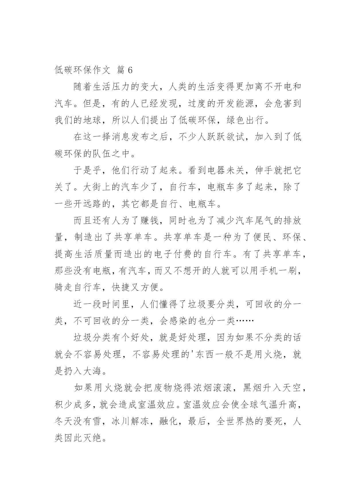 低碳环保作文【实用】低碳环保作文八篇在平凡的学习、工作、生活中,许多人都有过写作文的经历,对作文都不陌生吧,作文是经过人的思想考虑和语言组织,通过文字来表达一个主题意义的记叙方法。为了让您在写作文时更加简单方便,以下是小编为大家整理的低碳环保作文8篇,仅供参考,希望能够帮助到大家。低碳环保作文篇1星期天,爸爸决定我们一家人去油玩烈士公园,我对爸爸说:“为了低碳环保我们不开车可以吗?”爸爸想了想,高兴的说“可以呀!”我们就骑着自行车出发了,妈妈骑一辆,爸爸骑一辆,我坐在爸爸的.车后面。到了公园里,我看见很美很美的风景,有绿油油的柳树倒垂在河边,池塘里有很多的小鱼儿,他们在水中自由自在的游涞游去。我看见整齐的路边有人丢垃圾,我连忙捡起来丢到垃圾桶里。爸爸见到后很高兴的表扬了我。我玩了森林卡丁车,旋转飞椅,攀岩。黄昏了,我们要回家了,我们感觉很累,但又很高兴,因为我们体验了一天的低碳生活,所以就一点都不觉得累了。低碳环保作文篇2如今,人人都在讲环保低碳,但世界环境变得越来越恶劣!地球危在旦夕!我认为,低碳环保不只是嘴上说说,更重要的在于人们发自内心的行动;不一定要轰轰烈烈,仅仅在于身边;不只是一时心血来潮,更在于持之以恒;不只是一人支持,而需要众人同心!地球环境,一日不如一日!而我们又能做些什么呢?第一在于现代社会发展迅速,人们的生活水平越来越高,要求也越来越多。人类从当初仅仅在陆地行动,转变到如今的海洋航行,再到天空翱翔,甚至是太空,宇宙的探索。不得不说这是人类的进步,但也不能否认这其中的巨大危害:汽车,航船,飞机,火箭启动运行无不污染大气层,排出的`废弃将大气层划开一道伤口。1943年,在美国加利福尼亚州的洛杉矶市,250万辆汽车每天燃烧掉1100吨汽油。汽油燃烧后产生的碳氢化合物等在太阳紫外光线照射下发生化学反应,形成浅蓝色烟雾,使该市大多市民患了眼红、头疼病。大量煤、油和天然气的燃烧使大气层的二氧化碳负担急剧增加。我希望大家意识到这点,多坐公交,多骑自行车,多走路,少开私家车。其二,慷慨的地球母亲给予我们宝贵的资源,而有些不法分子,贪婪的索要,使地球上的资源越来越稀少。比如:水资源,森利资源,矿产资源等。过度开采地下水使地表层下降,成为空壳,例如:河北由于连年的超量开采地下水,导致河北地层下降,形成以各个省辖市为中心的多个“漏斗”群。“漏斗”群已增加到河北全部的11个省辖市,各个“漏斗”区的面积也在逐年增加,以每年18平方公里的速度增加。中间平原地带无地下水面积已达1700平方公里,出现了人畜饮水都极其困难的新“旱庄”。据调查说明:到现在为止地球是人类唯一可以生存的地方,到目前还没有发现跟地球相似的行星。所以,那些有:“地球没啦,我还可以移居到别的星球上去。”想法的人,承认你的无知吧!节约资源吧!爱惜地球吧!最后,我想说:对地球的保护不在于某个国家,更不在于某个人。地球是大家的,现在地球生病了,需要大家一同照顾,只有这样,地球才会更加充满生机,人类才会更加充满活力,生活才会变得更加美好!低碳环保作文篇3随着社会的发展,人们的生活也发生了日新月异的变化。可是在我们享受生活的时候,也不要忘记保护我们的家园。做一个低碳环保的小卫士。低碳,顾名思义,在保证生活质量的同时,尽可能的减少二氧化碳的排放量,减少对大气层的污染。众所周知,废气的排放加剧了地球的温室效应:气候反常、原始病毒死灰复燃、海平面上升、土地干旱、沙漠化面积增大等等,威胁着我们的地球和生活。因此低碳生活在我们享受生活的同时注意低污染、低消耗、低排放和多节约、不浪费。作为学生我们可从回收、节电、节气这三大方面来改变生活细节。在日常生活中注意节约能源。例如:淘米水用来洗菜,洗菜水用来洗碗和冲马桶,洗衣服水可以用来拖地,用茶叶水和渣做肥料来浇花、草。如果驱虫的话用烟丝泡一泡,浇在有蚜虫的花盆,真比杀虫剂还灵!这样充分利用“水”这个宝贵的资源,因为世界上许多地方在闹“水荒”。垃圾的分类也很重要,分为可回收垃圾、不可回收垃圾和废电池。例如:电池用完之后,千万不能随手乱扔掉,电池中的有毒物质汞会渗透到土壤和水源中,再通过农作物进入人体,损伤人的肾脏。我们应把废电池收集到一起,上交给环保部门。少买不必要的衣服,旧衣服可以赠送他人或改做它用。因为在生产加工和运输的过程中要消耗大量的资源,同时产生废气、废水等污染物,在保证生活需要的前提下,每人每年少买一件不必要的衣服,可节能约2.5千克标准煤,相应减少二氧化碳6.4千克。如果全国每年有2500万人做到这一点,就可以节能约6.25万吨标准煤,减少二氧化碳16万吨。外出尽量乘坐公共交通工具,减少废气的排放。除了要循环利用旧物,使它们变“废”为“宝”之外,还有一个重要的就是节电和节气。广泛使用节能灯具,及时关掉灯(气)的开关。夏季尽可能用