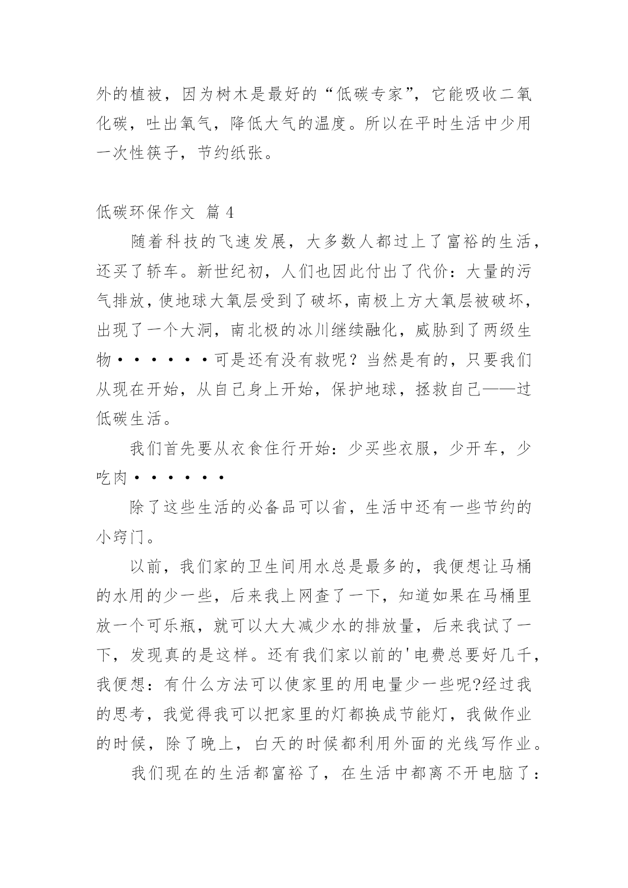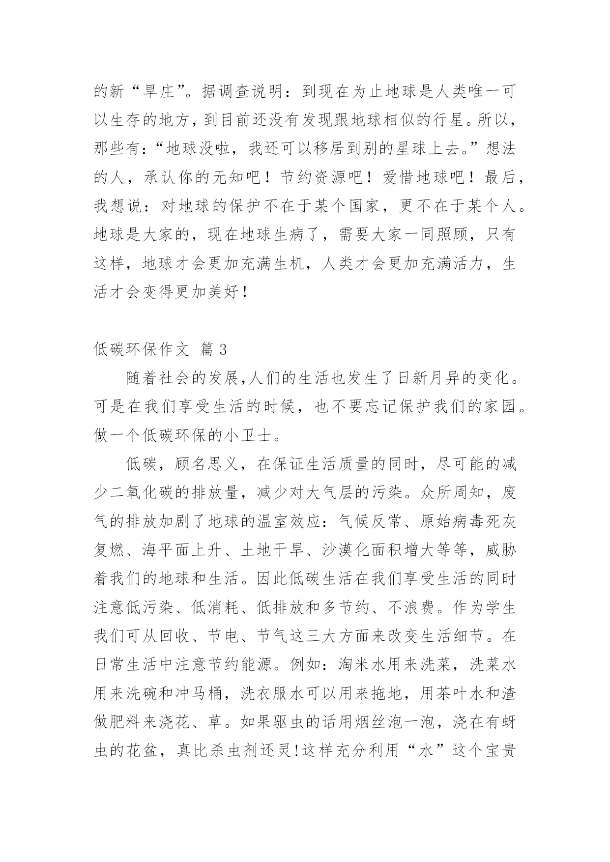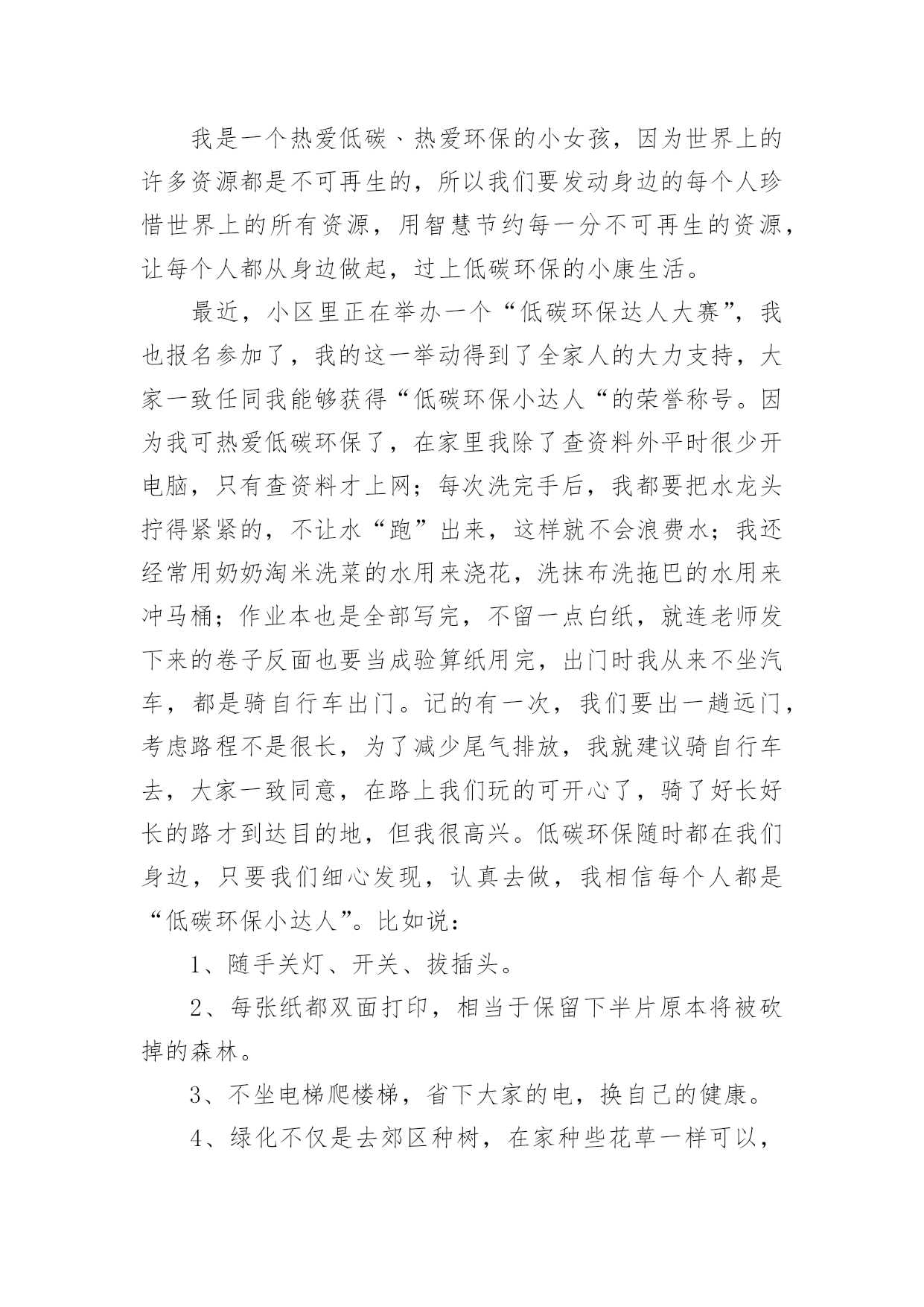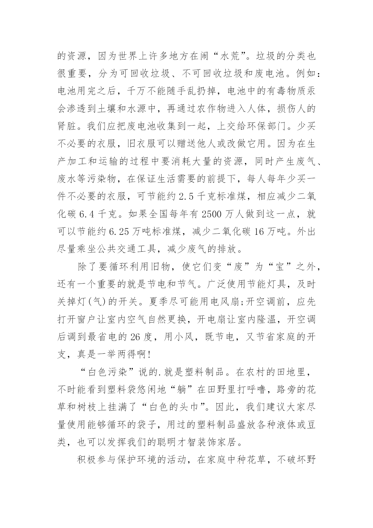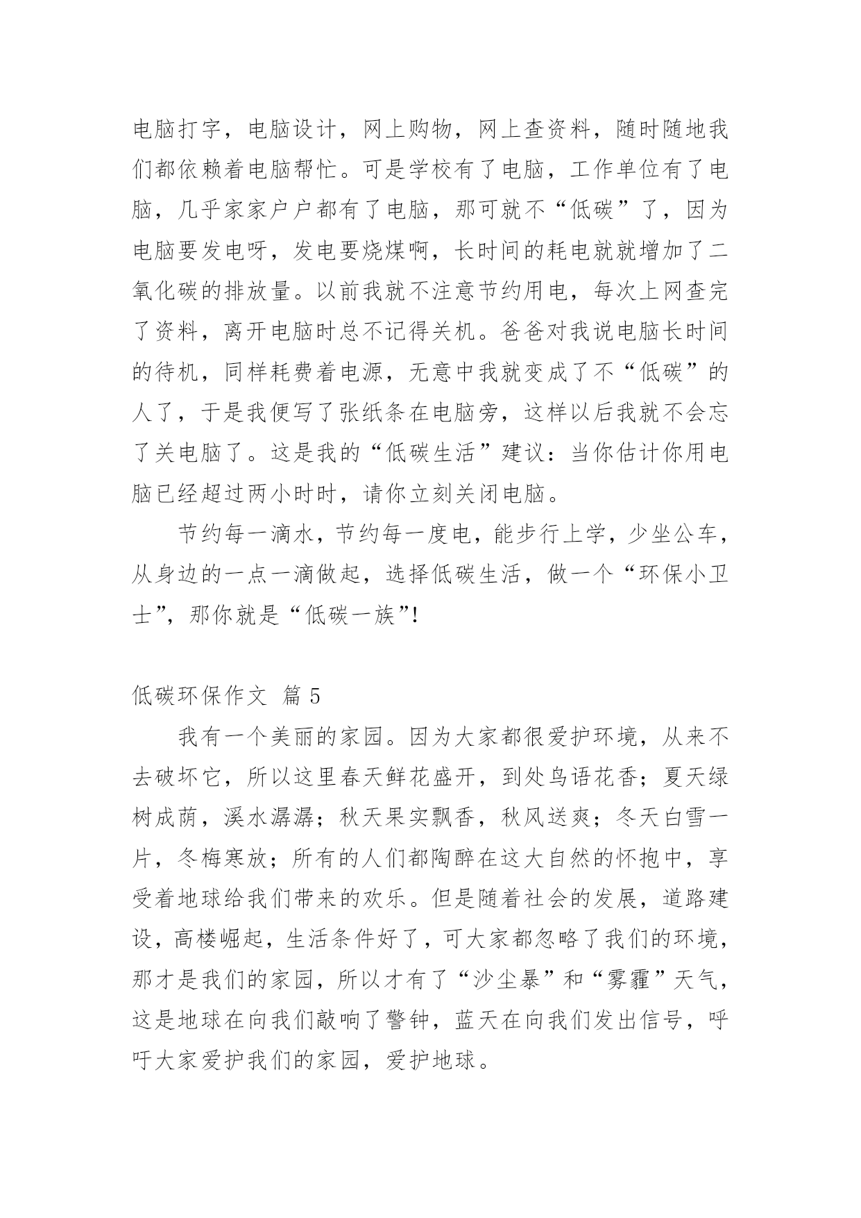低碳环保作文【实用】低碳环保作文八篇在平凡的学习、工作、生活中,许多人都有过写作文的经历,对作文都不陌生吧,作文是经过人的思想考虑和语言组织,通过文字来表达一个主题意义的记叙方法。为了让您在写作文时更加简单方便,以下是小编为大家整理的低碳环保作文8篇,仅供参考,希望能够帮助到大家。低碳环保作文篇1星期天,爸爸决定我们一家人去油玩烈士公园,我对爸爸说:“为了低碳环保我们不开车可以吗?”爸爸想了想,高兴的说“可以呀!”我们就骑着自行车出发了,妈妈骑一辆,爸爸骑一辆,我坐在爸爸的.车后面。到了公园里,我看见很美很美的风景,有绿油油的柳树倒垂在河边,池塘里有很多的小鱼儿,他们在水中自由自在的游涞游去。我看见整齐的路边有人丢垃圾,我连忙捡起来丢到垃圾桶里。爸爸见到后很高兴的表扬了我。我玩了森林卡丁车,旋转飞椅,攀岩。黄昏了,我们要回家了,我们感觉很累,但又很高兴,因为我们体验了一天的低碳生活,所以就一点都不觉得累了。低碳环保作文篇2如今,人人都在讲环保低碳,但世界环境变得越来越恶劣!地球危在旦夕!我认为,低碳环保不只是嘴上说说,更重要的在于人们发自内心的行动;不一定要轰轰烈烈,仅仅在于身边;不只是一时心血来潮,更在于持之以恒;不只是一人支持,而需要众人同心!地球环境,一日不如一日!而我们又能做些什么呢?第一在于现代社会发展迅速,人们的生活水平越来越高,要求也越来越多。人类从当初仅仅在陆地行动,转变到如今的海洋航行,再到天空翱翔,甚至是太空,宇宙的探索。不得不说这是人类的进步,但也不能否认这其中的巨大危害:汽车,航船,飞机,火箭启动运行无不污染大气层,排出的`废弃将大气层划开一道伤口。1943年,在美国加利福尼亚州的洛杉矶市,250万辆汽车每天燃烧掉1100吨汽油。汽油燃烧后产生的碳氢化合物等在太阳紫外光线照射下发生化学反应,形成浅蓝色烟雾,使该市大多市民患了眼红、头疼病。大量煤、油和天然气的燃烧使大气层的二氧化碳负担急剧增加。我希望大家意识到这点,多坐公交,多骑自行车,多走路,少开私家车。其二,慷慨的地球母亲给予我们宝贵的资源,而有些不法分子,贪婪的索要,使地球上的资源越来越稀少。比如:水资源,森利资源,矿产资源等。过度开采地下水使地表层下降,成为空壳,例如:河北由于连年的超量开采地下水,导致河北地层下降,形成以各个省辖市为中心的多个“漏斗”群。“漏斗”群已增加到河北全部的11个省辖市,各个“漏斗”区的面积也在逐年增加,以每年18平方公里的速度增加。中间平原地带无地下水面积已达1700平方公里,出现了人畜饮水都极其困难的新“旱庄”。据调查说明:到现在为止地球是人类唯一可以生存的地方,到目前还没有发现跟地球相似的行星。所以,那些有:“地球没啦,我还可以移居到别的星球上去。”想法的人,承认你的无知吧!节约资源吧!爱惜地球吧!最后,我想说:对地球的保护不在于某个国家,更不在于某个人。地球是大家的,现在地球生病了,需要大家一同照顾,只有这样,地球才会更加充满生机,人类才会更加充满活力,生活才会变得更加美好!低碳环保作文篇3随着社会的发展,人们的生活也发生了日新月异的变化。可是在我们享受生活的时候,也不要忘记保护我们的家园。做一个低碳环保的小卫士。低碳,顾名思义,在保证生活质量的同时,尽可能的减少二氧化碳的排放量,减少对大气层的污染。众所周知,废气的排放加剧了地球的温室效应:气候反常、原始病毒死灰复燃、海平面上升、土地干旱、沙漠化面积增大等等,威胁着我们的地球和生活。因此低碳生活在我们享受生活的同时注意低污染、低消耗、低排放和多节约、不浪费。作为学生我们可从回收、节电、节气这三大方面来改变生活细节。在日常生活中注意节约能源。例如:淘米水用来洗菜,洗菜水用来洗碗和冲马桶,洗衣服水可以用来拖地,用茶叶水和渣做肥料来浇花、草。如果驱虫的话用烟丝泡一泡,浇在有蚜虫的花盆,真比杀虫剂还灵!这样充分利用“水”这个宝贵的资源,因为世界上许多地方在闹“水荒”。垃圾的分类也很重要,分为可回收垃圾、不可回收垃圾和废电池。例如:电池用完之后,千万不能随手乱扔掉,电池中的有毒物质汞会渗透到土壤和水源中,再通过农作物进入人体,损伤人的肾脏。我们应把废电池收集到一起,上交给环保部门。少买不必要的衣服,旧衣服可以赠送他人或改做它用。因为在生产加工和运输的过程中要消耗大量的资源,同时产生废气、废水等污染物,在保证生活需要的前提下,每人每年少买一件不必要的衣服,可节能约2.5千克标准煤,相应减少二氧化碳6.4千克。如果全国每年有2500万人做到这一点,就可以节能约6.25万吨标准煤,减少二氧化碳16万吨。外出尽量乘坐公共交通工具,减少废气的排放。除了要循环利用旧物,使它们变“废”为“宝”之外,还有一个重要的就是节电和节气。广泛使用节能灯具,及时关掉灯(气)的开关。夏季尽可能用