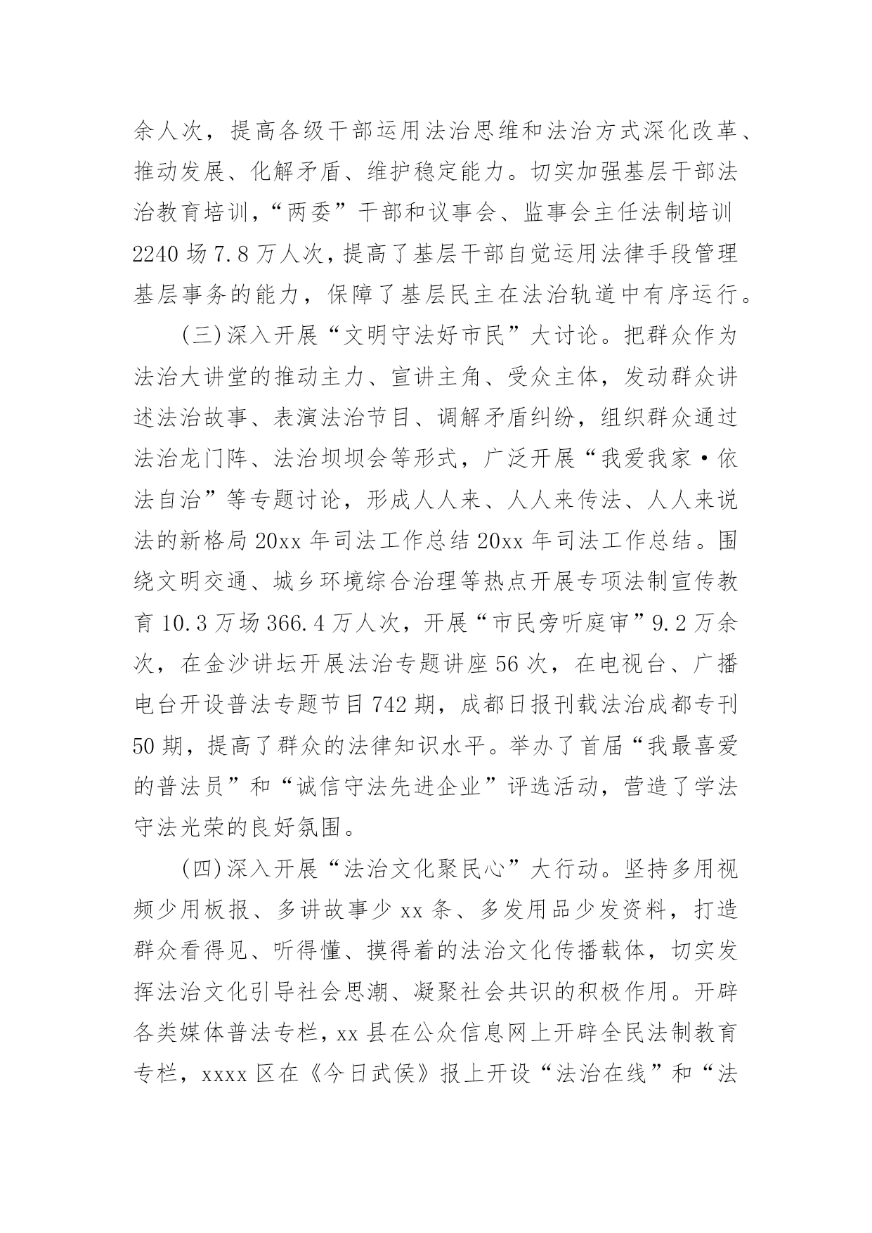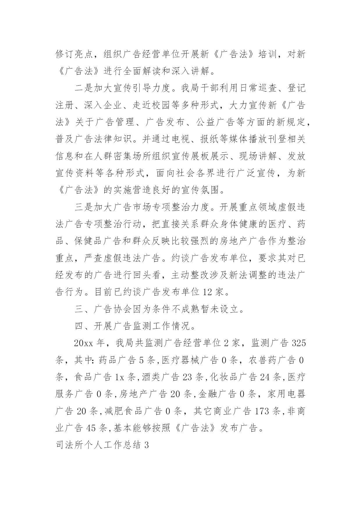 司法所个人工作总结司法所个人工作总结总结是在一段时间内对学习和工作生活等表现加以总结和概括的一种书面材料,它是增长才干的一种好办法,让我们抽出时间写写总结吧。我们该怎么写总结呢?以下是小编收集整理的司法所个人工作总结,仅供参考,大家一起来看看吧。司法所个人工作总结1xx年,市司法局按照市委、市政府总体部署,突出“法律服务促发展·法治文化润民心”工作主题,以打造中西部地区“法治环境、法律服务、法治文化最浓”的法治成都为奋斗目标,深入开展法治大讲堂,着力推进法律服务提档升级、矛盾纠纷预防化解和特殊人群管理服务,有力保障了“五大兴市战略”的有序有效推进,书记和司法部副部长两次批示给予肯定,人民日报、法制日报等多次报道成都的经验做法。一、法治大讲堂深入开展,法治城市创建走在全国前列以市委1号文件印发了市“六五”普法规划,发动全市人民参与制定了法治城市创建考核评估指标体系,法制宣传教育进入了法制化、常态化和刚性化的轨道20xx年司法工作总结工作总结。按照市委主要领导要求,结合全国法治城市创建,牵头开展了以“人人xx·共建和谐”为主题的法治大讲堂,在全市唱响了主动学法、时时尊法、自觉守法、事事用法的主旋律。今年以来,我市治安案件立案下降9%,全市信访量同比下降50%。据市民调中心调查显示,%的群众对当前法律服务的质量感到满意,90.9%的群众对权利受损时依法得到法律救助的状况表示满意,95%的群众在遇到矛盾纠纷时首选法律手段解决问题。(一)深入开展法治城市创建活动。广泛发布公开信征求群众意见,依托全市316个基层司法所,召开上千场征求意见座谈会,发放问卷21万余份,全面升级我市创建法治城市测评体系。在副省级城市中率先全面开展法治县(市)区创建考核评估,邀请人大代表、政协委员、市民代表全程参与考核,一系列惠民措施在法治实践中产生,使群众享受到更加规范全面的公共法律服务。以“民创、民建、民享”为特征的“民本式”法治城市创建模式,得到司法部的充分肯定,xxxx区新鸿社区被评为全国民主法治示范村,《全国普法依法治理通讯》刊载两期反映成都法治城市创建的经验材料。(二)深入开展“依法办事好干部”大教育。建立了各级干部学法用法守法的刚性考核制度,把依法决策、依法管理、依法办事等作为领导干部年度述职和考核评价的重要内容,把法律知识考试合格作为行政执法人员持证上岗的必备依据。各级党委常委会、政府常务会会前法治专题学习940余场、2.4万余人次,举办干部依法行政专题研讨班600余场6.2万人次,公职人员学法守法培训3500余次、培训15万余人次,提高各级干部运用法治思维和法治方式深化改革、推动发展、化解矛盾、维护稳定能力。切实加强基层干部法治教育培训,“两委”干部和议事会、监事会主任法制培训2240场7.8万人次,提高了基层干部自觉运用法律手段管理基层事务的能力,保障了基层民主在法治轨道中有序运行。(三)深入开展“文明守法好市民”大讨论。把群众作为法治大讲堂的推动主力、宣讲主角、受众主体,发动群众讲述法治故事、表演法治节目、调解矛盾纠纷,组织群众通过法治龙门阵、法治坝坝会等形式,广泛开展“我爱我家·依法自治”等专题讨论,形成人人来、人人来传法、人人来说法的新格局20xx年司法工作总结20xx年司法工作总结。围绕文明交通、城乡环境综合治理等热点开展专项法制宣传教育10.3万场366.4万人次,开展“市民旁听庭审”9.2万余次,在金沙讲坛开展法治专题讲座56次,在电视台、广播电台开设普法专题节目742期,成都日报刊载法治成都专刊50期,提高了群众的法律知识水平。举办了首届“我最喜爱的普法员”和“诚信守法先进企业”评选活动,营造了学法守法光荣的良好氛围。(四)深入开展“法治文化聚民心”大行动。坚持多用视频少用板报、多讲故事少xx条、多发用品少发资料,打造群众看得见、听得懂、摸得着的法治文化传播载体,切实发挥法治文化引导社会思潮、凝聚社会共识的积极作用。开辟各类媒体普法专栏,xx县在公众信息网上开辟全民法制教育专栏,xxxx区在《今日武侯》报上开设“法治在线”和“法治大讲堂”专栏。组建群众性法治文艺团队20xx个,自编法治文艺节目xx个,举行群众性法治文艺活动6000多次,惠及106万余人次,举办了首届全市法治书画大赛,在寓教于乐中传播法治文化。投放法治公益广告9.6万个(次),发送法治短信(彩信)2.4万条229万人次,发放法治文化用品30万余个,建成法治文化广场、公园、走廊万平方米,使群众在潜移默化中感受法治文化熏陶。(五)深入开展“送法惠民进万家”大走访。把送法惠民列入市委市政府十大民生工程的内容,组织开展了“走基层进万家·法治成都惠民行”活动,形成了各级各部门上门xx、以案释法、包村援法的能动型普法模式。组建了1760多人的普法讲师团和送法小分队,培育兼