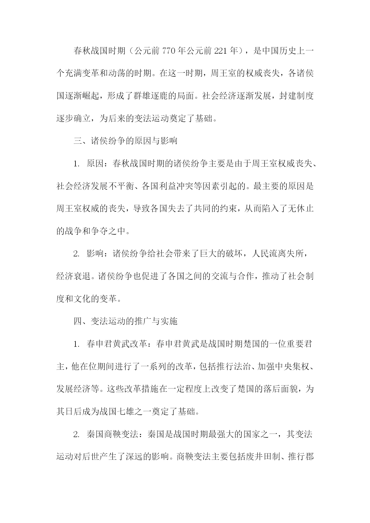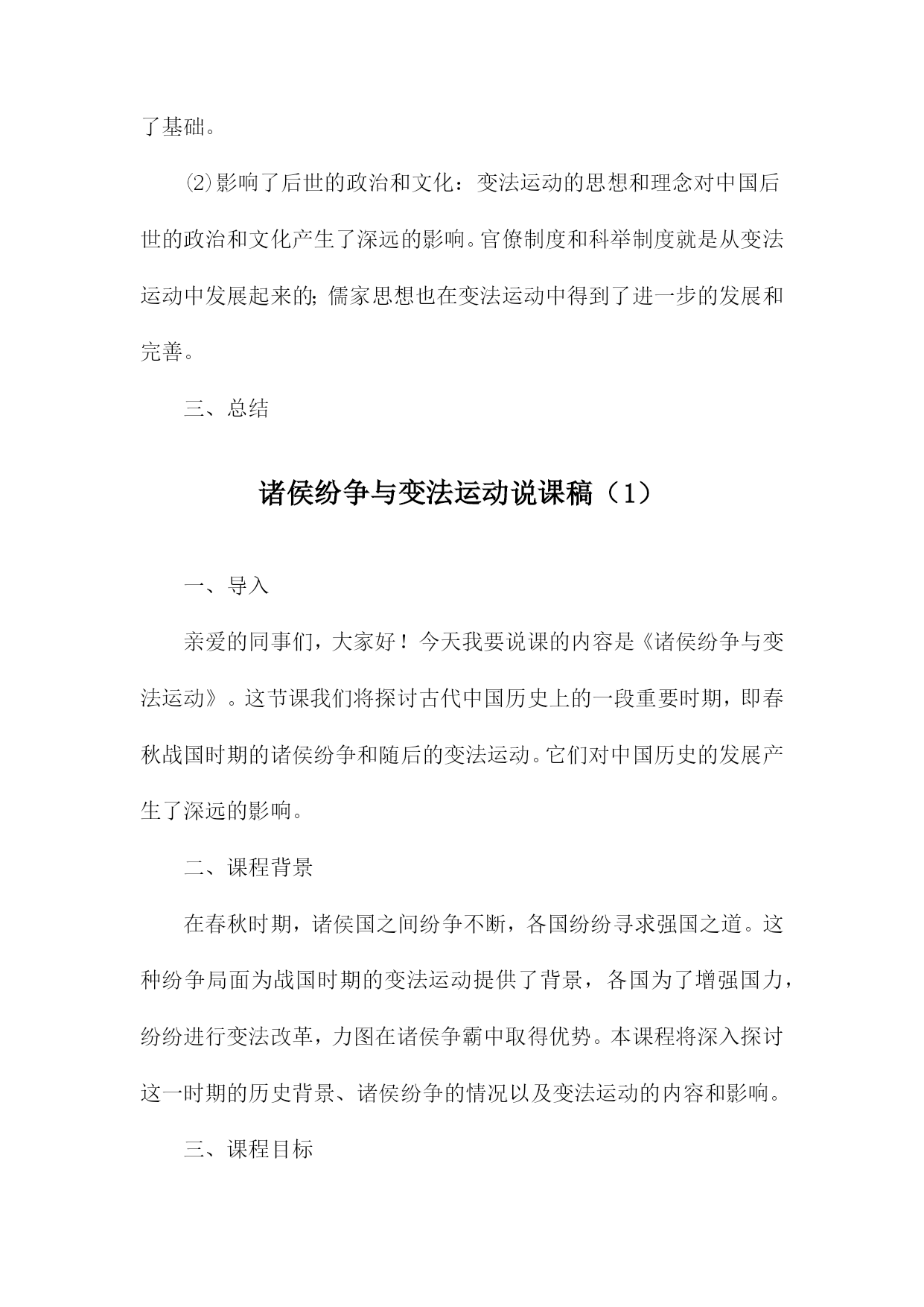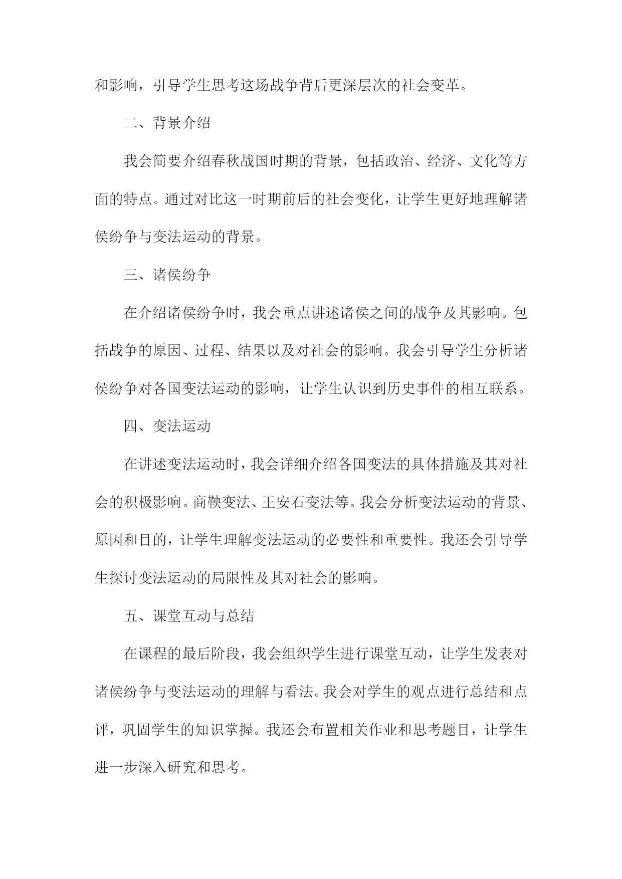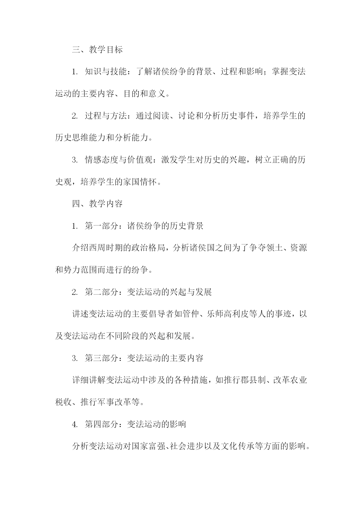 诸侯纷争与变法运动说课稿一、导入1.介绍历史背景:战国时期是中国历史上一个非常动荡的时期,诸侯国之间互相攻伐,战争不断。随着社会经济的发展,各诸侯国之间的差距也越来越大,这就为变法运动的发生提供了契机。2.引出主题:本节课我们将探讨“诸侯纷争与变法运动”这一主题。我们可以了解到这一时期的历史背景和政治形势,以及变法运动对中国古代历史的影响。二、正文1.诸侯国的兴起和发展(1)春秋时期的诸侯国:春秋时期,中国境内出现了很多小国家,这些国家之间互相攻伐,形成了一个分裂的局面。齐、楚、燕、韩、赵、魏、秦七个大国最为强大。(2)战国时期的诸侯国:战国时期,各国之间的战争更加激烈,最终形成了七个大国和一些小国家的局面。这些大国之间互相攻伐,争夺领土和资源。2.诸侯纷争的原因(1)地盘争夺:在战国时期,各个诸侯国之间的领土面积非常大,而且人口众多,因此争夺领土成为了他们的主要目标。为了扩张自己的领土,各个国家之间经常进行战争。(2)资源争夺:除了领土之外,各个诸侯国之间还争夺着各种资源,如粮食、铁器等。由于资源短缺,各个国家之间经常发生贸易战和资源争夺战。3.变法运动的起因和内容(1)变法运动的起因:随着社会经济的发展,各个诸侯国之间的差距越来越大,贫者愈贫。各个国家之间的战争也越来越多,人民的生活状况越来越差。这种局面促使各个国家开始思考如何改革自己,以适应时代的发展。(2)变法运动的内容:变法运动的内容主要包括三个方面:政治制度的改革、军事制度的改革和经济制度的改革。政治制度的改革主要是废除封建贵族的特权,实行官僚制度;军事制度的改革主要是建立强大的军队和强化防御能力;经济制度的改革主要是推行农业、手工业和商业的发展。4.变法运动的影响(1)推动了中国历史的进步:变法运动是中国古代历史上一次重要的变革,它推动了中国历史的进步和发展。通过变法运动,各个国家的政治、经济和军事都得到了很大的改善,为中国后来的发展奠定了基础。(2)影响了后世的政治和文化:变法运动的思想和理念对中国后世的政治和文化产生了深远的影响。官僚制度和科举制度就是从变法运动中发展起来的;儒家思想也在变法运动中得到了进一步的发展和完善。三、总结诸侯纷争与变法运动说课稿(1)一、导入亲爱的同事们,大家好!今天我要说课的内容是《诸侯纷争与变法运动》。这节课我们将探讨古代中国历史上的一段重要时期,即春秋战国时期的诸侯纷争和随后的变法运动。它们对中国历史的发展产生了深远的影响。二、课程背景在春秋时期,诸侯国之间纷争不断,各国纷纷寻求强国之道。这种纷争局面为战国时期的变法运动提供了背景,各国为了增强国力,纷纷进行变法改革,力图在诸侯争霸中取得优势。本课程将深入探讨这一时期的历史背景、诸侯纷争的情况以及变法运动的内容和影响。三、课程目标本课程的目标是让学生理解春秋战国时期的诸侯纷争和变法运动,掌握其历史背景、过程和影响。学生应该能够:1.理解春秋战国时期的历史背景;2.分析诸侯纷争的原因和影响;3.理解变法运动的内涵和实质;4.评价变法运动对中国历史发展的影响。四、教学内容1.诸侯纷争诸侯纷争是春秋时期的主要特点,在这一部分,我们将探讨诸侯纷争的原因,包括领土争夺、人民争夺以及各国承认他的首领地位的争夺等。我们还将分析诸侯纷争对中国历史发展的积极影响,如促进各国承认他的首领地位、推动各国发展等。2.变法运动进入战国时期后,各国为了增强国力,纷纷进行变法改革。在这一部分,我们将介绍变法运动的背景、内容和实质。我们将重点讲解商鞅变法的内容和影响,如废除井田制、推行县制、重视农业发展等。我们还将分析变法运动对中国历史发展的深远影响。五、教学方法本课程将采用讲述、讨论、案例分析等多种教学方法。我将通过讲述来介绍历史背景和知识点,同时鼓励学生积极参与讨论和案例分析,以加深对知识的理解。我还将引导学生进行比较和归纳,帮助他们理解和掌握历史知识。六、课程结尾在课程结束时,我们将回顾本课程的主要内容,总结诸侯纷争和变法运动的历史背景、过程和影响。我们将强调这些知识对历史发展的重要性,并鼓励学生将这些知识应用到实际生活中去。通过学习这段历史,我们应该明白改革是推动社会进步的重要力量,我们应该积极拥抱变革,为社会的进步和发展贡献自己的力量。七、结语诸侯纷争与变法运动说课稿(2)一、引言尊敬的各位评委、各位同学:大家好!今天我为大家带来的是一堂关于“诸侯纷争与变法运动”的说课。在这堂课中,我将带领大家了解春秋战国时期的历史背景,分析诸侯纷争的原因和影响,以及变法运动在各国推广和实施的过程。希望通过这堂课,大家能够对这一历史时期有更深入的认识和理解。二、春秋战国时期的历史背景春秋战国时期(公元前770年公元前221年),