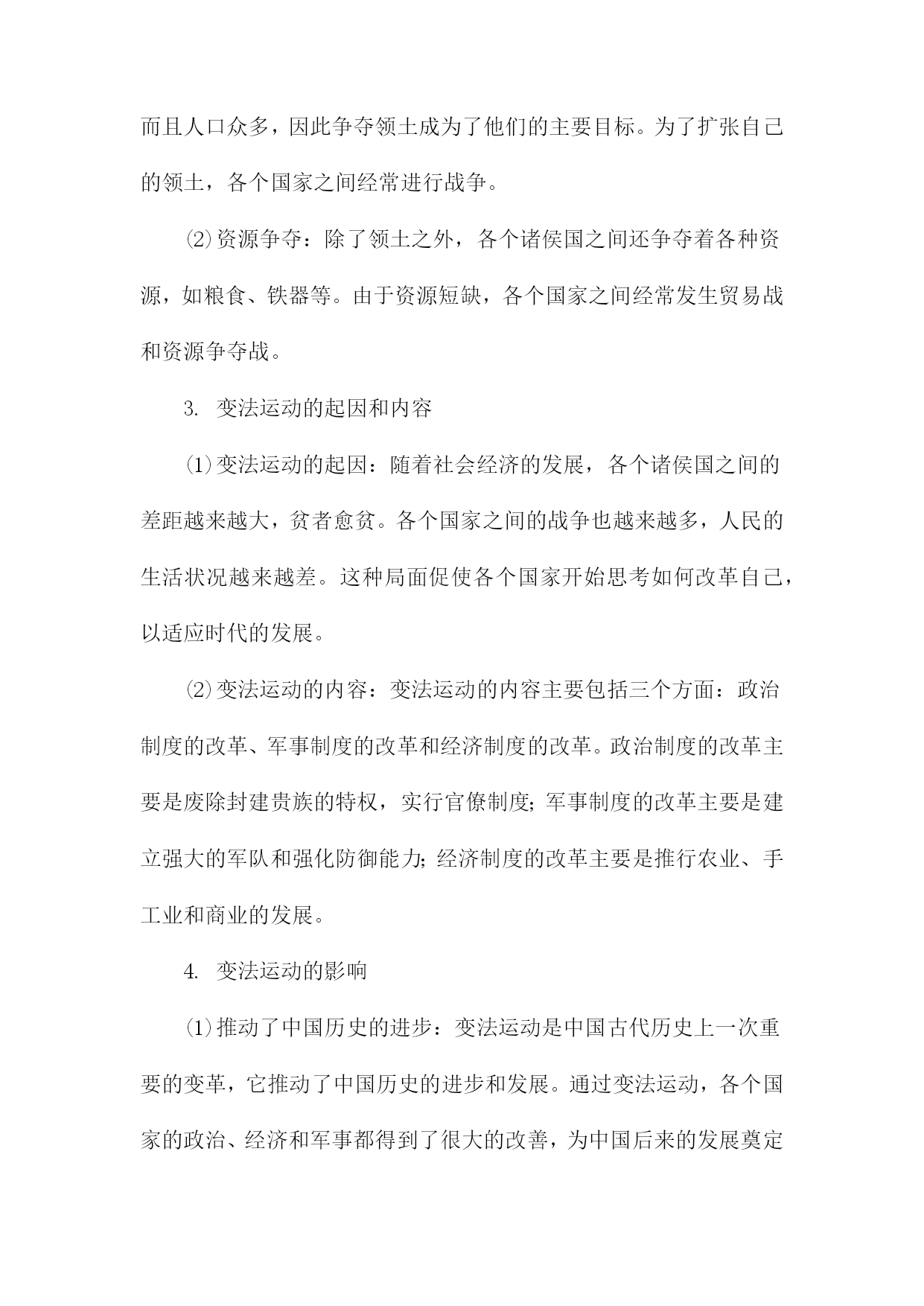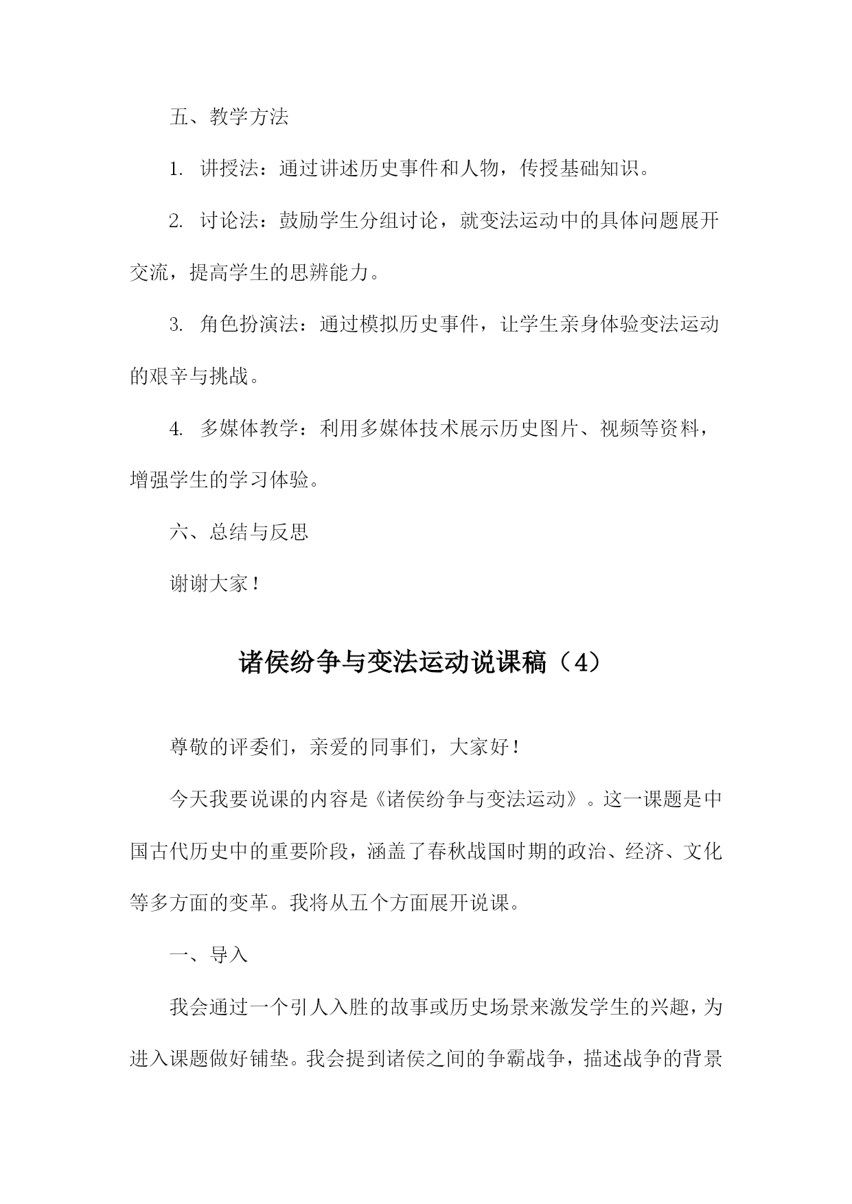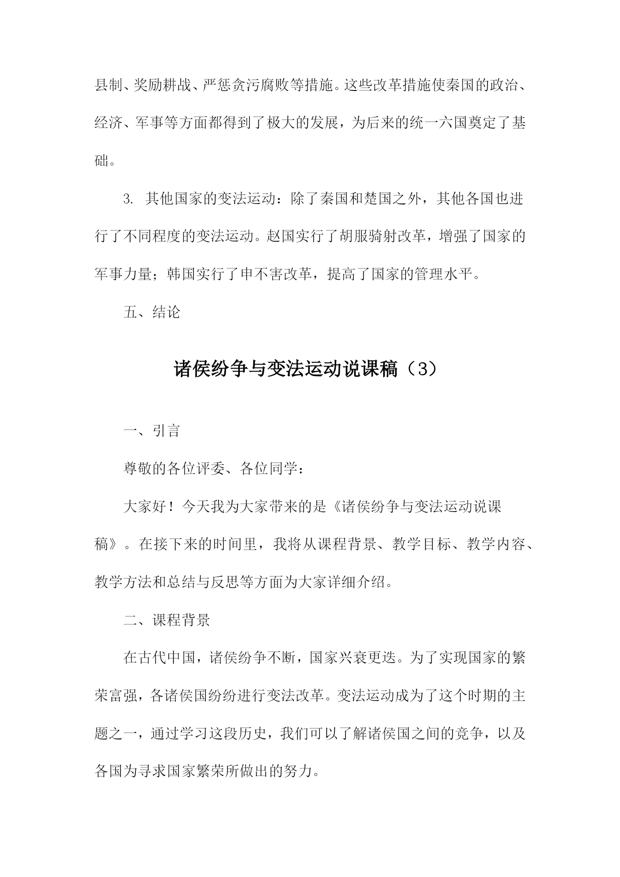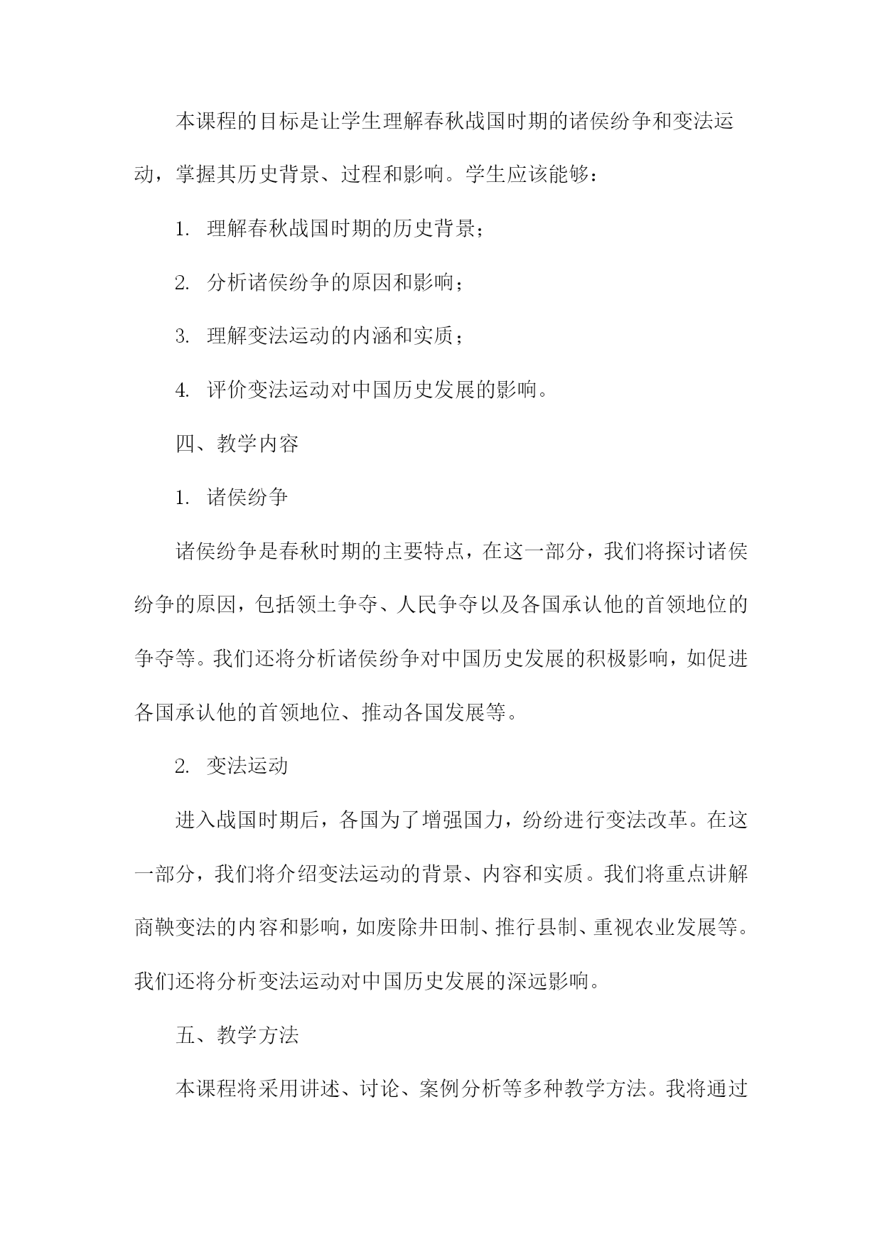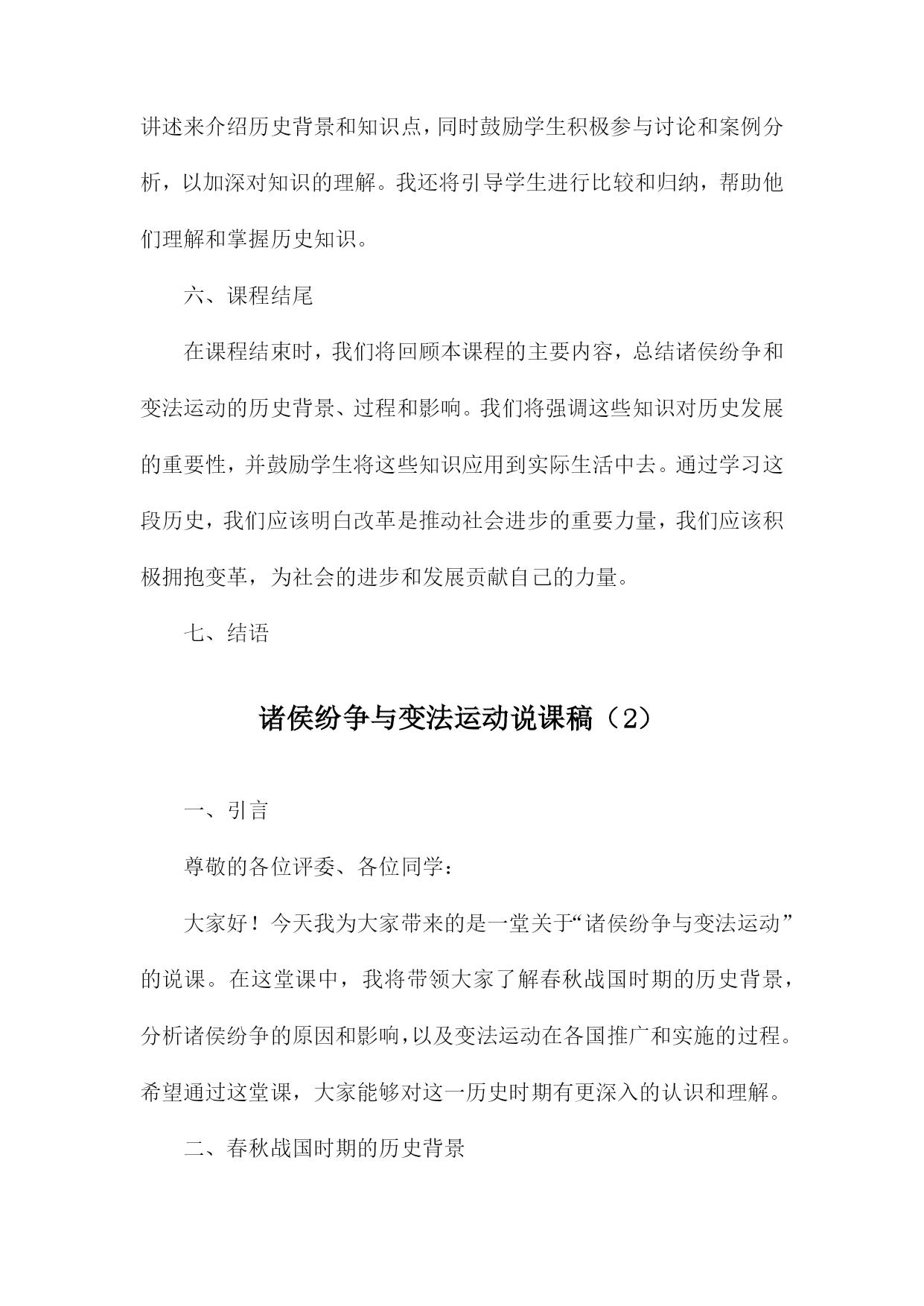 诸侯纷争与变法运动说课稿一、导入1.介绍历史背景:战国时期是中国历史上一个非常动荡的时期,诸侯国之间互相攻伐,战争不断。随着社会经济的发展,各诸侯国之间的差距也越来越大,这就为变法运动的发生提供了契机。2.引出主题:本节课我们将探讨“诸侯纷争与变法运动”这一主题。我们可以了解到这一时期的历史背景和政治形势,以及变法运动对中国古代历史的影响。二、正文1.诸侯国的兴起和发展(1)春秋时期的诸侯国:春秋时期,中国境内出现了很多小国家,这些国家之间互相攻伐,形成了一个分裂的局面。齐、楚、燕、韩、赵、魏、秦七个大国最为强大。(2)战国时期的诸侯国:战国时期,各国之间的战争更加激烈,最终形成了七个大国和一些小国家的局面。这些大国之间互相攻伐,争夺领土和资源。2.诸侯纷争的原因(1)地盘争夺:在战国时期,各个诸侯国之间的领土面积非常大,而且人口众多,因此争夺领土成为了他们的主要目标。为了扩张自己的领土,各个国家之间经常进行战争。(2)资源争夺:除了领土之外,各个诸侯国之间还争夺着各种资源,如粮食、铁器等。由于资源短缺,各个国家之间经常发生贸易战和资源争夺战。3.变法运动的起因和内容(1)变法运动的起因:随着社会经济的发展,各个诸侯国之间的差距越来越大,贫者愈贫。各个国家之间的战争也越来越多,人民的生活状况越来越差。这种局面促使各个国家开始思考如何改革自己,以适应时代的发展。(2)变法运动的内容:变法运动的内容主要包括三个方面:政治制度的改革、军事制度的改革和经济制度的改革。政治制度的改革主要是废除封建贵族的特权,实行官僚制度;军事制度的改革主要是建立强大的军队和强化防御能力;经济制度的改革主要是推行农业、手工业和商业的发展。4.变法运动的影响(1)推动了中国历史的进步:变法运动是中国古代历史上一次重要的变革,它推动了中国历史的进步和发展。通过变法运动,各个国家的政治、经济和军事都得到了很大的改善,为中国后来的发展奠定了基础。(2)影响了后世的政治和文化:变法运动的思想和理念对中国后世的政治和文化产生了深远的影响。官僚制度和科举制度就是从变法运动中发展起来的;儒家思想也在变法运动中得到了进一步的发展和完善。三、总结诸侯纷争与变法运动说课稿(1)一、导入亲爱的同事们,大家好!今天我要说课的内容是《诸侯纷争与变法运动》。这节课我们将探讨古代中国历史上的一段重要时期,即春秋战国时期的诸侯纷争和随后的变法运动。它们对中国历史的发展产生了深远的影响。二、课程背景在春秋时期,诸侯国之间纷争不断,各国纷纷寻求强国之道。这种纷争局面为战国时期的变法运动提供了背景,各国为了增强国力,纷纷进行变法改革,力图在诸侯争霸中取得优势。本课程将深入探讨这一时期的历史背景、诸侯纷争的情况以及变法运动的内容和影响。三、课程目标本课程的目标是让学生理解春秋战国时期的诸侯纷争和变法运动,掌握其历史背景、过程和影响。学生应该能够:1.理解春秋战国时期的历史背景;2.分析诸侯纷争的原因和影响;3.理解变法运动的内涵和实质;4.评价变法运动对中国历史发展的影响。四、教学内容1.诸侯纷争诸侯纷争是春秋时期的主要特点,在这一部分,我们将探讨诸侯纷争的原因,包括领土争夺、人民争夺以及各国承认他的首领地位的争夺等。我们还将分析诸侯纷争对中国历史发展的积极影响,如促进各国承认他的首领地位、推动各国发展等。2.变法运动进入战国时期后,各国为了增强国力,纷纷进行变法改革。在这一部分,我们将介绍变法运动的背景、内容和实质。我们将重点讲解商鞅变法的内容和影响,如废除井田制、推行县制、重视农业发展等。我们还将分析变法运动对中国历史发展的深远影响。五、教学方法本课程将采用讲述、讨论、案例分析等多种教学方法。我将通过讲述来介绍历史背景和知识点,同时鼓励学生积极参与讨论和案例分析,以加深对知识的理解。我还将引导学生进行比较和归纳,帮助他们理解和掌握历史知识。六、课程结尾在课程结束时,我们将回顾本课程的主要内容,总结诸侯纷争和变法运动的历史背景、过程和影响。我们将强调这些知识对历史发展的重要性,并鼓励学生将这些知识应用到实际生活中去。通过学习这段历史,我们应该明白改革是推动社会进步的重要力量,我们应该积极拥抱变革,为社会的进步和发展贡献自己的力量。七、结语诸侯纷争与变法运动说课稿(2)一、引言尊敬的各位评委、各位同学:大家好!今天我为大家带来的是一堂关于“诸侯纷争与变法运动”的说课。在这堂课中,我将带领大家了解春秋战国时期的历史背景,分析诸侯纷争的原因和影响,以及变法运动在各国推广和实施的过程。希望通过这堂课,大家能够对这一历史时期有更深入的认识和理解。二、春秋战国时期的历史背景春秋战国时期(公元前770年公元前221年),