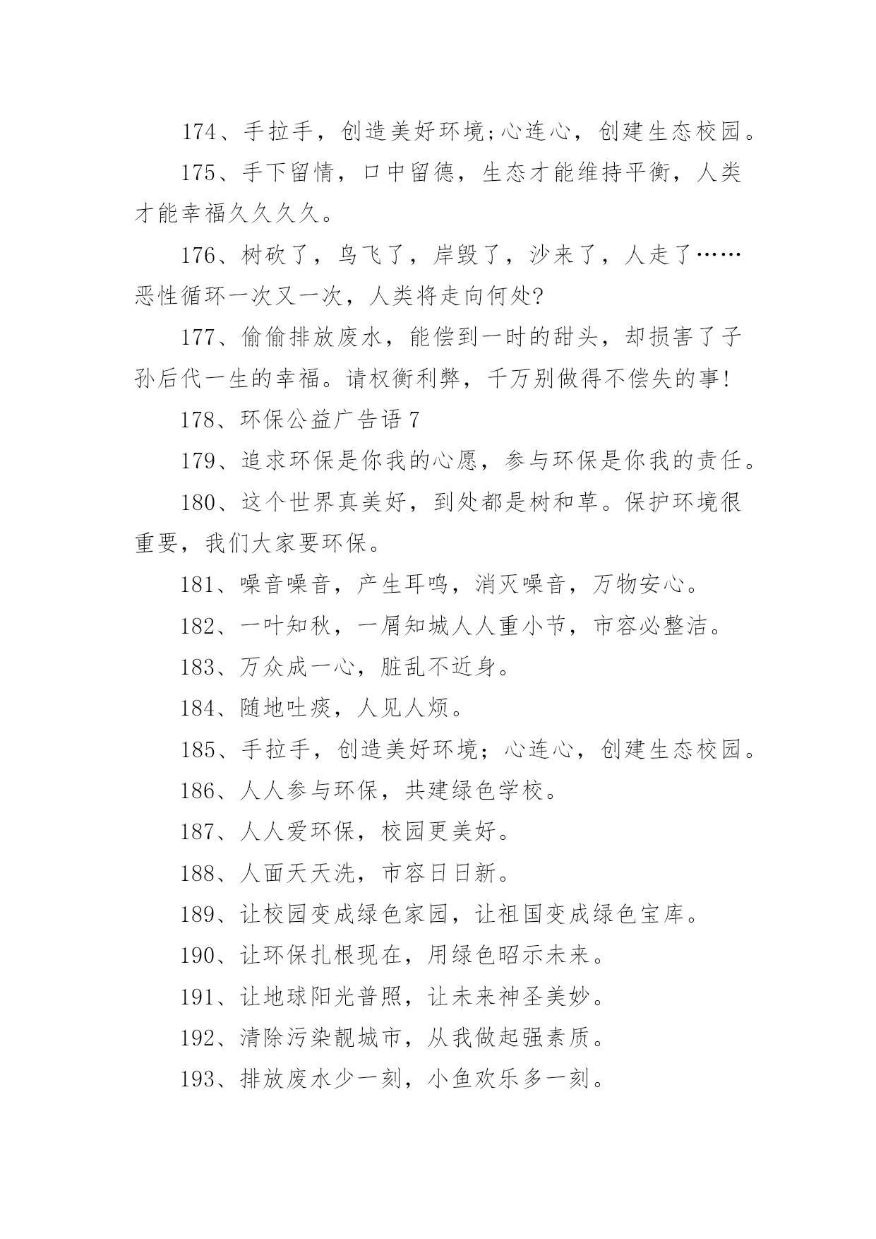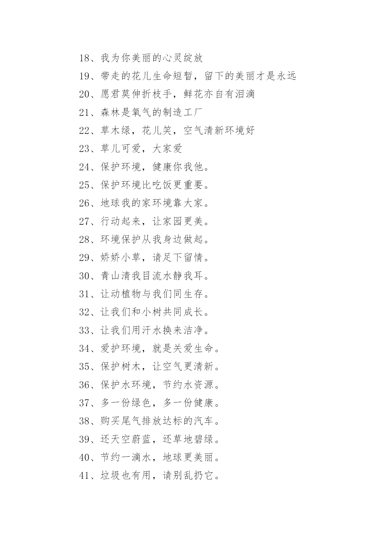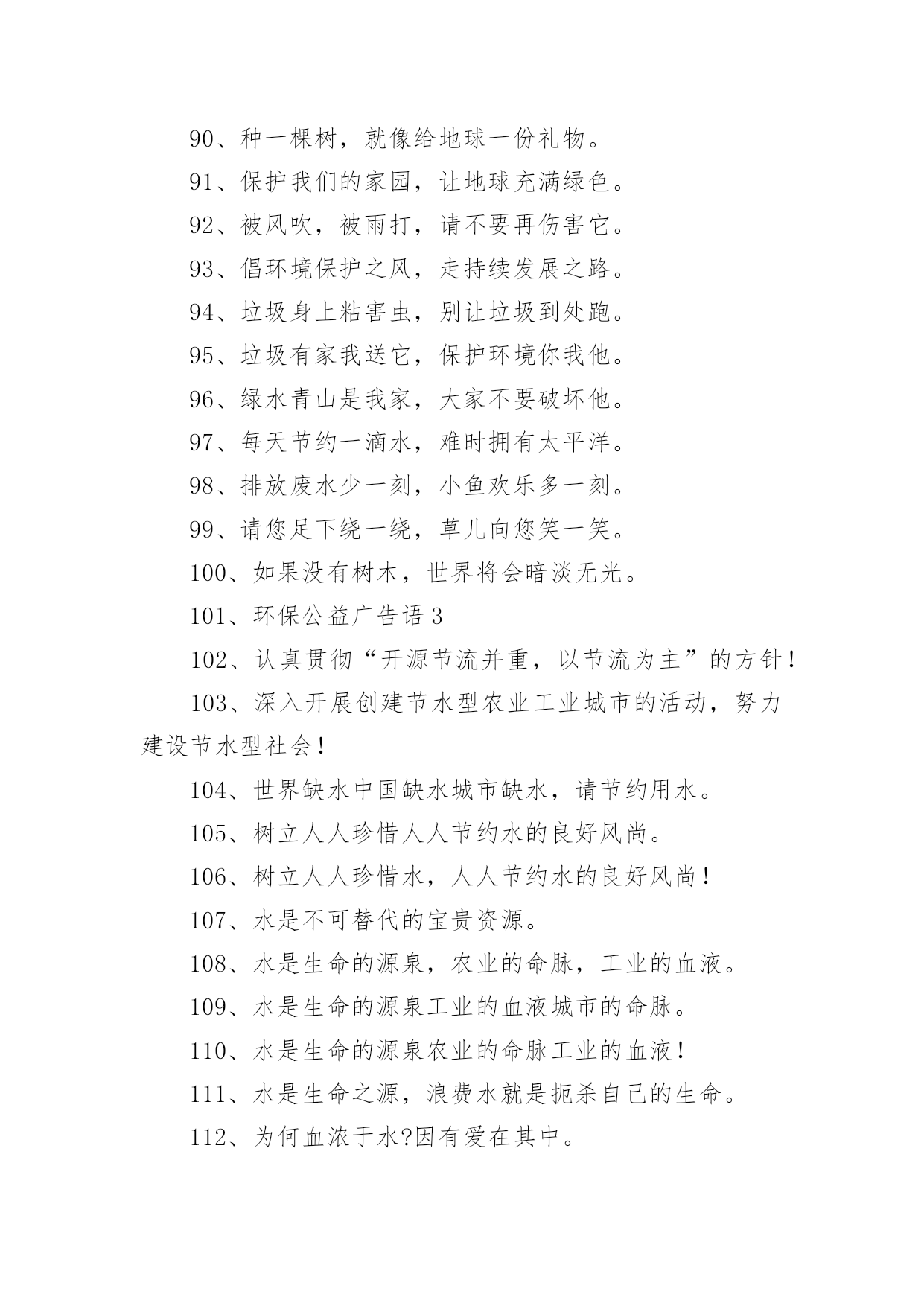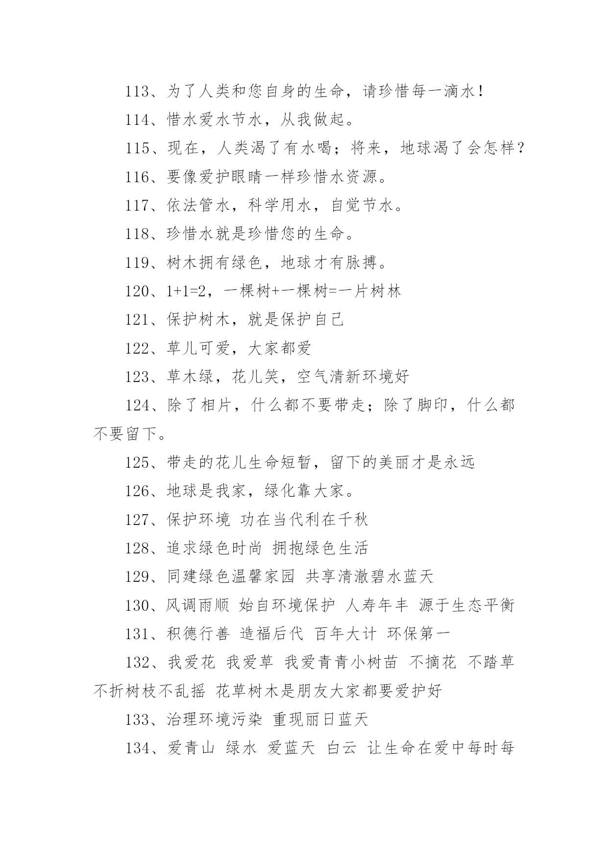 环保的公益广告语环保的公益广告语环保的公益广告语11、保护树木,就是保护自己2、地球是我家,绿化靠大家3、树木拥有绿色,地球才有脉搏。4、除了相片,什么都不要带走;除了脚印,什么都不要留下。5、一花一草皆生命,一枝一叶总关情。6、来时给你一阵芳香,走时还我一身洁净。7、地球是我家,绿化靠大家。8、小草有生命,足下多留“青”。9、小草对您微微笑,请您把路绕一绕。10、欲揽春色入自家,无可奈何成落花。11、我是一只小小小鸟,总是飞呀飞不高。12、11+1=2,一棵树+一棵树=一片树林13、绿色——生命之源14、踏破青毡可惜,多行数步何妨15、红花绿草满园栽,风送花香碟时来16、花开堪赏直须赏,莫要折花空赏枝17、花草丛中笑,园外赏其貌18、我为你美丽的心灵绽放19、带走的花儿生命短暂,留下的美丽才是永远20、愿君莫伸折枝手,鲜花亦自有泪滴21、森林是氧气的制造工厂22、草木绿,花儿笑,空气清新环境好23、草儿可爱,大家爱24、保护环境,健康你我他。25、保护环境比吃饭更重要。26、地球我的家环境靠大家。27、行动起来,让家园更美。28、环境保护从我身边做起。29、娇娇小草,请足下留情。30、青山清我目流水静我耳。31、让动植物与我们同生存。32、让我们和小树共同成长。33、让我们用汗水换来洁净。34、爱护环境,就是关爱生命。35、保护树木,让空气更清新。36、保护水环境,节约水资源。37、多一份绿色,多一份健康。38、购买尾气排放达标的汽车。39、还天空蔚蓝,还草地碧绿。40、节约一滴水,地球更美丽。41、垃圾也有用,请别乱扔它。42、留住草的美,体现你的美。43、让地球妈妈永远年轻美丽。44、让美丽环境因我们而存在。45、人人为环保,环保为人人。46、少抽一支烟,多栽一棵树。47、少些尘土,再现碧蓝天空。48、团结一条心,石头变成金。49、为了家园更美,请勿摘花。50、小草在生长,大家别打扰。51、小小一口痰,细菌千千万。52、校园美如画,受益你我他。53、校园是我家,卫生靠大家。54、用好你的手,垃圾无处溜。55、保护生态环境,共健美好家园。56、创建绿色校园,从你我做起。57、拒食野生动物,维护生态平衡。58、美好家园,需要我们共同建设。59、同在蓝天下,共享美好家园。60、爱护绿色光荣,破坏绿色可耻。61、参与绿色行动,保护美丽家园。62、处处鸟语花香,生活充满阳光。63、创造绿色时尚,拥抱绿色生活。64、从自己做起,爱护我们的家园。65、带走生活垃圾,保护自然环境。66、共植万顷绿地,同撑一片蓝天。67、贯彻环保教育,宣导环保资讯。68、建设绿色校园,增强环保意识。69、绿化美化净化,靠你靠我靠他。70、请将废电池送入规定的电池箱。71、请走阳光大道,别踩小花小草!72、全员参与改善,持续环保社区。73、让河水更清澈,让家园更美好。74、让绿色看得见,让绿色听得见。75、善待绿色生命,等于保护自己。76、树立环保理念,创建绿色家园。77、树木拥有绿色,地球才有脉搏。78、退耕还林还草,保护生态环境。79、完善环保制度,落实环保责任。80、我们的地球需要每个人的保护。81、小草正睡觉,勿入草坪来打扰。82、学校是我家,保护环境靠大家。83、以科技为动力,以质量求生存。84、止住您的脚步,留住一片绿茵!85、追求绿色时尚,拥抱绿色生活。86、美丽的环境,离不开大家的维护。87、让金色的稀纪里,蕴含着绿的可爱。88、热爱自然,保护自然,享受自然。89、一人一年一棵树绿山绿水绿山河。90、种一棵树,就像给地球一份礼物。91、保护我们的家园,让地球充满绿色。92、被风吹,被雨打,请不要再伤害它。93、倡环境保护之风,走持续发展之路。94、垃圾身上粘害虫,别让垃圾到处跑。95、垃圾有家我送它,保护环境你我他。96、绿水青山是我家,大家不要破坏他。97、每天节约一滴水,难时拥有太平洋。98、排放废水少一刻,小鱼欢乐多一刻。99、请您足下绕一绕,草儿向您笑一笑。100、如果没有树木,世界将会暗淡无光。101、环保公益广告语3102、认真贯彻“开源节流并重,以节流为主”的方针!103、深入开展创建节水型农业工业城市的活动,努力建设节水型社会!104、世界缺水中国缺水城市缺水,请节约用水。105、树立人人珍惜人人节约水的良好风尚。106、树立人人珍惜水,人人节约水的良好风尚!107、水是不可替代的宝贵资源。108、水是生命的源泉,农业的命脉,工业的血液。109、水是生命的源泉工业的血液城市的命脉。110、水是生命的源泉农业的命脉工业的血液!111、水是生命之源,浪费水就是扼杀自己的生命。112、为何血浓于水?因有爱在其中。113、为了人类和您自身的生命,请珍惜每一滴水!114、惜水爱水节水,从我做起。115、现在,人类渴了有水喝;将来,