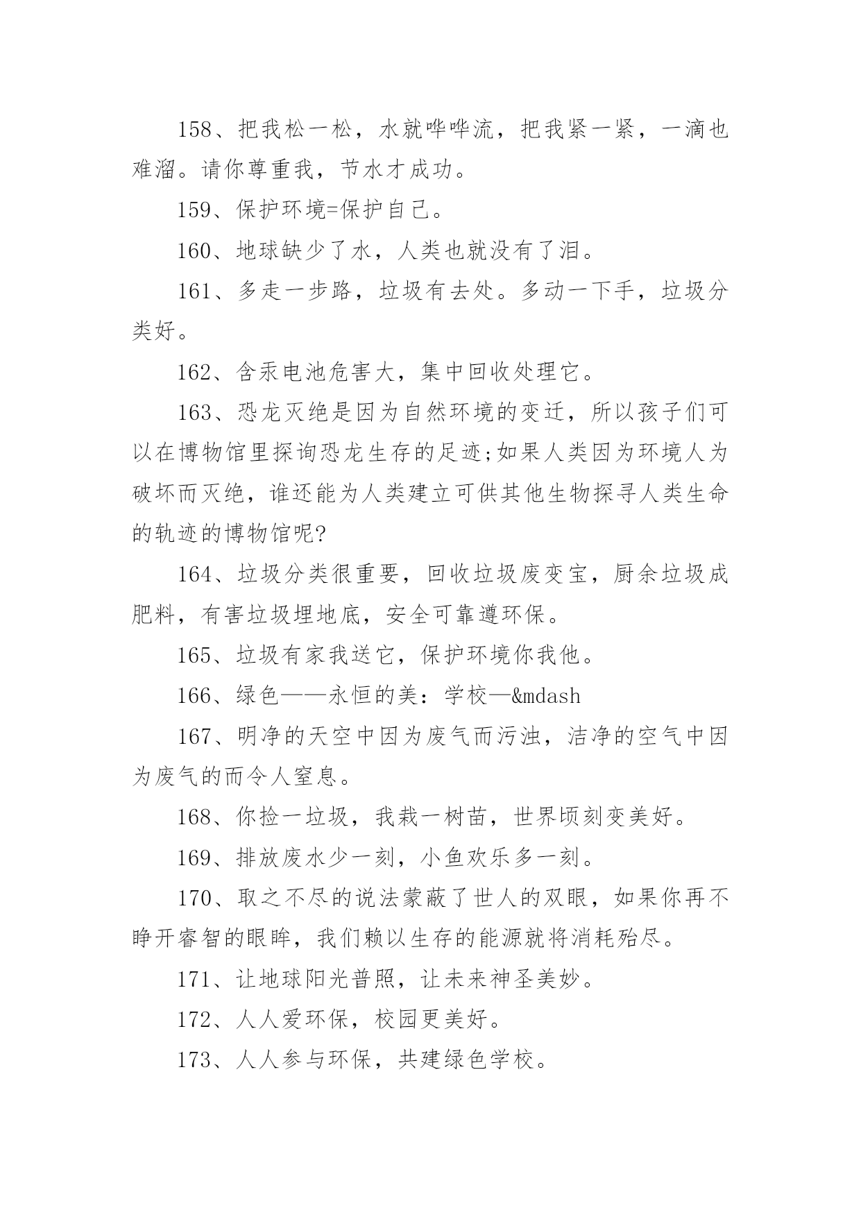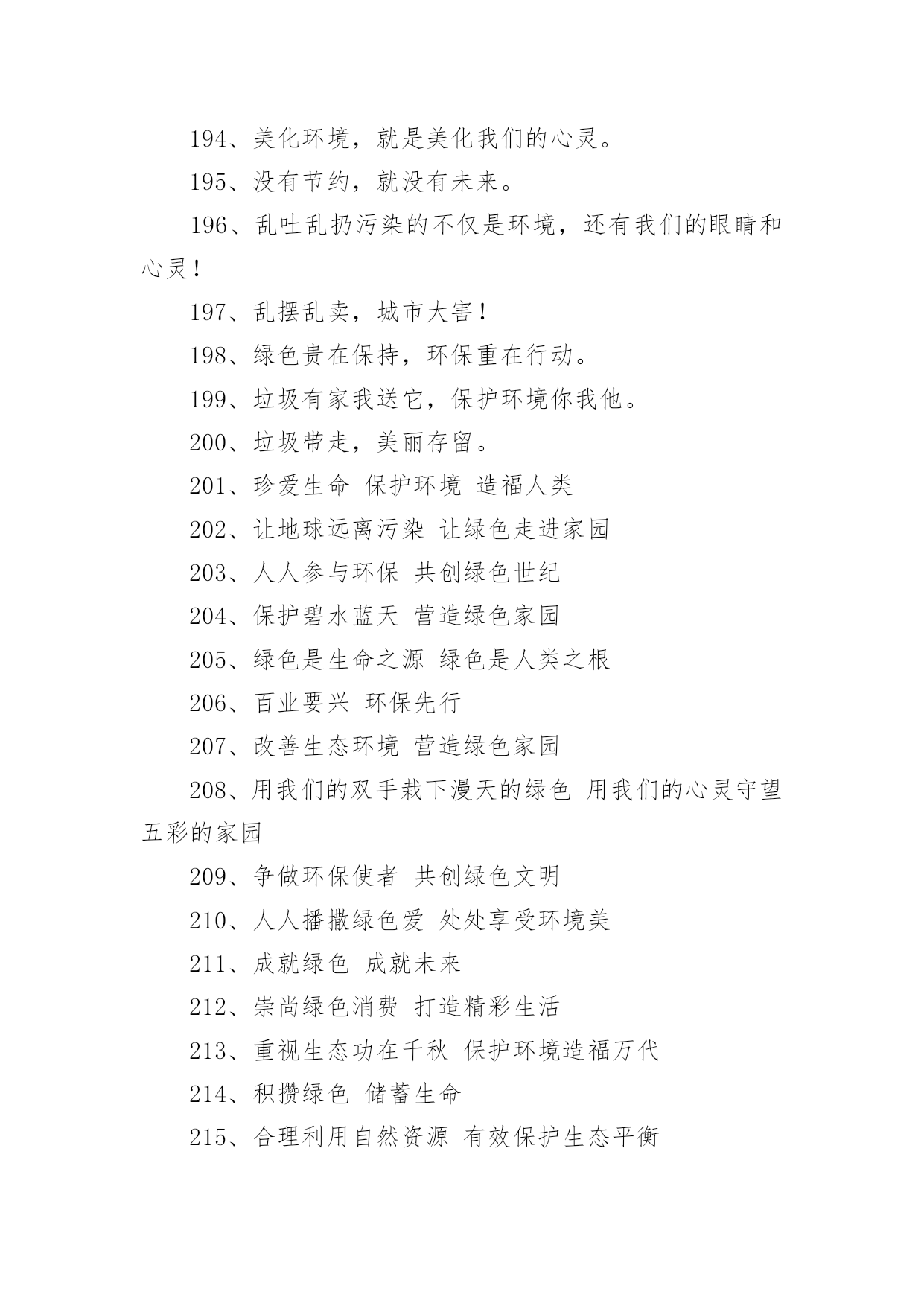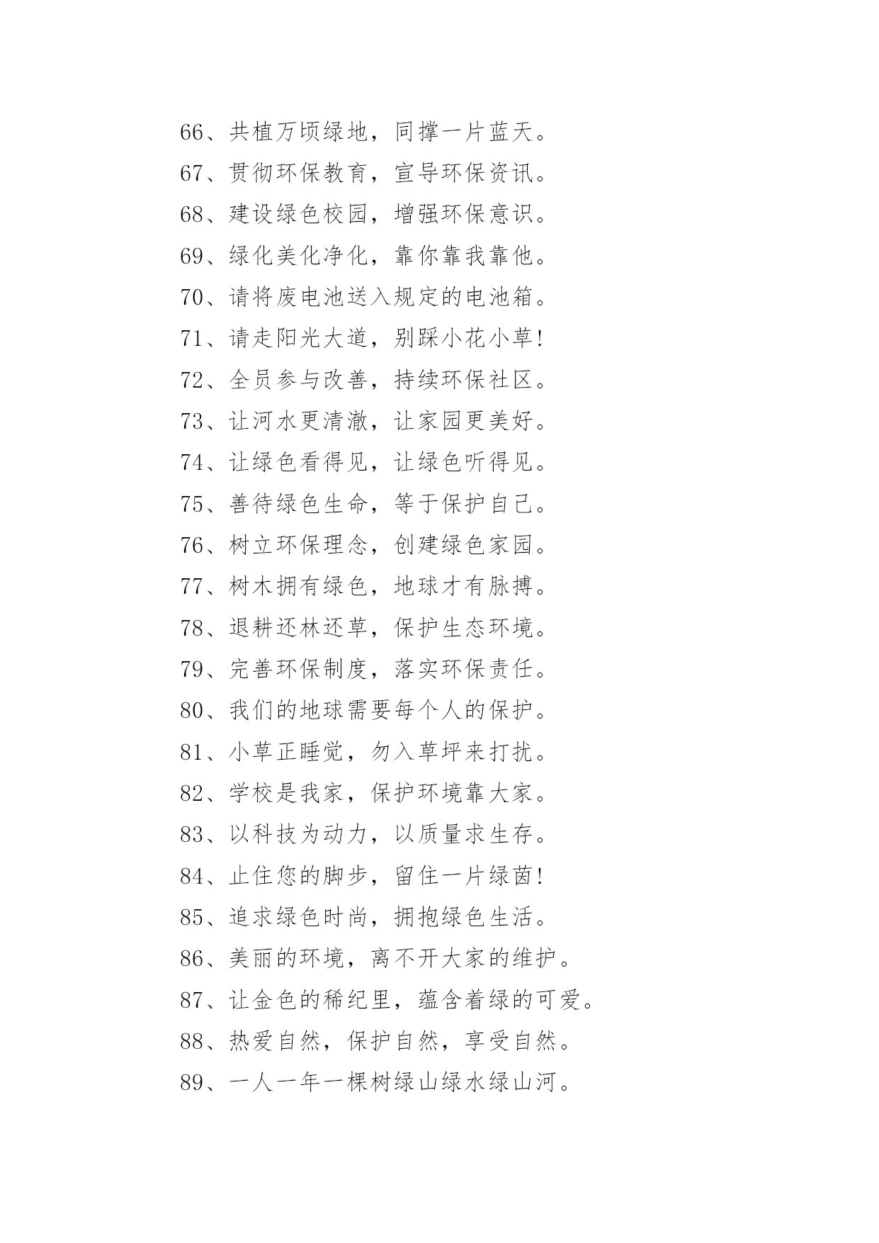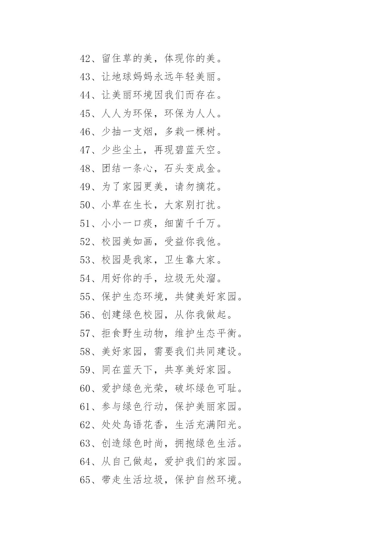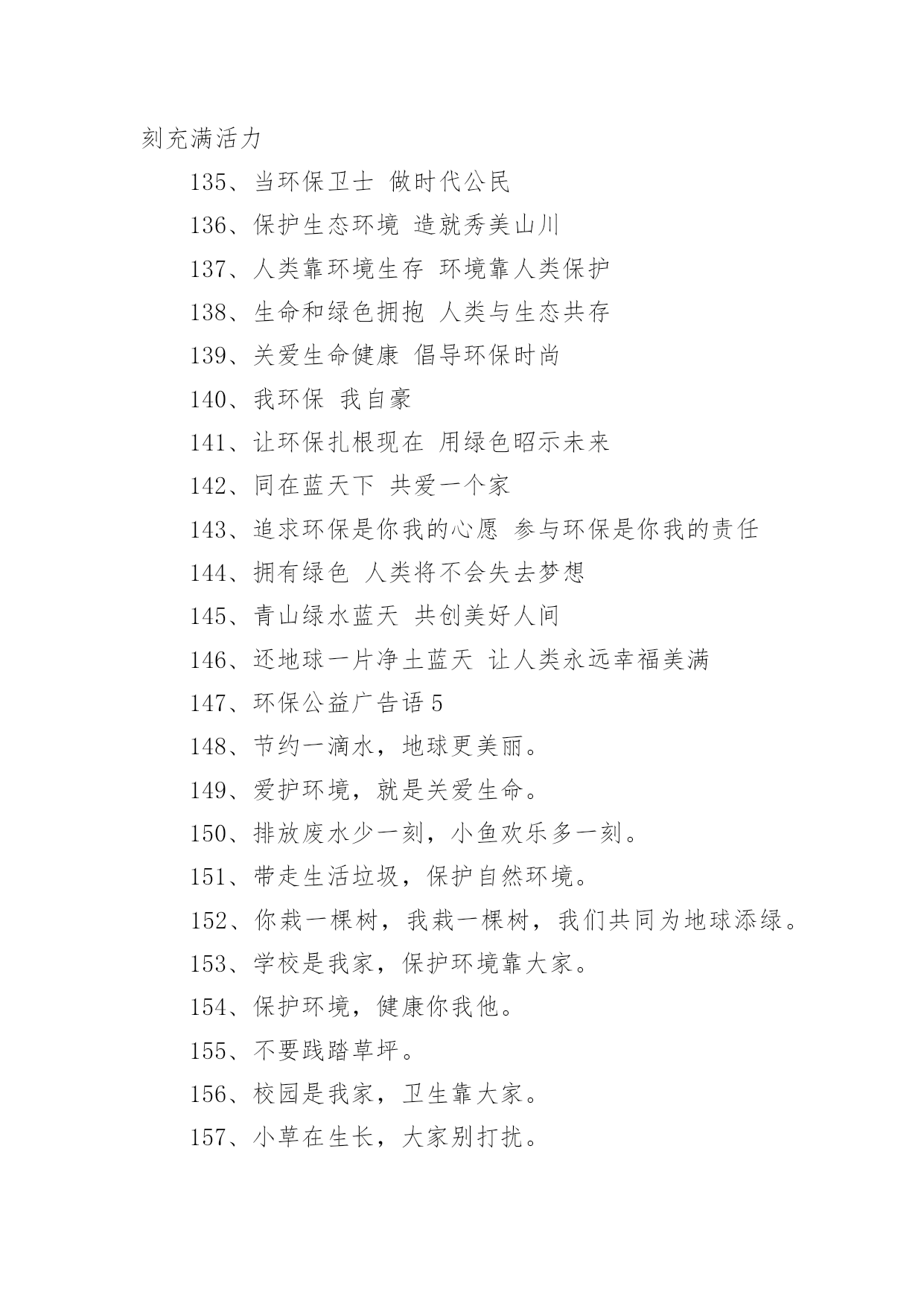 环保的公益广告语环保的公益广告语环保的公益广告语11、保护树木,就是保护自己2、地球是我家,绿化靠大家3、树木拥有绿色,地球才有脉搏。4、除了相片,什么都不要带走;除了脚印,什么都不要留下。5、一花一草皆生命,一枝一叶总关情。6、来时给你一阵芳香,走时还我一身洁净。7、地球是我家,绿化靠大家。8、小草有生命,足下多留“青”。9、小草对您微微笑,请您把路绕一绕。10、欲揽春色入自家,无可奈何成落花。11、我是一只小小小鸟,总是飞呀飞不高。12、11+1=2,一棵树+一棵树=一片树林13、绿色——生命之源14、踏破青毡可惜,多行数步何妨15、红花绿草满园栽,风送花香碟时来16、花开堪赏直须赏,莫要折花空赏枝17、花草丛中笑,园外赏其貌18、我为你美丽的心灵绽放19、带走的花儿生命短暂,留下的美丽才是永远20、愿君莫伸折枝手,鲜花亦自有泪滴21、森林是氧气的制造工厂22、草木绿,花儿笑,空气清新环境好23、草儿可爱,大家爱24、保护环境,健康你我他。25、保护环境比吃饭更重要。26、地球我的家环境靠大家。27、行动起来,让家园更美。28、环境保护从我身边做起。29、娇娇小草,请足下留情。30、青山清我目流水静我耳。31、让动植物与我们同生存。32、让我们和小树共同成长。33、让我们用汗水换来洁净。34、爱护环境,就是关爱生命。35、保护树木,让空气更清新。36、保护水环境,节约水资源。37、多一份绿色,多一份健康。38、购买尾气排放达标的汽车。39、还天空蔚蓝,还草地碧绿。40、节约一滴水,地球更美丽。41、垃圾也有用,请别乱扔它。42、留住草的美,体现你的美。43、让地球妈妈永远年轻美丽。44、让美丽环境因我们而存在。45、人人为环保,环保为人人。46、少抽一支烟,多栽一棵树。47、少些尘土,再现碧蓝天空。48、团结一条心,石头变成金。49、为了家园更美,请勿摘花。50、小草在生长,大家别打扰。51、小小一口痰,细菌千千万。52、校园美如画,受益你我他。53、校园是我家,卫生靠大家。54、用好你的手,垃圾无处溜。55、保护生态环境,共健美好家园。56、创建绿色校园,从你我做起。57、拒食野生动物,维护生态平衡。58、美好家园,需要我们共同建设。59、同在蓝天下,共享美好家园。60、爱护绿色光荣,破坏绿色可耻。61、参与绿色行动,保护美丽家园。62、处处鸟语花香,生活充满阳光。63、创造绿色时尚,拥抱绿色生活。64、从自己做起,爱护我们的家园。65、带走生活垃圾,保护自然环境。66、共植万顷绿地,同撑一片蓝天。67、贯彻环保教育,宣导环保资讯。68、建设绿色校园,增强环保意识。69、绿化美化净化,靠你靠我靠他。70、请将废电池送入规定的电池箱。71、请走阳光大道,别踩小花小草!72、全员参与改善,持续环保社区。73、让河水更清澈,让家园更美好。74、让绿色看得见,让绿色听得见。75、善待绿色生命,等于保护自己。76、树立环保理念,创建绿色家园。77、树木拥有绿色,地球才有脉搏。78、退耕还林还草,保护生态环境。79、完善环保制度,落实环保责任。80、我们的地球需要每个人的保护。81、小草正睡觉,勿入草坪来打扰。82、学校是我家,保护环境靠大家。83、以科技为动力,以质量求生存。84、止住您的脚步,留住一片绿茵!85、追求绿色时尚,拥抱绿色生活。86、美丽的环境,离不开大家的维护。87、让金色的稀纪里,蕴含着绿的可爱。88、热爱自然,保护自然,享受自然。89、一人一年一棵树绿山绿水绿山河。90、种一棵树,就像给地球一份礼物。91、保护我们的家园,让地球充满绿色。92、被风吹,被雨打,请不要再伤害它。93、倡环境保护之风,走持续发展之路。94、垃圾身上粘害虫,别让垃圾到处跑。95、垃圾有家我送它,保护环境你我他。96、绿水青山是我家,大家不要破坏他。97、每天节约一滴水,难时拥有太平洋。98、排放废水少一刻,小鱼欢乐多一刻。99、请您足下绕一绕,草儿向您笑一笑。100、如果没有树木,世界将会暗淡无光。101、环保公益广告语3102、认真贯彻“开源节流并重,以节流为主”的方针!103、深入开展创建节水型农业工业城市的活动,努力建设节水型社会!104、世界缺水中国缺水城市缺水,请节约用水。105、树立人人珍惜人人节约水的良好风尚。106、树立人人珍惜水,人人节约水的良好风尚!107、水是不可替代的宝贵资源。108、水是生命的源泉,农业的命脉,工业的血液。109、水是生命的源泉工业的血液城市的命脉。110、水是生命的源泉农业的命脉工业的血液!111、水是生命之源,浪费水就是扼杀自己的生命。112、为何血浓于水?因有爱在其中。113、为了人类和您自身的生命,请珍惜每一滴水!114、惜水爱水节水,从我做起。115、现在,人类渴了有水喝;将来,