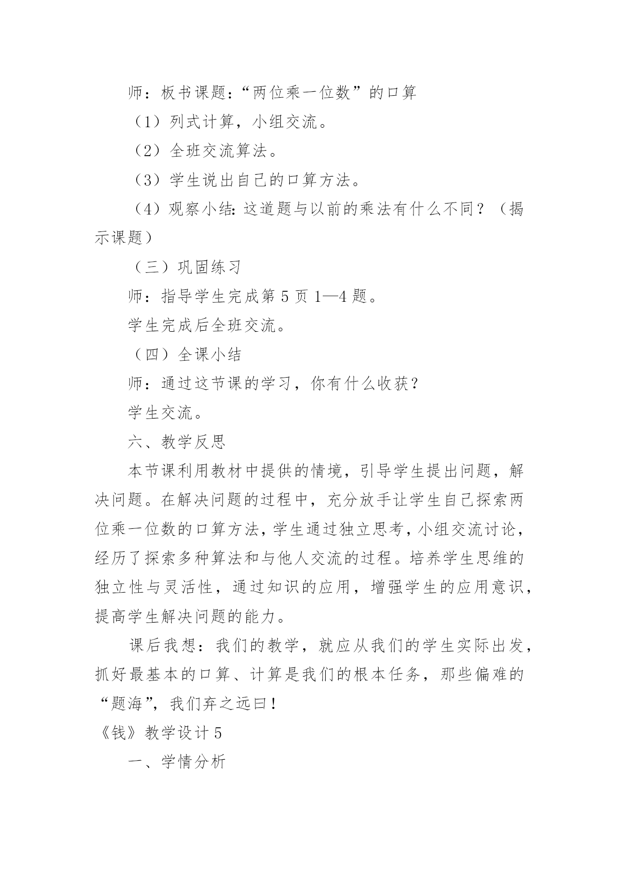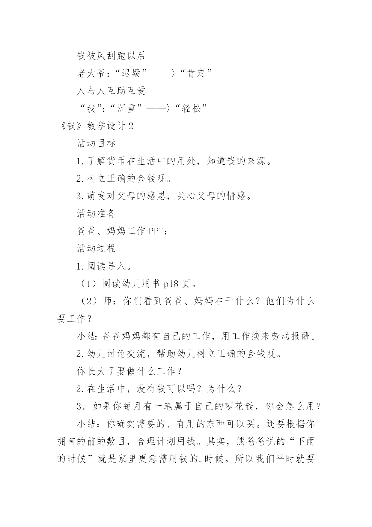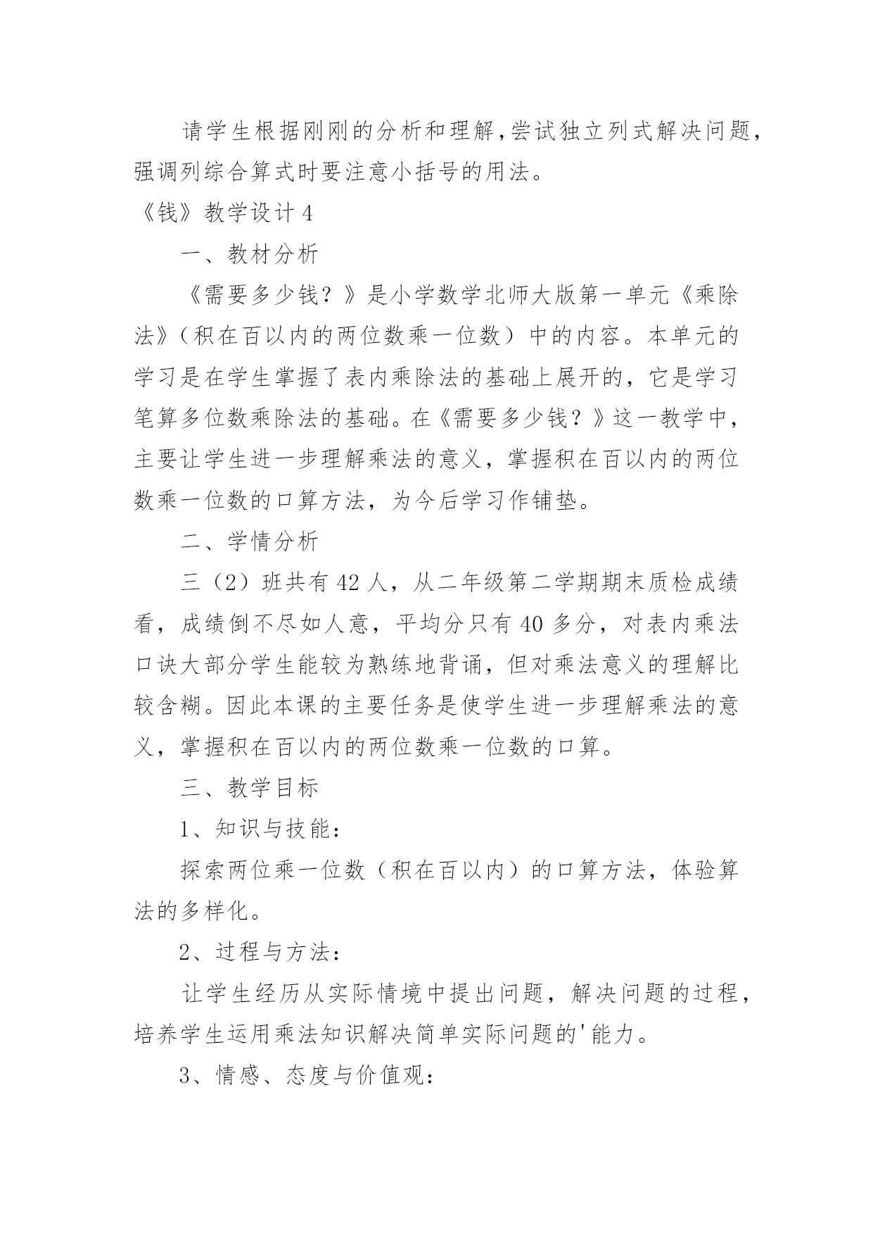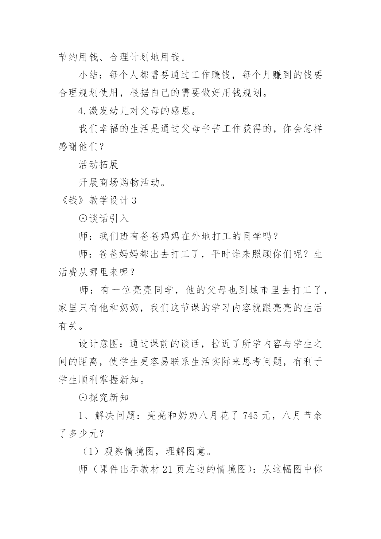 《钱》教学设计《钱》教学设计作为一位杰出的老师,就不得不需要编写教学设计,教学设计是一个系统化规划教学系统的过程。我们应该怎么写教学设计呢?下面是小编为大家收集的《钱》教学设计,欢迎大家分享。《钱》教学设计1一、教材分析本文是小学语文北师大版第七册第十个主题单元“金钱”的第二篇主体课文。文章主要记叙了二十多年前,在一个北风凛冽的日子里,“我”骑车撞倒一位低头数钱的老大爷,钱掉地并随风四处飞扬,过路行人纷纷抢钱归还主人的故事,赞誉了人与人之间真诚、友爱、互助得好品德和良好风尚。二、教学目标1.通过各种识字方法,认识本课4个生字;利用观察字型的方法,会写本课5个生字;在语言环境中,体会理解“迟疑”和“肯定”,“沉重”和“轻松”;2、通过自读感悟,理解课文内容,体会本文按事情发展的先后顺序写的思路,鼓励学生自述;3、通过理解过路行人“抢”被北风吹落的钱,并还给生人的故事,帮助学生树立人与人之间应真诚、友爱、互助的良好品质。三、教学重点:品读第5、6自然段,引导学生从人物的动作、神态、语言去感悟人物的内心世界,从“迟疑与肯定”“沉重与轻松”中体会人间真情互助友爱的可贵和可敬。四、教学难点:理解课文中“抢”字加与不加引号的不同意义。五、教学过程:(一)质疑导入:1.板书课题,齐读。2.质疑:读了课题你想知道什么?(“钱”被风刮跑了以后,发生了什么事。)(三)学习课文1.出示课件,检查生字,正音。“趔趄、诧、蹬、续”2、自读课文,想想课文主要讲了一件什么事?指名回答,老师指导学生学习练习用较简练的语言概括文章的主要内容。因本文是叙事的,故从引导学生从时间、地点、人物、事件等要素来叙述。3、理清条理:钱为什么被风刮跑——钱被风刮跑以后。3.自读学习“钱为什么被风刮跑”部分,指名回答用一句话概括说明。“一月二十月,长春,刮着猛烈的北风,“我”骑车撞了一个低头数钱的老大爷,让钱被风刮跑,心情很慌忙。”4。指导学习“钱被方刮跑了以后”部分。(1)过路行人的.动作、神态、语言?(“不约而同地向钱飘走的方向跑去,有人还高喊着:‘钱跑了!快抢啊!’”;“从四面八方陆续朝老人走来,把‘抢’来的钱一一交在他的手里。”-------)(2)老大爷的动作、神态、语言?(“焦急地拍着大腿说;‘风刮人还抢,这可怎么得了!”“喜出望外,不住地向众人点头。”------)(3)“我”的动作、神态、语言?(“我沉重的心情一下子变得轻松了。------”)(4)自己边读边想几个“抢”字,加引号与不加的含义有何异同。(1、当时风大,必须动作要快,顾用“抢”;2、这种行为目的是为了老大爷追回钱,它实际是帮助性质的。)(5)品读5、6自然段,通过体会“迟疑”与“肯定”,“沉重”与“轻松”的含义,感悟老大爷和我的心情变化,5.再读课文,整体感悟。6.鼓励学生按事情发展顺序讲述在风中发生的事。7.结合课后习题,感悟文章内容。课文叙述了二十多年前一件真实的事,谈谈你读后的想法。(四)作业:“假如这件事发生在今天人们会怎么做,说出理由,”(五)板书:过路行人:“抢”——〉“还”钱被风刮跑以后老大爷:“迟疑”——〉“肯定”人与人互助互爱“我”:“沉重”——〉“轻松”《钱》教学设计2活动目标1.了解货币在生活中的用处,知道钱的来源。2.树立正确的金钱观。3.萌发对父母的感恩,关心父母的情感。活动准备爸爸、妈妈工作PPT;活动过程1.阅读导入。(1)阅读幼儿用书p18页。(2)师:你们看到爸爸、妈妈在干什么?他们为什么要工作?小结:爸爸妈妈都有自己的工作,用工作换来劳动报酬。2.幼儿讨论交流,帮助幼儿树立正确的金钱观。你长大了要做什么工作?2.在生活中,没有钱可以吗?为什么?3.如果你每月有一笔属于自己的零花钱,你会怎么用?小结:你确实需要的、有用的东西可以买。还要根据你拥有的前的数目,合理计划用钱。其实,熊爸爸说的“下雨的时候”就是家里更急需用钱的.时候。所以我们平时就要节约用钱、合理计划地用钱。小结:每个人都需要通过工作赚钱,每个月赚到的钱要合理规划使用,根据自己的需要做好用钱规划。4.激发幼儿对父母的感恩。我们幸福的生活是通过父母辛苦工作获得的,你会怎样感谢他们?活动拓展开展商场购物活动。《钱》教学设计3⊙谈话引入师:我们班有爸爸妈妈在外地打工的同学吗?师:爸爸妈妈都出去打工了,平时谁来照顾你们呢?生活费从哪里来呢?师:有一位亮亮同学,他的父母也到城市里去打工了,家里只有他和奶奶,我们这节课的学习内容就跟亮亮的生活有关。设计意图:通过课前的谈话,拉近了所学内容与学生之间的距离,使学生更容易联系生活实际来思考问题,有利于学生顺利掌握新知。⊙探究新知1、解决问题:亮亮和奶奶八月花了745元,八月节余了多少元?(1)观察情境图,理解图意。师(课件出示教材21页左边的情境图):从这幅图中你