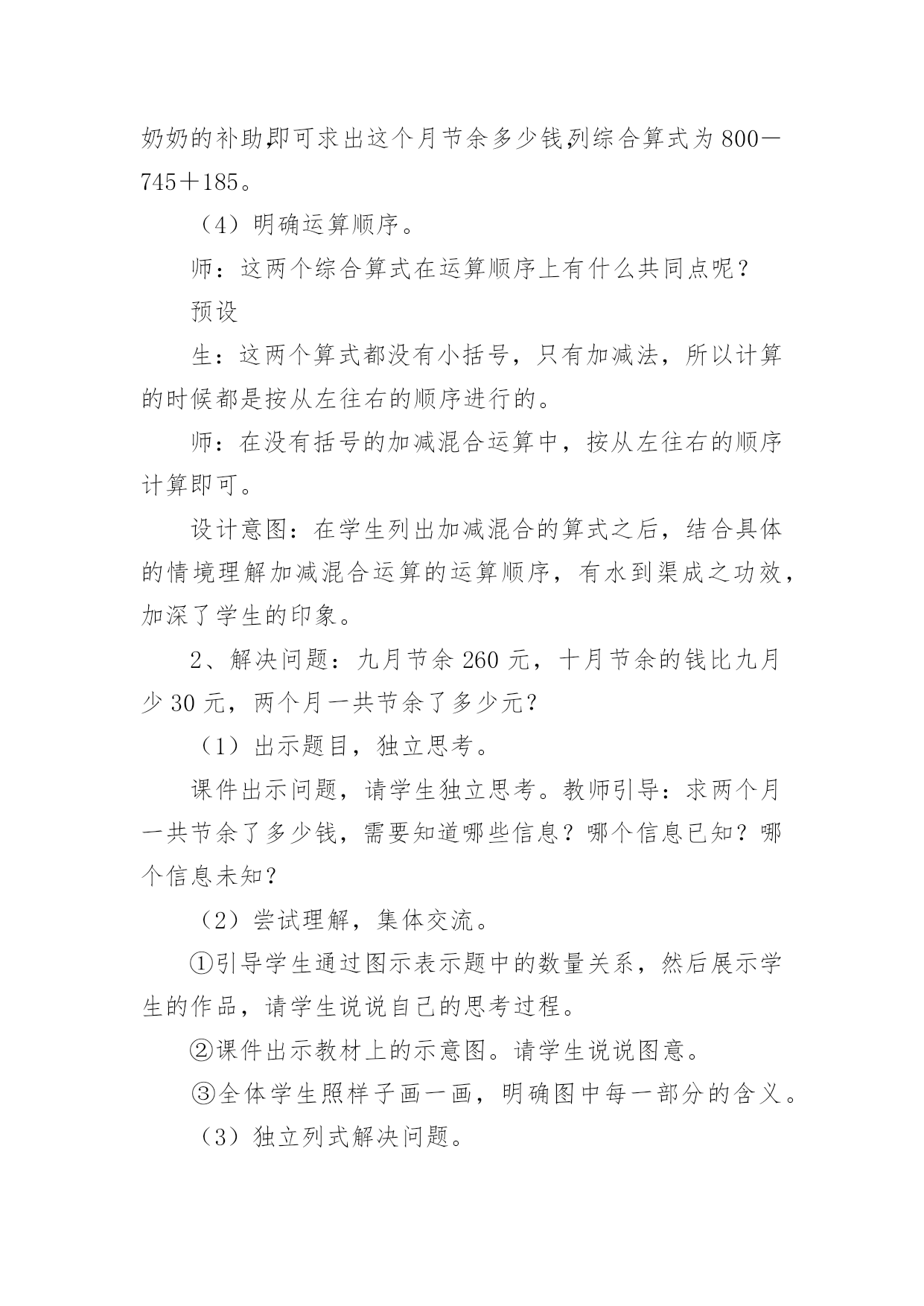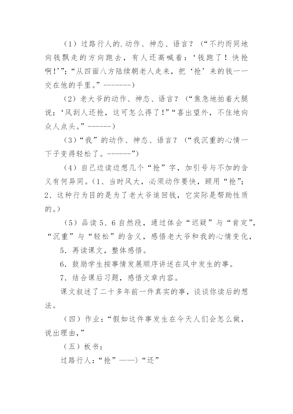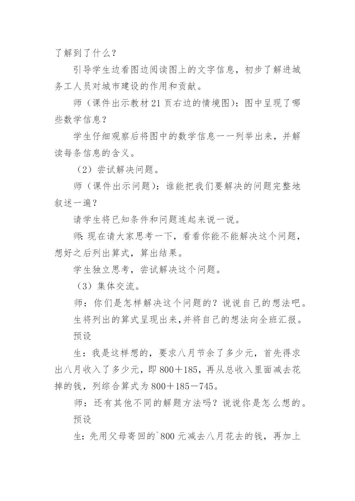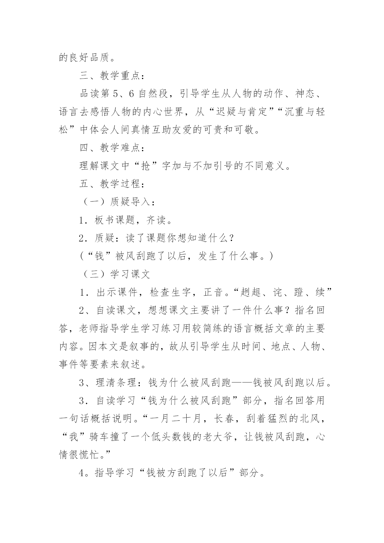 《钱》教学设计《钱》教学设计作为一位杰出的老师,就不得不需要编写教学设计,教学设计是一个系统化规划教学系统的过程。我们应该怎么写教学设计呢?下面是小编为大家收集的《钱》教学设计,欢迎大家分享。《钱》教学设计1一、教材分析本文是小学语文北师大版第七册第十个主题单元“金钱”的第二篇主体课文。文章主要记叙了二十多年前,在一个北风凛冽的日子里,“我”骑车撞倒一位低头数钱的老大爷,钱掉地并随风四处飞扬,过路行人纷纷抢钱归还主人的故事,赞誉了人与人之间真诚、友爱、互助得好品德和良好风尚。二、教学目标1.通过各种识字方法,认识本课4个生字;利用观察字型的方法,会写本课5个生字;在语言环境中,体会理解“迟疑”和“肯定”,“沉重”和“轻松”;2、通过自读感悟,理解课文内容,体会本文按事情发展的先后顺序写的思路,鼓励学生自述;3、通过理解过路行人“抢”被北风吹落的钱,并还给生人的故事,帮助学生树立人与人之间应真诚、友爱、互助的良好品质。三、教学重点:品读第5、6自然段,引导学生从人物的动作、神态、语言去感悟人物的内心世界,从“迟疑与肯定”“沉重与轻松”中体会人间真情互助友爱的可贵和可敬。四、教学难点:理解课文中“抢”字加与不加引号的不同意义。五、教学过程:(一)质疑导入:1.板书课题,齐读。2.质疑:读了课题你想知道什么?(“钱”被风刮跑了以后,发生了什么事。)(三)学习课文1.出示课件,检查生字,正音。“趔趄、诧、蹬、续”2、自读课文,想想课文主要讲了一件什么事?指名回答,老师指导学生学习练习用较简练的语言概括文章的主要内容。因本文是叙事的,故从引导学生从时间、地点、人物、事件等要素来叙述。3、理清条理:钱为什么被风刮跑——钱被风刮跑以后。3.自读学习“钱为什么被风刮跑”部分,指名回答用一句话概括说明。“一月二十月,长春,刮着猛烈的北风,“我”骑车撞了一个低头数钱的老大爷,让钱被风刮跑,心情很慌忙。”4。指导学习“钱被方刮跑了以后”部分。(1)过路行人的.动作、神态、语言?(“不约而同地向钱飘走的方向跑去,有人还高喊着:‘钱跑了!快抢啊!’”;“从四面八方陆续朝老人走来,把‘抢’来的钱一一交在他的手里。”-------)(2)老大爷的动作、神态、语言?(“焦急地拍着大腿说;‘风刮人还抢,这可怎么得了!”“喜出望外,不住地向众人点头。”------)(3)“我”的动作、神态、语言?(“我沉重的心情一下子变得轻松了。------”)(4)自己边读边想几个“抢”字,加引号与不加的含义有何异同。(1、当时风大,必须动作要快,顾用“抢”;2、这种行为目的是为了老大爷追回钱,它实际是帮助性质的。)(5)品读5、6自然段,通过体会“迟疑”与“肯定”,“沉重”与“轻松”的含义,感悟老大爷和我的心情变化,5.再读课文,整体感悟。6.鼓励学生按事情发展顺序讲述在风中发生的事。7.结合课后习题,感悟文章内容。课文叙述了二十多年前一件真实的事,谈谈你读后的想法。(四)作业:“假如这件事发生在今天人们会怎么做,说出理由,”(五)板书:过路行人:“抢”——〉“还”钱被风刮跑以后老大爷:“迟疑”——〉“肯定”人与人互助互爱“我”:“沉重”——〉“轻松”《钱》教学设计2活动目标1.了解货币在生活中的用处,知道钱的来源。2.树立正确的金钱观。3.萌发对父母的感恩,关心父母的情感。活动准备爸爸、妈妈工作PPT;活动过程1.阅读导入。(1)阅读幼儿用书p18页。(2)师:你们看到爸爸、妈妈在干什么?他们为什么要工作?小结:爸爸妈妈都有自己的工作,用工作换来劳动报酬。2.幼儿讨论交流,帮助幼儿树立正确的金钱观。你长大了要做什么工作?2.在生活中,没有钱可以吗?为什么?3.如果你每月有一笔属于自己的零花钱,你会怎么用?小结:你确实需要的、有用的东西可以买。还要根据你拥有的前的数目,合理计划用钱。其实,熊爸爸说的“下雨的时候”就是家里更急需用钱的.时候。所以我们平时就要节约用钱、合理计划地用钱。小结:每个人都需要通过工作赚钱,每个月赚到的钱要合理规划使用,根据自己的需要做好用钱规划。4.激发幼儿对父母的感恩。我们幸福的生活是通过父母辛苦工作获得的,你会怎样感谢他们?活动拓展开展商场购物活动。《钱》教学设计3⊙谈话引入师:我们班有爸爸妈妈在外地打工的同学吗?师:爸爸妈妈都出去打工了,平时谁来照顾你们呢?生活费从哪里来呢?师:有一位亮亮同学,他的父母也到城市里去打工了,家里只有他和奶奶,我们这节课的学习内容就跟亮亮的生活有关。设计意图:通过课前的谈话,拉近了所学内容与学生之间的距离,使学生更容易联系生活实际来思考问题,有利于学生顺利掌握新知。⊙探究新知1、解决问题:亮亮和奶奶八月花了745元,八月节余了多少元?(1)观察情境图,理解图意。师(课件出示教材21页左边的情境图):从这幅图中你