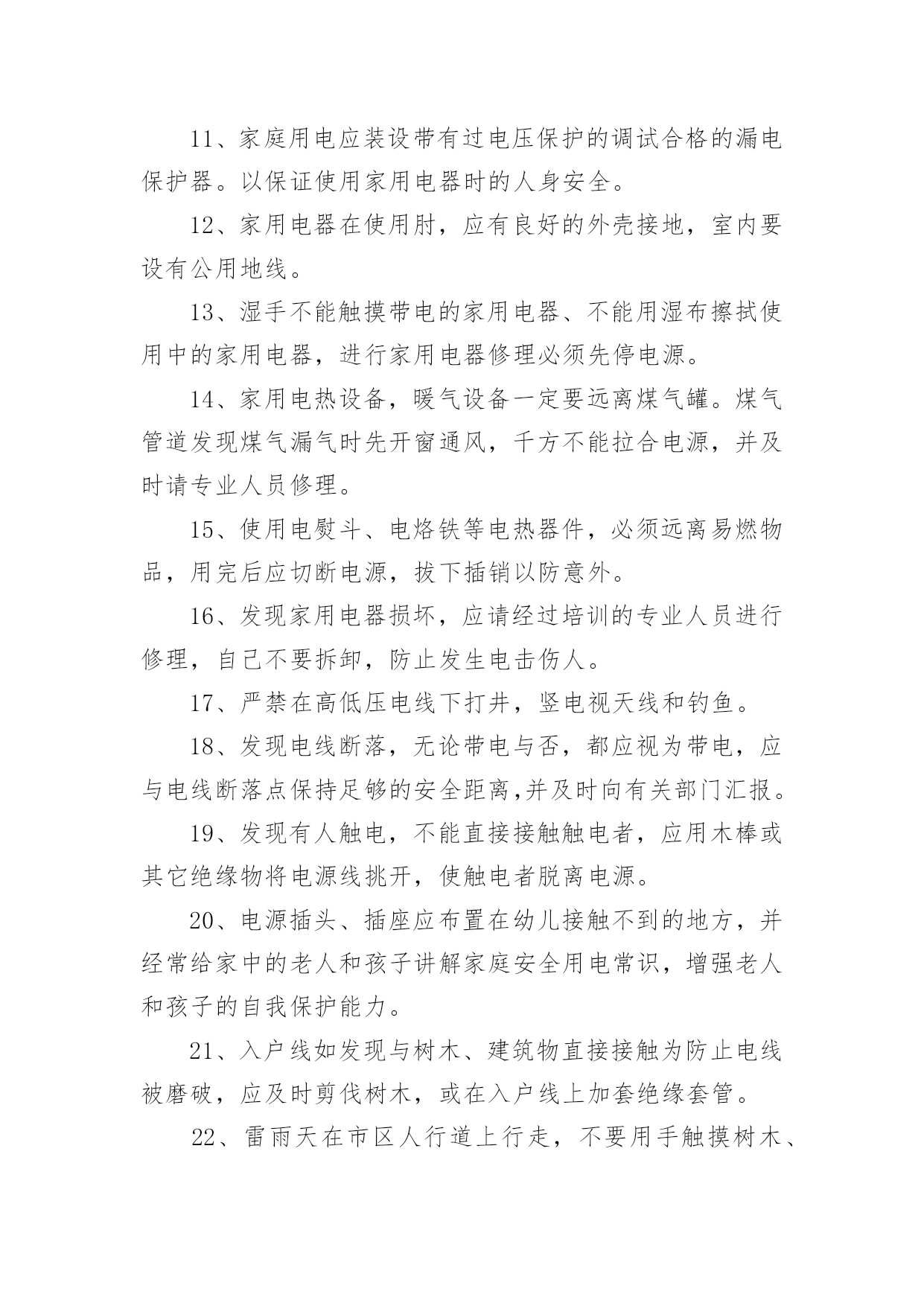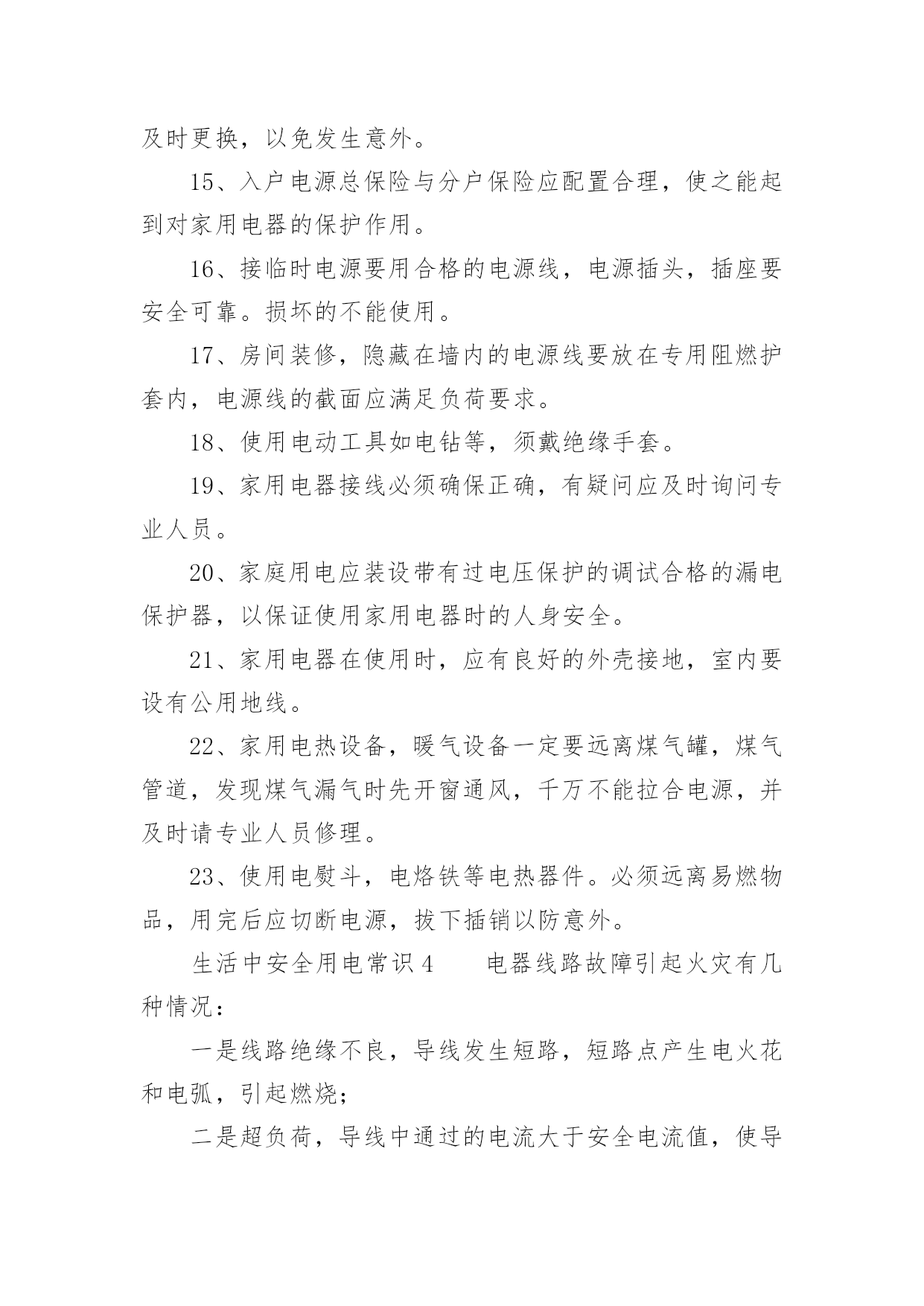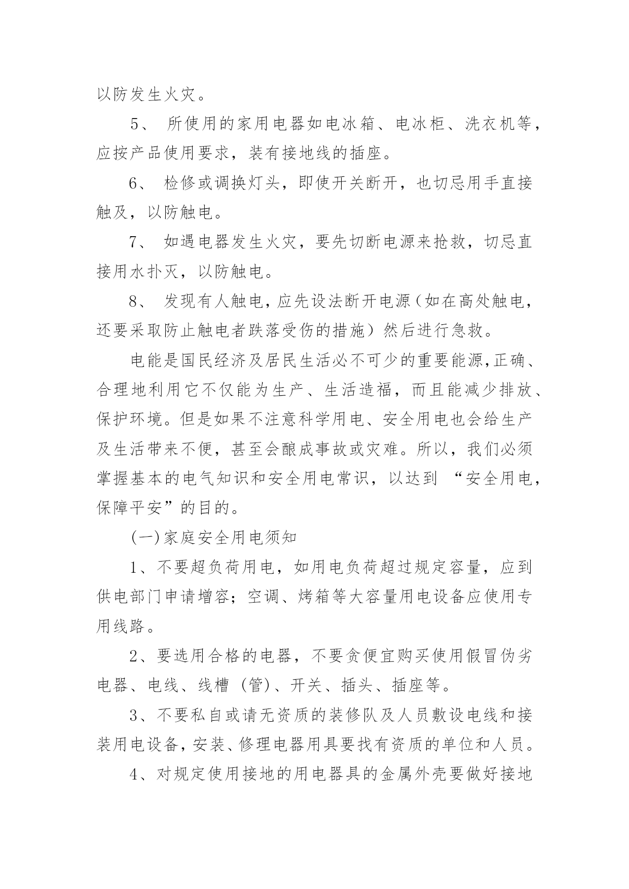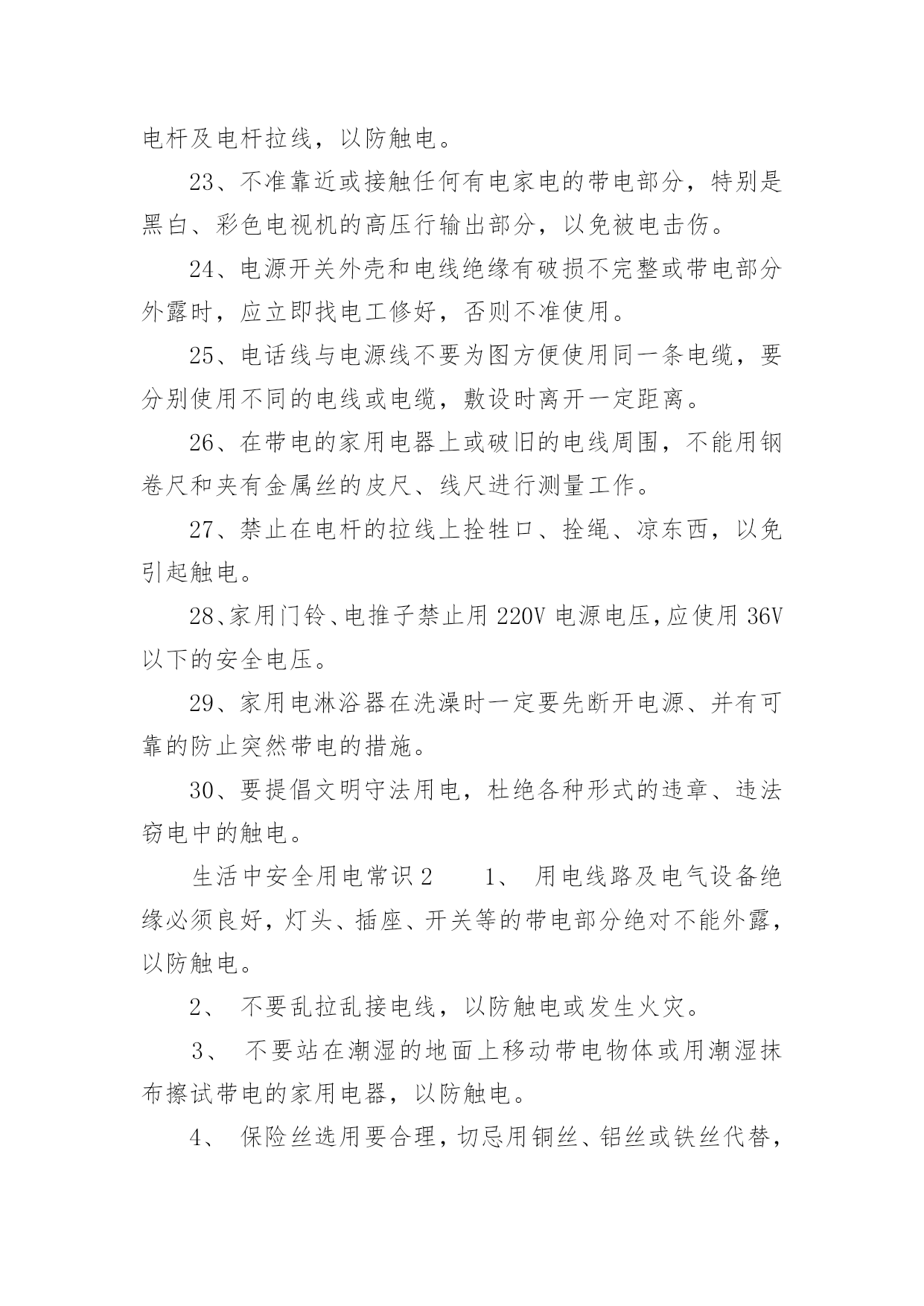 生活中安全用电常识生活中安全用电常识上学的时候,说到知识点,大家是不是都习惯性的重视?知识点就是学习的重点。哪些知识点能够真正帮助到我们呢?以下是小编整理的生活中安全用电常识,希望能够帮助到大家。生活中安全用电常识11、入户电源线避免过负荷使用,破旧老化的电源线应及时更换,以免发生意外2、入户电源总保险与分户保险应配置台理,使之能起到对家用电器的保护作用。3、接临时电源要用合格的电源线、电源插头、插座要安全可靠,损坏的不能使用,电源线接头要用胶布包好。4、临时电源线临近高压输电线路时,应与高压输电线路保持足够的安全距离(10KV及以下0.7米,35KV1米,110KVI.5米,220KV3米,500KV5米)。5、严禁私自从公用线路上接线。6、线路接头应确保接触良好,连接可靠。7、房间装修,隐藏在墙内的电源线要放在专用阻燃护套内,电源线的截面应满足负荷要求。8、使用电动工具如电钻等,须戴绝缘手套。9、遇有家用电器着火,应先切断电源再救火。10、家用电器接线必须确保正确。有疑问时应询问专业人员。11、家庭用电应装设带有过电压保护的调试合格的漏电保护器。以保证使用家用电器时的人身安全。12、家用电器在使用肘,应有良好的外壳接地,室内要设有公用地线。13、湿手不能触摸带电的家用电器、不能用湿布擦拭使用中的家用电器,进行家用电器修理必须先停电源。14、家用电热设备,暖气设备一定要远离煤气罐。煤气管道发现煤气漏气时先开窗通风,千方不能拉合电源,并及时请专业人员修理。15、使用电熨斗、电烙铁等电热器件,必须远离易燃物品,用完后应切断电源,拔下插销以防意外。16、发现家用电器损坏,应请经过培训的专业人员进行修理,自己不要拆卸,防止发生电击伤人。17、严禁在高低压电线下打井,竖电视天线和钓鱼。18、发现电线断落,无论带电与否,都应视为带电,应与电线断落点保持足够的安全距离,并及时向有关部门汇报。19、发现有人触电,不能直接接触触电者,应用木棒或其它绝缘物将电源线挑开,使触电者脱离电源。20、电源插头、插座应布置在幼儿接触不到的地方,并经常给家中的老人和孩子讲解家庭安全用电常识,增强老人和孩子的自我保护能力。21、入户线如发现与树木、建筑物直接接触为防止电线被磨破,应及时剪伐树木,或在入户线上加套绝缘套管。22、雷雨天在市区人行道上行走,不要用手触摸树木、电杆及电杆拉线,以防触电。23、不准靠近或接触任何有电家电的带电部分,特别是黑白、彩色电视机的高压行输出部分,以免被电击伤。24、电源开关外壳和电线绝缘有破损不完整或带电部分外露时,应立即找电工修好,否则不准使用。25、电话线与电源线不要为图方便使用同一条电缆,要分别使用不同的电线或电缆,敷设时离开一定距离。26、在带电的家用电器上或破旧的电线周围,不能用钢卷尺和夹有金属丝的皮尺、线尺进行测量工作。27、禁止在电杆的拉线上拴牲口、拴绳、凉东西,以免引起触电。28、家用门铃、电推子禁止用220V电源电压,应使用36V以下的安全电压。29、家用电淋浴器在洗澡时一定要先断开电源、并有可靠的防止突然带电的措施。30、要提倡文明守法用电,杜绝各种形式的违章、违法窃电中的触电。生活中安全用电常识21、用电线路及电气设备绝缘必须良好,灯头、插座、开关等的带电部分绝对不能外露,以防触电。2、不要乱拉乱接电线,以防触电或发生火灾。3、不要站在潮湿的地面上移动带电物体或用潮湿抹布擦试带电的家用电器,以防触电。4、保险丝选用要合理,切忌用铜丝、铝丝或铁丝代替,以防发生火灾。5、所使用的家用电器如电冰箱、电冰柜、洗衣机等,应按产品使用要求,装有接地线的插座。6、检修或调换灯头,即使开关断开,也切忌用手直接触及,以防触电。7、如遇电器发生火灾,要先切断电源来抢救,切忌直接用水扑灭,以防触电。8、发现有人触电,应先设法断开电源(如在高处触电,还要采取防止触电者跌落受伤的措施)然后进行急救。电能是国民经济及居民生活必不可少的重要能源,正确、合理地利用它不仅能为生产、生活造福,而且能减少排放、保护环境。但是如果不注意科学用电、安全用电也会给生产及生活带来不便,甚至会酿成事故或灾难。所以,我们必须掌握基本的电气知识和安全用电常识,以达到“安全用电,保障平安”的目的。(一)家庭安全用电须知1、不要超负荷用电,如用电负荷超过规定容量,应到供电部门申请增容;空调、烤箱等大容量用电设备应使用专用线路。2、要选用合格的电器,不要贪便宜购买使用假冒伪劣电器、电线、线槽(管)、开关、插头、插座等。3、不要私自或请无资质的装修队及人员敷设电线和接装用电设备,安装、修理电器用具要找有资质的单位和人员。4、对规定使用接地的用电器具的金属外壳要做好接地保护,不要忘记给三眼插座、插座盒安装接地线;不要随意将三眼插头改为两眼插头。5、要选用与电线负