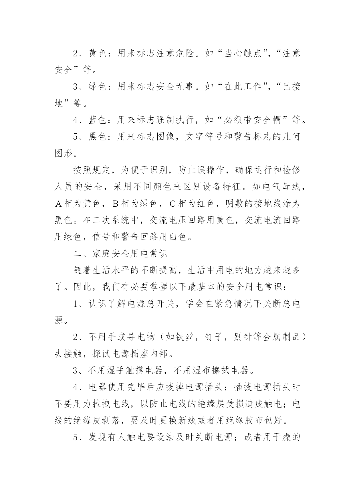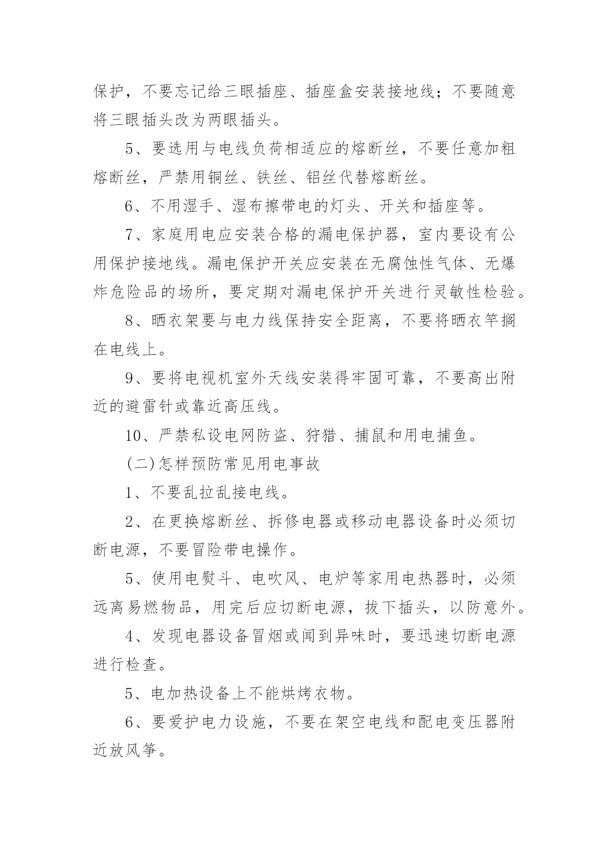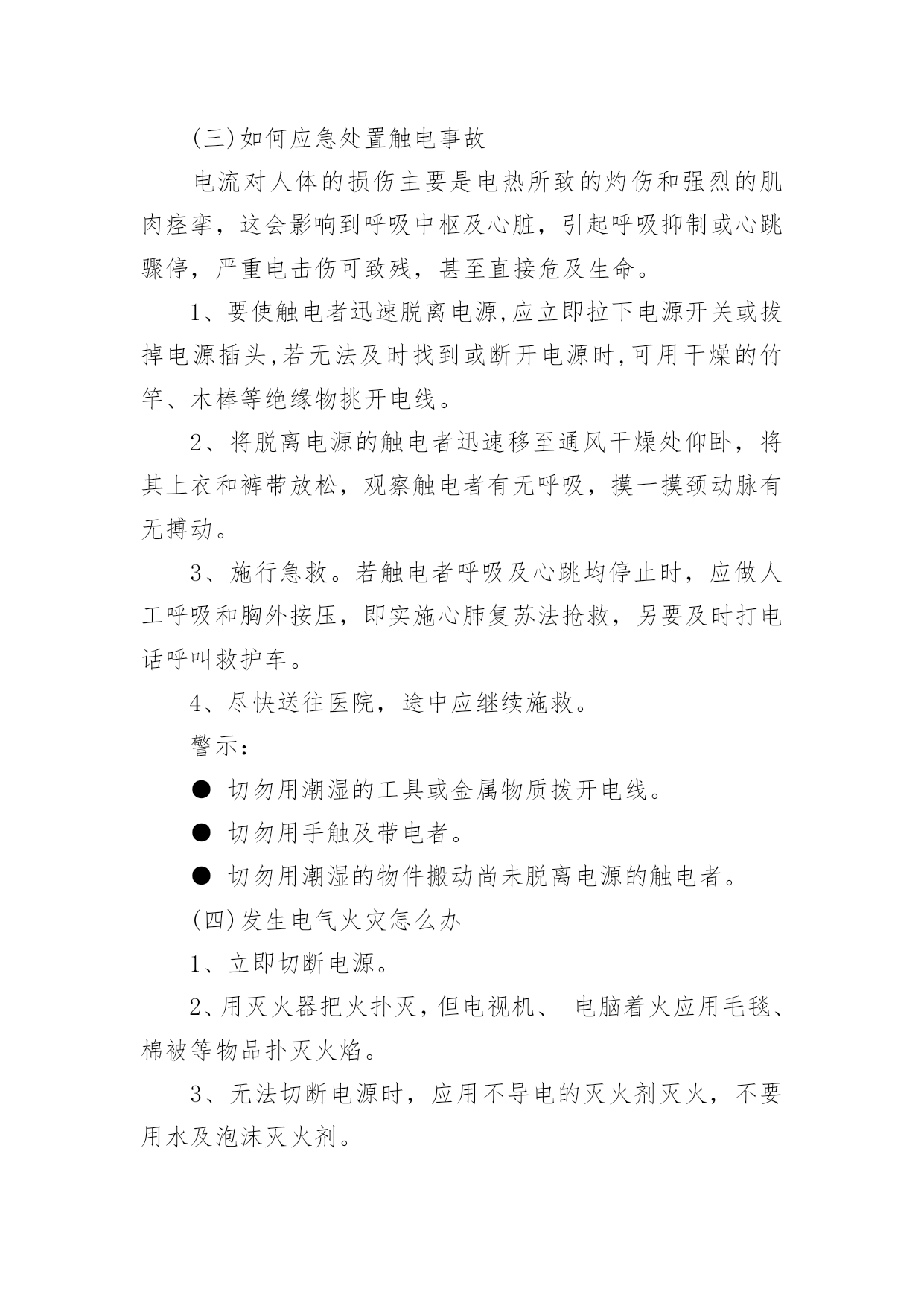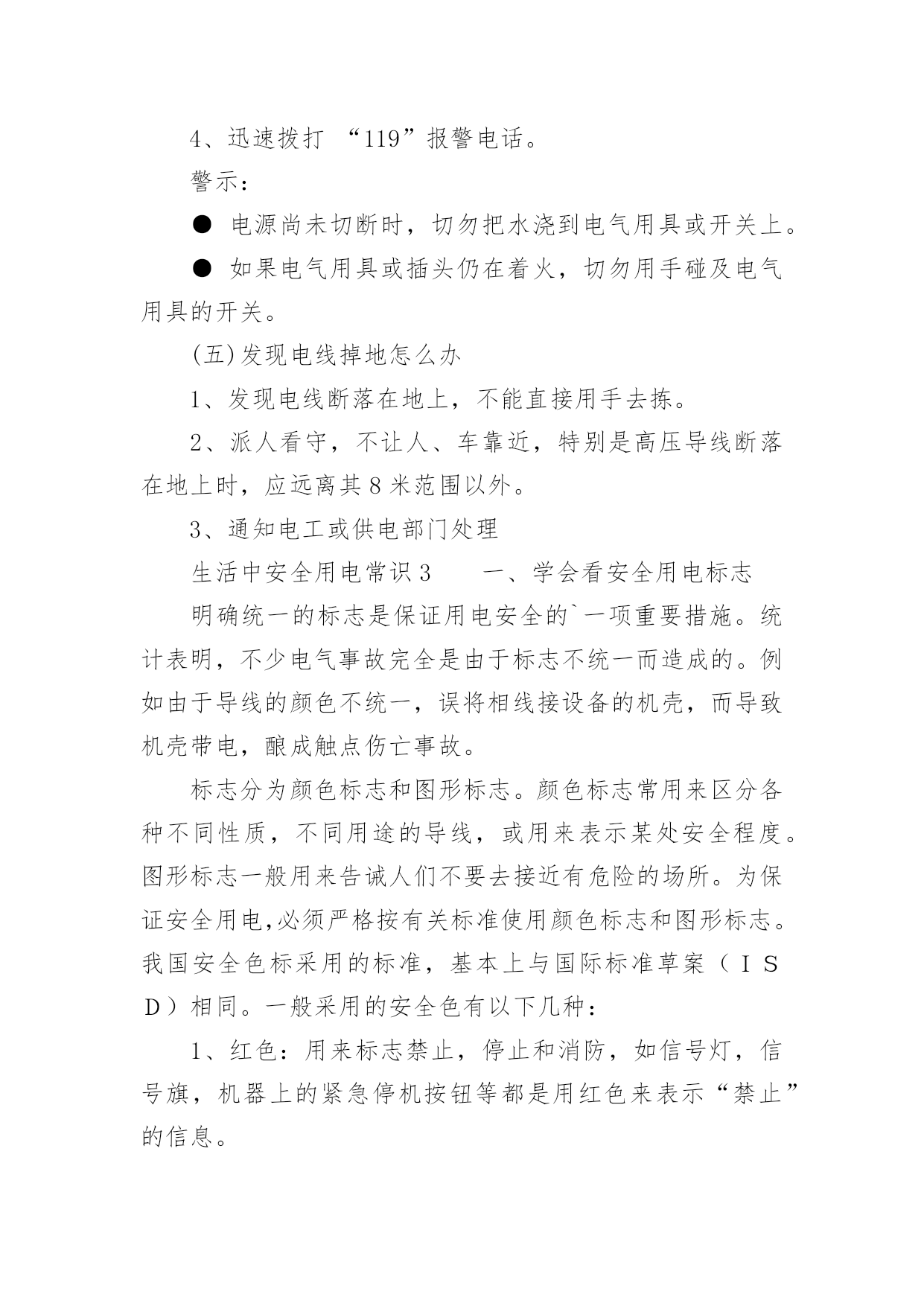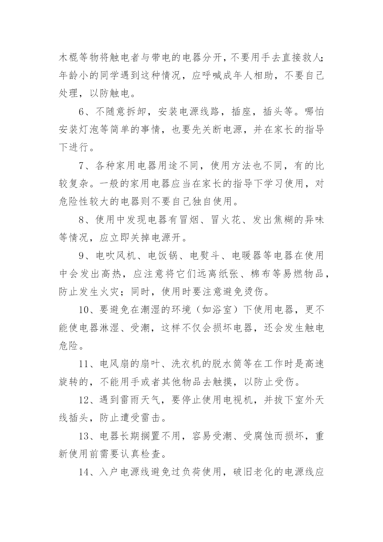 生活中安全用电常识生活中安全用电常识上学的时候,说到知识点,大家是不是都习惯性的重视?知识点就是学习的重点。哪些知识点能够真正帮助到我们呢?以下是小编整理的生活中安全用电常识,希望能够帮助到大家。生活中安全用电常识11、入户电源线避免过负荷使用,破旧老化的电源线应及时更换,以免发生意外2、入户电源总保险与分户保险应配置台理,使之能起到对家用电器的保护作用。3、接临时电源要用合格的电源线、电源插头、插座要安全可靠,损坏的不能使用,电源线接头要用胶布包好。4、临时电源线临近高压输电线路时,应与高压输电线路保持足够的安全距离(10KV及以下0.7米,35KV1米,110KVI.5米,220KV3米,500KV5米)。5、严禁私自从公用线路上接线。6、线路接头应确保接触良好,连接可靠。7、房间装修,隐藏在墙内的电源线要放在专用阻燃护套内,电源线的截面应满足负荷要求。8、使用电动工具如电钻等,须戴绝缘手套。9、遇有家用电器着火,应先切断电源再救火。10、家用电器接线必须确保正确。有疑问时应询问专业人员。11、家庭用电应装设带有过电压保护的调试合格的漏电保护器。以保证使用家用电器时的人身安全。12、家用电器在使用肘,应有良好的外壳接地,室内要设有公用地线。13、湿手不能触摸带电的家用电器、不能用湿布擦拭使用中的家用电器,进行家用电器修理必须先停电源。14、家用电热设备,暖气设备一定要远离煤气罐。煤气管道发现煤气漏气时先开窗通风,千方不能拉合电源,并及时请专业人员修理。15、使用电熨斗、电烙铁等电热器件,必须远离易燃物品,用完后应切断电源,拔下插销以防意外。16、发现家用电器损坏,应请经过培训的专业人员进行修理,自己不要拆卸,防止发生电击伤人。17、严禁在高低压电线下打井,竖电视天线和钓鱼。18、发现电线断落,无论带电与否,都应视为带电,应与电线断落点保持足够的安全距离,并及时向有关部门汇报。19、发现有人触电,不能直接接触触电者,应用木棒或其它绝缘物将电源线挑开,使触电者脱离电源。20、电源插头、插座应布置在幼儿接触不到的地方,并经常给家中的老人和孩子讲解家庭安全用电常识,增强老人和孩子的自我保护能力。21、入户线如发现与树木、建筑物直接接触为防止电线被磨破,应及时剪伐树木,或在入户线上加套绝缘套管。22、雷雨天在市区人行道上行走,不要用手触摸树木、电杆及电杆拉线,以防触电。23、不准靠近或接触任何有电家电的带电部分,特别是黑白、彩色电视机的高压行输出部分,以免被电击伤。24、电源开关外壳和电线绝缘有破损不完整或带电部分外露时,应立即找电工修好,否则不准使用。25、电话线与电源线不要为图方便使用同一条电缆,要分别使用不同的电线或电缆,敷设时离开一定距离。26、在带电的家用电器上或破旧的电线周围,不能用钢卷尺和夹有金属丝的皮尺、线尺进行测量工作。27、禁止在电杆的拉线上拴牲口、拴绳、凉东西,以免引起触电。28、家用门铃、电推子禁止用220V电源电压,应使用36V以下的安全电压。29、家用电淋浴器在洗澡时一定要先断开电源、并有可靠的防止突然带电的措施。30、要提倡文明守法用电,杜绝各种形式的违章、违法窃电中的触电。生活中安全用电常识21、用电线路及电气设备绝缘必须良好,灯头、插座、开关等的带电部分绝对不能外露,以防触电。2、不要乱拉乱接电线,以防触电或发生火灾。3、不要站在潮湿的地面上移动带电物体或用潮湿抹布擦试带电的家用电器,以防触电。4、保险丝选用要合理,切忌用铜丝、铝丝或铁丝代替,以防发生火灾。5、所使用的家用电器如电冰箱、电冰柜、洗衣机等,应按产品使用要求,装有接地线的插座。6、检修或调换灯头,即使开关断开,也切忌用手直接触及,以防触电。7、如遇电器发生火灾,要先切断电源来抢救,切忌直接用水扑灭,以防触电。8、发现有人触电,应先设法断开电源(如在高处触电,还要采取防止触电者跌落受伤的措施)然后进行急救。电能是国民经济及居民生活必不可少的重要能源,正确、合理地利用它不仅能为生产、生活造福,而且能减少排放、保护环境。但是如果不注意科学用电、安全用电也会给生产及生活带来不便,甚至会酿成事故或灾难。所以,我们必须掌握基本的电气知识和安全用电常识,以达到“安全用电,保障平安”的目的。(一)家庭安全用电须知1、不要超负荷用电,如用电负荷超过规定容量,应到供电部门申请增容;空调、烤箱等大容量用电设备应使用专用线路。2、要选用合格的电器,不要贪便宜购买使用假冒伪劣电器、电线、线槽(管)、开关、插头、插座等。3、不要私自或请无资质的装修队及人员敷设电线和接装用电设备,安装、修理电器用具要找有资质的单位和人员。4、对规定使用接地的用电器具的金属外壳要做好接地保护,不要忘记给三眼插座、插座盒安装接地线;不要随意将三眼插头改为两眼插头。5、要选用与电线负