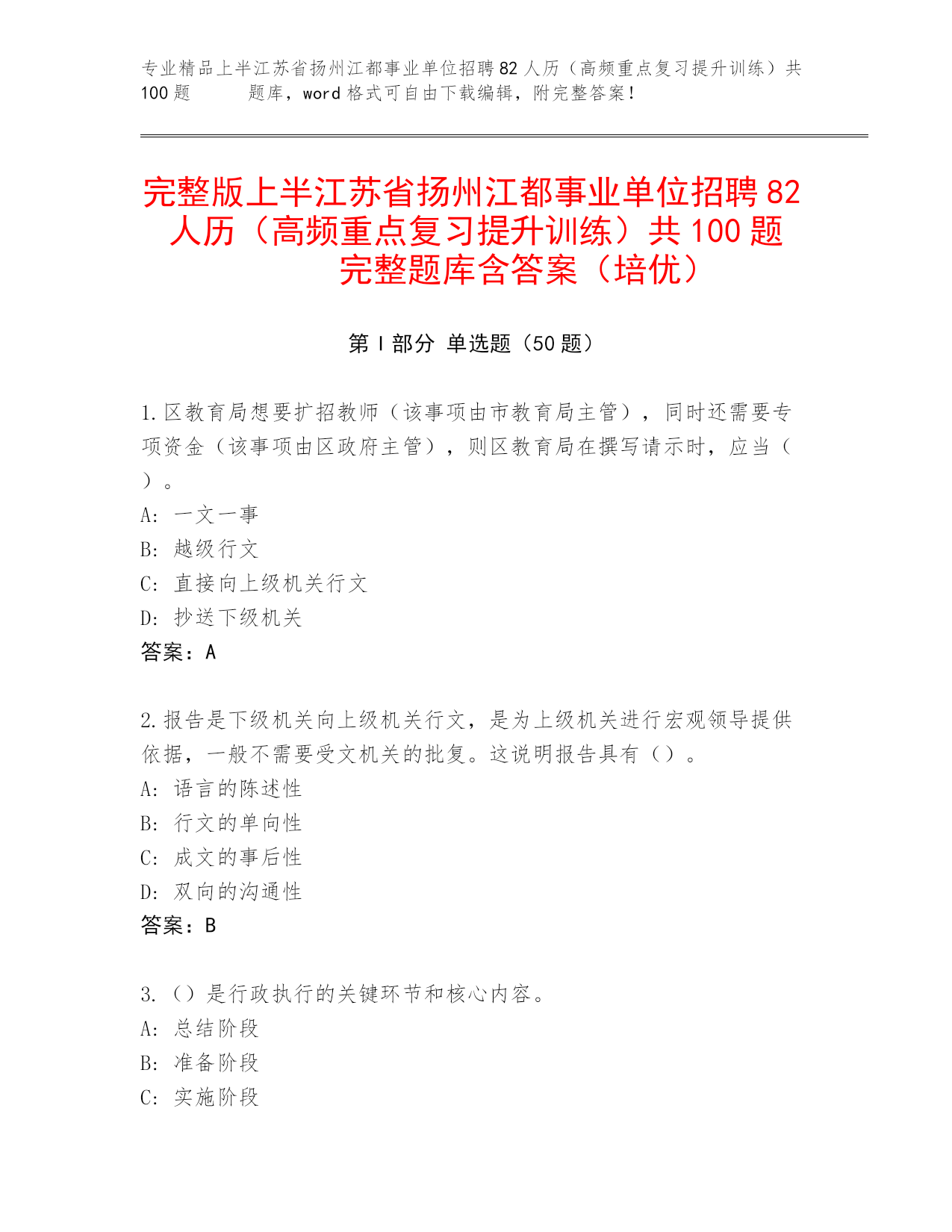 完整版上半江苏省扬州江都事业单位招聘82人历(高频重点复习提升训练)共100题 附答案【培优】