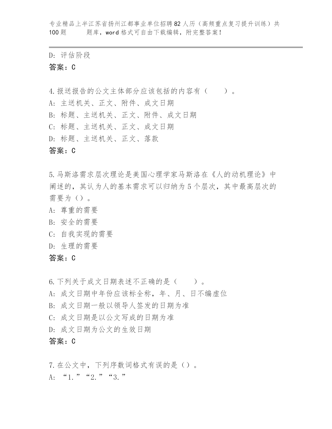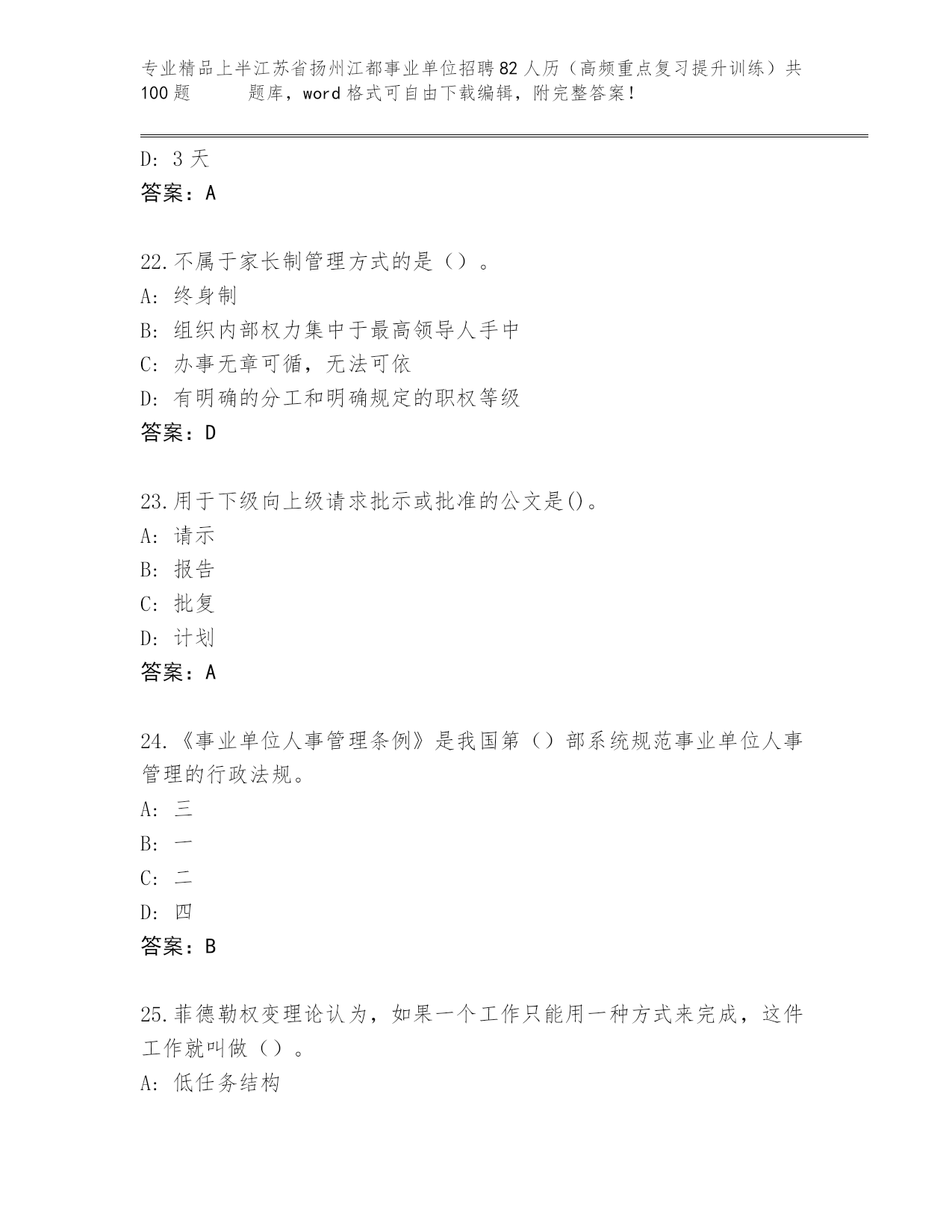 完整版上半江苏省扬州江都事业单位招聘82人历(高频重点复习提升训练)共100题 完整题库含答案(培优)