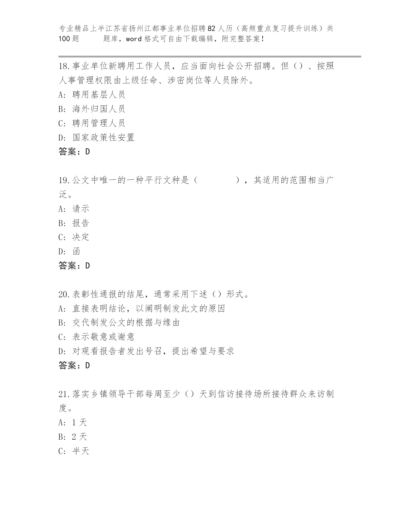 历年上半江苏省扬州江都事业单位招聘82人历(高频重点复习提升训练)共100题 题库及答案解析