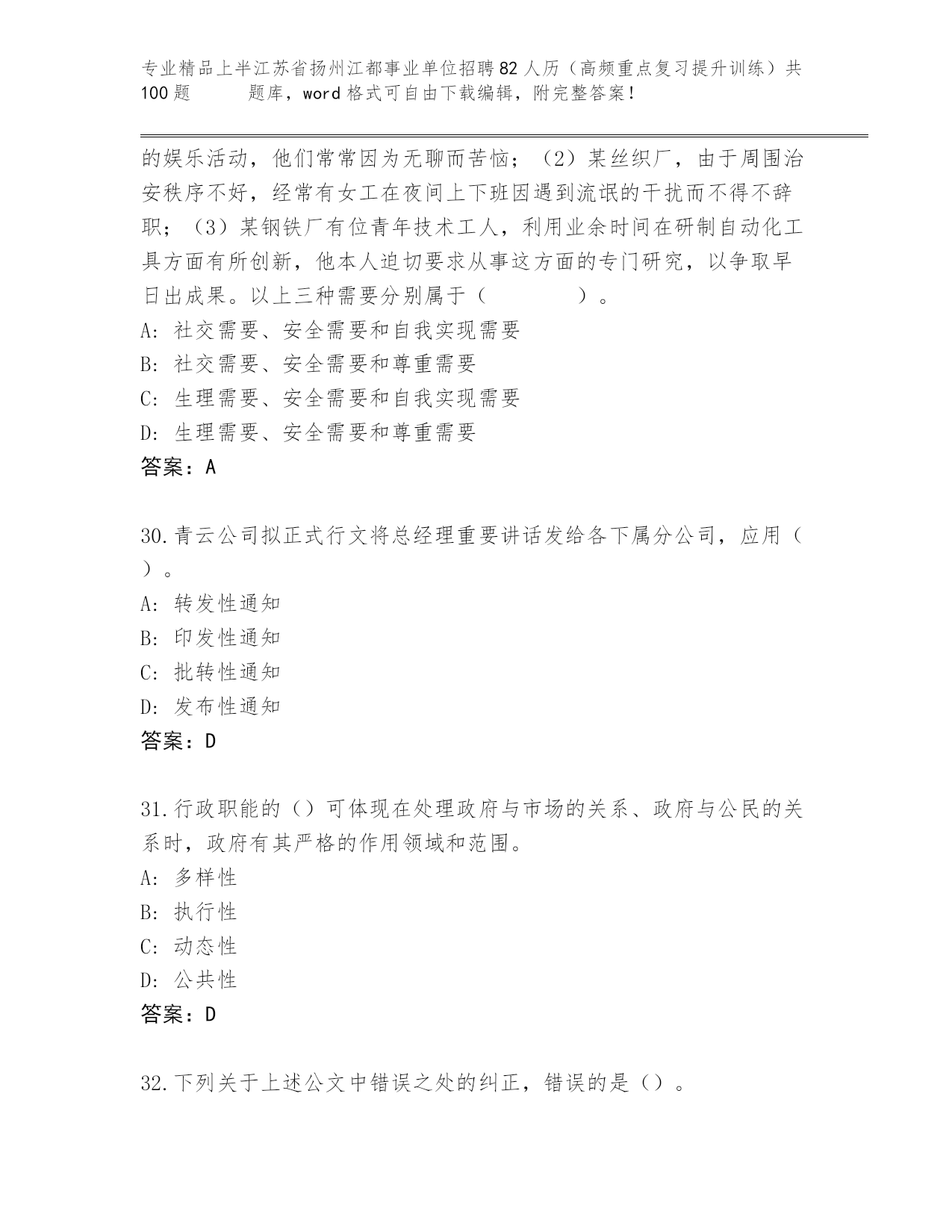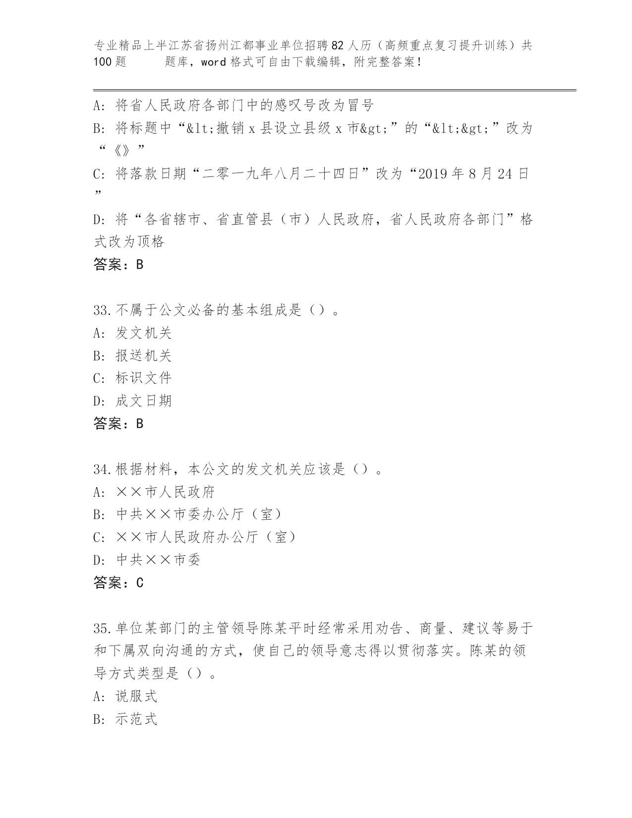 历年上半江苏省扬州江都事业单位招聘82人历(高频重点复习提升训练)共100题 王牌题库及答案参考