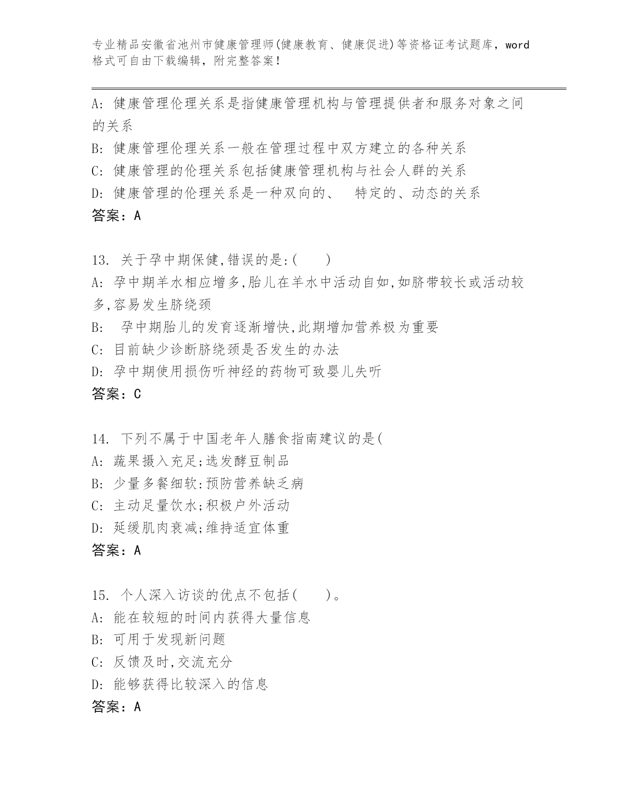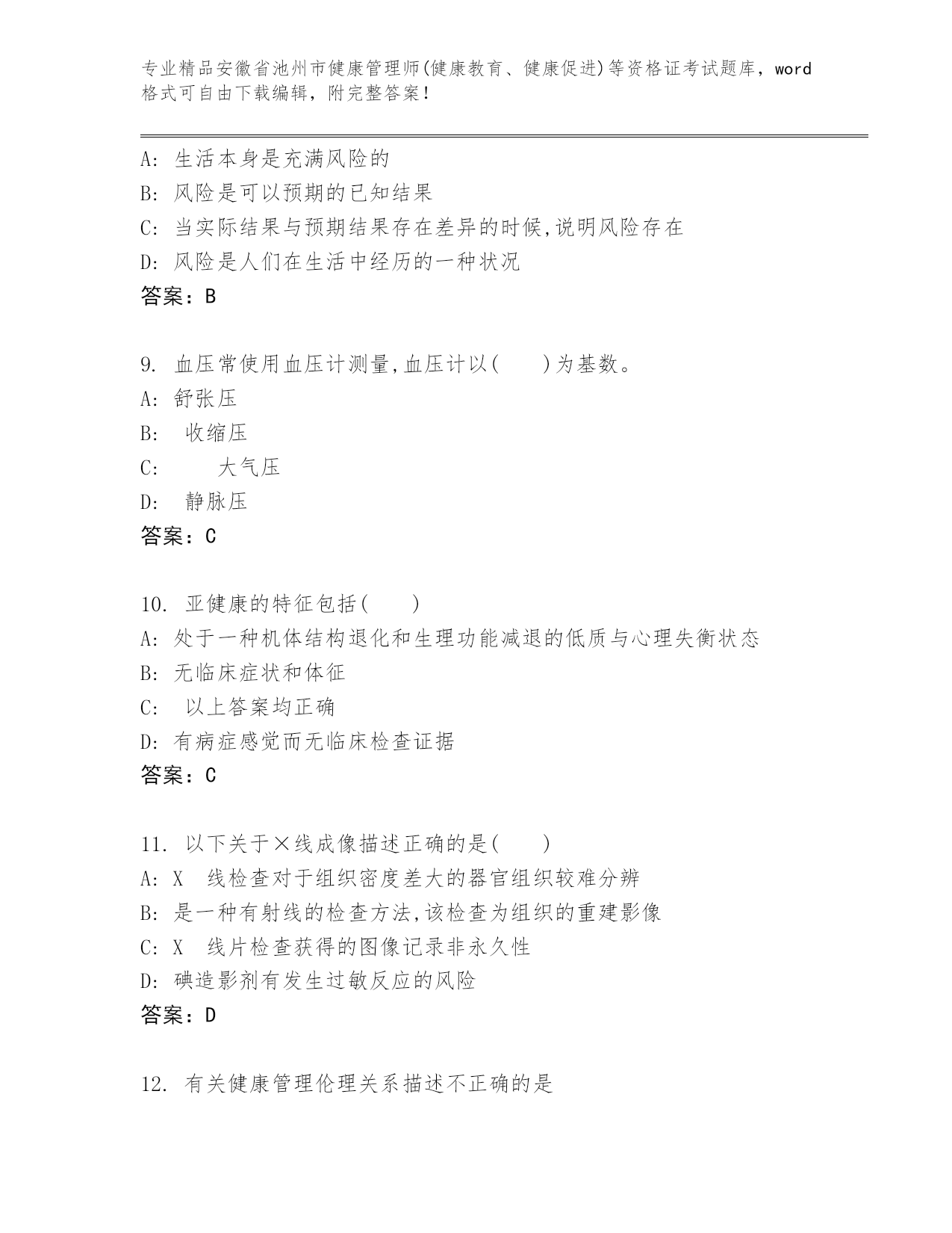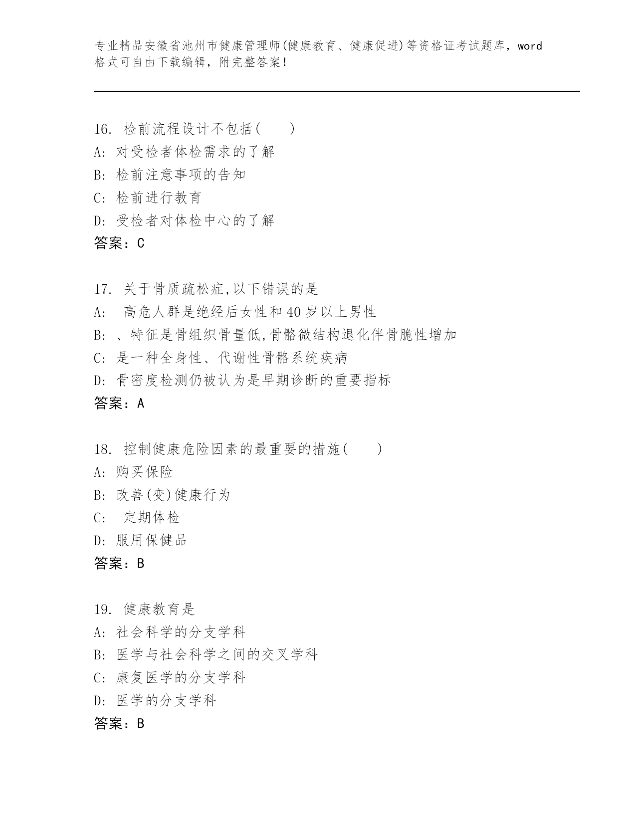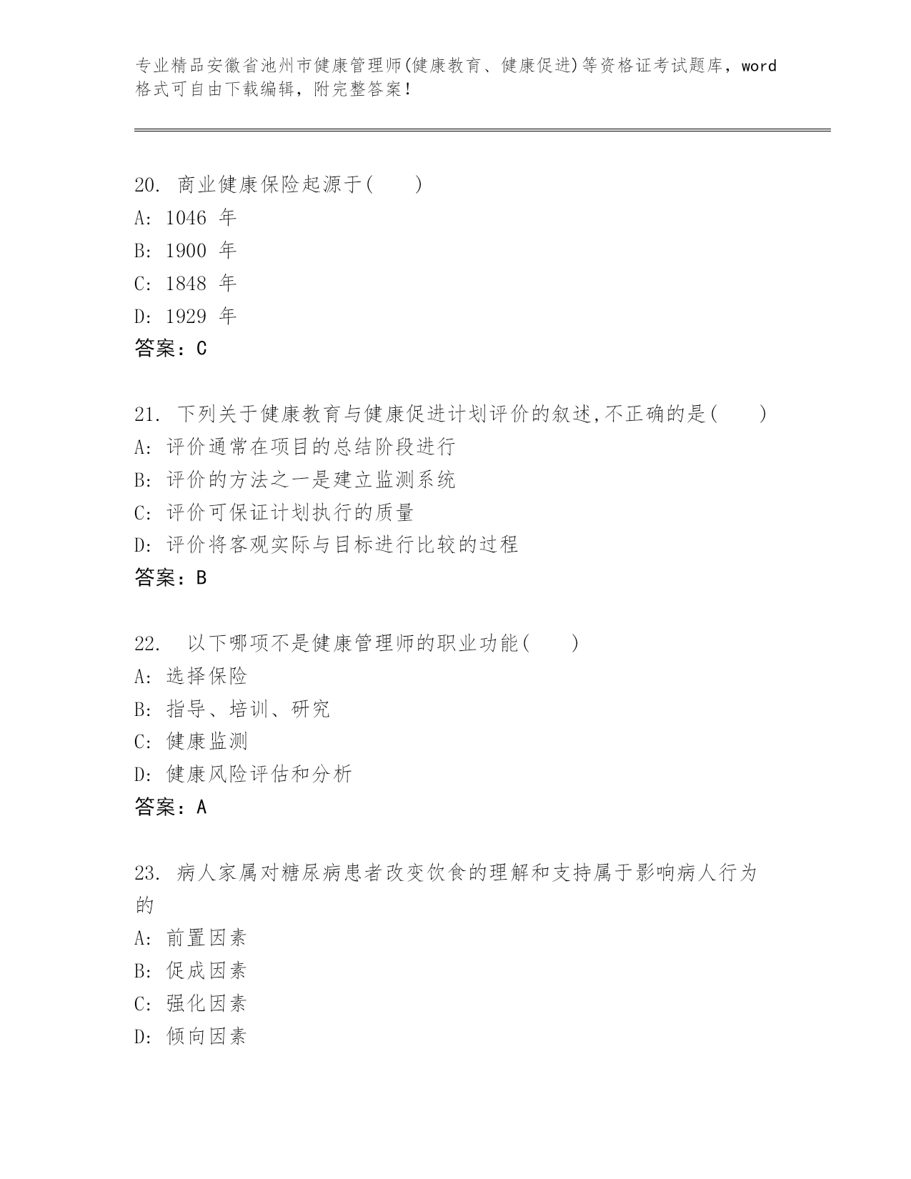 完整版安徽省池州市健康管理师(健康教育、健康促进)等资格证考试及答案(典优)