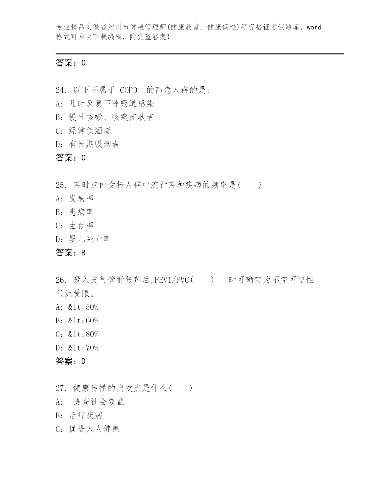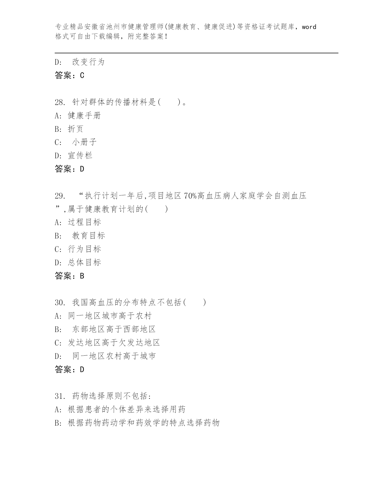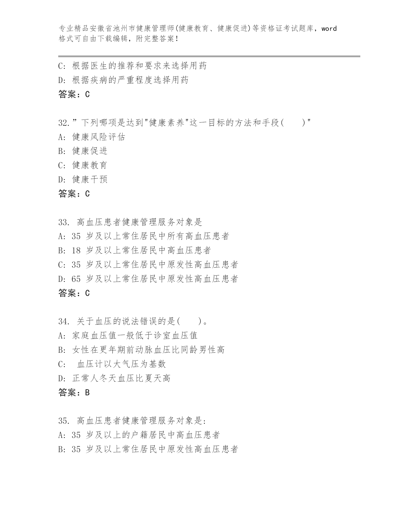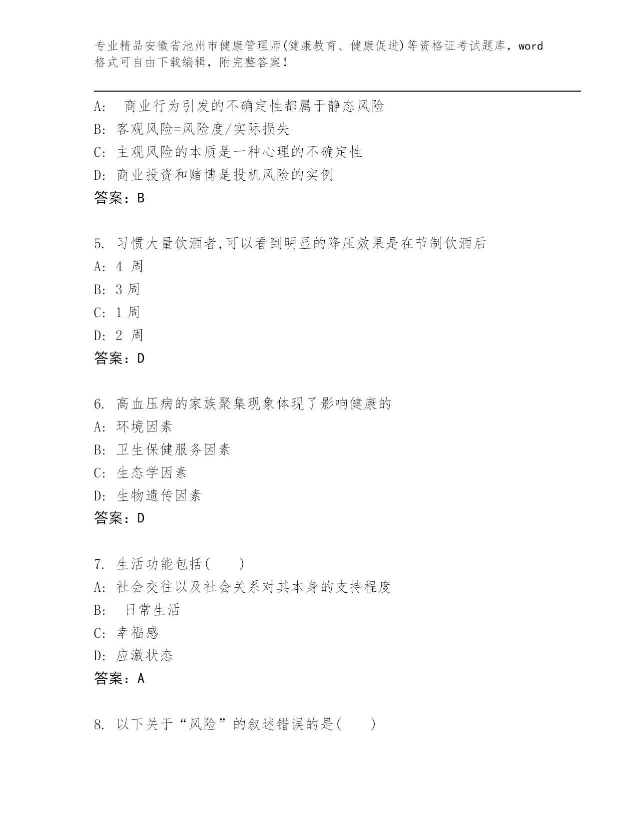 完整版安徽省池州市健康管理师(健康教育、健康促进)等资格证考试及答案(典优)