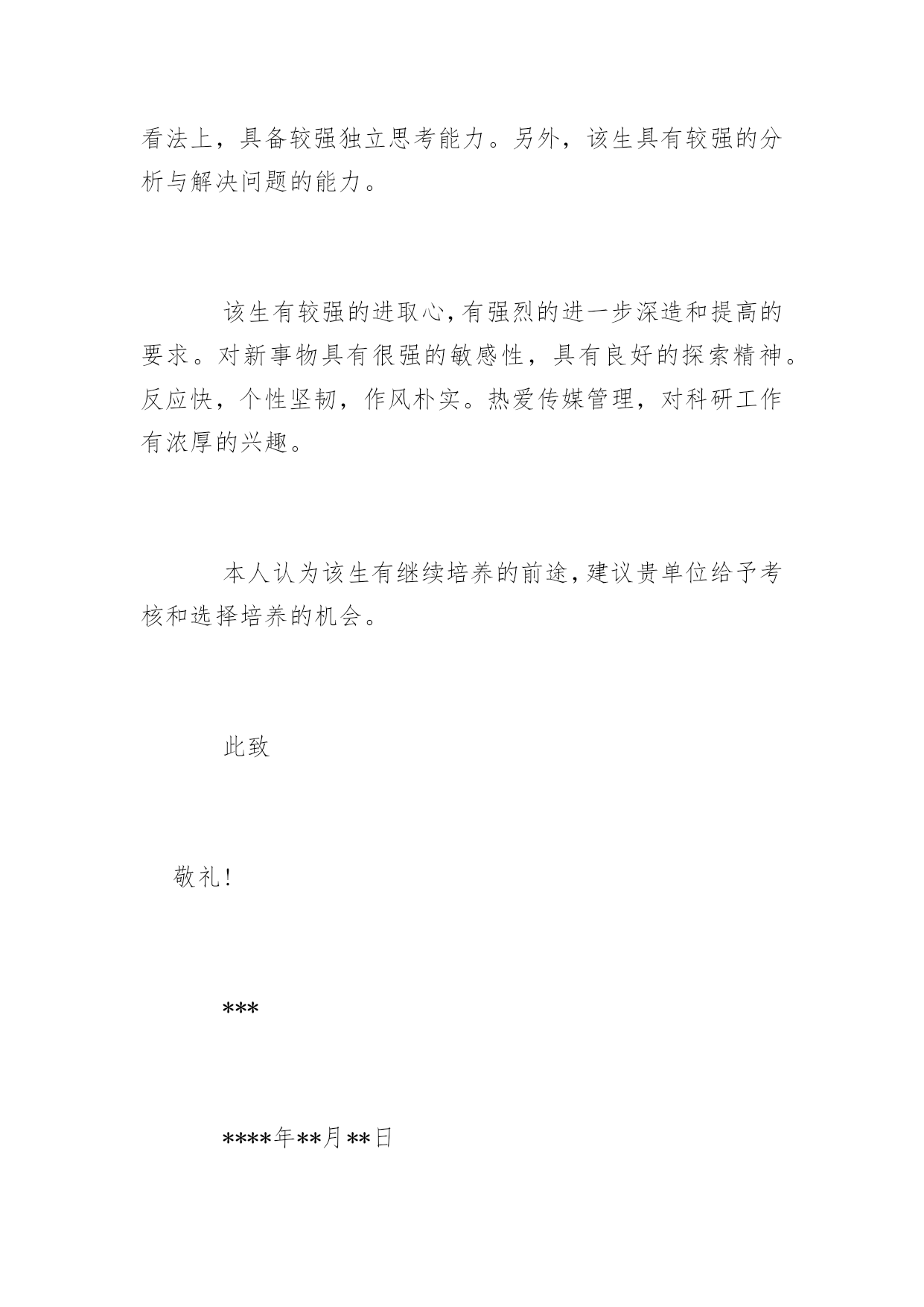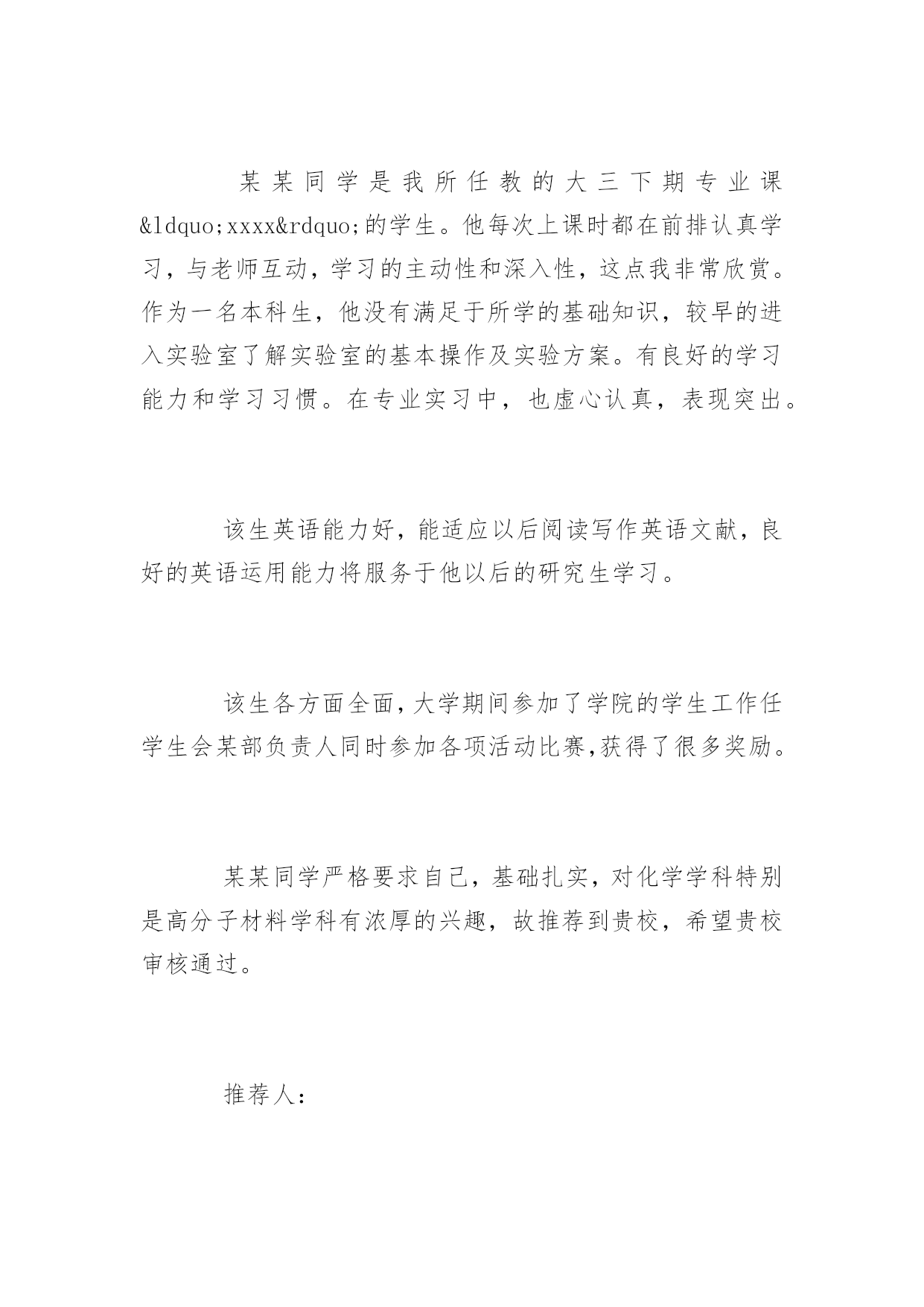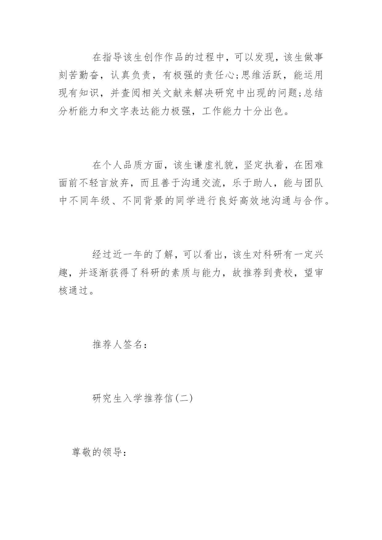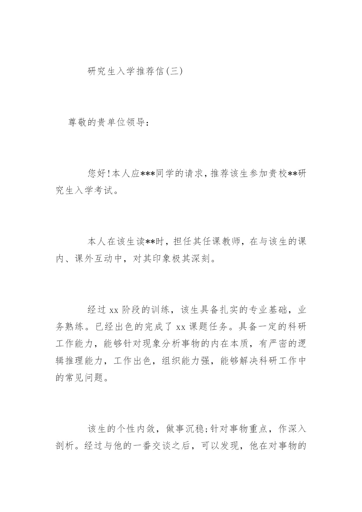 研究生入学信研究生入学推荐信研究生入学推荐信怎么写?下面小编给大家带来3篇研究生入学推荐信范文,希望对大家有所帮助!研究生入学推荐信(一)尊敬的领导:本人应**同学请求,推荐该生到**大学进行研究生阶段的学习。本人是该生在**大学本科生阶段的系主任,曾指导该生参加第十届“挑战杯”大学生课外学术科技作品竞赛。在指导该生创作作品的过程中,可以发现,该生做事刻苦勤奋,认真负责,有极强的责任心;思维活跃,能运用现有知识,并查阅相关文献来解决研究中出现的问题;总结分析能力和文字表达能力极强,工作能力十分出色。在个人品质方面,该生谦虚礼貌,坚定执着,在困难面前不轻言放弃,而且善于沟通交流,乐于助人,能与团队中不同年级、不同背景的同学进行良好高效地沟通与合作。经过近一年的了解,可以看出,该生对科研有一定兴趣,并逐渐获得了科研的素质与能力,故推荐到贵校,望审核通过。推荐人签名:研究生入学推荐信(二)尊敬的领导:某某同学是我所任教的大三下期专业课“xxxx”的学生。他每次上课时都在前排认真学习,与老师互动,学习的主动性和深入性,这点我非常欣赏。作为一名本科生,他没有满足于所学的基础知识,较早的进入实验室了解实验室的基本操作及实验方案。有良好的学习能力和学习习惯。在专业实习中,也虚心认真,表现突出。该生英语能力好,能适应以后阅读写作英语文献,良好的英语运用能力将服务于他以后的研究生学习。该生各方面全面,大学期间参加了学院的学生工作任学生会某部负责人同时参加各项活动比赛,获得了很多奖励。某某同学严格要求自己,基础扎实,对化学学科特别是高分子材料学科有浓厚的兴趣,故推荐到贵校,希望贵校审核通过。推荐人:研究生入学推荐信(三)尊敬的贵单位领导:您好!本人应***同学的请求,推荐该生参加贵校**研究生入学考试。本人在该生读**时,担任其任课教师,在与该生的课内、课外互动中,对其印象极其深刻。经过xx阶段的训练,该生具备扎实的专业基础,业务熟练。已经出色的完成了xx课题任务。具备一定的科研工作能力,能够针对现象分析事物的内在本质,有严密的逻辑推理能力,工作出色,组织能力强,能够解决科研工作中的常见问题。该生的个性内敛,做事沉稳;针对事物重点,作深入剖析。经过与他的一番交谈之后,可以发现,他在对事物的看法上,具备较强独立思考能力。另外,该生具有较强的分析与解决问题的能力。该生有较强的进取心,有强烈的进一步深造和提高的要求。对新事物具有很强的敏感性,具有良好的探索精神。反应快,个性坚韧,作风朴实。热爱传媒管理,对科研工作有浓厚的兴趣。本人认为该生有继续培养的前途,建议贵单位给予考核和选择培养的机会。此致敬礼!*******年**月**日
