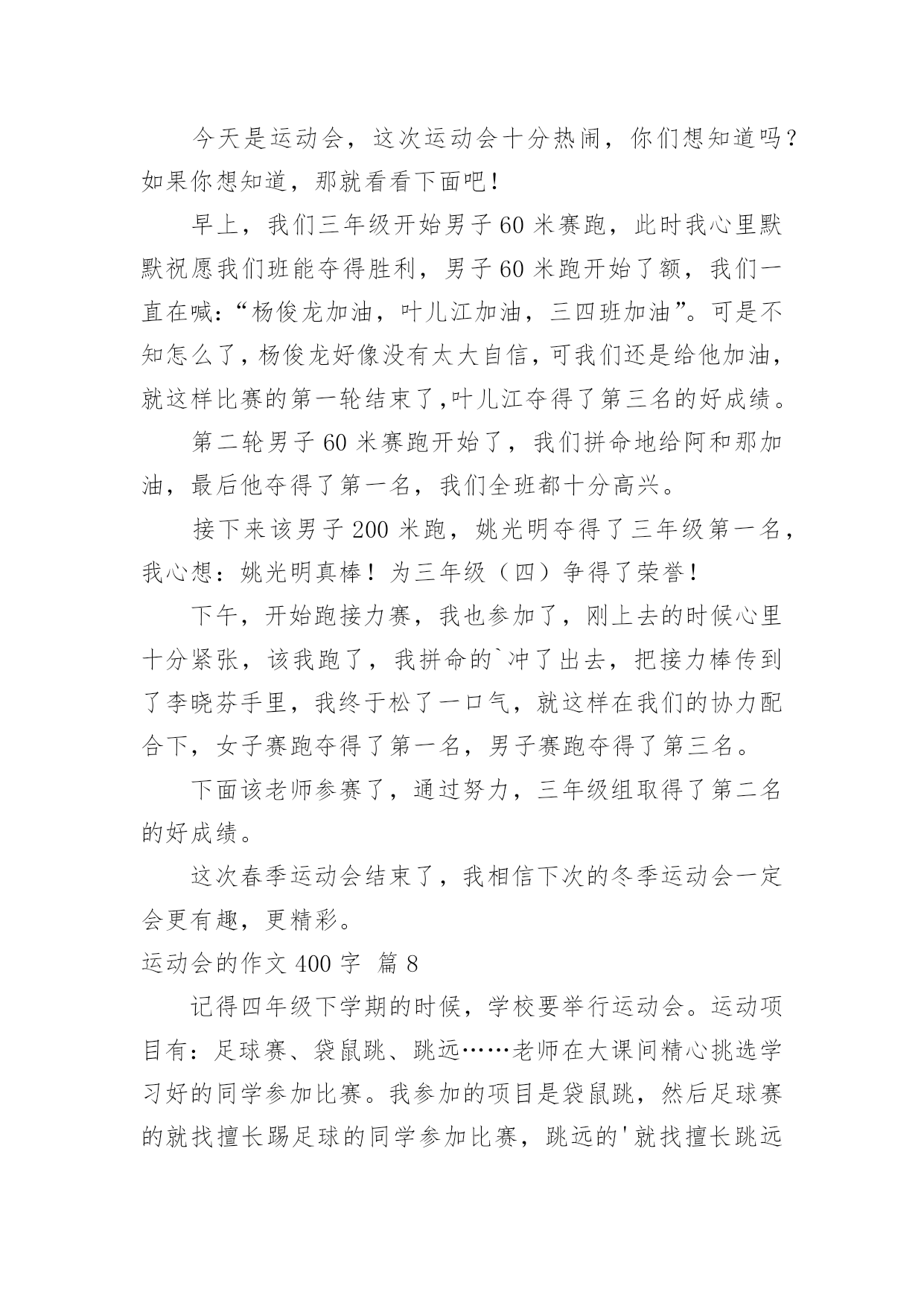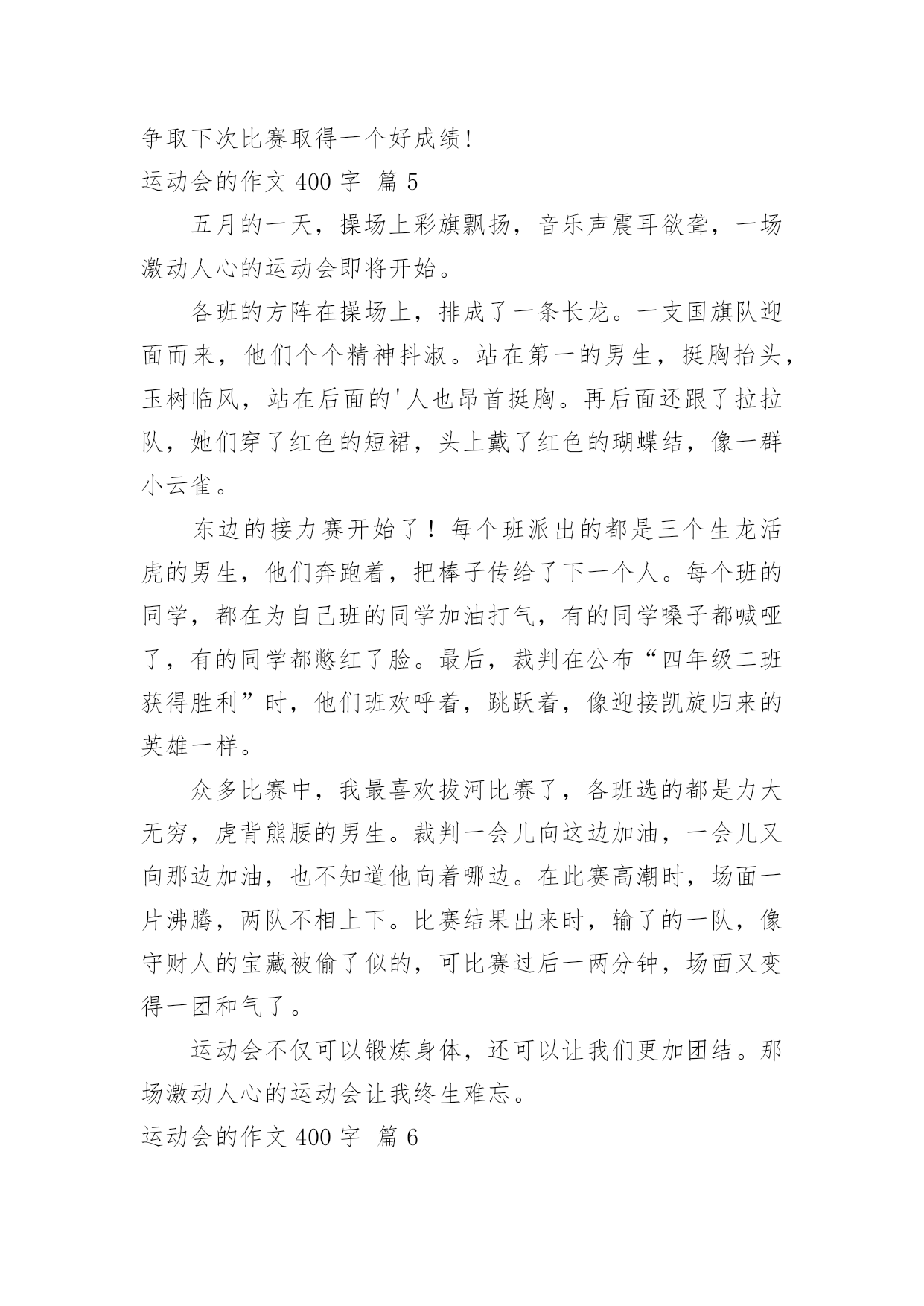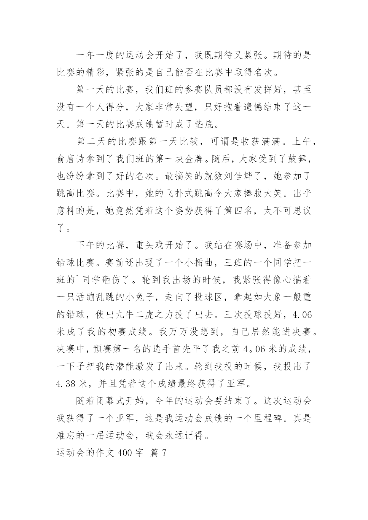 运动会的作文400字[优选]运动会的作文400字在日常学习、工作和生活中,大家总免不了要接触或使用作文吧,作文是由文字组成,经过人的思想考虑,通过语言组织来表达一个主题意义的文体。怎么写作文才能避免踩雷呢?以下是小编帮大家整理的运动会的作文400字8篇,仅供参考,希望能够帮助到大家。运动会的作文400字篇1一年一度的学校运动会终于拉开序幕啦!我对这次运动会可充满了期待,因为我被选中参加接力跑比赛。我们这次很有把握,因为我们练习地可认真了。再加上我们有几个跑的很快的'“必杀技”。他们几个跑起来就像风一样呼呼吹过,一眨眼的功夫就跑完了。比如陈坜谐同学,50米9秒多就跑到了。运动会开幕式结束后,接力跑正式开始啦!我们30个人先换好运动服,排好队伍,向操场跑去。这次的接力跑有6个班级参加,我看着这么多选手都蓄势待发,心脏几乎都快从嘴巴里跳出来了。起跑的发令枪一响,第一棒的同学吴晓悦像飞毛腿导弹一样冲了出去,很快超过了其他班的同学。接下来其他同学跑得也非常顺利。可是当轮到周宇翰时,可怕的事情发生了!他居然掉了棒子!大家都惊呆了!他马上捡起棒子,快速地追赶其他班级同学。可是其他班同学已经远远超过了他。很快就轮到我了,我是第7棒。我飞快地奔跑着,在心里说:“再快点!再快点!要赢啦!”终于到了终点。比赛结束以后,我们得了第二名!我们开心极了!虽然没有拿第一名,但是第二名也很不错呀!运动会的作文400字篇2火辣辣的太阳照着大地,今天我们要举行运动会。听到这个消息,大家都觉得自己的耳朵是不是出现幻觉听错了?在这样高温的天气里开运动会,那不是要人命吗?在一个连小花都要枯死的天气里坐在操场上,那可真是一种特别的感受。运动会的第一个项目是三人四足跑。听到老师的喊声,运动员们纷纷跑到了操场上,用红领巾系着脚脖子。老师还让一名同学高喊:四(9)班,而其余同学则大喊:加油!比赛开始了,我们班的运动员们状态良好,配合默契,一个个飞快地跑着。再看看四(8)班运动员,那可真叫可怜啊——只见中间一个人节奏一时没跟上,结果三人都摔倒在了地上,那样子真是惨不忍睹。第二个项目是抱球跑。一个人抱着两个篮球跑。第一个出场的`是崔子怡,随着老师的一声大喊:“准备,开始。”只见她抱着球飞快地向男生队跑去,迅速把球传给了接力的男生。这样来回跑动着,运动员虽然一个个都汗流满面,可却依然不敢有丝毫的松懈,经过残酷的比拼,最终,我们班获得了冠军的头衔。同学们高兴地欢呼着、跳跃着。回到班里,老师也显得心情愉悦,给我们每个小组加了20分,我的心里感到前所未有的自豪与兴奋。看来,团结就是力量。运动会的作文400字篇3伴着清晨的第一缕阳光,我精神抖擞地从家出发,走向学校。此时,我的心情特别激动,因为今天是我升入初中以来的第一次运动会。运动员们天天训练,就是为了这一天,真期待他们能有出色的表现。刚走进教室,就看到一片沸腾的景象:同学们在那儿打打闹闹,运动员们则做热身运动,准备迎接挑战……看来,这会是一场别开生面的运动会。七点半,这个让人激动的时刻,我们学校的运动会终于开始了。首先是开幕式,鼓号队、彩旗队、裁判员、还有各个班级的运动员,都陆续入场。听着鼓号声,看着彩旗飘扬,再看看运动员们个个精神抖擞,信心十足的样子,真让人羡慕,这种场面我还是第一次见,我也恨不得上去走一圈。运动会正式开始。运动员们个个使足了劲,一展风采。其中让我最佩服的就是我们班的刁涵超同学,他在第一次比赛中不小心把腿给磕破了,一跑步就疼,后面的男子4×100接力赛,同学们都劝他别跑了,多休息一下,可他却坚持参加比赛,我们都很担心他。随着枪声一响,男子4×100接力赛开始了,全班的.同学都在呐喊,为运动员加油,到了关键的最后一棒,只见受了伤的刁涵超同学,接过接力棒拼命奔跑,我们的心都提到了嗓子眼,担心他再一次受伤……离终点还有三米、两米、一米,哦耶,我们班是第一名!当运动员回来时,全班同学都为他们鼓掌,因为他们是我们班的英雄、我们班的骄傲!我相信,这将是一段难以抹去的记忆。运动会的作文400字篇4“下周举行运动会,谁想参加?”老师话音刚落,同学们异口同声:“我,我,我!”经过老师的深思熟虑,选出了我班的运动小将们,而我,也在其中。运动会终于盼来了,我们班的同学个个精神抖擞,排着整齐的队伍来到操场上集合。已经有一大批学生都到了。哨声一响,比赛开始了,首先是单人跳绳,也是我要参加的项目。看着别的.年级的同学再比赛,我的心情不由得紧张起来,心脏好像要跳出来一样。仿佛过了好久好久才轮到我们上场。“一、二、三......”时间在一分一秒地流逝,我已经精疲力竭了,正要放慢速度,突然听到耳边一阵呐喊声:“加油!陶涵!”我又立刻鼓足干劲跳了起来,恨不得拥有闪电般的速度追上她们。“叮”,时间到了,虽然我已经竭尽全力,但是最终还是输给了二班。我垂头