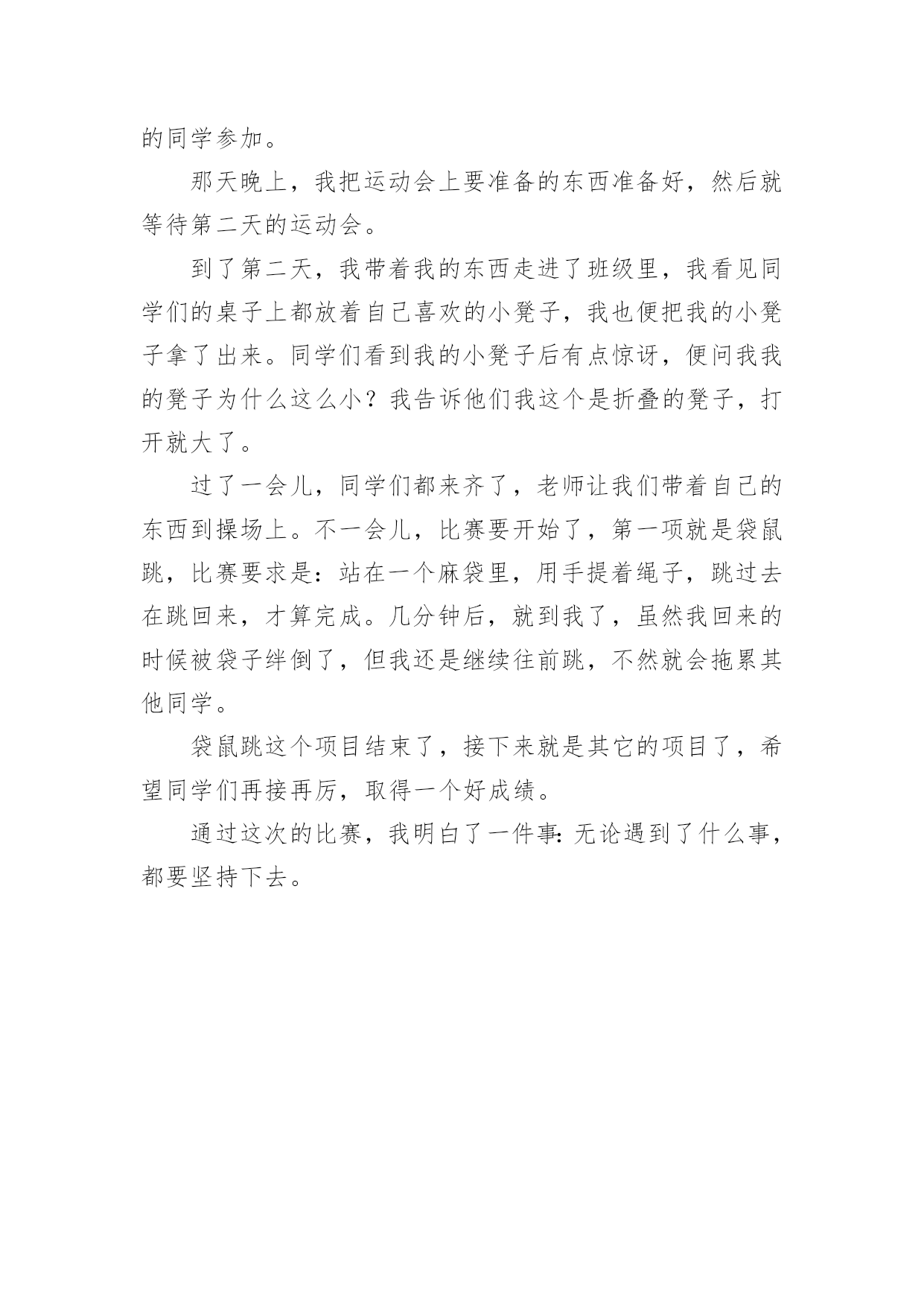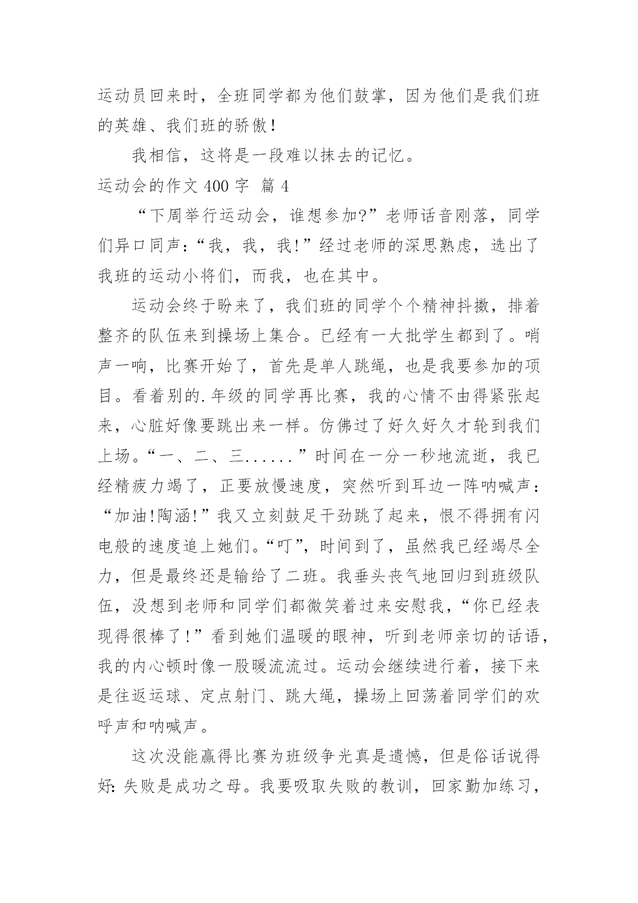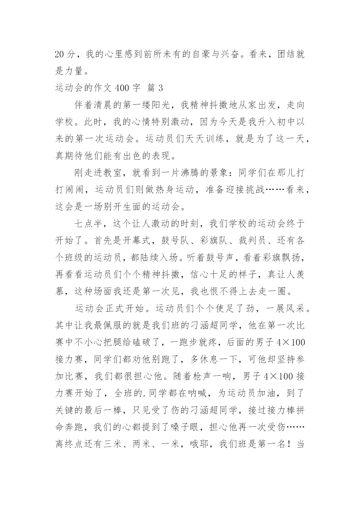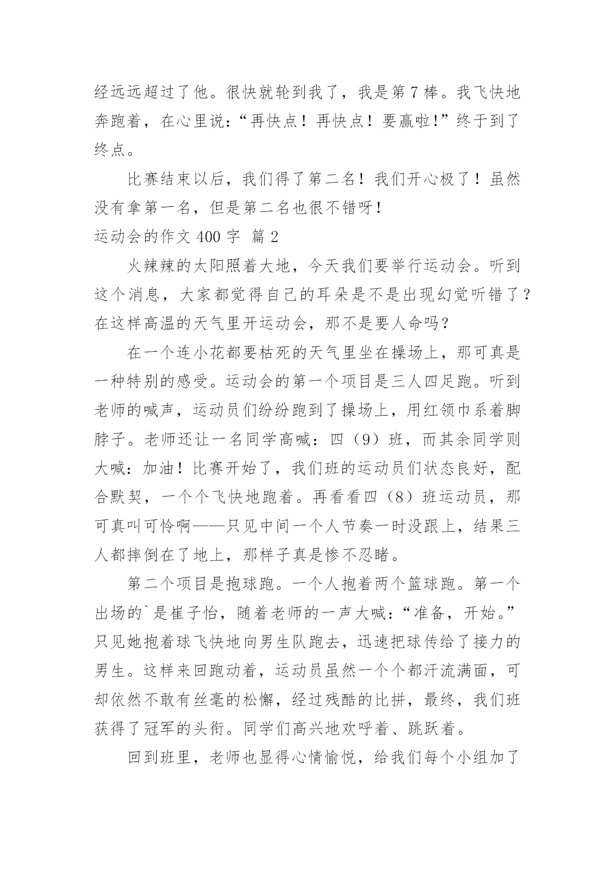 运动会的作文400字[优选]运动会的作文400字在日常学习、工作和生活中,大家总免不了要接触或使用作文吧,作文是由文字组成,经过人的思想考虑,通过语言组织来表达一个主题意义的文体。怎么写作文才能避免踩雷呢?以下是小编帮大家整理的运动会的作文400字8篇,仅供参考,希望能够帮助到大家。运动会的作文400字篇1一年一度的学校运动会终于拉开序幕啦!我对这次运动会可充满了期待,因为我被选中参加接力跑比赛。我们这次很有把握,因为我们练习地可认真了。再加上我们有几个跑的很快的'“必杀技”。他们几个跑起来就像风一样呼呼吹过,一眨眼的功夫就跑完了。比如陈坜谐同学,50米9秒多就跑到了。运动会开幕式结束后,接力跑正式开始啦!我们30个人先换好运动服,排好队伍,向操场跑去。这次的接力跑有6个班级参加,我看着这么多选手都蓄势待发,心脏几乎都快从嘴巴里跳出来了。起跑的发令枪一响,第一棒的同学吴晓悦像飞毛腿导弹一样冲了出去,很快超过了其他班的同学。接下来其他同学跑得也非常顺利。可是当轮到周宇翰时,可怕的事情发生了!他居然掉了棒子!大家都惊呆了!他马上捡起棒子,快速地追赶其他班级同学。可是其他班同学已经远远超过了他。很快就轮到我了,我是第7棒。我飞快地奔跑着,在心里说:“再快点!再快点!要赢啦!”终于到了终点。比赛结束以后,我们得了第二名!我们开心极了!虽然没有拿第一名,但是第二名也很不错呀!运动会的作文400字篇2火辣辣的太阳照着大地,今天我们要举行运动会。听到这个消息,大家都觉得自己的耳朵是不是出现幻觉听错了?在这样高温的天气里开运动会,那不是要人命吗?在一个连小花都要枯死的天气里坐在操场上,那可真是一种特别的感受。运动会的第一个项目是三人四足跑。听到老师的喊声,运动员们纷纷跑到了操场上,用红领巾系着脚脖子。老师还让一名同学高喊:四(9)班,而其余同学则大喊:加油!比赛开始了,我们班的运动员们状态良好,配合默契,一个个飞快地跑着。再看看四(8)班运动员,那可真叫可怜啊——只见中间一个人节奏一时没跟上,结果三人都摔倒在了地上,那样子真是惨不忍睹。第二个项目是抱球跑。一个人抱着两个篮球跑。第一个出场的`是崔子怡,随着老师的一声大喊:“准备,开始。”只见她抱着球飞快地向男生队跑去,迅速把球传给了接力的男生。这样来回跑动着,运动员虽然一个个都汗流满面,可却依然不敢有丝毫的松懈,经过残酷的比拼,最终,我们班获得了冠军的头衔。同学们高兴地欢呼着、跳跃着。回到班里,老师也显得心情愉悦,给我们每个小组加了20分,我的心里感到前所未有的自豪与兴奋。看来,团结就是力量。运动会的作文400字篇3伴着清晨的第一缕阳光,我精神抖擞地从家出发,走向学校。此时,我的心情特别激动,因为今天是我升入初中以来的第一次运动会。运动员们天天训练,就是为了这一天,真期待他们能有出色的表现。刚走进教室,就看到一片沸腾的景象:同学们在那儿打打闹闹,运动员们则做热身运动,准备迎接挑战……看来,这会是一场别开生面的运动会。七点半,这个让人激动的时刻,我们学校的运动会终于开始了。首先是开幕式,鼓号队、彩旗队、裁判员、还有各个班级的运动员,都陆续入场。听着鼓号声,看着彩旗飘扬,再看看运动员们个个精神抖擞,信心十足的样子,真让人羡慕,这种场面我还是第一次见,我也恨不得上去走一圈。运动会正式开始。运动员们个个使足了劲,一展风采。其中让我最佩服的就是我们班的刁涵超同学,他在第一次比赛中不小心把腿给磕破了,一跑步就疼,后面的男子4×100接力赛,同学们都劝他别跑了,多休息一下,可他却坚持参加比赛,我们都很担心他。随着枪声一响,男子4×100接力赛开始了,全班的.同学都在呐喊,为运动员加油,到了关键的最后一棒,只见受了伤的刁涵超同学,接过接力棒拼命奔跑,我们的心都提到了嗓子眼,担心他再一次受伤……离终点还有三米、两米、一米,哦耶,我们班是第一名!当运动员回来时,全班同学都为他们鼓掌,因为他们是我们班的英雄、我们班的骄傲!我相信,这将是一段难以抹去的记忆。运动会的作文400字篇4“下周举行运动会,谁想参加?”老师话音刚落,同学们异口同声:“我,我,我!”经过老师的深思熟虑,选出了我班的运动小将们,而我,也在其中。运动会终于盼来了,我们班的同学个个精神抖擞,排着整齐的队伍来到操场上集合。已经有一大批学生都到了。哨声一响,比赛开始了,首先是单人跳绳,也是我要参加的项目。看着别的.年级的同学再比赛,我的心情不由得紧张起来,心脏好像要跳出来一样。仿佛过了好久好久才轮到我们上场。“一、二、三......”时间在一分一秒地流逝,我已经精疲力竭了,正要放慢速度,突然听到耳边一阵呐喊声:“加油!陶涵!”我又立刻鼓足干劲跳了起来,恨不得拥有闪电般的速度追上她们。“叮”,时间到了,虽然我已经竭尽全力,但是最终还是输给了二班。我垂头