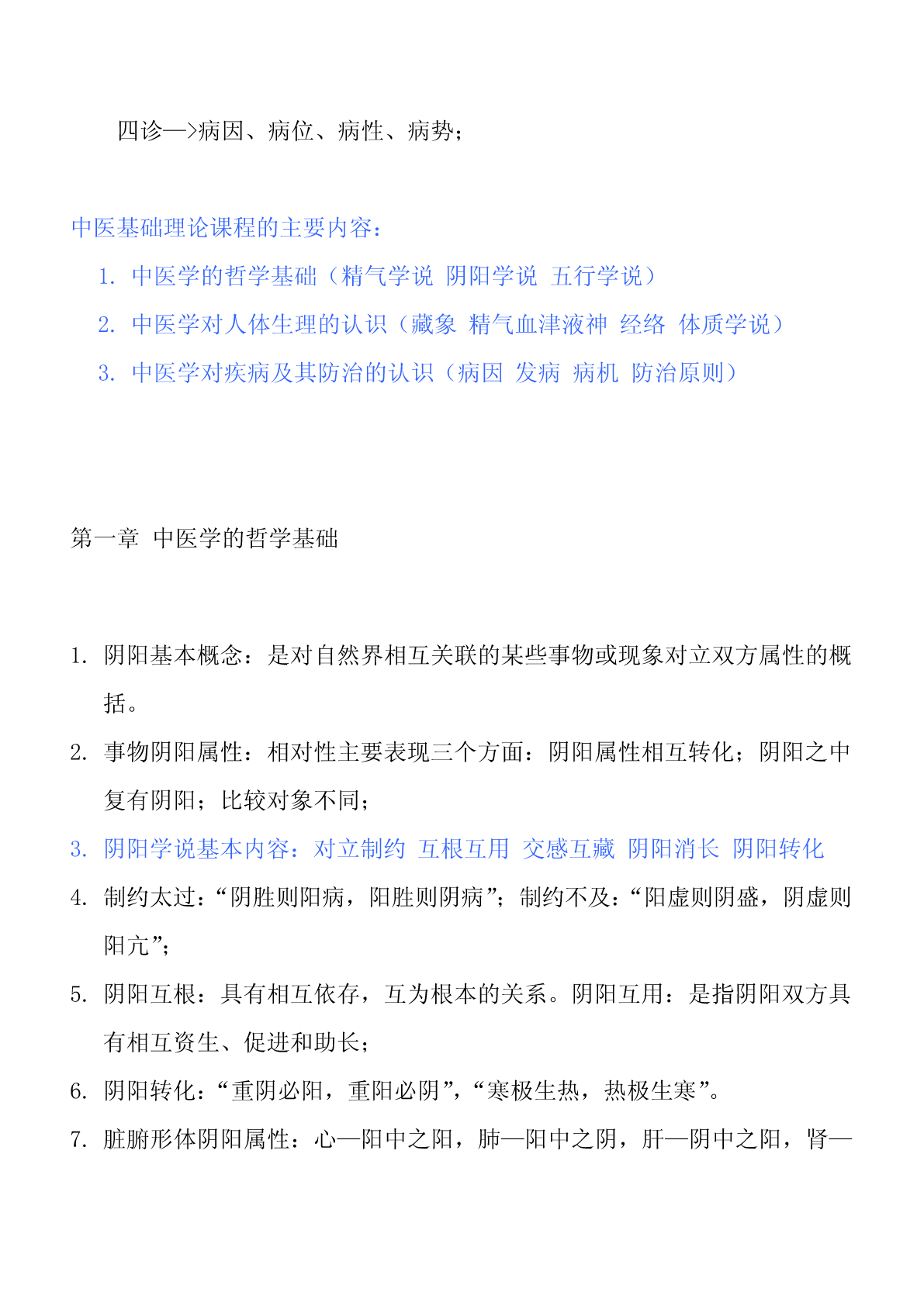 中医基础理论教材重点笔记阿杰营养师整理作品绪论1.中医学理论体系确立:战国至秦汉时期;《黄帝内经》《难经》《伤寒论》《神农本草经》等医学问世。2.金元四大家:刘完素(寒凉派);张从正(攻邪派);李杲、李东坦(补土派);朱震亨、朱丹溪(滋阴派)3.中医学理论体系主要特点是:一、整体观念;二、辨证论治;4.整体观念:主要体现于:人体自身的整体性,人与自然环境、与社会环境的统一性;5.辨证论治:是中医学认识疾病和处理疾病的基本原则;6.病、证、症的基本概念:病,即疾病,是致病邪气作用于人体,人体正气与之抗争而引起的机体阴阳失调、脏腑组织损伤、生理机能失常或心理活动障碍的一个完整的生命过程。证,即证侯,是疾病过程中某一阶段或某一类型的病理概括。症,即症状和体征是病和证的基本要素。病的重点是全过程,而证的重点在现阶段。四诊—>病因、病位、病性、病势;中医基础理论课程的主要内容:1.中医学的哲学基础(精气学说阴阳学说五行学说)2.中医学对人体生理的认识(藏象精气血津液神经络体质学说)3.中医学对疾病及其防治的认识(病因发病病机防治原则)第一章中医学的哲学基础1.阴阳基本概念:是对自然界相互关联的某些事物或现象对立双方属性的概括。2.事物阴阳属性:相对性主要表现三个方面:阴阳属性相互转化;阴阳之中复有阴阳;比较对象不同;3.阴阳学说基本内容:对立制约互根互用交感互藏阴阳消长阴阳转化4.制约太过:“阴胜则阳病,阳胜则阴病”;制约不及:“阳虚则阴盛,阴虚则阳亢”;5.阴阳互根:具有相互依存,互为根本的关系。阴阳互用:是指阴阳双方具有相互资生、促进和助长;6.阴阳转化:“重阴必阳,重阳必阴”,“寒极生热,热极生寒”。7.脏腑形体阴阳属性:心—阳中之阳,肺—阳中之阴,肝—阴中之阳,肾—阴中之阴,脾—阴中之至阴;8.概括人体生理功能:“阴平阳秘,精神乃治;阴阳离决,精气乃绝”。9.阴阳分析病理变化:阴阳失调主要表现形式:“阴阳偏胜,阴阳偏衰,阴阳互损”。10.阴阳偏胜:即阴偏盛、阳偏盛;“阳胜则阴病,阳胜则热,实热证”;“阴胜则阳病,阴胜则寒,实寒证”。11.阴阳偏衰:即阴虚、阳虚;“阳虚则寒,虚寒证”;“阴虚则热,虚热证”。“邪气盛则实,精气夺则虚”。12.实热证:高热、烦躁、面赤、口干唇燥、舌红少津,脉数;13.实寒证:面白形寒,畏寒肢冷;脘腹冷痛,泻下清稀,舌质淡苔白,脉沉迟活沉紧;14.虚寒证:面色苍白、畏寒肢冷、神疲卷卧、自汗、脉微;15.虚热证:低热、潮热、盗汗、五心烦热、舌红少苔、脉细数;16.阴阳偏胜治疗原则:原则“实则泻之”;方法:“热者寒之”。“寒者热之”。17.阴阳偏衰治疗原则:原则“虚则补之”;方法:“虚热证,阳病治阴”。“虚寒证,阴病治阳”。18.药物阴阳属性:阴(寒、凉、酸、苦、咸、沉、降);阳(热、温、辛、甘、升、浮)1.五行相生:是指木、火、土、金、水之间存在着有序的递相资生、助长和促进的关系。2.五行相克:是指木、火、土、金、水之间存在着有序的递相克制、制约的关系。(生理变化)3.五行相乘:是指五行中一行对其所胜的过度制约或克制,又称“倍克”。(病理变化)4.五行相悔:是指五行中一行对其所不胜的反向制约和克制,又称“反克”。5.五行相生治则:“虚则补其母,实则泻其子”。治法:“滋水涵木法、益火补土法、培土生金法、金水相生法”。6.五行相克治则:“抑强扶弱”。治法:“抑木扶土法、培土制水法、佐金平木法、泻南补北法“。中医学的思维方法特点:注重宏观观察、注重整体研究、擅长哲学思维、强调功能联系;第二章精气血津液神1)精的基本概念:是由禀受于父母的生命物质与后天水谷精微相融合而形成的一种精华物质,是人体生命的本原,是构成人体和维持人体生命活动的最基本物质。2)精概念的范畴:先天之精,水谷之精;生殖之精脏腑之精;3)精的功能:繁衍生命、濡养、化血、化气、化神等。1.气的概念:推动和调控脏腑生理机能的动力。精是人体生命的本原,气是人体生命的维系。2.气的生成:跟脾、肺、肾脏腑有关;人体之气,由精化生,并与肺吸入的自然界清气相融合而成。3.气与相关脏腑:肾、脾胃、肺的生理功能相关;肾为生气之根,脾胃为生气之源,肺为生气之主;4.气的运动:称作气机;升、降、出、入四种基本形式。5.脏腑之气:肺主出气、肾主纳气、肝气升发、肺气肃降、脾气升清、胃气降浊;6.气机失调