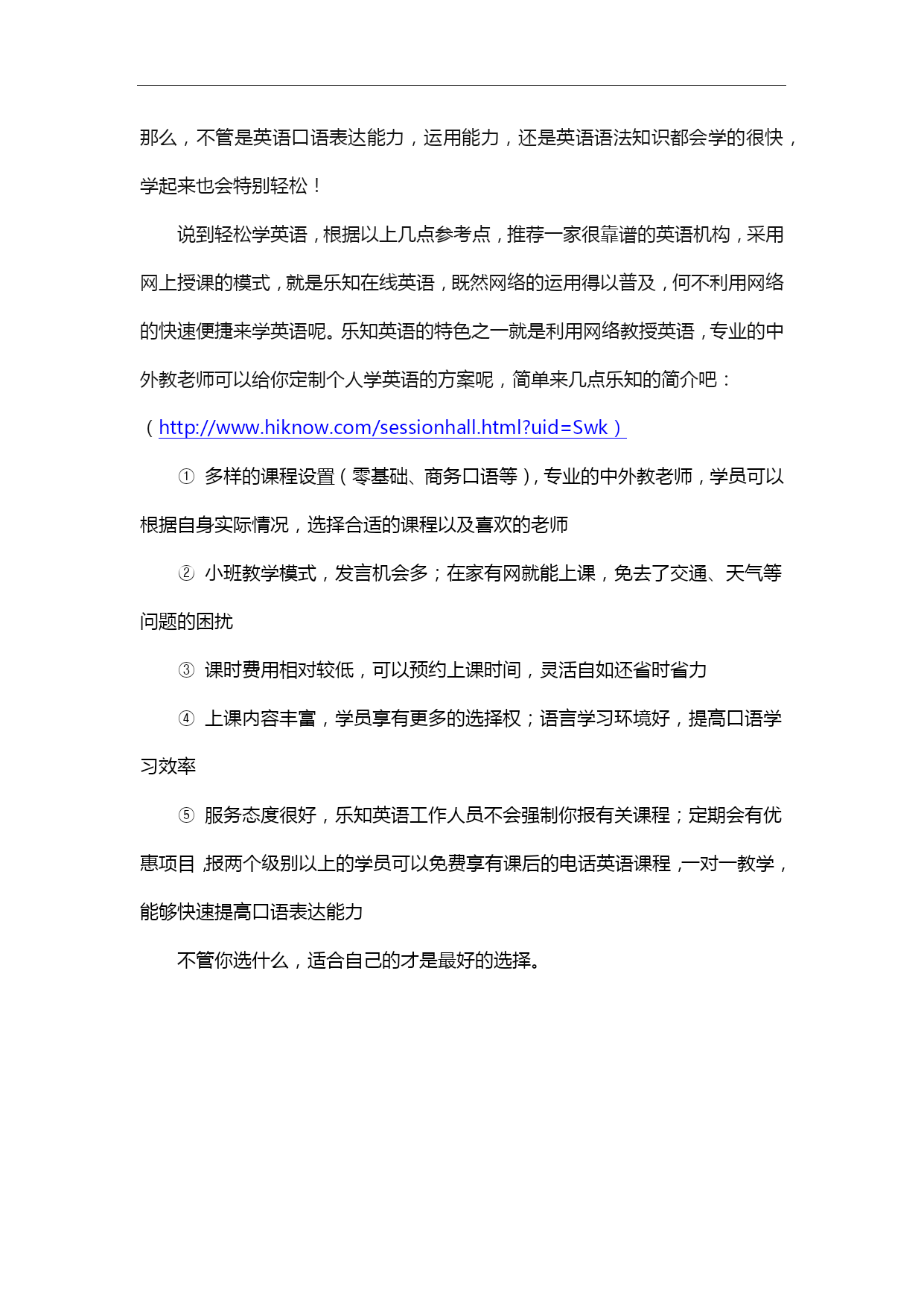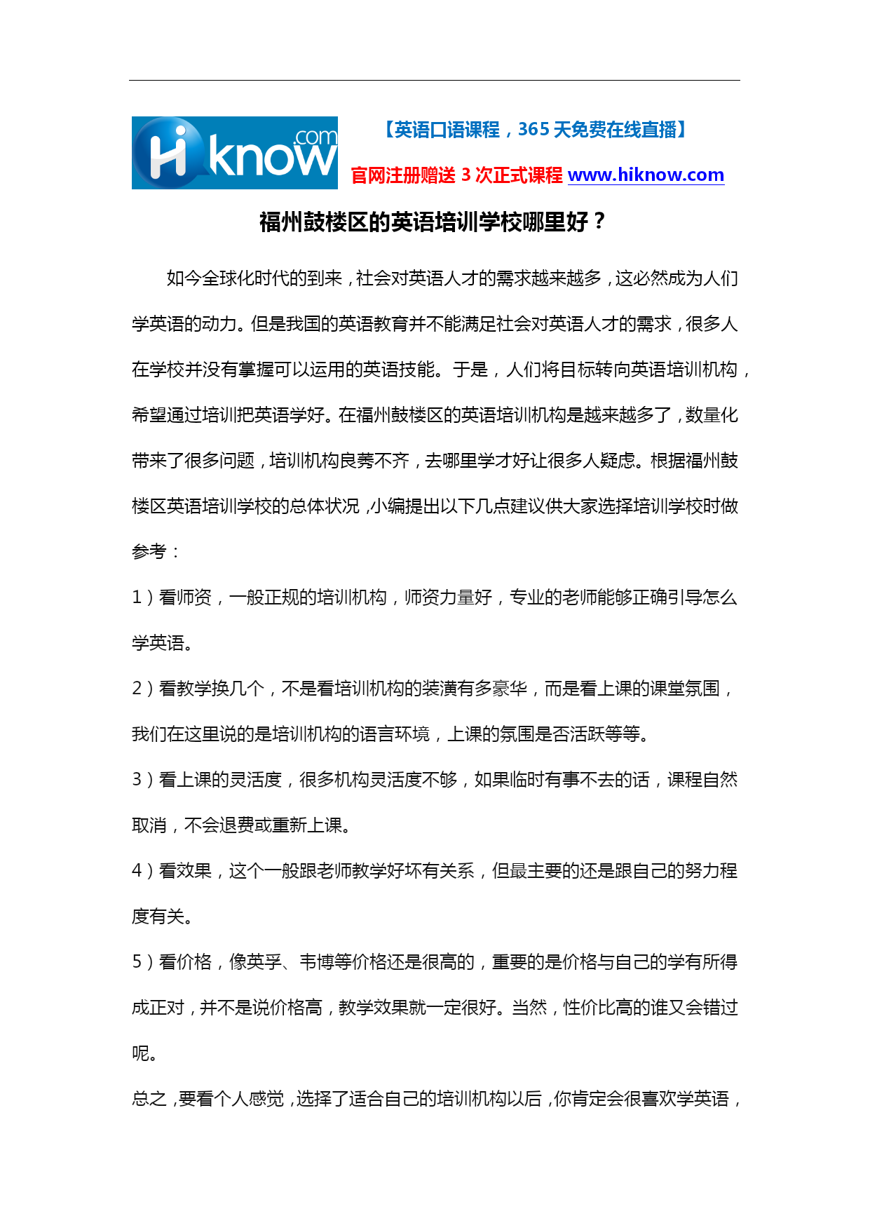 【英语口语课程,365天免费在线直播】官网注册赠送3次正式课程HYPERLINK"http://www.hiknow.com"www.hiknow.com福州鼓楼区的英语培训学校哪里好?如今全球化时代的到来,社会对英语人才的需求越来越多,这必然成为人们学英语的动力。但是我国的英语教育并不能满足社会对英语人才的需求,很多人在学校并没有掌握可以运用的英语技能。于是,人们将目标转向英语培训机构,希望通过培训把英语学好。在福州鼓楼区的英语培训机构是越来越多了,数量化带来了很多问题,培训机构良莠不齐,去哪里学才好让很多人疑虑。根据福州鼓楼区英语培训学校的总体状况,小编提出以下几点建议供大家选择培训学校时做参考:1)看师资,一般正规的培训机构,师资力量好,专业的老师能够正确引导怎么学英语。2)看教学换几个,不是看培训机构的装潢有多豪华,而是看上课的课堂氛围,我们在这里说的是培训机构的语言环境,上课的氛围是否活跃等等。3)看上课的灵活度,很多机构灵活度不够,如果临时有事不去的话,课程自然取消,不会退费或重新上课。4)看效果,这个一般跟老师教学好坏有关系,但最主要的还是跟自己的努力程度有关。5)看价格,像英孚、韦博等价格还是很高的,重要的是价格与自己的学有所得成正对,并不是说价格高,教学效果就一定很好。当然,性价比高的谁又会错过呢。总之,要看个人感觉,选择了适合自己的培训机构以后,你肯定会很喜欢学英语,那么,不管是英语口语表达能力,运用能力,还是英语语法知识都会学的很快,学起来也会特别轻松!说到轻松学英语,根据以上几点参考点,推荐一家很靠谱的英语机构,采用网上授课的模式,就是乐知在线英语,既然网络的运用得以普及,何不利用网络的快速便捷来学英语呢。乐知英语的特色之一就是利用网络教授英语,专业的中外教老师可以给你定制个人学英语的方案呢,简单来几点乐知的简介吧:(HYPERLINK"http://www.hiknow.com/sessionhall.html?uid=Swk"http://www.hiknow.com/sessionhall.html?uid=Swk)多样的课程设置(零基础、商务口语等),专业的中外教老师,学员可以根据自身实际情况,选择合适的课程以及喜欢的老师小班教学模式,发言机会多;在家有网就能上课,免去了交通、天气等问题的困扰课时费用相对较低,可以预约上课时间,灵活自如还省时省力上课内容丰富,学员享有更多的选择权;语言学习环境好,提高口语学习效率服务态度很好,乐知英语工作人员不会强制你报有关课程;定期会有优惠项目,报两个级别以上的学员可以免费享有课后的电话英语课程,一对一教学,能够快速提高口语表达能力不管你选什么,适合自己的才是最好的选择。