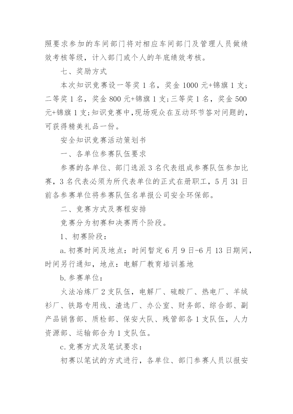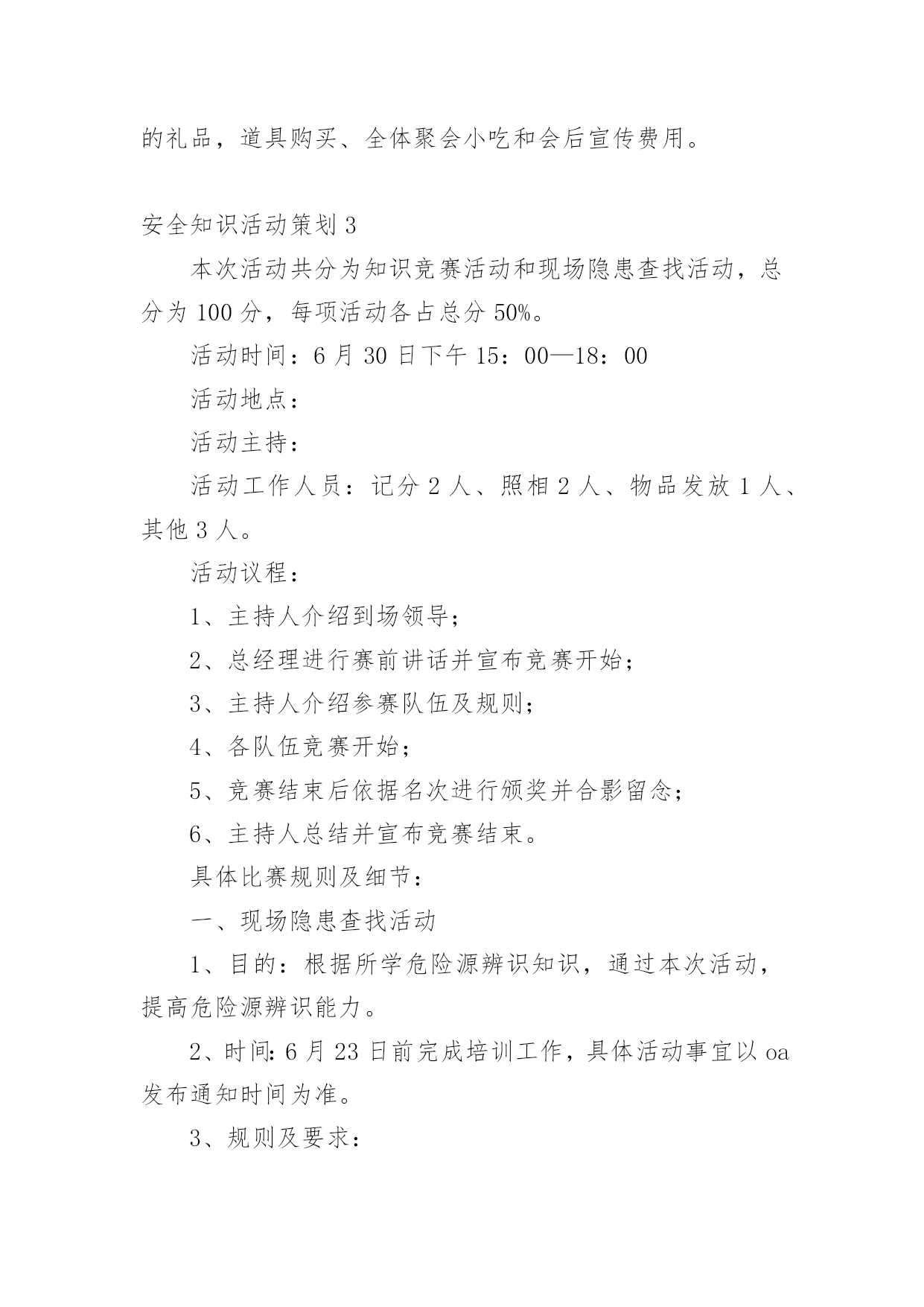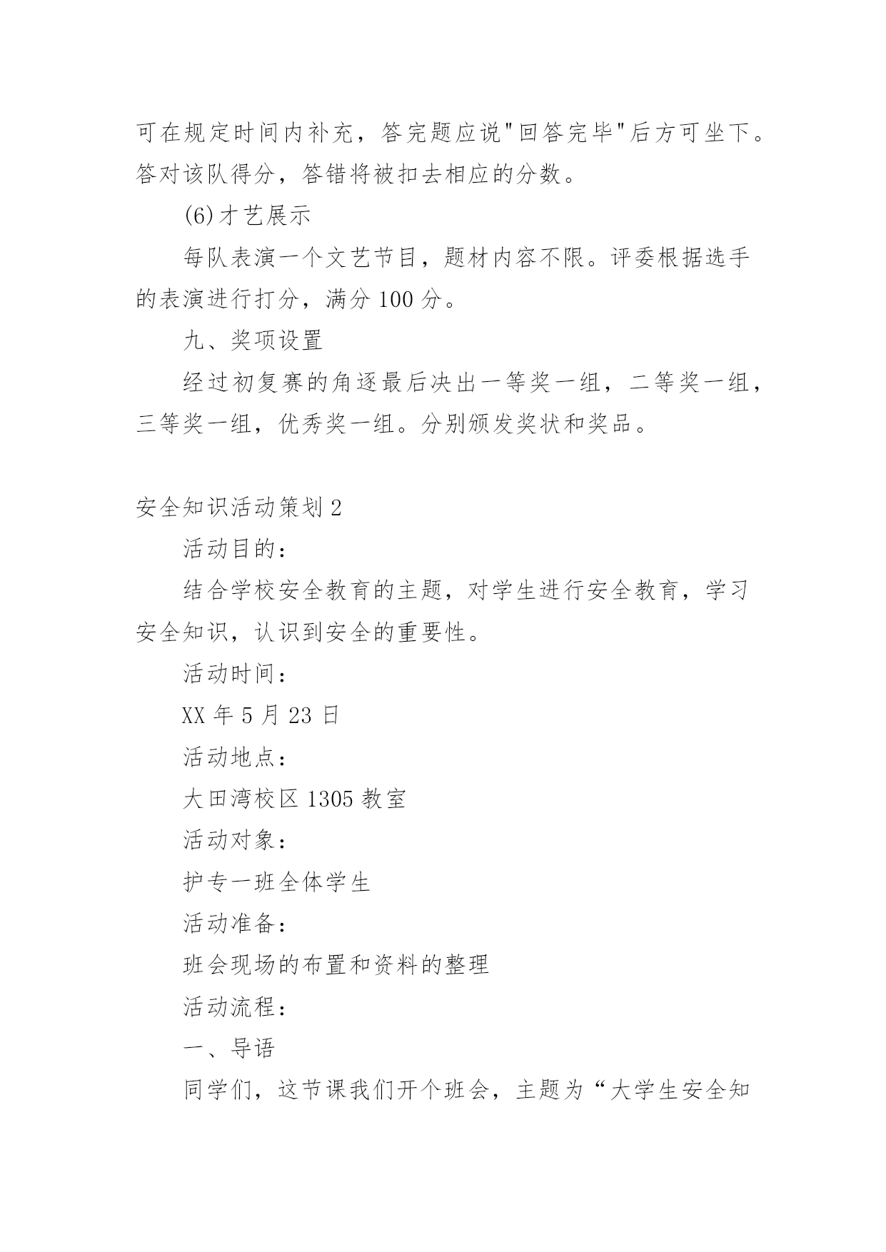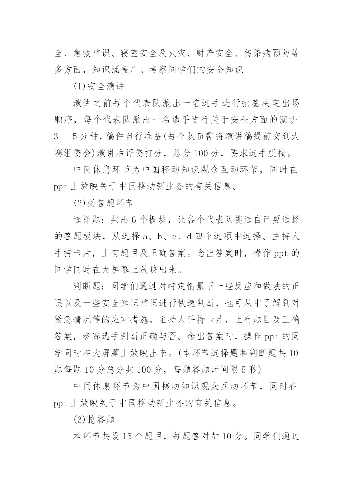 安全知识活动策划安全知识活动策划1一、活动目的促使同学们树立安全思想,加强安全防范意识,促使同学们养成良好的生活习惯,丰富同学们的课余生活,提高自我管理,自我保护能力。让大家真正参与到安全宣传当中来,让我们学校的每个学生都成为安全宣传员,真正做到“安全伴我行”。二、活动口号:安全每天伴我行三、本次活动主办单位:xx学院团委学生会四、本次活动承办单位:xx学院学生会生活部五、本次活动赞助单位:中国移动通信公司六、活动对象:xx学院全体班级七、活动时间:20xx年4月20日——25日八、活动内容一、初赛活动流程:二、复赛活动流程:1、知识问答题目内容涉及移动通信安全、突发性自然灾害、交通安全、急救常识、寝室安全及火灾、财产安全、传染病预防等多方面,知识涵盖广。考察同学们的安全知识(1)安全演讲演讲之前每个代表队派出一名选手进行抽签决定出场顺序,每个代表队派出一名选手进行关于安全方面的演讲3---5分钟,稿件自行准备(每个队伍需将演讲稿提前交到大赛组委会)演讲后评委打分,总分100分,要求选手脱稿。中间休息环节为中国移动知识观众互动环节,同时在ppt上放映关于中国移动新业务的有关信息。(2)必答题环节选择题:共出6个板块,让各个代表队挑选自己要选择的答题板块,从选择a、b、c、d四个选项中选择。主持人手持卡片,上有题目及正确答案。念出答案时,操作ppt的同学同时在大屏幕上放映出来。判断题:同学们通过对特定情景下一些反应和做法的正误以及一些安全知识常识进行快速判断,也可从中了解到对紧急情况等的应对措施。主持人手持卡片,上有题目及正确答案,参赛选手判断正确与否。念出答案时,操作ppt的同学同时在大屏幕上放映出来。(本环节选择题和判断题共10题每题10分总分共100分,每题答题时间限5秒)中间休息环节为中国移动知识观众互动环节,同时在ppt上放映关于中国移动新业务的有关信息。(3)抢答题本环节共设15个题目,每题答对加10分。同学们通过对特定情景下一些反应和做法的正误以及一些安全知识常识进行快速判断,也可从中了解到对紧急情况等的应对措施。抢答形式采取每个代表队派出一名代表来到会场中心,每个代表使用大赛组委会提供的同型号手机在主持人宣布开始抢答之后,拨打主持人手机,最先打入主持人手机的代表队将获得此次答题权。休息环节为邀请人员才艺表演,同时在ppt上放映关于中国移动新业务的有关信息。(4)超级模仿秀1、比赛口号当主持人介绍各代表队时,各代表队可亮出自己的比赛口号。该题由仲裁组评分,满分为20分。2、情景表演以情景短剧、相声、演讲等形式再现日常生活中可能遇见的偷盗、诈骗、火灾、交通事故等安全问题,通过亲身表演及合情景对话,使同学们了解各种安全问题的正确处理方法,提高自我保护的实际能力时间为3-5分钟该题由仲裁组评分,满分为80分。中间休息环节为中国移动知识观众互动环节,同时在ppt上放映关于中国移动新业务的有关信息。(5)风险题此题型进行一轮,由各队选择不同分值的赛题进行作答,分值越高难度越大,分为40分、60分、80分三类,各代表队讨论和答题时间分别不得超过30秒、60秒、90秒,违者视作答错。各代表队可视自身积分自由选题或弃选。代表队内部可在相互讨论后,选派一名选手起立作答,其他选手亦可在规定时间内补充,答完题应说"回答完毕"后方可坐下。答对该队得分,答错将被扣去相应的分数。(6)才艺展示每队表演一个文艺节目,题材内容不限。评委根据选手的表演进行打分,满分100分。九、奖项设置经过初复赛的角逐最后决出一等奖一组,二等奖一组,三等奖一组,优秀奖一组。分别颁发奖状和奖品。安全知识活动策划2活动目的:结合学校安全教育的主题,对学生进行安全教育,学习安全知识,认识到安全的重要性。活动时间:XX年5月23日活动地点:大田湾校区1305教室活动对象:护专一班全体学生活动准备:班会现场的布置和资料的整理活动流程:一、导语同学们,这节课我们开个班会,主题为“大学生安全知识”(板书课题)一人安危系全家”。我们每人都是家庭的重要组成部分,离了谁,家都不再完整不再温馨。所以无论何时何地,我们都要注意安全。接下来播放《天堂里有没有车来车往》的歌曲,营造气氛.我们作为学生,我们现在更多时间都是在校园里度过。我们应该怎样做呢?二、校园人身安全,我们该怎么做呢?大家说说在教室、走廊、楼梯、操尝寝室、饮食、体育运动、寝室用电、处理纠纷,我们应怎样注意个人安全?还可以将自己的经历说出来。(三分钟之内答完,超过者不算)三、游戏:肢体语言大闯关。用肢体语言传达所示成语意思给另一方猜测(两人一组)四、想一想,校园安全方面,怎们样建立安全意识?以及从哪些方面建立安全意识?自己哪方面还做得不够好?(将穿插游戏“奇形怪状大考验”。五、展开的是安全知识互动问答活动(共20题,分简单