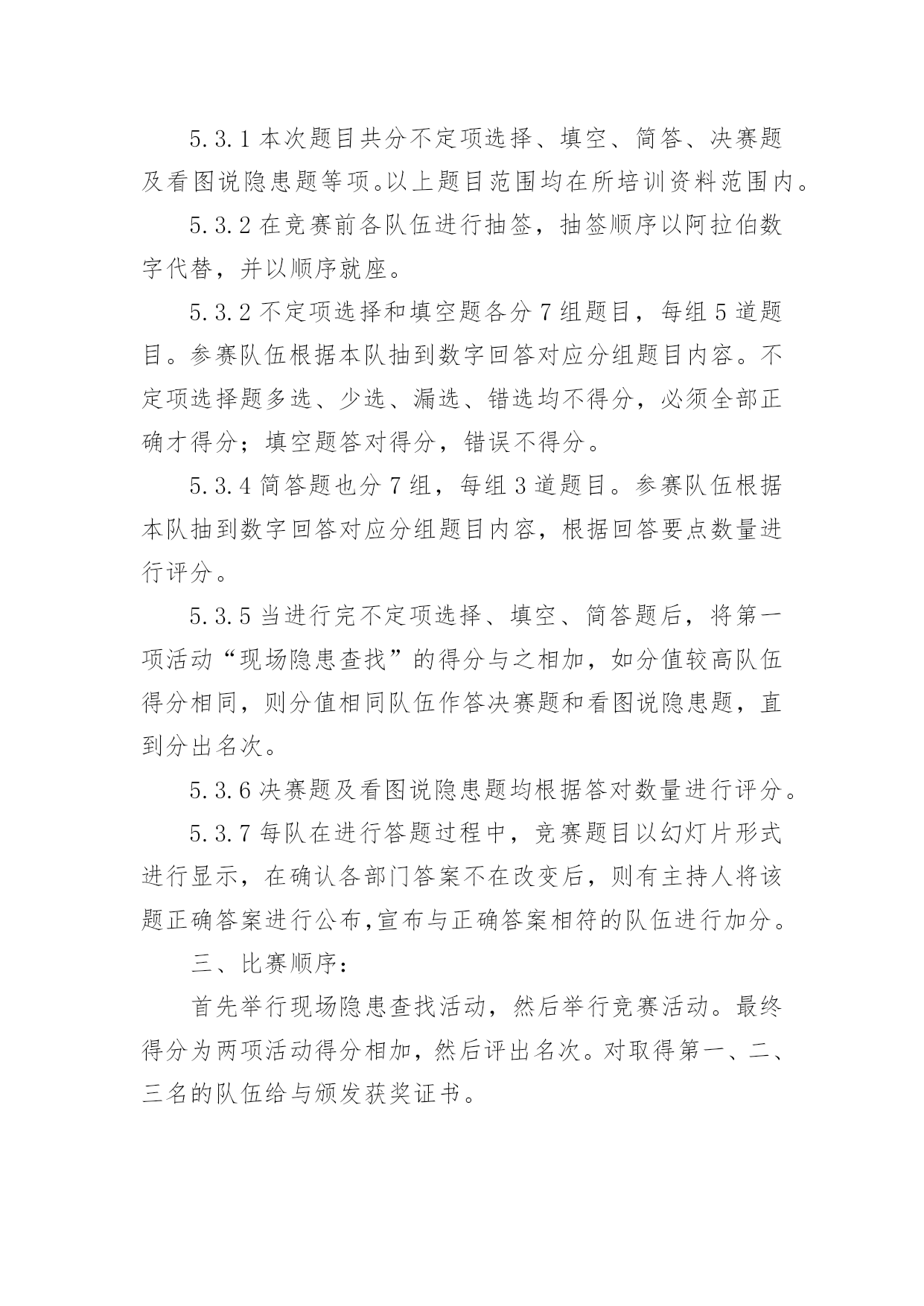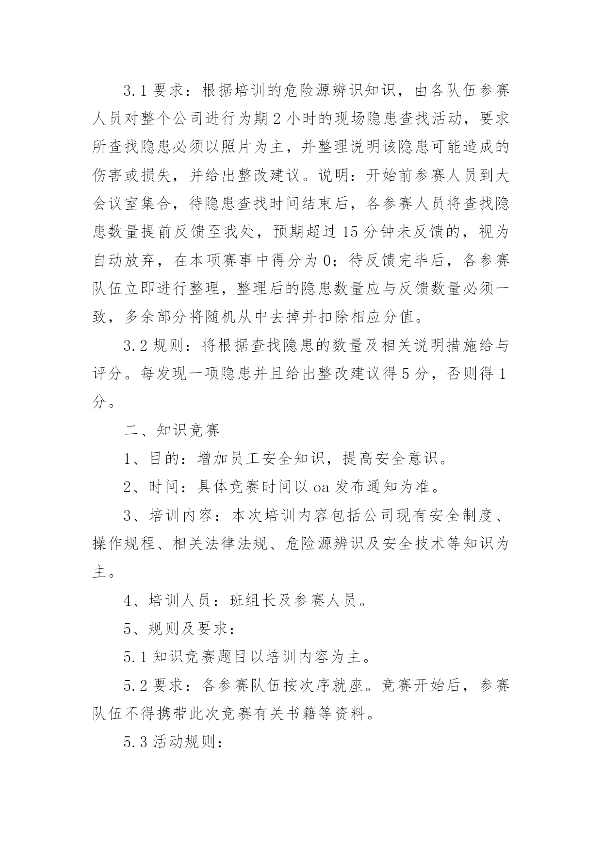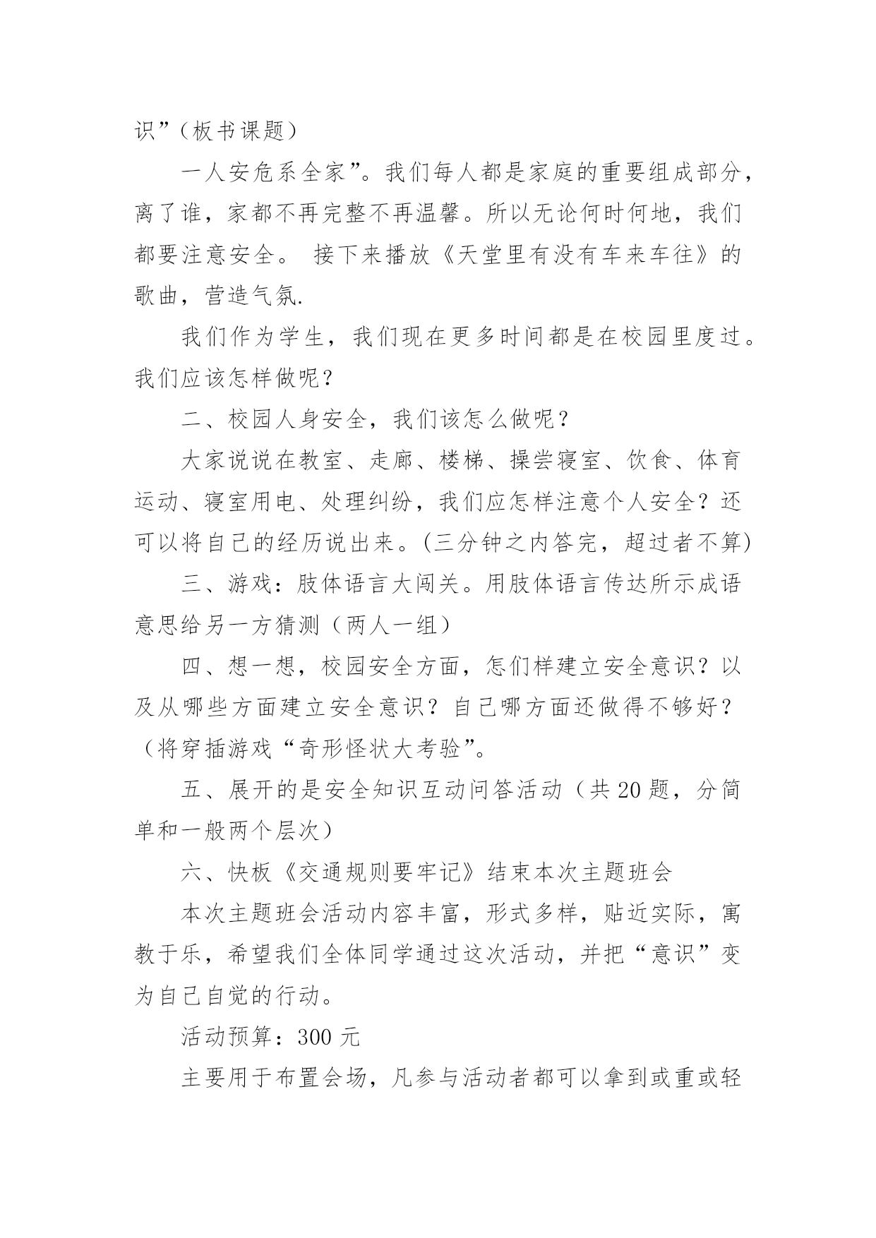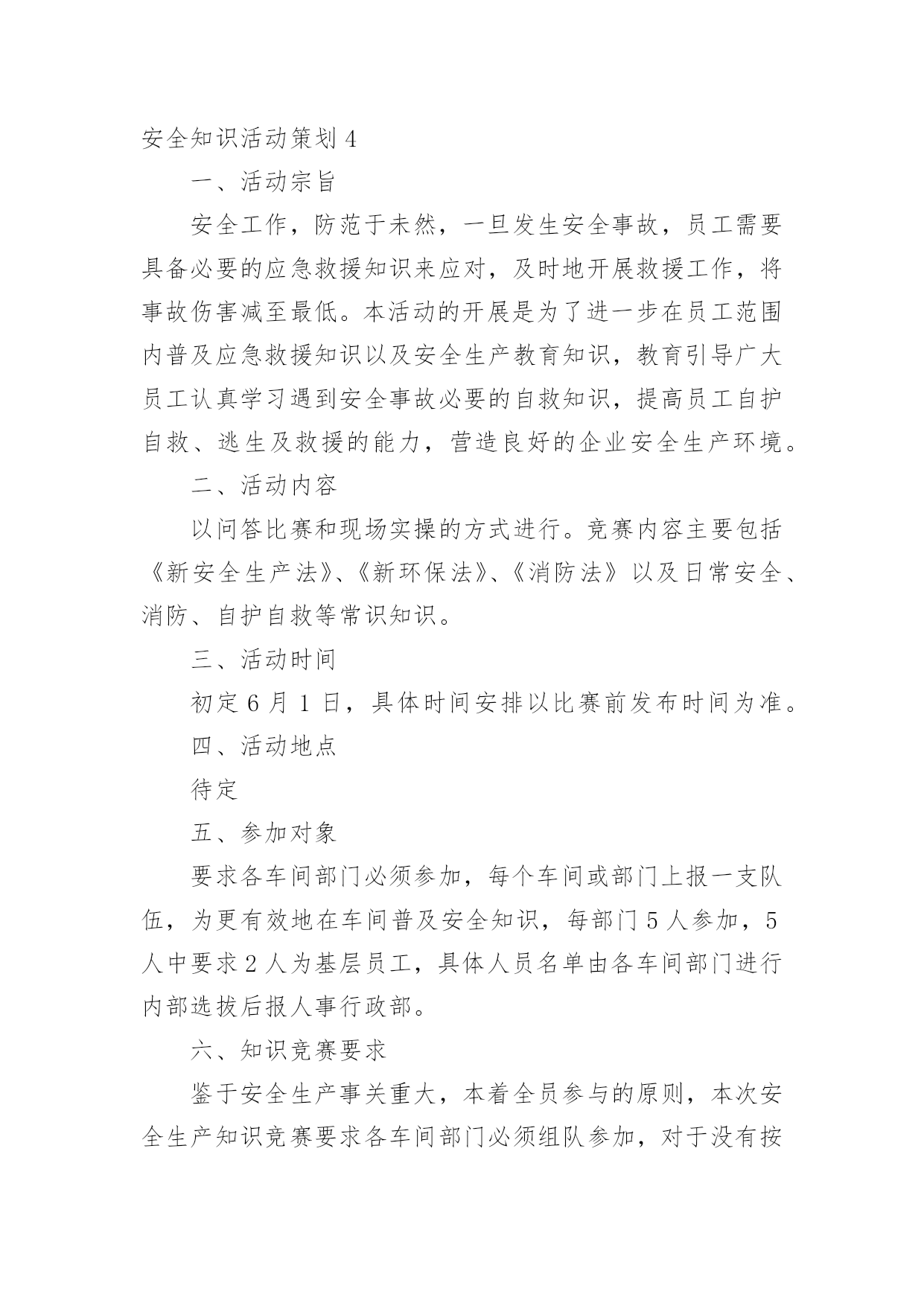 安全知识活动策划安全知识活动策划1一、活动目的促使同学们树立安全思想,加强安全防范意识,促使同学们养成良好的生活习惯,丰富同学们的课余生活,提高自我管理,自我保护能力。让大家真正参与到安全宣传当中来,让我们学校的每个学生都成为安全宣传员,真正做到“安全伴我行”。二、活动口号:安全每天伴我行三、本次活动主办单位:xx学院团委学生会四、本次活动承办单位:xx学院学生会生活部五、本次活动赞助单位:中国移动通信公司六、活动对象:xx学院全体班级七、活动时间:20xx年4月20日——25日八、活动内容一、初赛活动流程:二、复赛活动流程:1、知识问答题目内容涉及移动通信安全、突发性自然灾害、交通安全、急救常识、寝室安全及火灾、财产安全、传染病预防等多方面,知识涵盖广。考察同学们的安全知识(1)安全演讲演讲之前每个代表队派出一名选手进行抽签决定出场顺序,每个代表队派出一名选手进行关于安全方面的演讲3---5分钟,稿件自行准备(每个队伍需将演讲稿提前交到大赛组委会)演讲后评委打分,总分100分,要求选手脱稿。中间休息环节为中国移动知识观众互动环节,同时在ppt上放映关于中国移动新业务的有关信息。(2)必答题环节选择题:共出6个板块,让各个代表队挑选自己要选择的答题板块,从选择a、b、c、d四个选项中选择。主持人手持卡片,上有题目及正确答案。念出答案时,操作ppt的同学同时在大屏幕上放映出来。判断题:同学们通过对特定情景下一些反应和做法的正误以及一些安全知识常识进行快速判断,也可从中了解到对紧急情况等的应对措施。主持人手持卡片,上有题目及正确答案,参赛选手判断正确与否。念出答案时,操作ppt的同学同时在大屏幕上放映出来。(本环节选择题和判断题共10题每题10分总分共100分,每题答题时间限5秒)中间休息环节为中国移动知识观众互动环节,同时在ppt上放映关于中国移动新业务的有关信息。(3)抢答题本环节共设15个题目,每题答对加10分。同学们通过对特定情景下一些反应和做法的正误以及一些安全知识常识进行快速判断,也可从中了解到对紧急情况等的应对措施。抢答形式采取每个代表队派出一名代表来到会场中心,每个代表使用大赛组委会提供的同型号手机在主持人宣布开始抢答之后,拨打主持人手机,最先打入主持人手机的代表队将获得此次答题权。休息环节为邀请人员才艺表演,同时在ppt上放映关于中国移动新业务的有关信息。(4)超级模仿秀1、比赛口号当主持人介绍各代表队时,各代表队可亮出自己的比赛口号。该题由仲裁组评分,满分为20分。2、情景表演以情景短剧、相声、演讲等形式再现日常生活中可能遇见的偷盗、诈骗、火灾、交通事故等安全问题,通过亲身表演及合情景对话,使同学们了解各种安全问题的正确处理方法,提高自我保护的实际能力时间为3-5分钟该题由仲裁组评分,满分为80分。中间休息环节为中国移动知识观众互动环节,同时在ppt上放映关于中国移动新业务的有关信息。(5)风险题此题型进行一轮,由各队选择不同分值的赛题进行作答,分值越高难度越大,分为40分、60分、80分三类,各代表队讨论和答题时间分别不得超过30秒、60秒、90秒,违者视作答错。各代表队可视自身积分自由选题或弃选。代表队内部可在相互讨论后,选派一名选手起立作答,其他选手亦可在规定时间内补充,答完题应说"回答完毕"后方可坐下。答对该队得分,答错将被扣去相应的分数。(6)才艺展示每队表演一个文艺节目,题材内容不限。评委根据选手的表演进行打分,满分100分。九、奖项设置经过初复赛的角逐最后决出一等奖一组,二等奖一组,三等奖一组,优秀奖一组。分别颁发奖状和奖品。安全知识活动策划2活动目的:结合学校安全教育的主题,对学生进行安全教育,学习安全知识,认识到安全的重要性。活动时间:XX年5月23日活动地点:大田湾校区1305教室活动对象:护专一班全体学生活动准备:班会现场的布置和资料的整理活动流程:一、导语同学们,这节课我们开个班会,主题为“大学生安全知识”(板书课题)一人安危系全家”。我们每人都是家庭的重要组成部分,离了谁,家都不再完整不再温馨。所以无论何时何地,我们都要注意安全。接下来播放《天堂里有没有车来车往》的歌曲,营造气氛.我们作为学生,我们现在更多时间都是在校园里度过。我们应该怎样做呢?二、校园人身安全,我们该怎么做呢?大家说说在教室、走廊、楼梯、操尝寝室、饮食、体育运动、寝室用电、处理纠纷,我们应怎样注意个人安全?还可以将自己的经历说出来。(三分钟之内答完,超过者不算)三、游戏:肢体语言大闯关。用肢体语言传达所示成语意思给另一方猜测(两人一组)四、想一想,校园安全方面,怎们样建立安全意识?以及从哪些方面建立安全意识?自己哪方面还做得不够好?(将穿插游戏“奇形怪状大考验”。五、展开的是安全知识互动问答活动(共20题,分简单