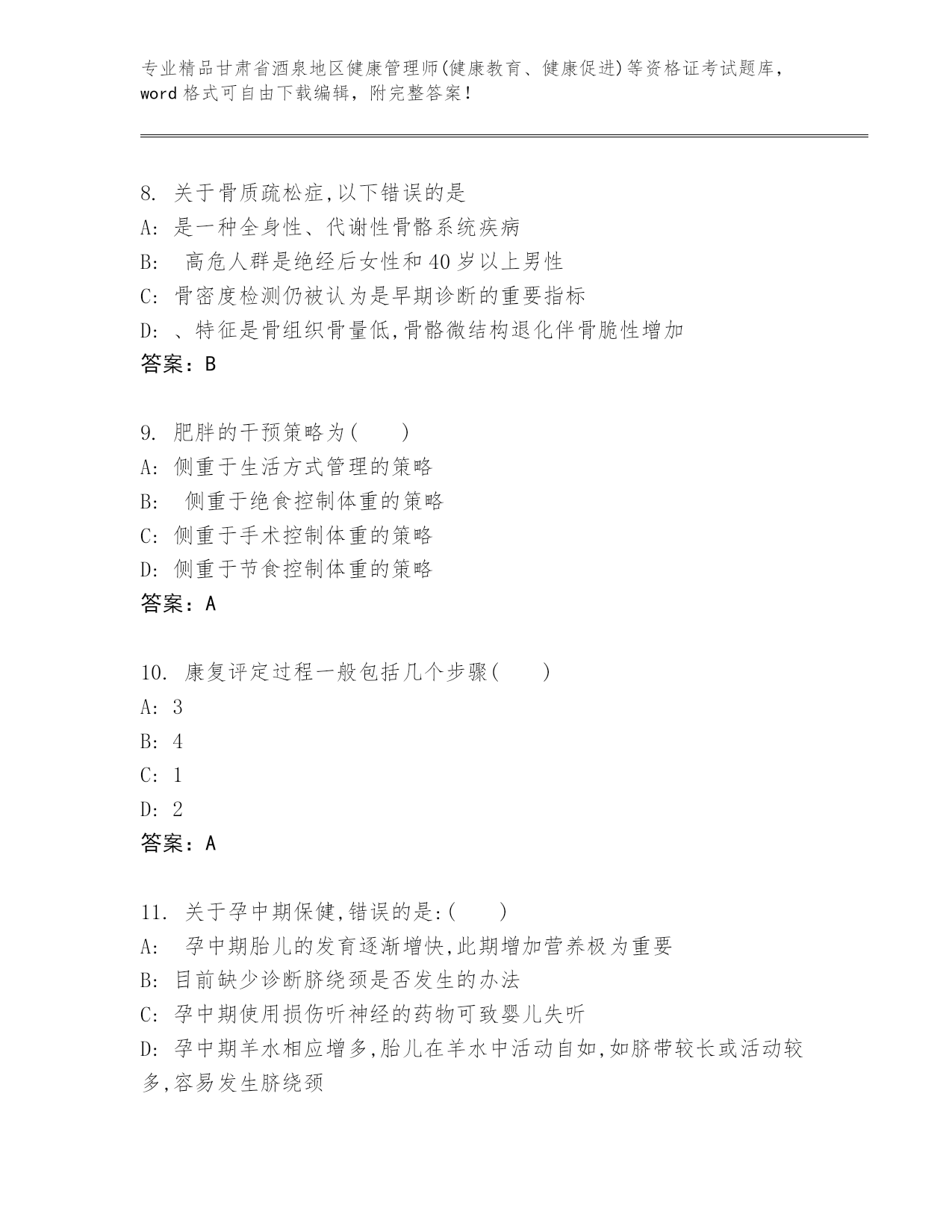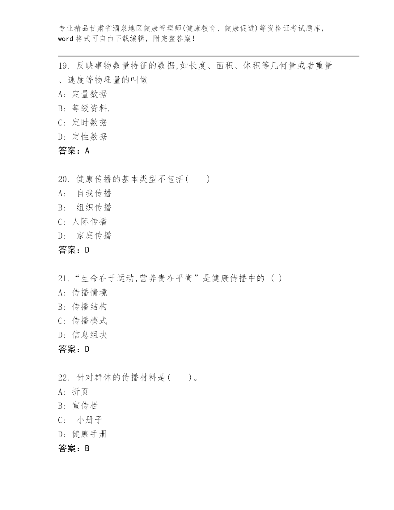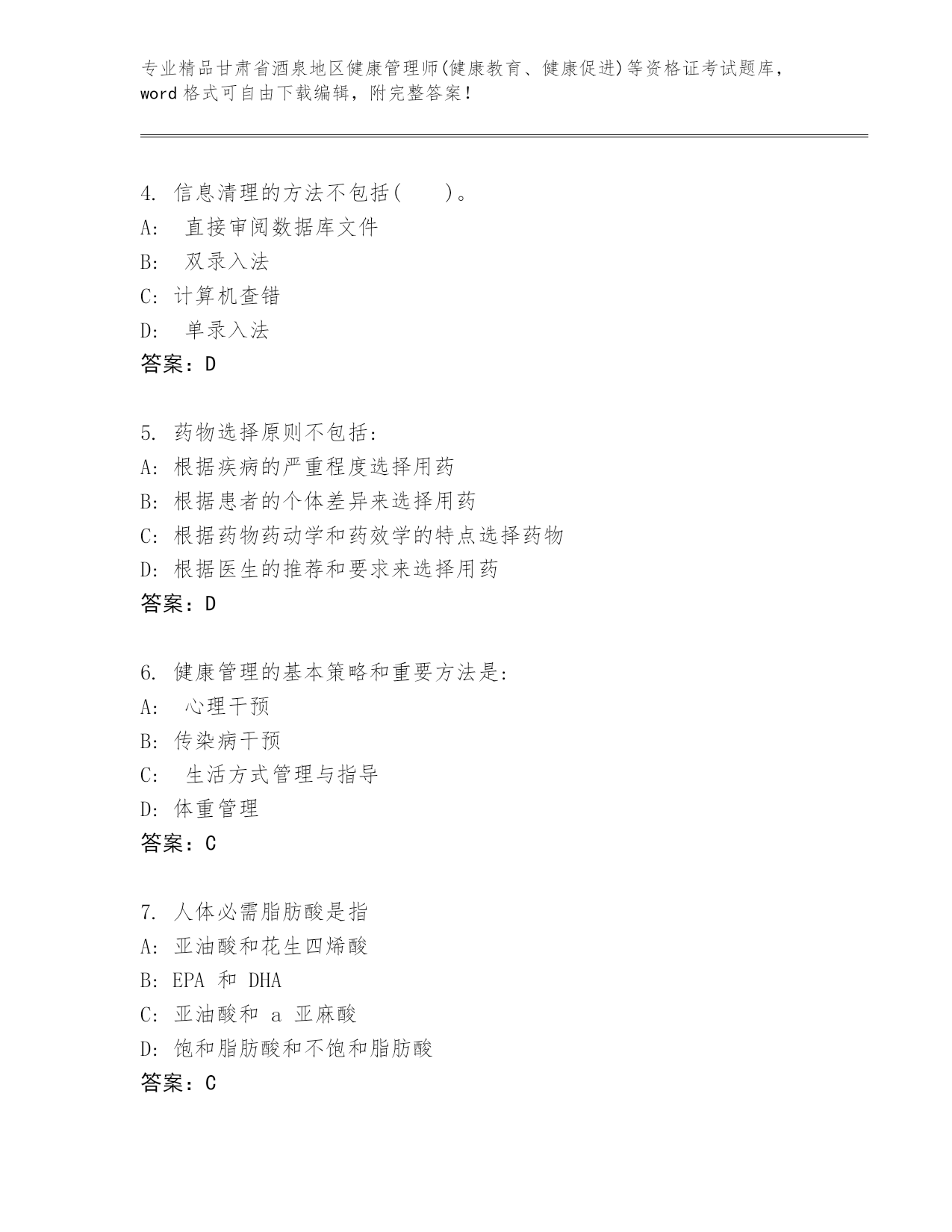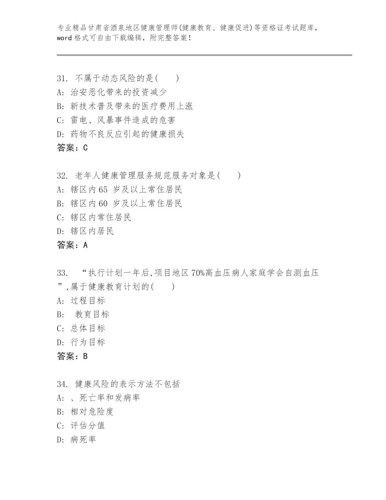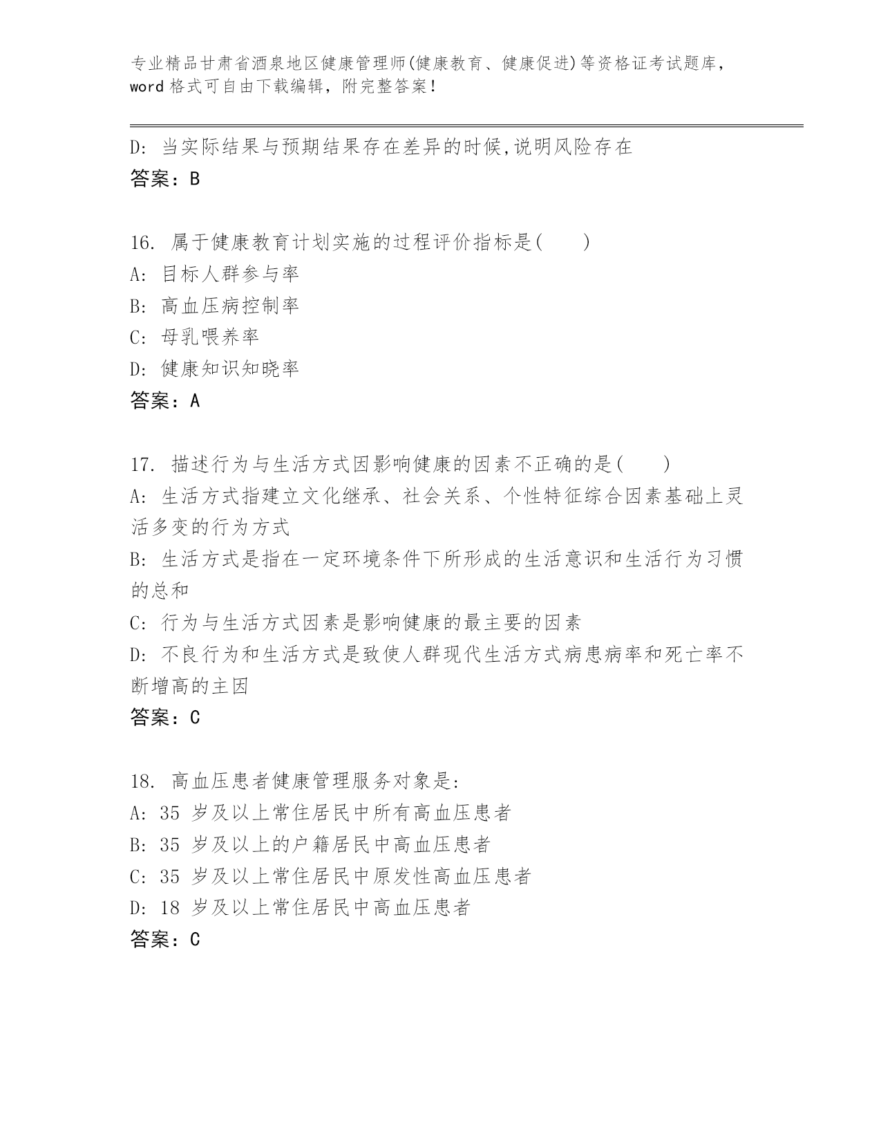 精心整理甘肃省酒泉地区健康管理师(健康教育、健康促进)等资格证考试优选题库(夺冠)