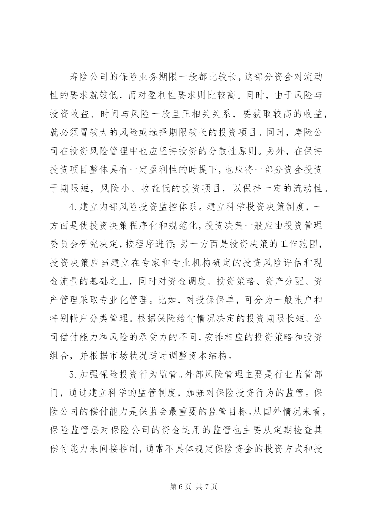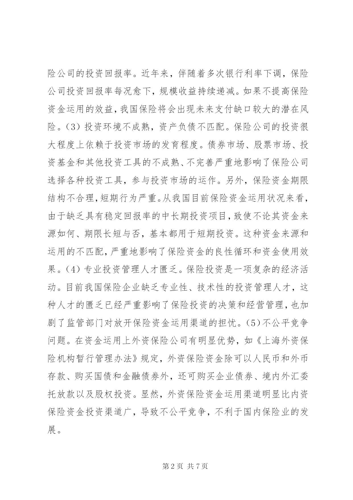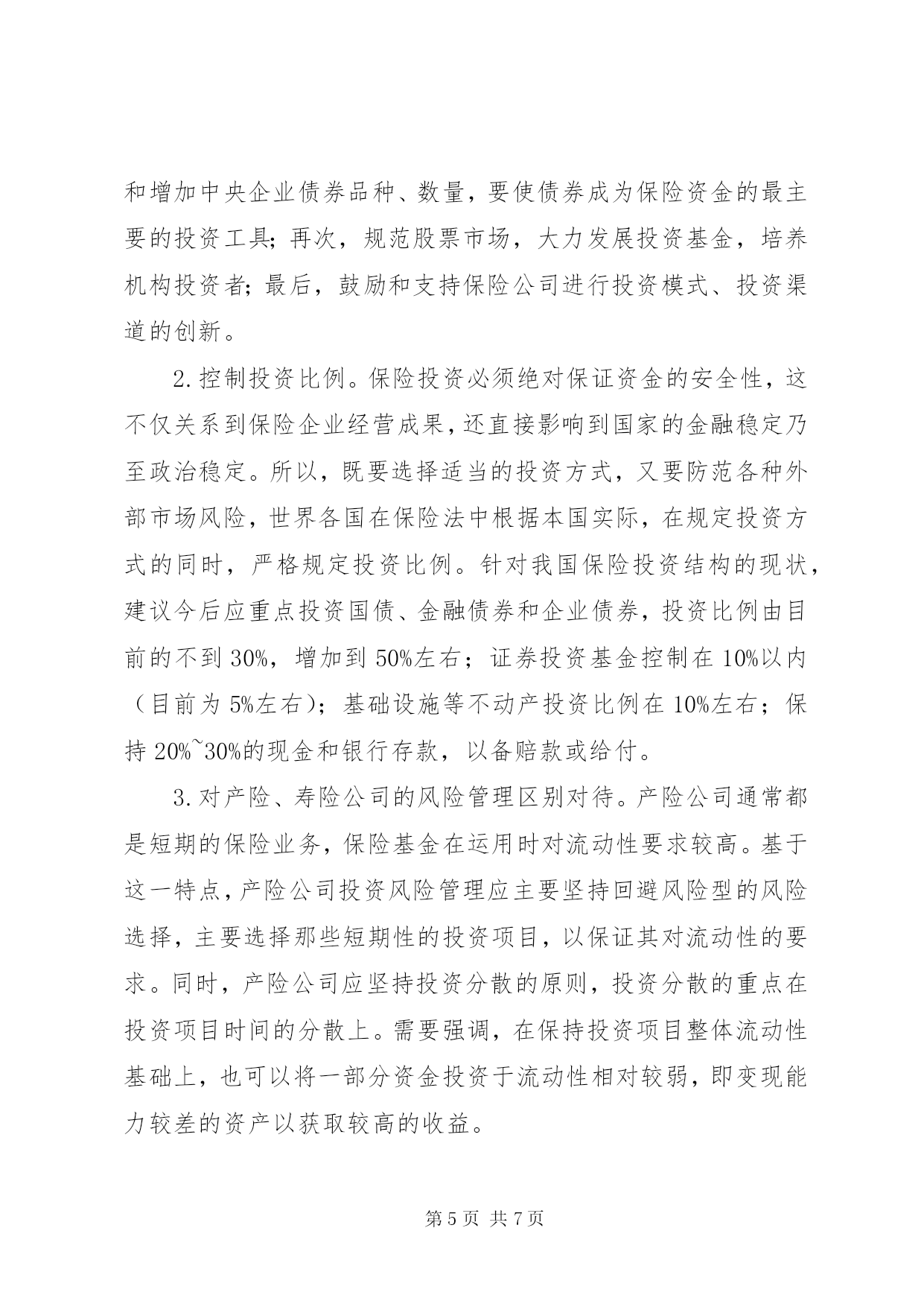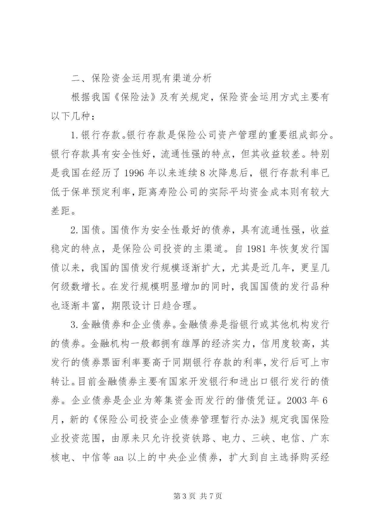 第PAGE\*Arabic\*MERGEFORMAT7页共NUMPAGES\*MERGEFORMAT7页保险资金运用现状1.历史沿革。自1980年恢复国内保险业务以来,我国保险资金运用大致经历了3个阶段。第一阶段从1980~1987年,为无投资或忽视投资阶段,保险公司的资金基本上进入了银行,形成银行存款。第二阶段从1987~1995年,为无序投资阶段,房地产、有价证券、信托,甚至借贷,无所不及,从而形成大量不良资产。第三阶段始于1995年10月,为逐步规范阶段。1995年以来先后颁布了《中华人民共和国保险法》、《中华人民共和国银行法》、《保险公司管理规定》等有关金融法律法规。2.存在问题。(1)资金运用渠道偏于狭窄。西方保险公司的资金运用法定渠道则较为广泛,比如美国、日本就规定保险公司可进行政府债券、公司债券、股票、抵押放款、不动产、保单放贷等业务。1998年以前,我国保险资金运用有4个方面的法定渠道:银行存款、买卖政府债券、金融债券和国务院规定的其他资金运用形式。近两年我国对保险资金投资渠道有了新规定,如认购定向国债、投资证券投资基金等,使问题在一定程度上得到了缓解,但保险资金运用渠道狭窄的局面仍然存在。(2)资金运用回报率过低,存在较大的支付风险。由于缺乏其他投资渠道,国内保险业的投资基本上都依法转入存款和国债等固定性投资工具上,因此银行存款、债券的利率以及国债的发行量决定着保险公司的投资回报率。近年来,伴随着多次银行利率下调,保险公司投资回报率每况愈下,规模收益持续递减。如果不提高保险资金运用的效益,我国保险将会出现未来支付缺口较大的潜在风险。(3)投资环境不成熟,资产负债不匹配。保险公司的投资很大程度上依赖于投资市场的发育程度。债券市场、股票市场、投资基金和其他投资工具的不成熟、不完善严重地影响了保险公司选择各种投资工具,参与投资市场的运作。另外,保险资金期限结构不合理,短期行为严重。从我国目前保险资金运用状况来看,由于缺乏具有稳定回报率的中长期投资项目,致使不论其资金来源如何、期限长短与否,基本都用于短期投资。这种资金来源和运用的不匹配,严重地影响了保险资金的良性循环和资金使用效果。(4)专业投资管理人才匮乏。保险投资是一项复杂的经济活动。目前我国保险企业缺乏专业性、技术性的投资管理人才,这种人才的匮乏已经严重影响了保险投资的决策和经营管理,也加剧了监管部门对放开保险资金运用渠道的担忧。(5)不公平竞争问题。在资金运用上外资保险公司有明显优势,如《上海外资保险机构暂行管理办法》规定,外资保险资金除可以人民币和外币存款、购买国债和金融债券外,还可购买企业债券、境内外汇委托放款以及股权投资。显然,外资保险资金运用渠道明显比内资保险资金投资渠道广,导致不公平竞争,不利于国内保险业的发展。二、保险资金运用现有渠道分析根据我国《保险法》及有关规定,保险资金运用方式主要有以下几种:1.银行存款。银行存款是保险公司资产管理的重要组成部分。银行存款具有安全性好,流通性强的特点,但其收益较差。特别是我国在经历了1996年以来连续8次降息后,银行存款利率已低于保单预定利率,距离寿险公司的实际平均资金成本则有较大差距。2.国债。国债作为安全性最好的债券,具有流通性强,收益稳定的特点,是保险公司投资的主渠道。自1981年恢复发行国债以来,我国的国债发行规模逐渐扩大,尤其是近几年,更呈几何级数增长。在发行规模明显增加的同时,我国国债的发行品种也逐渐丰富,期限设计日趋合理。3.金融债券和企业债券。金融债券是指银行或其他机构发行的债券。金融机构一般都拥有雄厚的经济实力,信用度较高,其发行的债券票面利率要高于同期银行存款的利率,发行后可上市转让。目前金融债券主要有国家开发银行和进出口银行发行的债券。企业债券是企业为筹集资金而发行的借债凭证。2003年6月,新的《保险公司投资企业债券管理暂行办法》规定我国保险业投资范围,由原来只允许投资铁路、电力、三峡、电信、广东核电、中信等aa以上的中央企业债券,扩大到自主选择购买经监管部门批准发行,且经监管部门认可的信用等级在aa以上的企业债券,投资比例也由原来不得超过总资产的10%提高到20%。4.证券投资基金。1999年10月,中国保监会批准保险公司向证券投资基金投资,投资比例上限为上年末总资产的15%,具体比例由保监会核定。与其他投资者不同,保险公司购买单只封闭式基金的比例可以占到该基金总规模的10%。5.国务院规定的其他资金运用形式。其他资金运用方式主要有股票投资、公司债券、不动产投资、抵押贷款、资金拆出、境外投资等,对这部分项目的投资,必须经国务院批准。目前,除国务院批准个别保险公司个别不动产项目投资外,尚未批准保险公司向这些方面投资。三、保险资金运用的风险管理1.完善投资环境