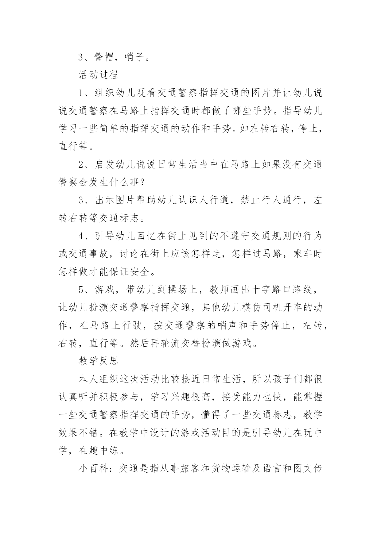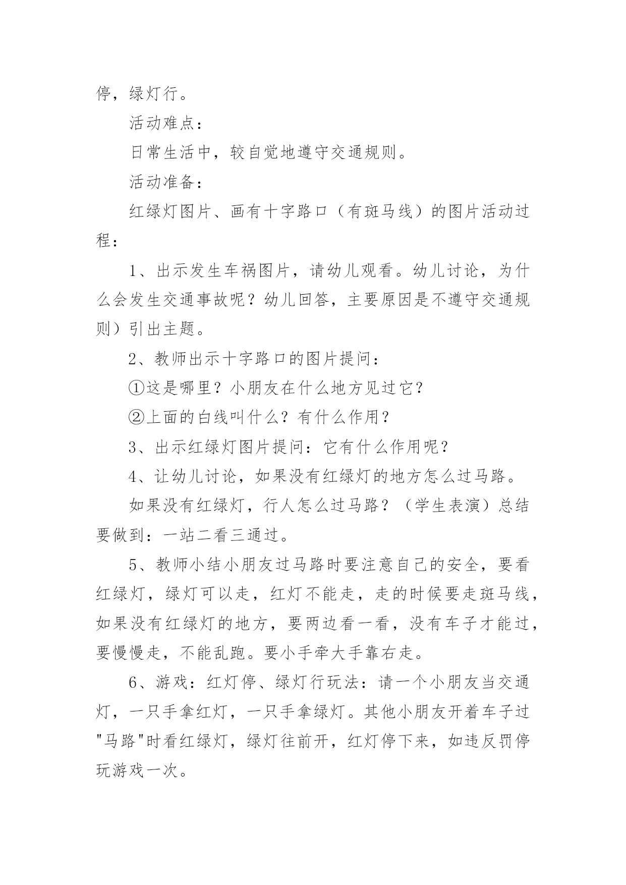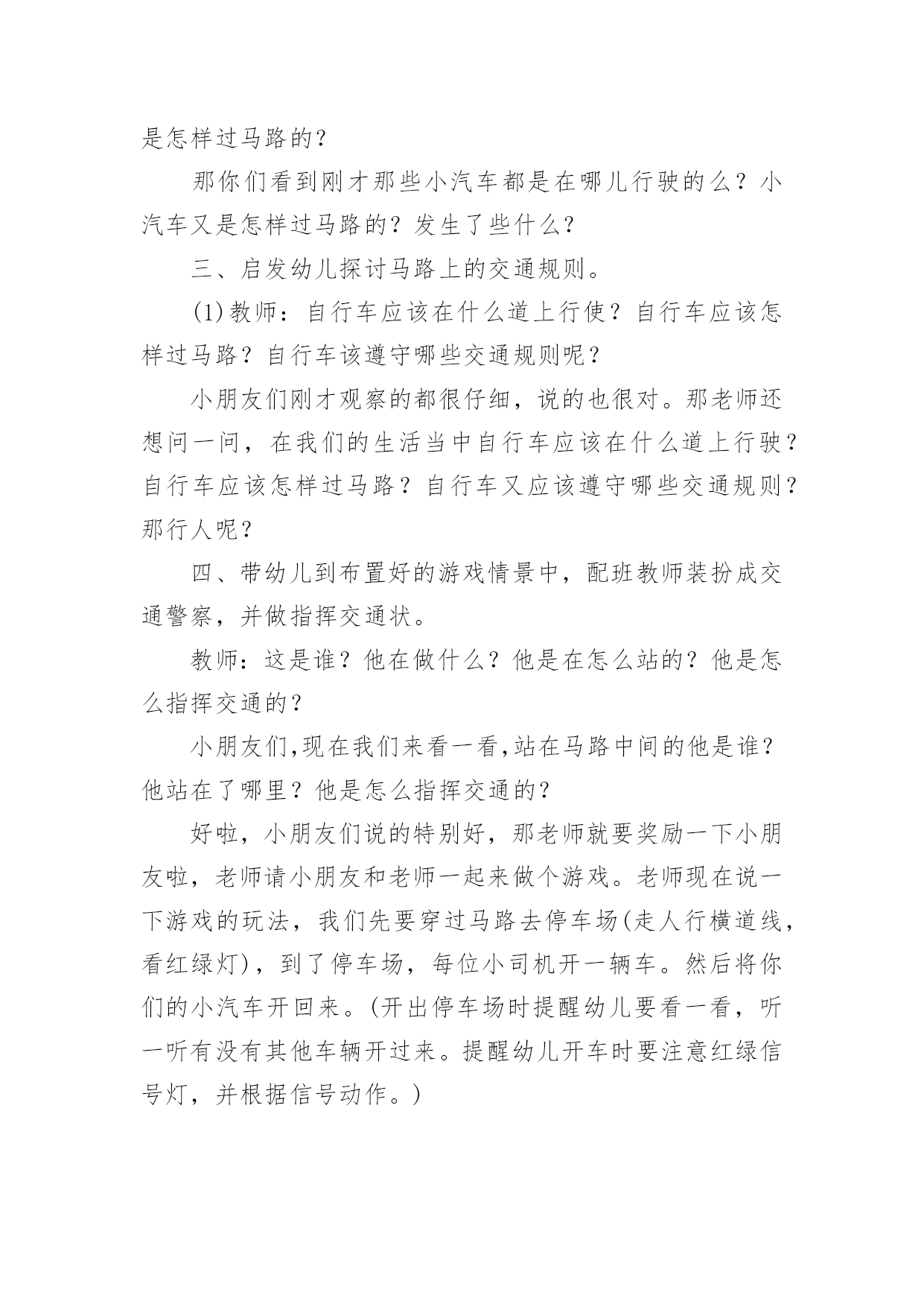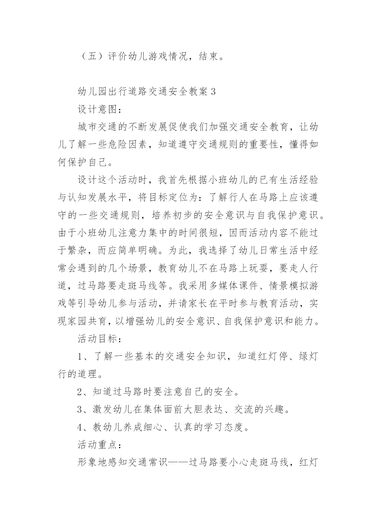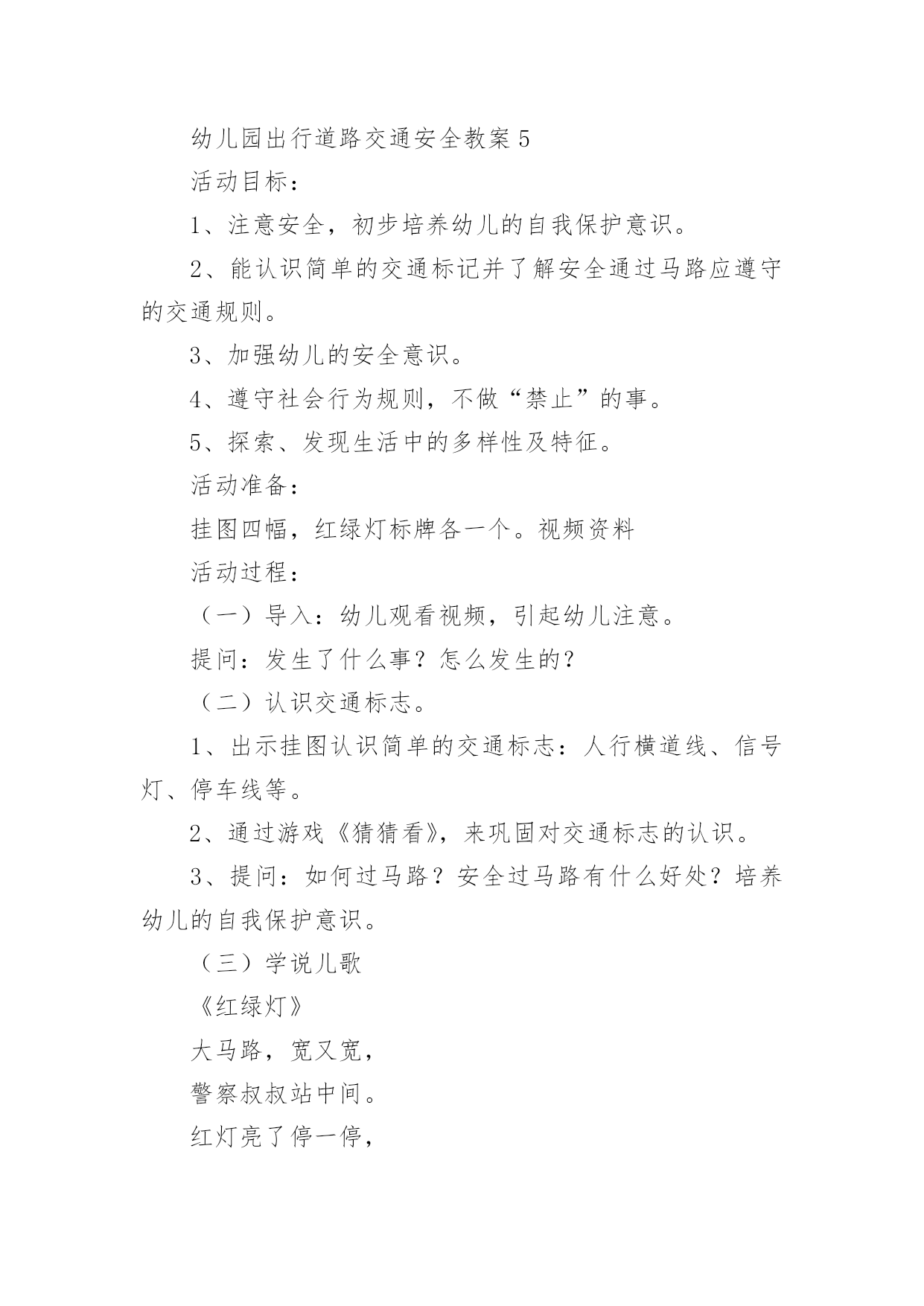 幼儿园出行道路交通安全教案幼儿园出行道路交通安全教案(通用5篇)作为一名无私奉献的老师,常常需要准备教案,通过教案准备可以更好地根据具体情况对教学进程做适当的必要的调整。那么问题来了,教案应该怎么写?下面是小编收集整理的幼儿园出行道路交通安全教案(通用5篇),希望对大家有所帮助。幼儿园出行道路交通安全教案1活动目标1、了解一些常见的交通指挥手势。2、认识一些交通标志。3、培养幼儿自觉遵守交通规则。4、激发对交通警察的尊敬和爱戴之情。5、乐于探索、交流与分享。6、养成敢想敢做、勤学、乐学的良好素质。教学重点、难点重点是学习一些常见的交通指挥手势和标志。难点是让幼儿自觉遵守交通规则。活动准备1、交通警察指挥交通的图片。2、一些交通标志如斑马线,人行横道,禁止行人通行,左转右转等3、警帽,哨子。活动过程1、组织幼儿观看交通警察指挥交通的图片并让幼儿说说交通警察在马路上指挥交通时都做了哪些手势。指导幼儿学习一些简单的指挥交通的动作和手势。如左转右转,停止,直行等。2、启发幼儿说说日常生活当中在马路上如果没有交通警察会发生什么事?3、出示图片帮助幼儿认识人行道,禁止行人通行,左转右转等交通标志。4、引导幼儿回忆在街上见到的不遵守交通规则的行为或交通事故,讨论在街上应该怎样走,怎样过马路,乘车时怎样做才能保证安全。5、游戏,带幼儿到操场上,教师画出十字路口路线,让幼儿扮演交通警察指挥交通,其他幼儿模仿司机开车的动作,在马路上行驶,按交通警察的哨声和手势停止,左转,右转,直行等。然后再轮流交替扮演做游戏。教学反思本人组织这次活动比较接近日常生活,所以孩子们都很认真听并积极参与,学习兴趣很高,接受能力也快,能掌握一些交通警察指挥交通的手势,懂得了一些交通标志,教学效果不错。在教学中设计的游戏活动目的是引导幼儿在玩中学,在趣中练。小百科:交通是指从事旅客和货物运输及语言和图文传递的行业,包括运输和邮电两个方面,在国民经济中属于第三产业。运输有铁路、公路、水路、空路、管道五种方式,邮电包括邮政和电信两方面内容。幼儿园出行道路交通安全教案2一、活动目标:1、让幼儿在交流活动中认识一些常见的交通标志。2、让幼儿在游戏活动中体验交通规则的重要性,从而自觉地遵守交通规则。3、让幼儿在合作学习中学得一些基本的学习方法。二、活动准备:1、精心布置活动场景。2、收集各种交通标志(照片或图片)。3、字卡:交通安全、红灯停,绿灯行、人行道、非机动车道、汽车道。三、活动过程:(一)展开联想,揭示活动主题1、出示交通事故图片,请幼儿仔细观察。提问:孩子们,刚才你们看到了什么?想到了什么?2、多么可怕的车祸,为了不让这样的事情再发生,我们一定要注意交通安全。(出示字卡“交通安全”)(二)在活动中体会交通规则的重要性1、孩子们,看看我们坐的队形像什么?十字路口的学问可多了,现在我们就在十字路口做个游戏。老师请出三个司机,三个骑车的以及五个行人。参加游戏活动的孩子听到老师说完“开始”之后,立即向自己的对面出发。其他孩子仔细观察,看看会发生什么事情?(1)孩子们,刚才你们看到了什么?你们想说什么?(2)如果生活中也是这样可不行啊!为什么会发生这种情况呢?(3)(教师拿出信号灯标志)这是什么?谁能编句儿歌来说说信号灯的作用。(将标志贴在黑板上)幼儿回答后出示字卡“红灯停,绿灯行”。2、认识了红绿灯,我们还要知道自己应该走哪条路,这就要知道每条路的名称。孩子们,看看这个十字路口,你认识这些道路吗?(人行道、非机动车道、汽车道)(三)初步了解常见交通标志的作用(出示交通标志)在车辆穿梭的马路上,除了信号灯这个交通标志外,还有很多交通标志,这些交通标志都有什么用呢?(四)现场指挥1、刚才我们认识的交通标志对维护交通安全起着重要的作用。车辆的顺畅,人们的生命安全,更离不开交通警察。老师向交警叔叔学了一些指挥交通的本领,请小朋友仔细看,猜一猜是什么意思。2、老师来当交通警察,请小朋友站在这个十字路口,听警察叔叔的指挥,一起动一动吧!(五)评价幼儿游戏情况,结束。幼儿园出行道路交通安全教案3设计意图:城市交通的不断发展促使我们加强交通安全教育,让幼儿了解一些危险因素,知道遵守交通规则的重要性,懂得如何保护自己。设计这个活动时,我首先根据小班幼儿的已有生活经验与认知发展水平,将目标定位为:了解行人在马路上应该遵守的一些交通规则,培养初步的安全意识与自我保护意识。由于小班幼儿注意力集中的时间很短,因而活动内容不能过于繁杂,而应简单明确。为此,我选择了幼儿日常生活中经常会遇到的几个场景,教育幼儿不在马路上玩耍,要走人行道,过马路要走斑马线等。我采用多媒体课件、情景模拟游戏等引导幼儿参与活动,并请家长在平时参与教育活动,实现家园共育,以增强幼儿的安全意识、自我保护意识和能力。活动目标:1、了解