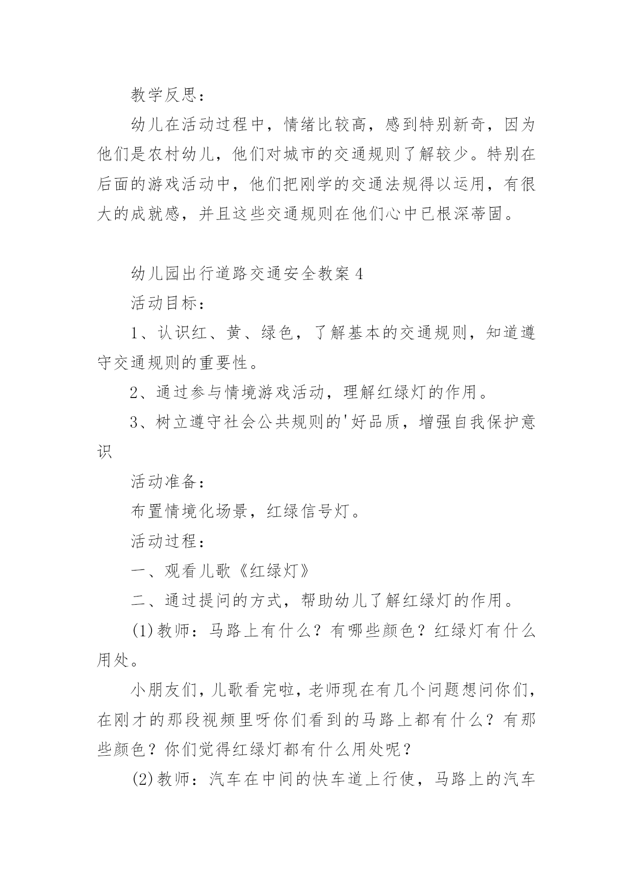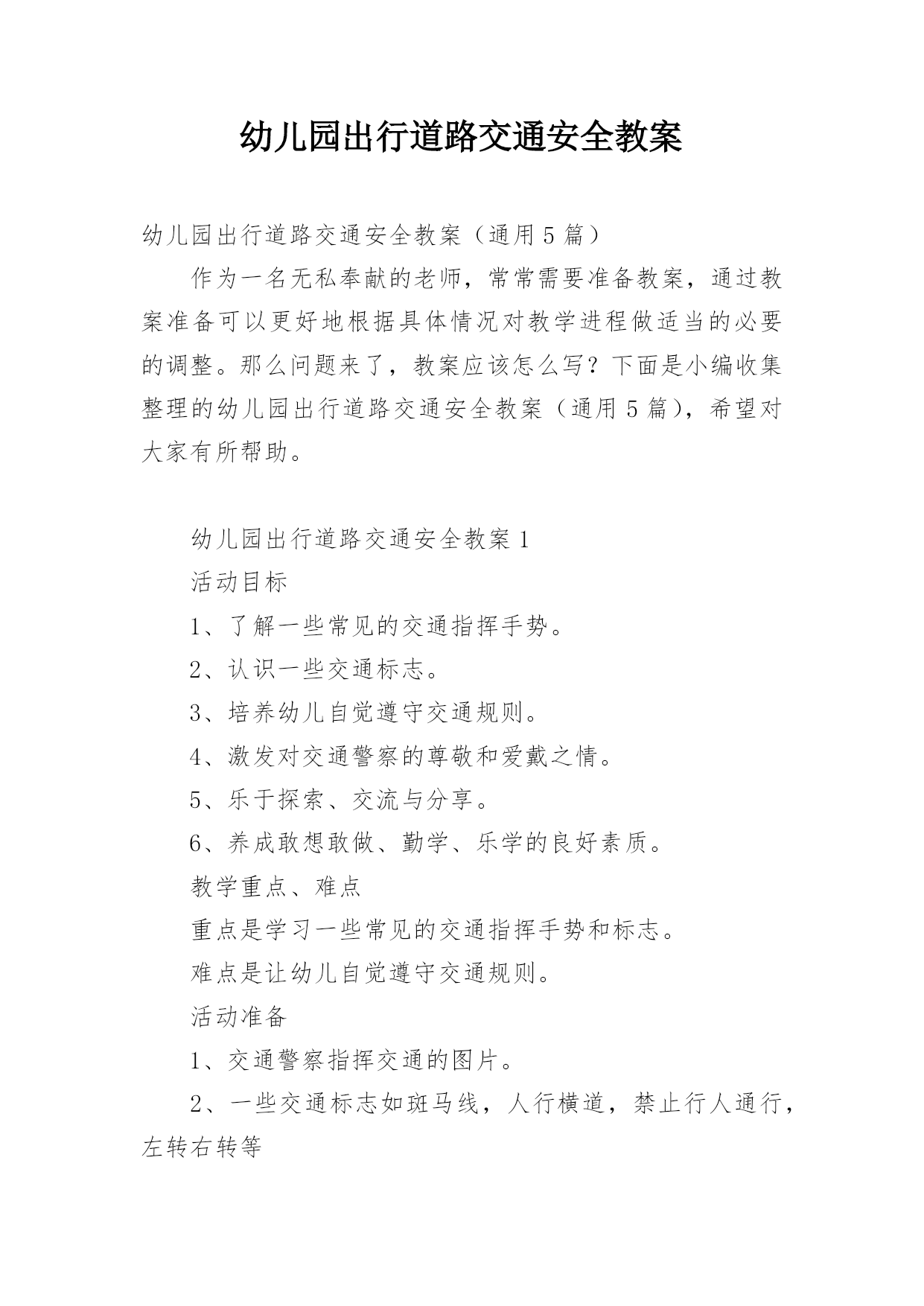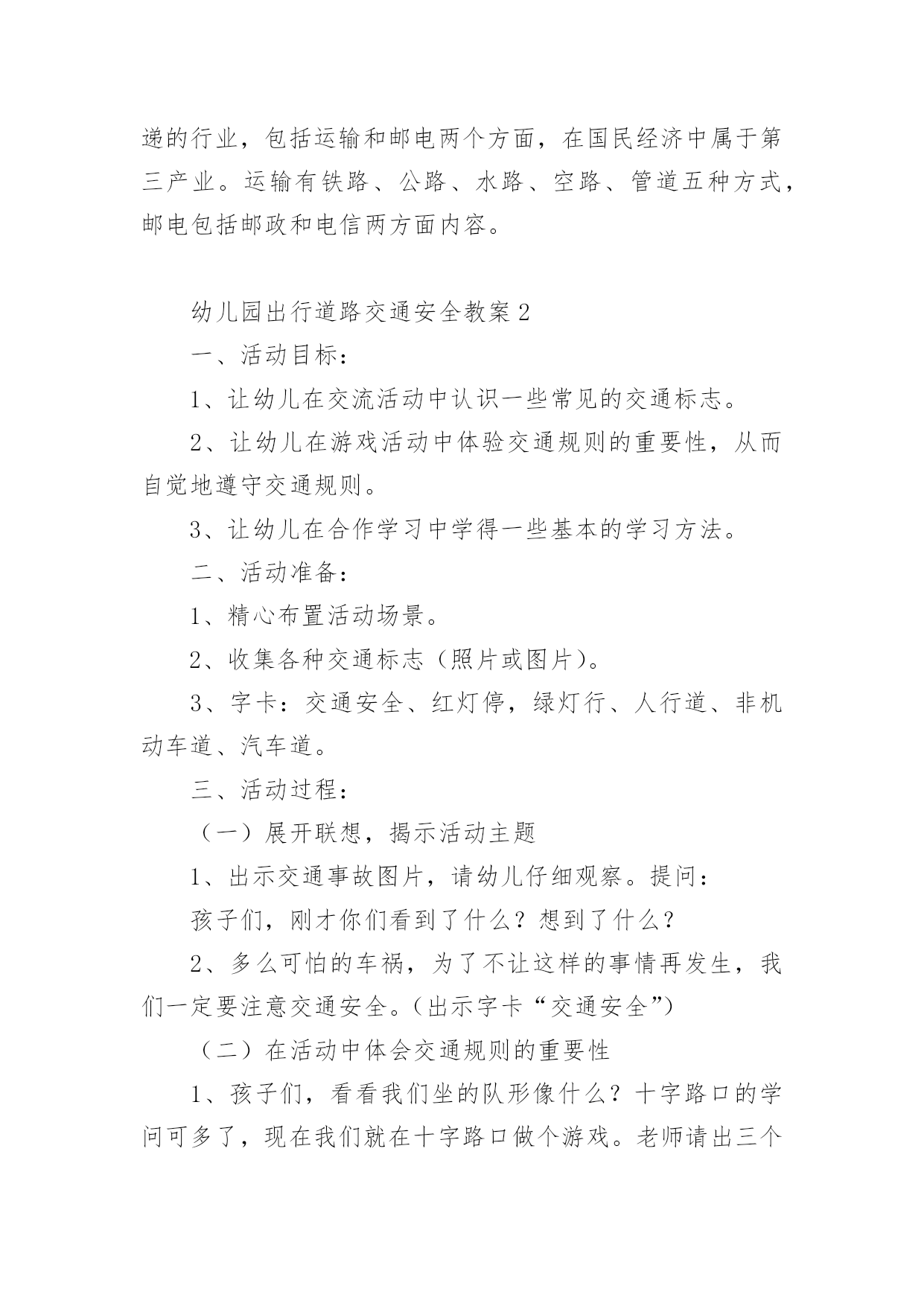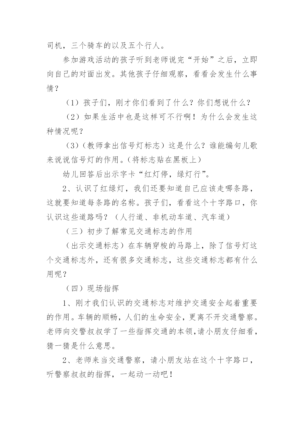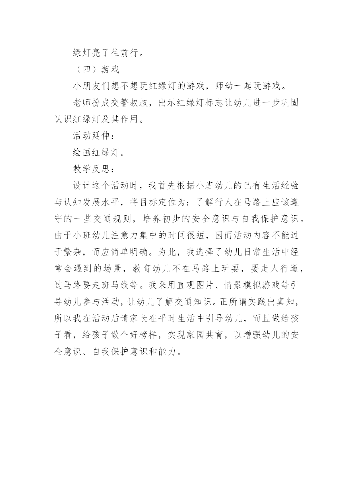 幼儿园出行道路交通安全教案幼儿园出行道路交通安全教案(通用5篇)作为一名无私奉献的老师,常常需要准备教案,通过教案准备可以更好地根据具体情况对教学进程做适当的必要的调整。那么问题来了,教案应该怎么写?下面是小编收集整理的幼儿园出行道路交通安全教案(通用5篇),希望对大家有所帮助。幼儿园出行道路交通安全教案1活动目标1、了解一些常见的交通指挥手势。2、认识一些交通标志。3、培养幼儿自觉遵守交通规则。4、激发对交通警察的尊敬和爱戴之情。5、乐于探索、交流与分享。6、养成敢想敢做、勤学、乐学的良好素质。教学重点、难点重点是学习一些常见的交通指挥手势和标志。难点是让幼儿自觉遵守交通规则。活动准备1、交通警察指挥交通的图片。2、一些交通标志如斑马线,人行横道,禁止行人通行,左转右转等3、警帽,哨子。活动过程1、组织幼儿观看交通警察指挥交通的图片并让幼儿说说交通警察在马路上指挥交通时都做了哪些手势。指导幼儿学习一些简单的指挥交通的动作和手势。如左转右转,停止,直行等。2、启发幼儿说说日常生活当中在马路上如果没有交通警察会发生什么事?3、出示图片帮助幼儿认识人行道,禁止行人通行,左转右转等交通标志。4、引导幼儿回忆在街上见到的不遵守交通规则的行为或交通事故,讨论在街上应该怎样走,怎样过马路,乘车时怎样做才能保证安全。5、游戏,带幼儿到操场上,教师画出十字路口路线,让幼儿扮演交通警察指挥交通,其他幼儿模仿司机开车的动作,在马路上行驶,按交通警察的哨声和手势停止,左转,右转,直行等。然后再轮流交替扮演做游戏。教学反思本人组织这次活动比较接近日常生活,所以孩子们都很认真听并积极参与,学习兴趣很高,接受能力也快,能掌握一些交通警察指挥交通的手势,懂得了一些交通标志,教学效果不错。在教学中设计的游戏活动目的是引导幼儿在玩中学,在趣中练。小百科:交通是指从事旅客和货物运输及语言和图文传递的行业,包括运输和邮电两个方面,在国民经济中属于第三产业。运输有铁路、公路、水路、空路、管道五种方式,邮电包括邮政和电信两方面内容。幼儿园出行道路交通安全教案2一、活动目标:1、让幼儿在交流活动中认识一些常见的交通标志。2、让幼儿在游戏活动中体验交通规则的重要性,从而自觉地遵守交通规则。3、让幼儿在合作学习中学得一些基本的学习方法。二、活动准备:1、精心布置活动场景。2、收集各种交通标志(照片或图片)。3、字卡:交通安全、红灯停,绿灯行、人行道、非机动车道、汽车道。三、活动过程:(一)展开联想,揭示活动主题1、出示交通事故图片,请幼儿仔细观察。提问:孩子们,刚才你们看到了什么?想到了什么?2、多么可怕的车祸,为了不让这样的事情再发生,我们一定要注意交通安全。(出示字卡“交通安全”)(二)在活动中体会交通规则的重要性1、孩子们,看看我们坐的队形像什么?十字路口的学问可多了,现在我们就在十字路口做个游戏。老师请出三个司机,三个骑车的以及五个行人。参加游戏活动的孩子听到老师说完“开始”之后,立即向自己的对面出发。其他孩子仔细观察,看看会发生什么事情?(1)孩子们,刚才你们看到了什么?你们想说什么?(2)如果生活中也是这样可不行啊!为什么会发生这种情况呢?(3)(教师拿出信号灯标志)这是什么?谁能编句儿歌来说说信号灯的作用。(将标志贴在黑板上)幼儿回答后出示字卡“红灯停,绿灯行”。2、认识了红绿灯,我们还要知道自己应该走哪条路,这就要知道每条路的名称。孩子们,看看这个十字路口,你认识这些道路吗?(人行道、非机动车道、汽车道)(三)初步了解常见交通标志的作用(出示交通标志)在车辆穿梭的马路上,除了信号灯这个交通标志外,还有很多交通标志,这些交通标志都有什么用呢?(四)现场指挥1、刚才我们认识的交通标志对维护交通安全起着重要的作用。车辆的顺畅,人们的生命安全,更离不开交通警察。老师向交警叔叔学了一些指挥交通的本领,请小朋友仔细看,猜一猜是什么意思。2、老师来当交通警察,请小朋友站在这个十字路口,听警察叔叔的指挥,一起动一动吧!(五)评价幼儿游戏情况,结束。幼儿园出行道路交通安全教案3设计意图:城市交通的不断发展促使我们加强交通安全教育,让幼儿了解一些危险因素,知道遵守交通规则的重要性,懂得如何保护自己。设计这个活动时,我首先根据小班幼儿的已有生活经验与认知发展水平,将目标定位为:了解行人在马路上应该遵守的一些交通规则,培养初步的安全意识与自我保护意识。由于小班幼儿注意力集中的时间很短,因而活动内容不能过于繁杂,而应简单明确。为此,我选择了幼儿日常生活中经常会遇到的几个场景,教育幼儿不在马路上玩耍,要走人行道,过马路要走斑马线等。我采用多媒体课件、情景模拟游戏等引导幼儿参与活动,并请家长在平时参与教育活动,实现家园共育,以增强幼儿的安全意识、自我保护意识和能力。活动目标:1、了解
