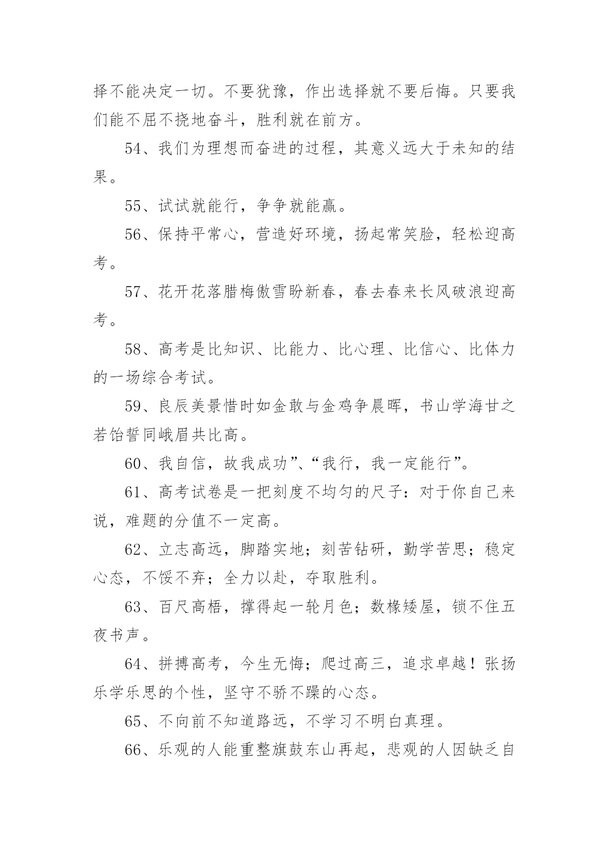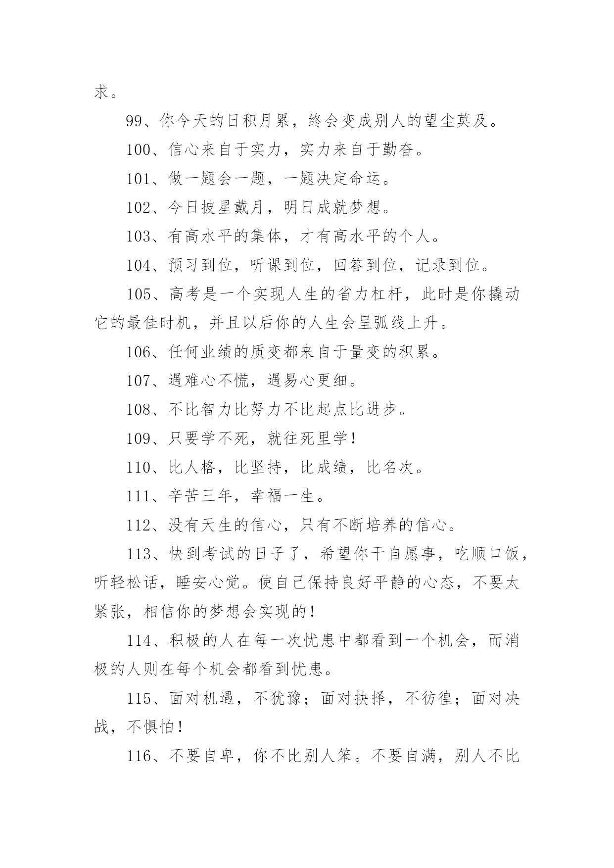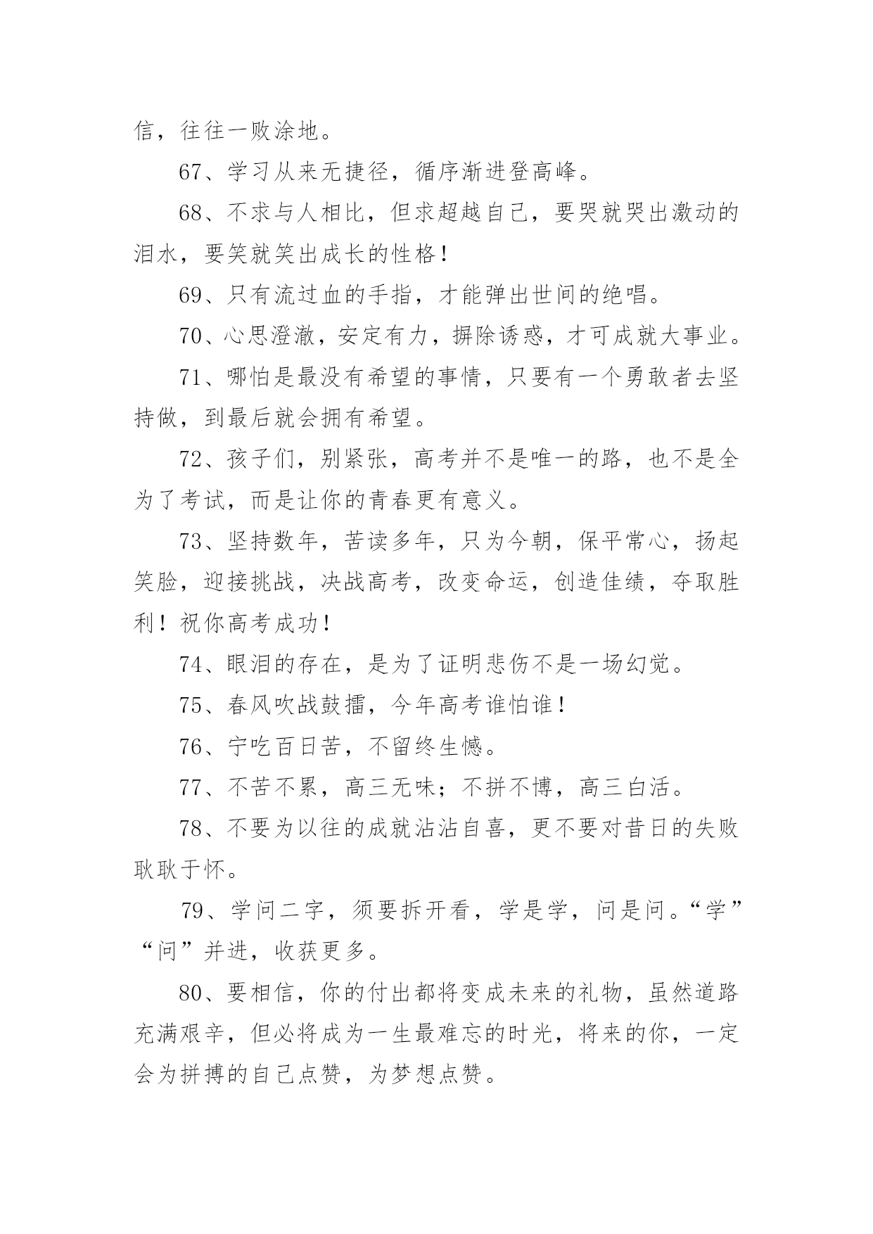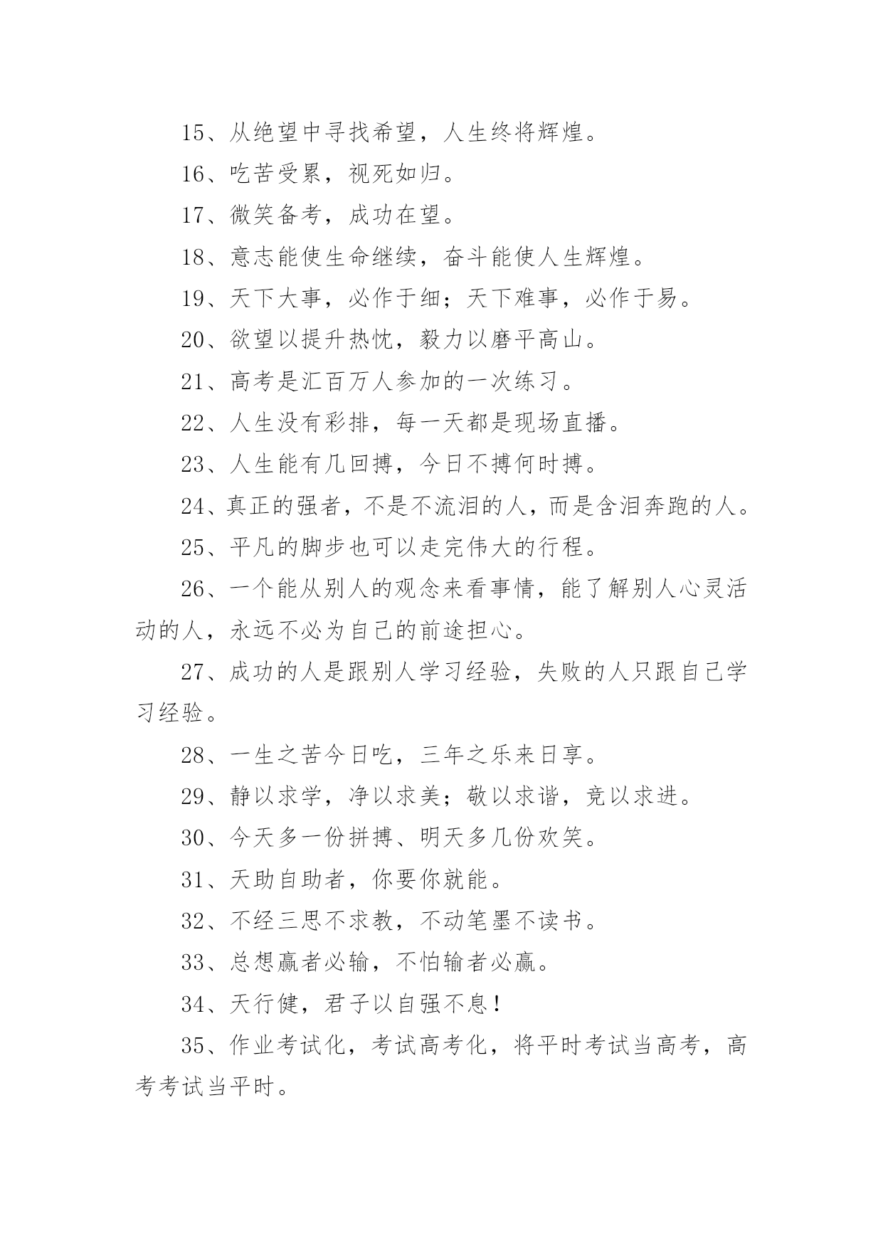 高考备考励志金句2023年高考备考励志金句200句在学习、工作、生活中,大家都收藏过令自己印象深刻的句子吧,从表达的角度说,句子是最基本的表述单位。句子的类型多样,你所见过的句子是什么样的呢?以下是小编为大家收集的2023年高考备考励志金句,仅供参考,希望能够帮助到大家。1、曾经的苦,现在的痛,都是将来的笑颜。2、进更理想大学,铸更辉煌人生。3、十年寒窗磨一剑,是非成败在今朝。4、聚精会神搞学习,一心一意迎高考。5、人之所以能,是相信能。6、为了将来不后悔,现在必须努力努力再努力。再苦再累也值得。7、立足基础,脚踏实地搏击高考。8、争分夺秒巧复习,勤学苦练创佳绩。9、更快更高更强。就是金牌。10、拼搏每一天,充实每一天,快乐每一天。11、对于世界,我微不足道,但对于我自己,我就是全部。12、精神成人,知识成才,态度成全。13、学习与坐禅相似,须有一颗恒心。14、辛苦一年,收益一生。15、从绝望中寻找希望,人生终将辉煌。16、吃苦受累,视死如归。17、微笑备考,成功在望。18、意志能使生命继续,奋斗能使人生辉煌。19、天下大事,必作于细;天下难事,必作于易。20、欲望以提升热忱,毅力以磨平高山。21、高考是汇百万人参加的一次练习。22、人生没有彩排,每一天都是现场直播。23、人生能有几回搏,今日不搏何时搏。24、真正的强者,不是不流泪的人,而是含泪奔跑的人。25、平凡的脚步也可以走完伟大的行程。26、一个能从别人的观念来看事情,能了解别人心灵活动的人,永远不必为自己的前途担心。27、成功的人是跟别人学习经验,失败的人只跟自己学习经验。28、一生之苦今日吃,三年之乐来日享。29、静以求学,净以求美;敬以求谐,竞以求进。30、今天多一份拼搏、明天多几份欢笑。31、天助自助者,你要你就能。32、不经三思不求教,不动笔墨不读书。33、总想赢者必输,不怕输者必赢。34、天行健,君子以自强不息!35、作业考试化,考试高考化,将平时考试当高考,高考考试当平时。36、灰心生失望,失望生动摇,动摇生失败。37、我难人也难,我不畏难;人易我也易,我不大意。38、成功需要成本,时间也是一种成本,对时间的珍惜就是对成本的节约。39、拼一载春秋,搏一生无悔。40、模拟的成绩一定不要成为包袱,成为阴影。41、忍耐一分期待,就可能握住十分的收获。42、不问收获,但问耕耘!天道酬勤。43、抢时间,抓基础,勤演练定有收获;树自信,誓拼搏,升大学回报父母。44、每个人都可以给自己快乐,纵然他是乞丐;每个人都能使自己痛苦,即便他是国王。45、在考场上没有弱者的眼泪只有强者的天下。46、鹰击天风壮,鹏飞海浪春。47、对待试题:冷静、乐观,对待考试:认真、自信。48、勤奋努力加自信,辉煌成就属于你。49、只有经过地狱般的磨练,才能拥有创造天堂的力量;只有流过血的手指才能弹出世间的绝唱。50、高三不再有,劝君珍惜之。一年之经历,终身之财富。51、不要轻言放弃否则对不起自己。52、失败所能带给你的只应是一些教训,一些冷静的思考,而不该有绝望、颓废、不知所措。53、人生终有许多选择。每一步都要慎重。但是一次选择不能决定一切。不要犹豫,作出选择就不要后悔。只要我们能不屈不挠地奋斗,胜利就在前方。54、我们为理想而奋进的过程,其意义远大于未知的结果。55、试试就能行,争争就能赢。56、保持平常心,营造好环境,扬起常笑脸,轻松迎高考。57、花开花落腊梅傲雪盼新春,春去春来长风破浪迎高考。58、高考是比知识、比能力、比心理、比信心、比体力的一场综合考试。59、良辰美景惜时如金敢与金鸡争晨晖,书山学海甘之若饴誓同峨眉共比高。60、我自信,故我成功”、“我行,我一定能行”。61、高考试卷是一把刻度不均匀的尺子:对于你自己来说,难题的分值不一定高。62、立志高远,脚踏实地;刻苦钻研,勤学苦思;稳定心态,不馁不弃;全力以赴,夺取胜利。63、百尺高梧,撑得起一轮月色;数椽矮屋,锁不住五夜书声。64、拼搏高考,今生无悔;爬过高三,追求卓越!张扬乐学乐思的个性,坚守不骄不躁的心态。65、不向前不知道路远,不学习不明白真理。66、乐观的人能重整旗鼓东山再起,悲观的人因缺乏自信,往往一败涂地。67、学习从来无捷径,循序渐进登高峰。68、不求与人相比,但求超越自己,要哭就哭出激动的泪水,要笑就笑出成长的性格!69、只有流过血的手指,才能弹出世间的绝唱。70、心思澄澈,安定有力,摒除诱惑,才可成就大事业。71、哪怕是最没有希望的事情,只要有一个勇敢者去坚持做,到最后就会拥有希望。72、孩子们,别紧张,高考并不是唯一的路,也不是全为了考试,而是让你的青春更有意义。73、坚持数年,苦读多年,只为今朝,保平常心,扬起笑脸,迎接挑战,决战高考,改变命运,创造佳绩,夺取胜利!祝你高考成功!74、眼泪的存在,是为